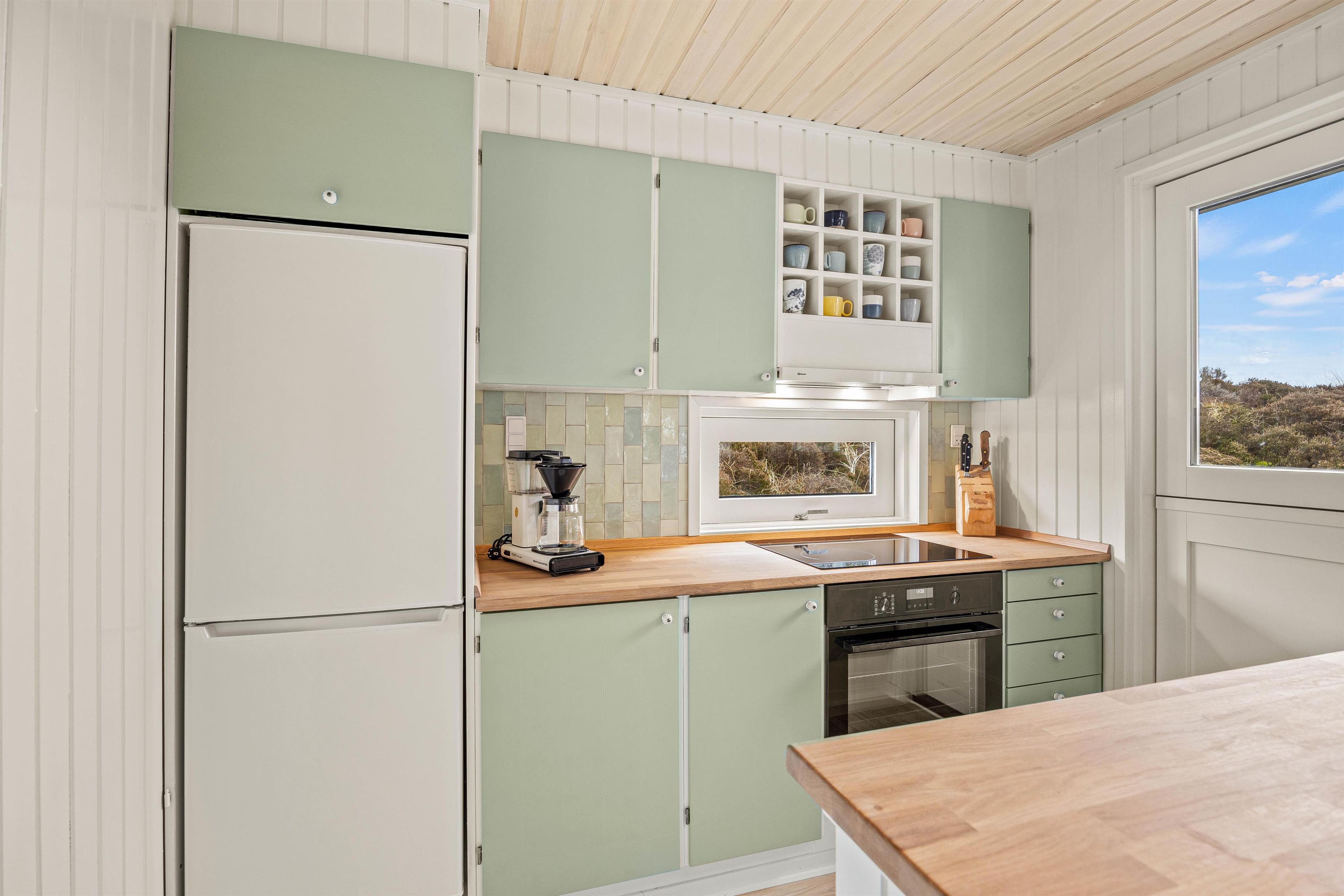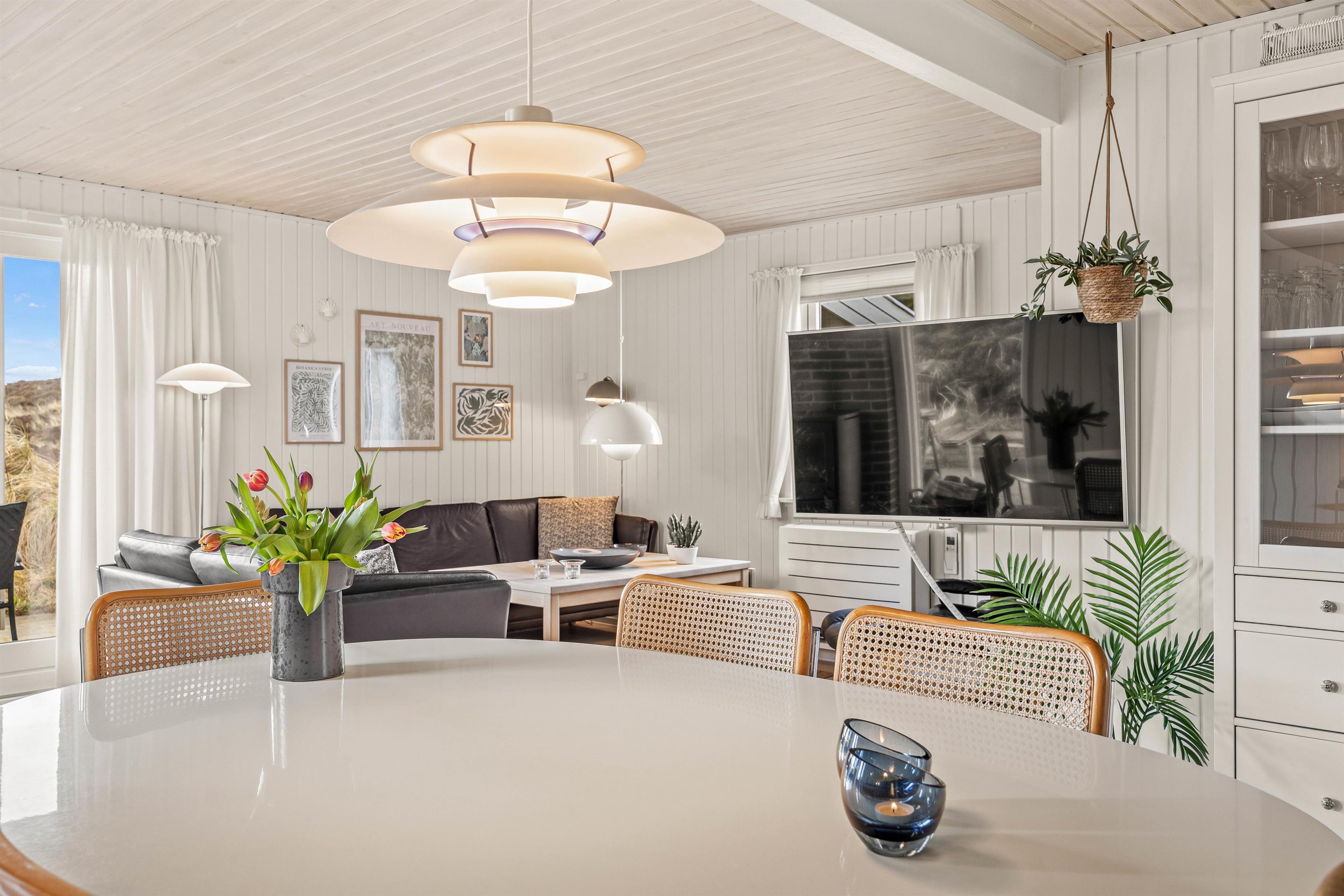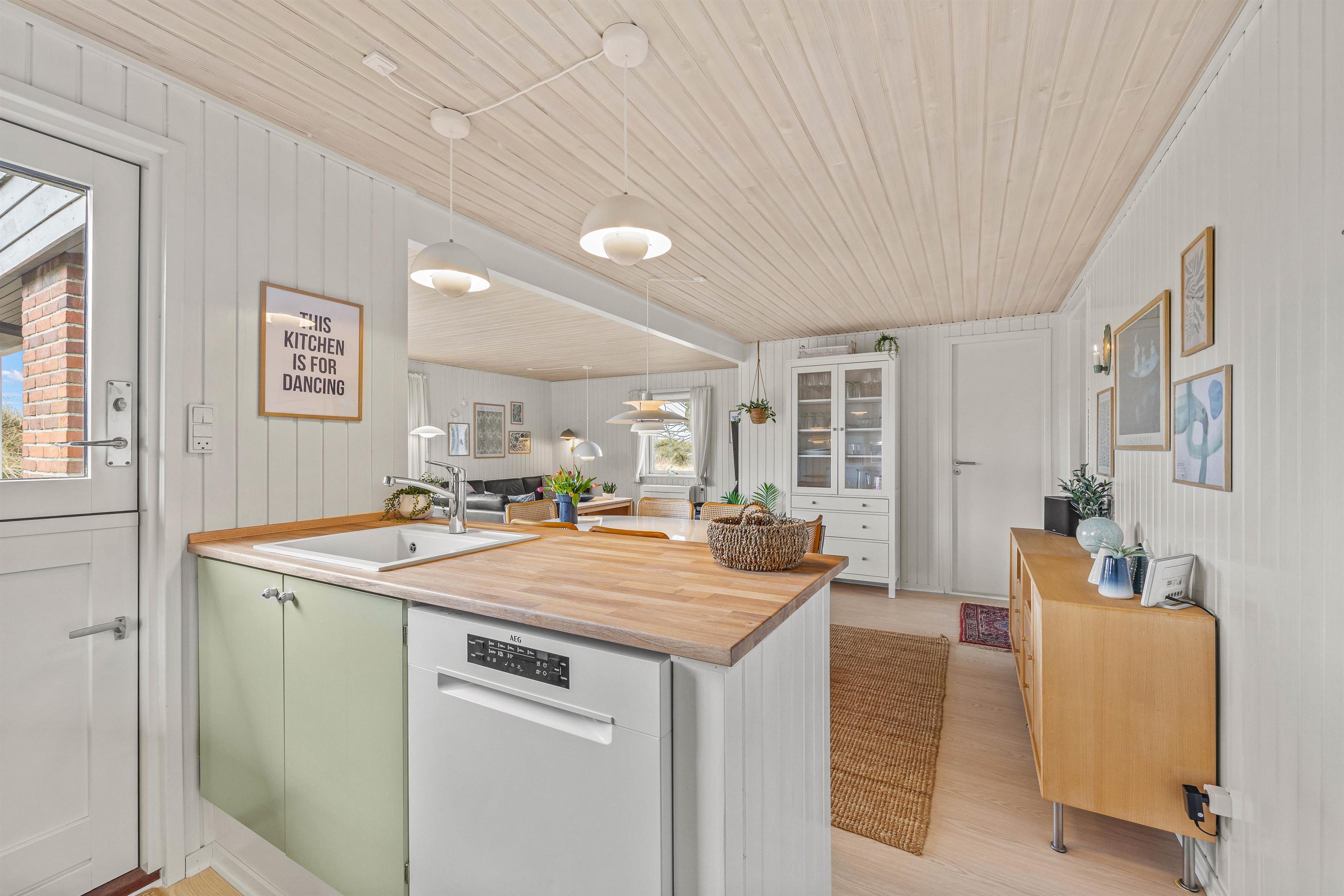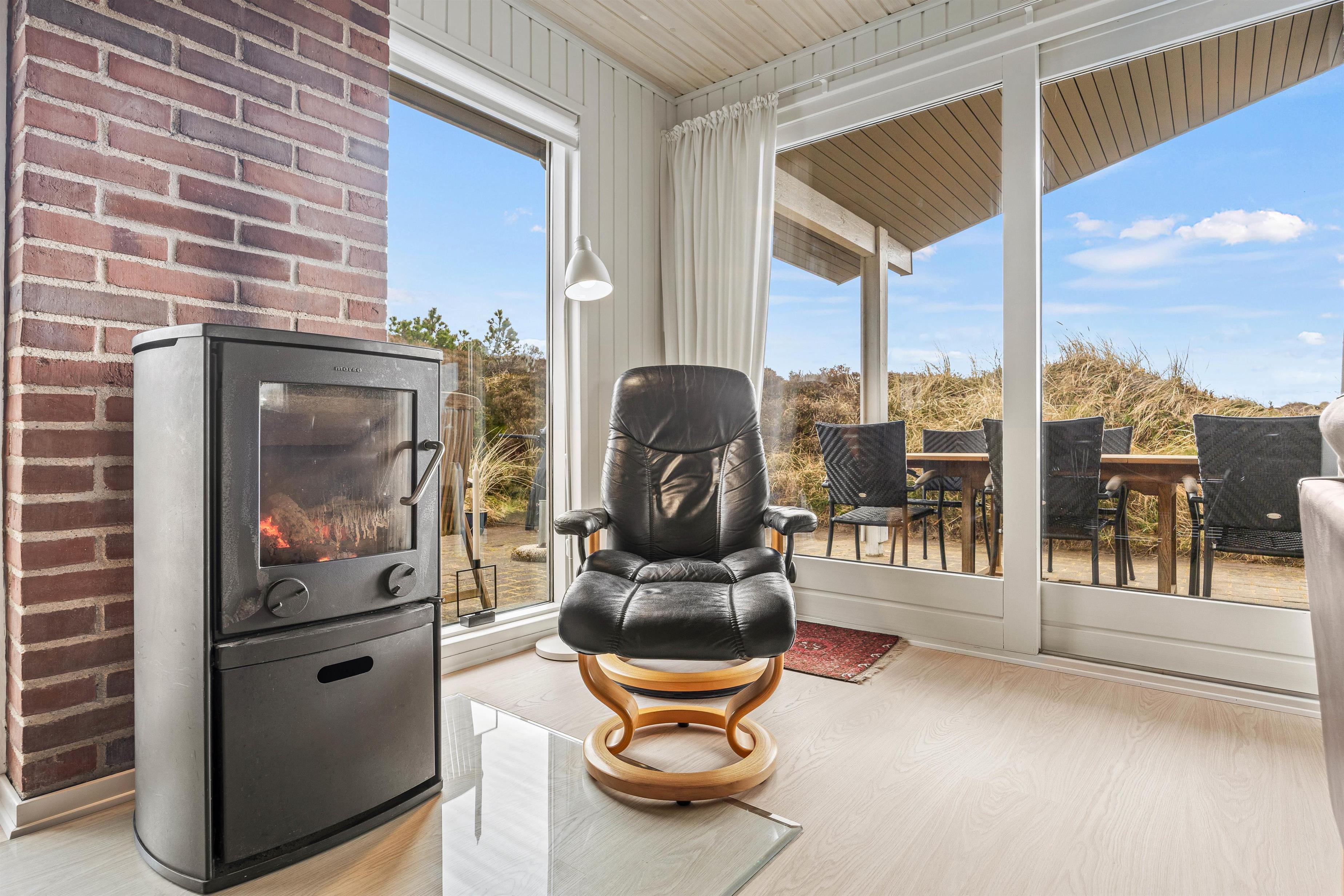 Den hyggelige spise- og opholdsstue med integreret køkken fungerer som husets hjerte og bliver udgangspunkt for masser af skønne ferieminder med sene aftener på sofaen, hjemmelavede feriemåltider og underholdende kortspil foran den knitrende brændeovn.