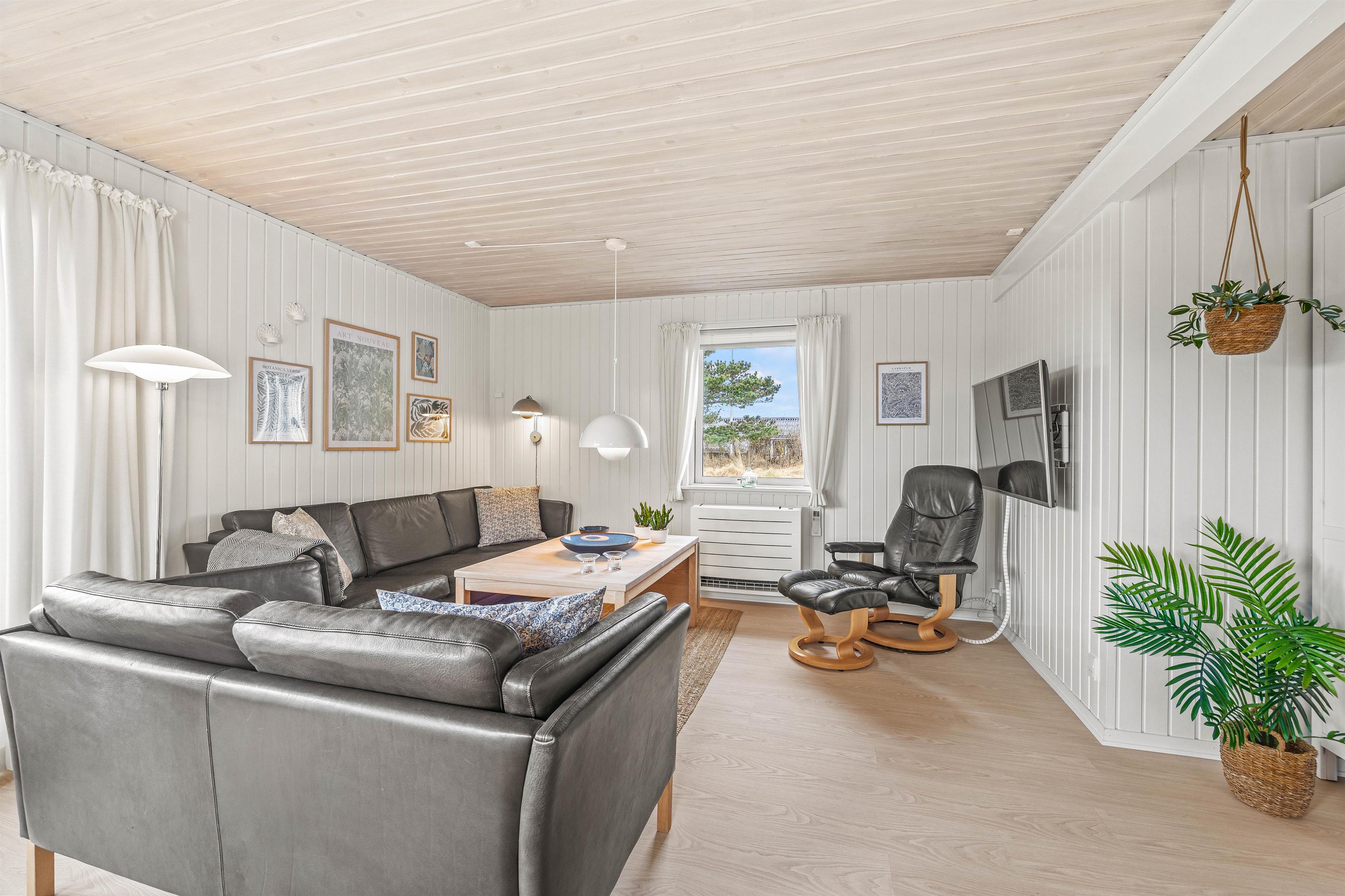 I dette hyggelige træhus på Gejlbjergvej 26 er der dømt ægte sommerhushygge. Her bor I i udkanten af Henne Strand ud til et smukt lyngbeklædt naturområde, og det klassiske hus med sauna og brændeovn udstråler charme og helt enkel ferie i fredelige omgivelser.