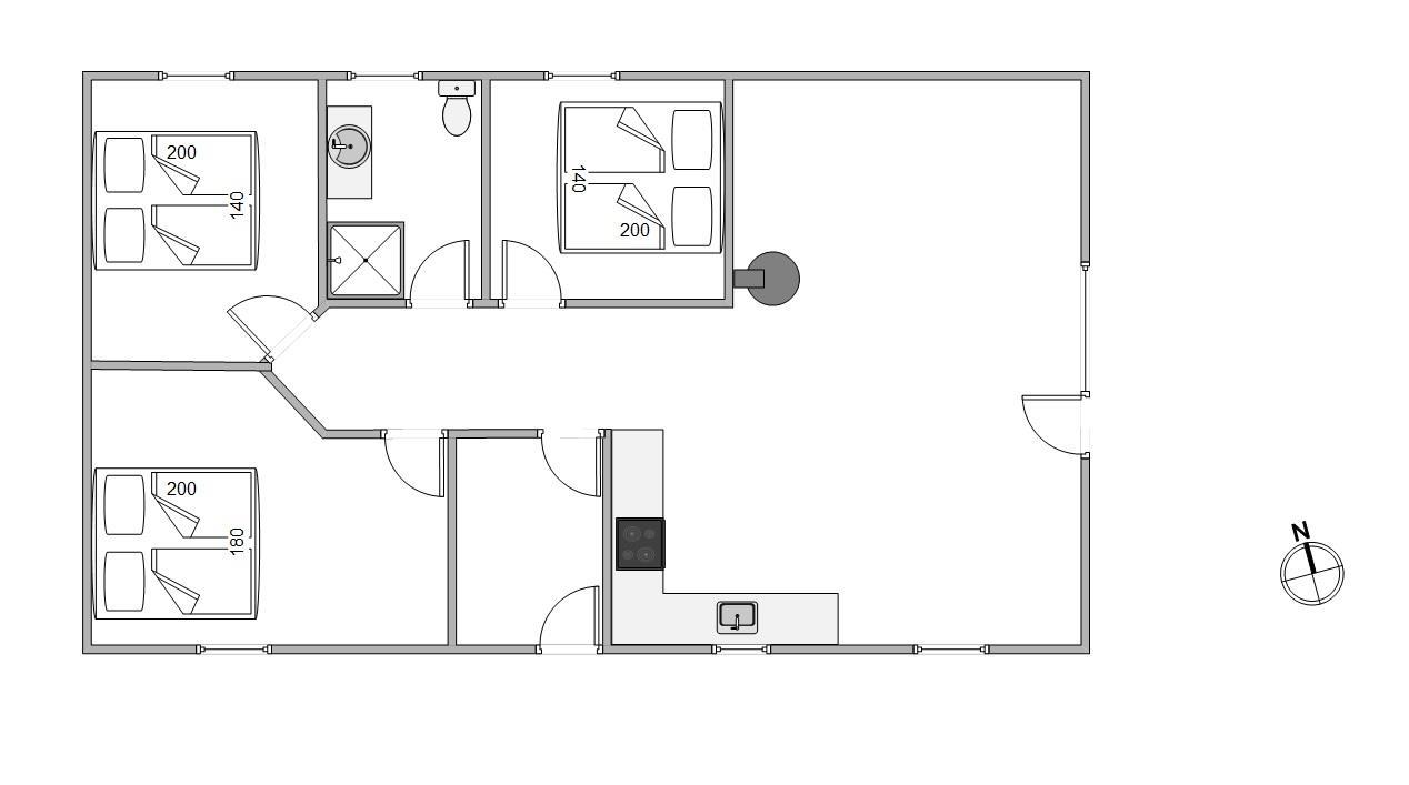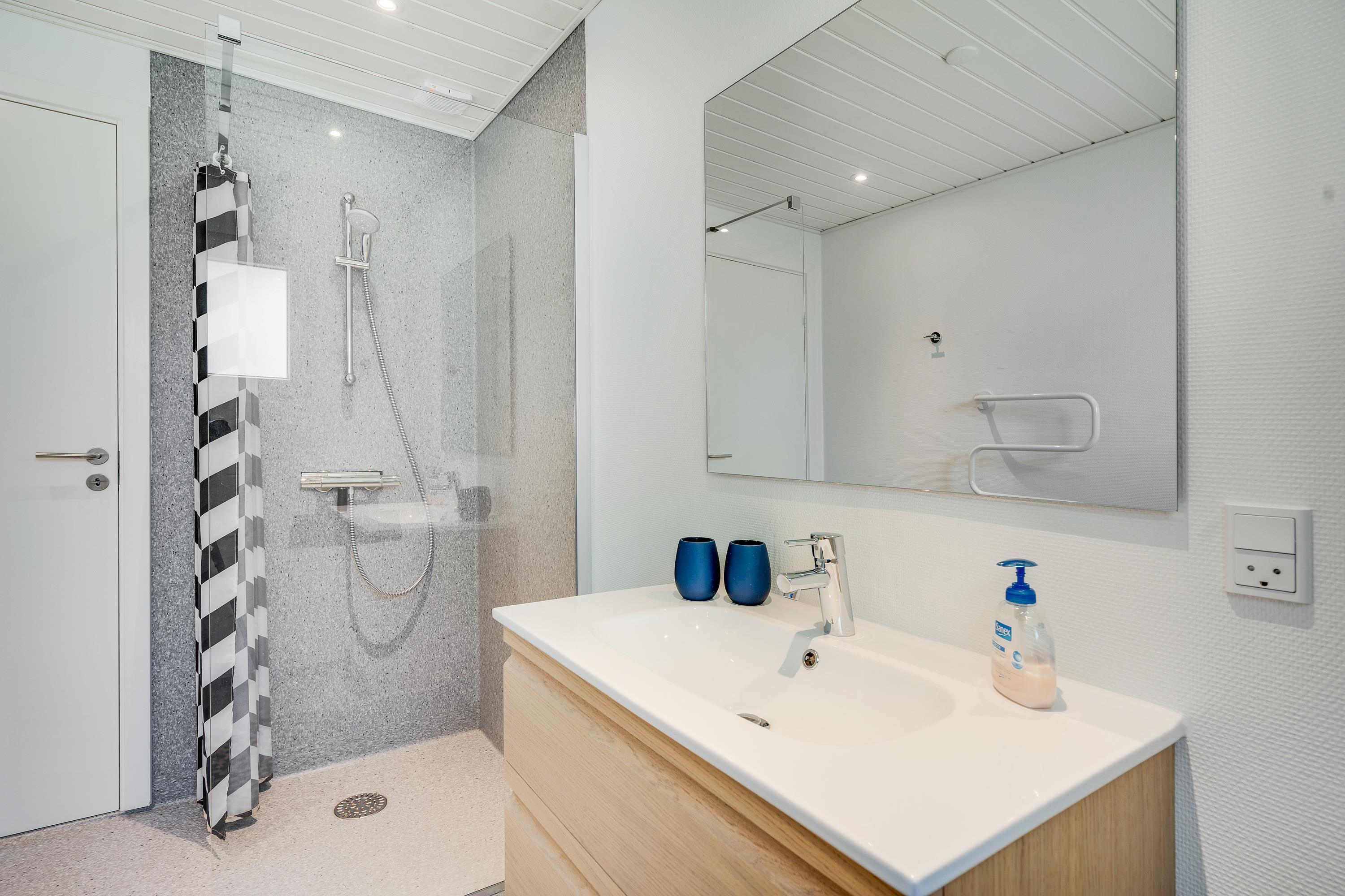 Feriehuset på Bekkasinvej er indrettet med 3 soverum, så her er der fint plads til hele familien eller evt. 2 vennepar? Der er dobbeltsenge på henholdsvis 180x200, 140x200 og 140x200 cm. Badeværelset er lyst og moderne, og her får ingen kolde tæer, da der er gulvvarme.