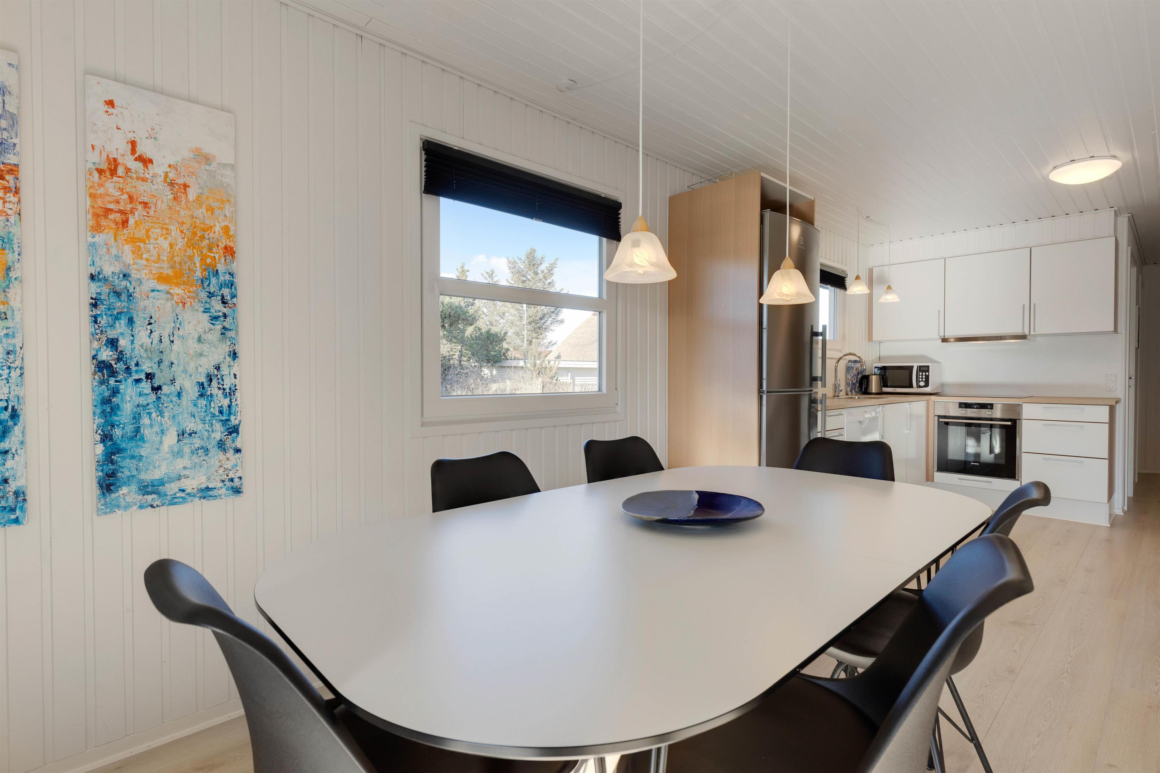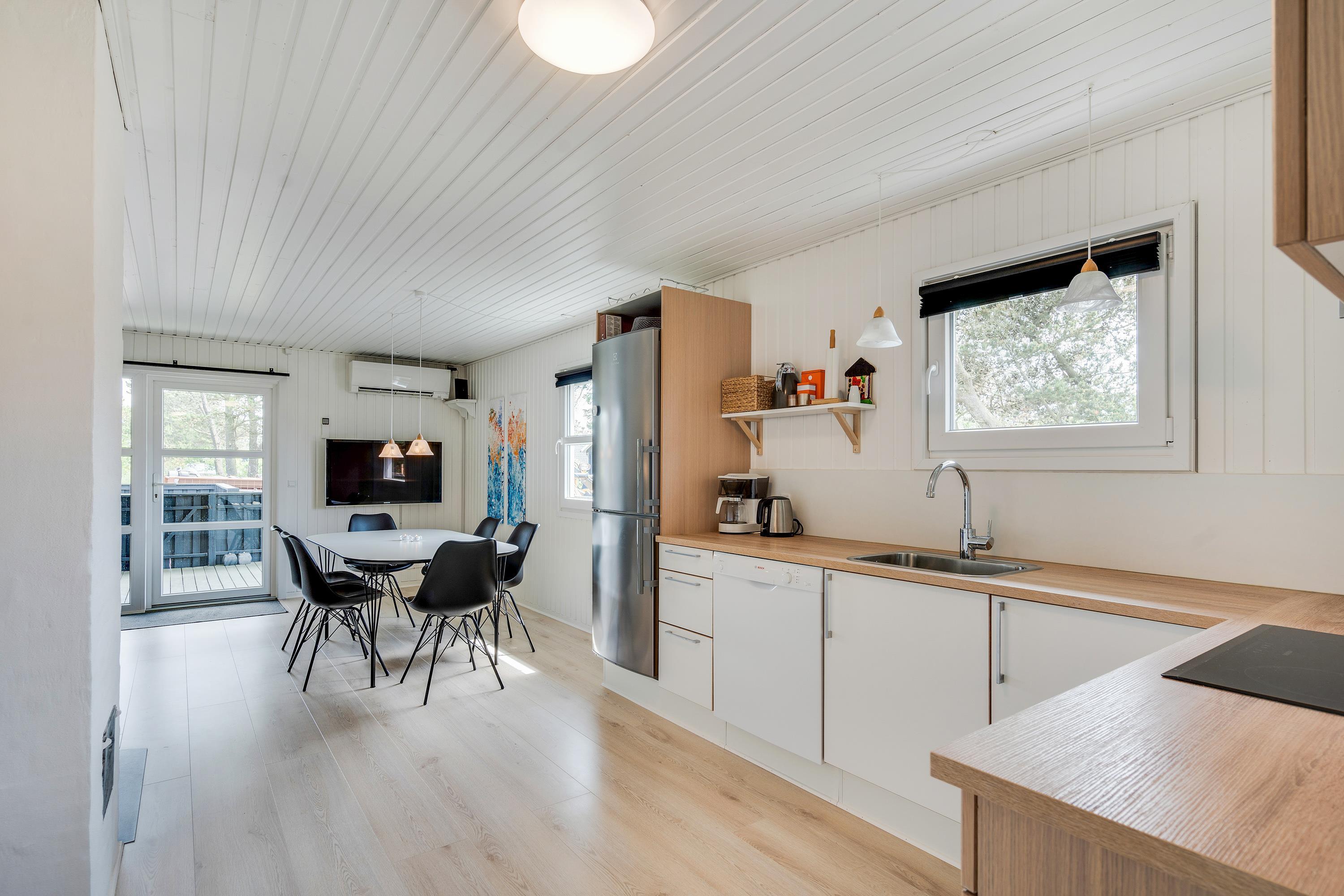 Feriehusets åbne køkken og stue-alrum er godt indrettet med det store ovale spisebord, hjørnesofa og en bekvem lænestol - perfekt til masser af fælles hygge og afslapning. Feriehusets luft-til-luft varmepumpe sørger for energirigtig opvarmning, og derudover står brændeovnen klar til at skabe den ultimative ferie-hygge-stemning.