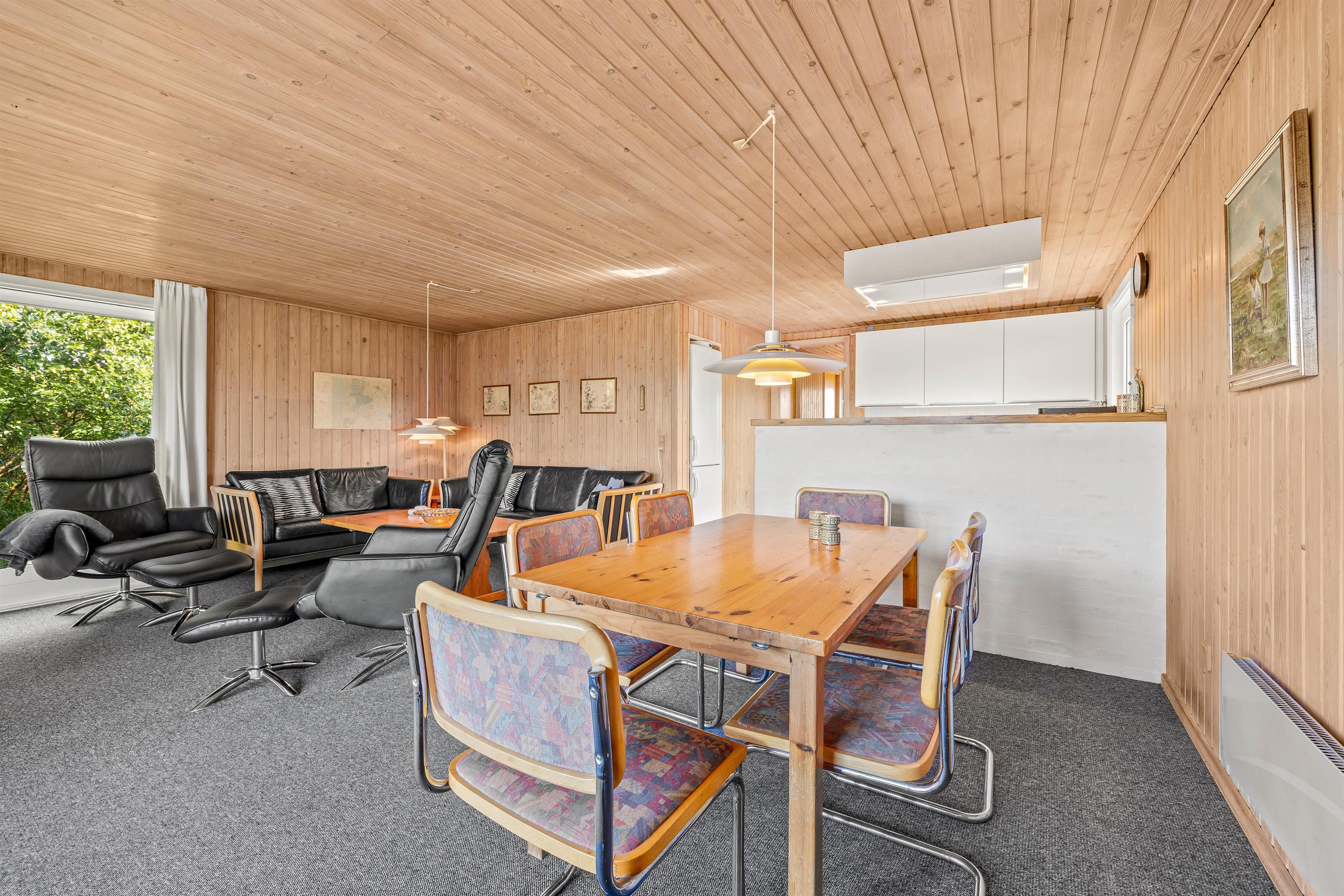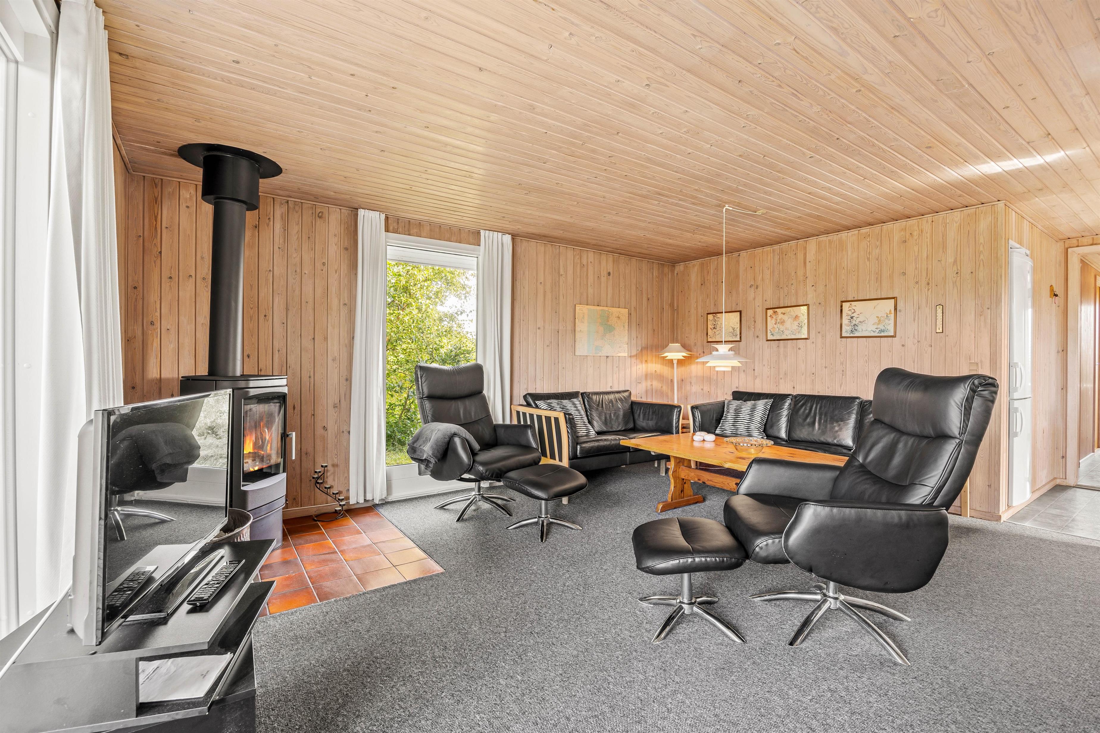 Stuen er det perfekte samlingspunkt efter en lang dag ved havet eller på farten. Her kan I slappe af og hygge med alt fra film til brætspilsaftner. Her er en dejlig brændeovn, som spreder god varme og glæde. Skal I varmes godt i gennem har feriehuset sin egen sauna. Her kan I nyde fridagene og da huset ingen internet har kunne man slukke telefonen, læse en god bog og nyde roen.
