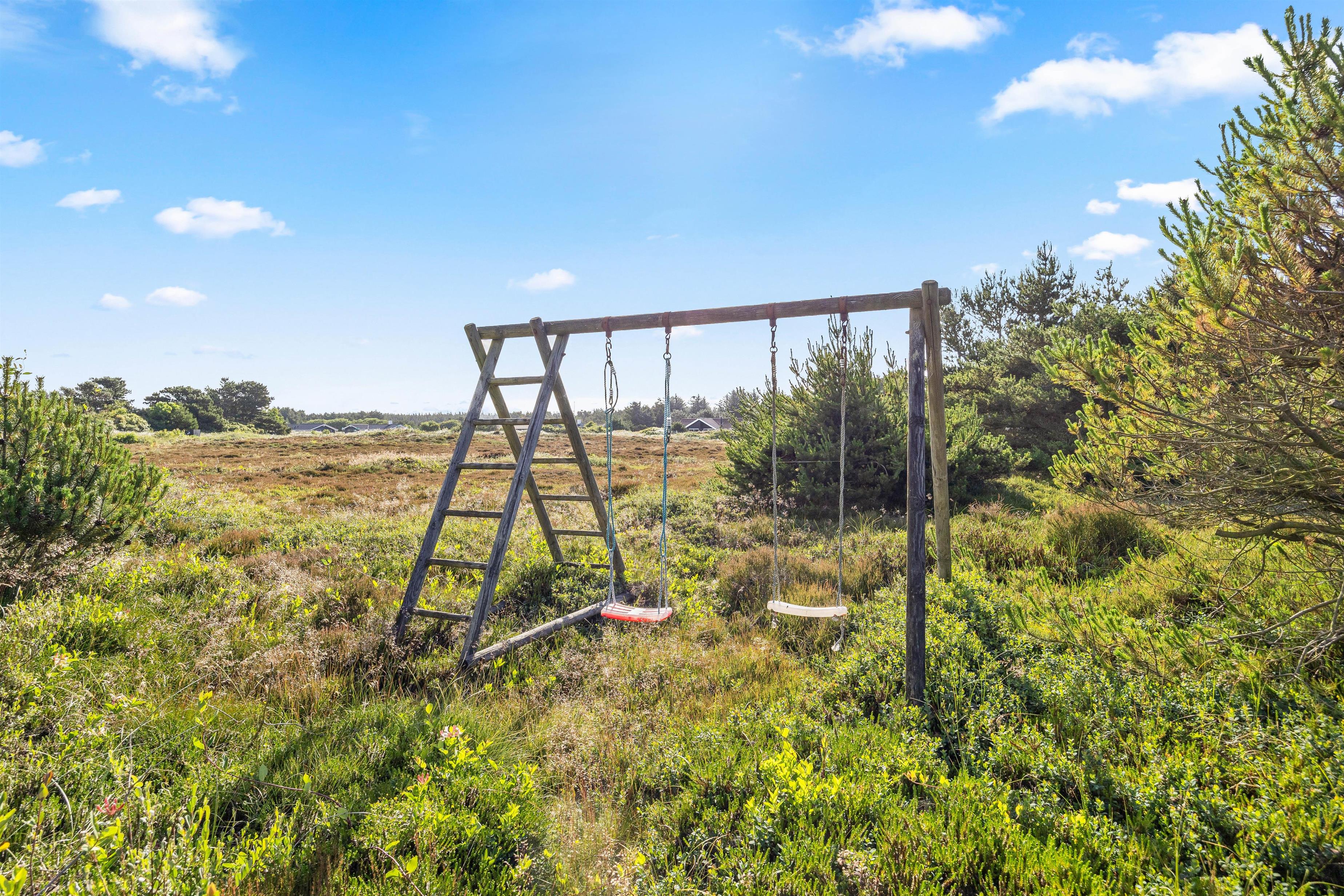 For de energiske er det tid til at få armene op i vejret på den indbydende trampolin, mens de små kan lege på gyngen lige ved siden af. Alt sammen lige uden for feriehusets døre.