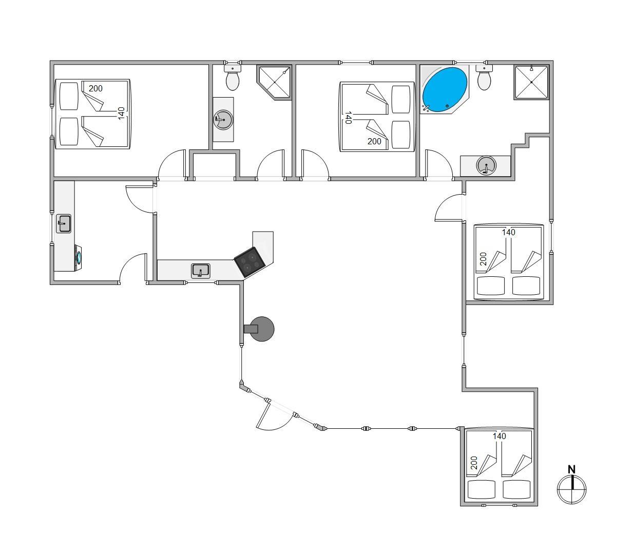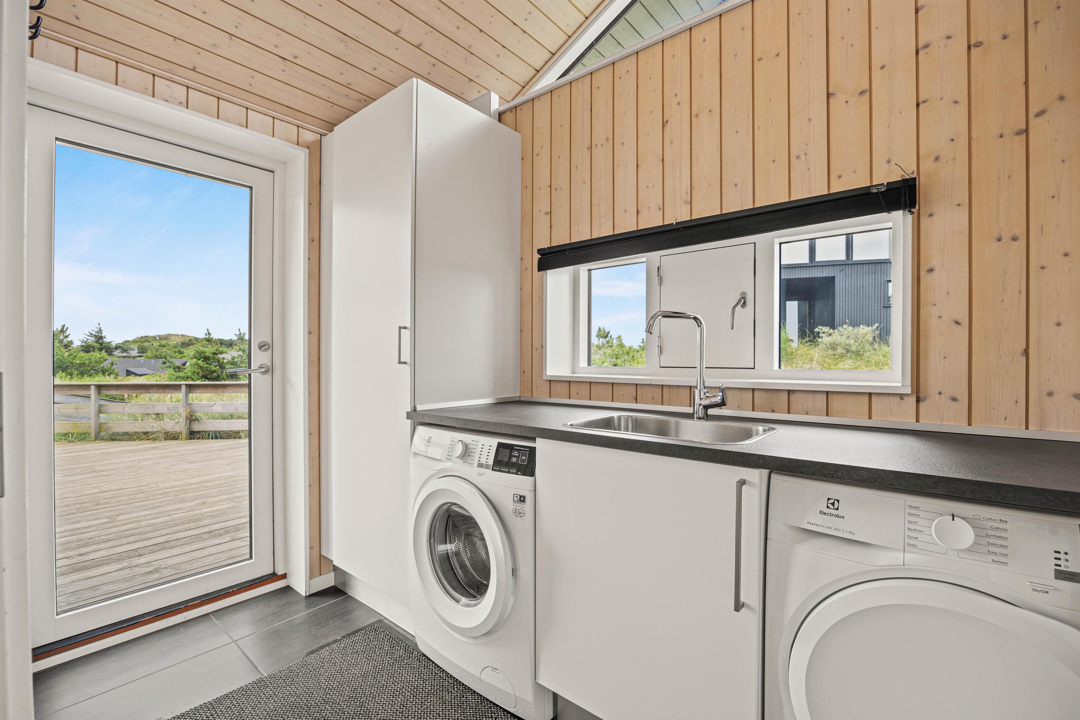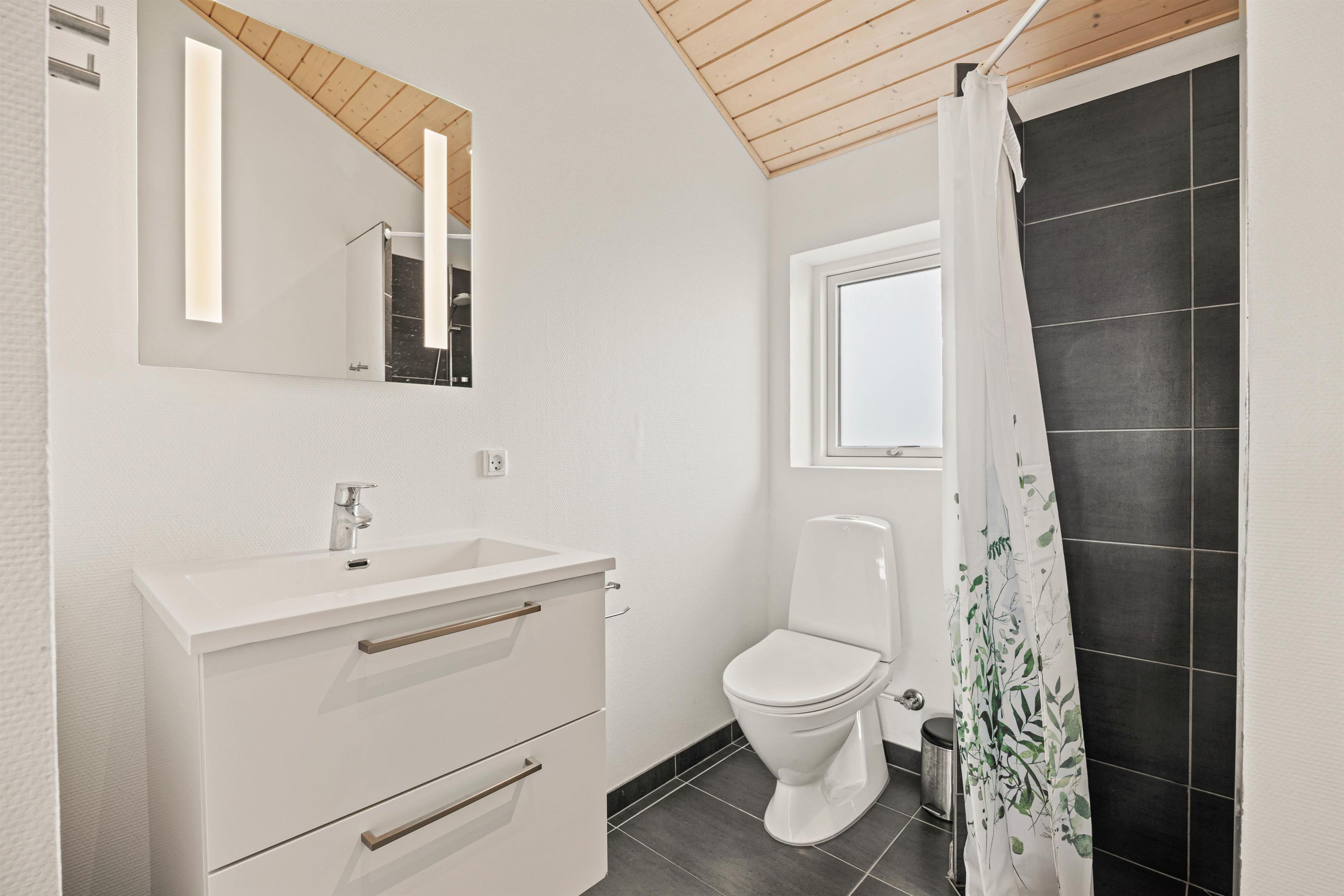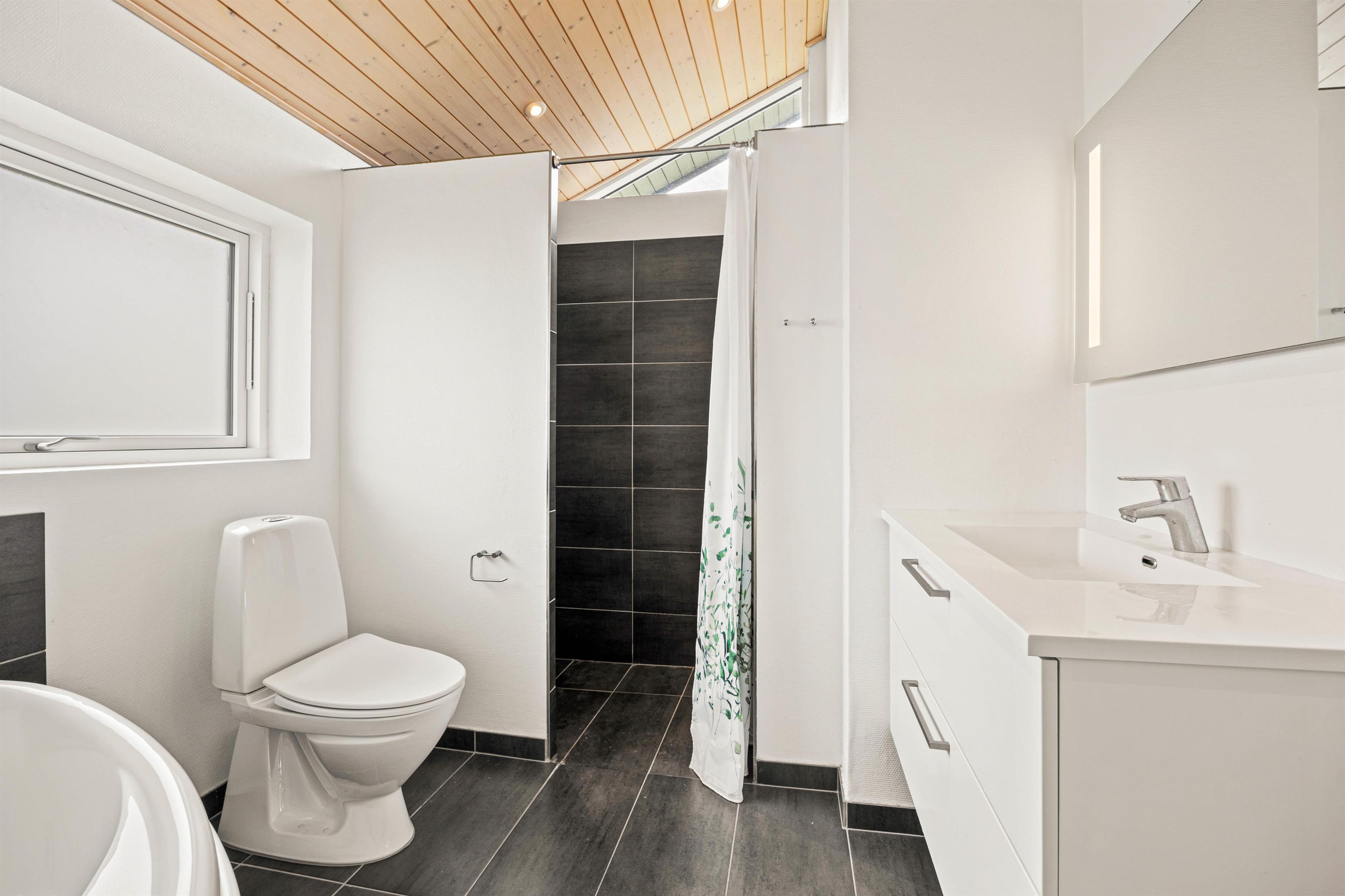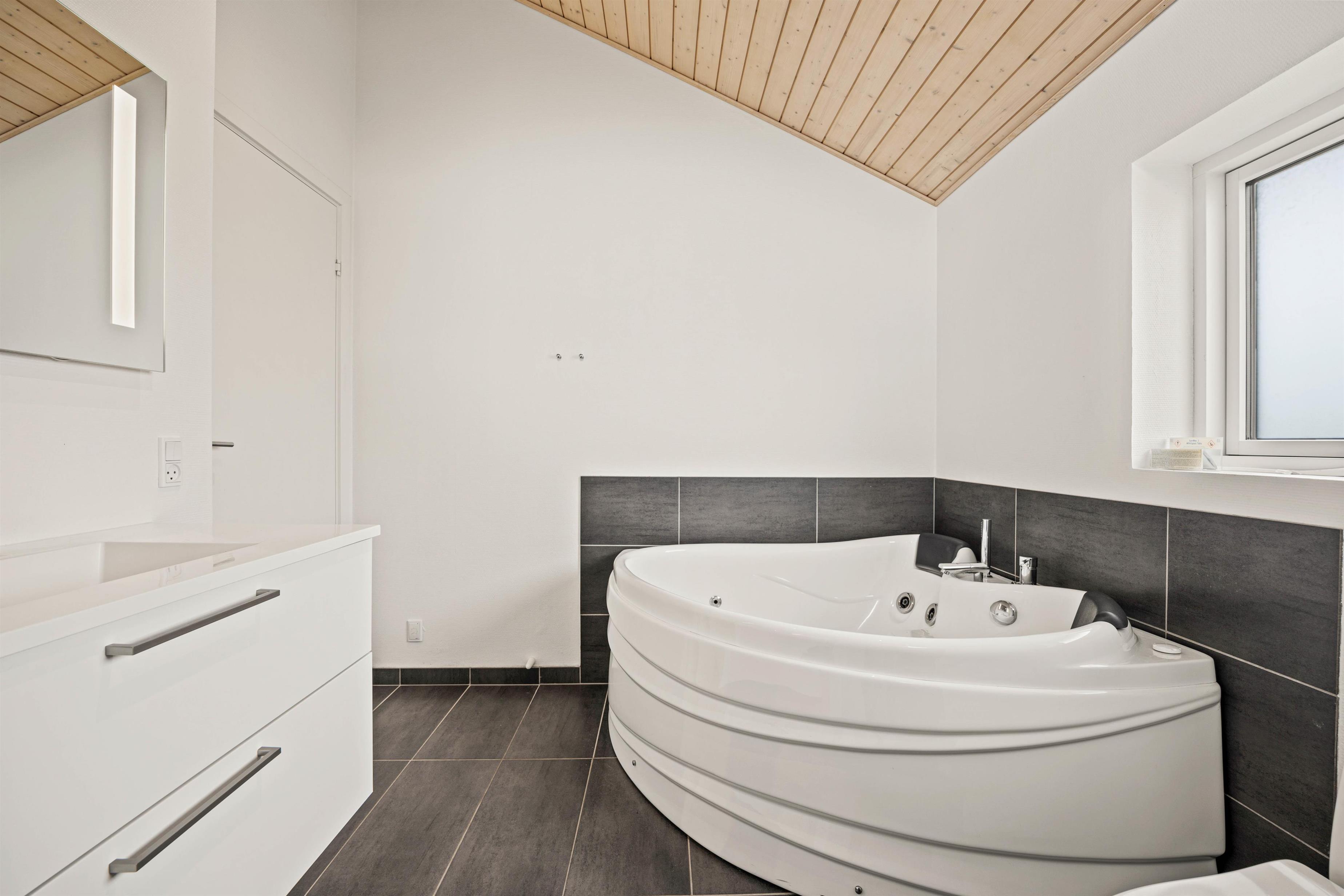 Sommerhuset har 2 moderne badeværelser, hvoraf det ene er indrettet med et spabad - perfekt til en afslappende stund efter en oplevelsesrig feriedag. Gulvvarmen sørger for en behagelig og varm atmosfære. De praktiske hverdagshjælpere – vaskemaskine og tørretumbler – står til rådighed, så I kun behøver at pakke jeres yndlingstøj.