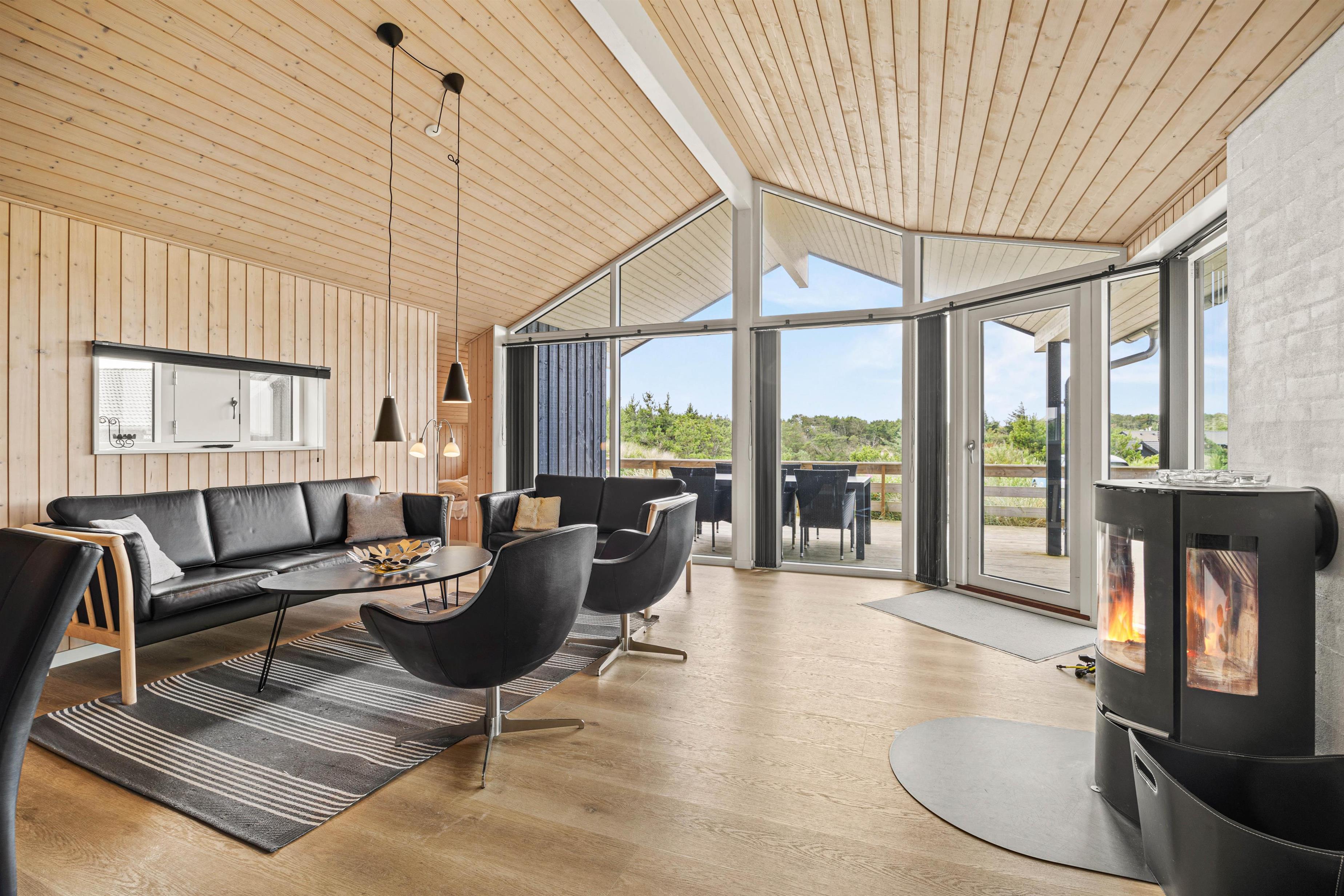 Stuen er indrettet med en brændeovn, der sørger for rolige stunder og behagelig varme, især på køligere aftener. I de komfortable sofa- og lænestolsgrupper kan I slappe af, læse en bog eller bare nyde tiden sammen. Indretningen udstråler ro og hygge, så I hurtigt vil føle jer hjemme. For at skabe et behageligt indeklima i stuen, er der installeret en energibesparende varmepumpe.