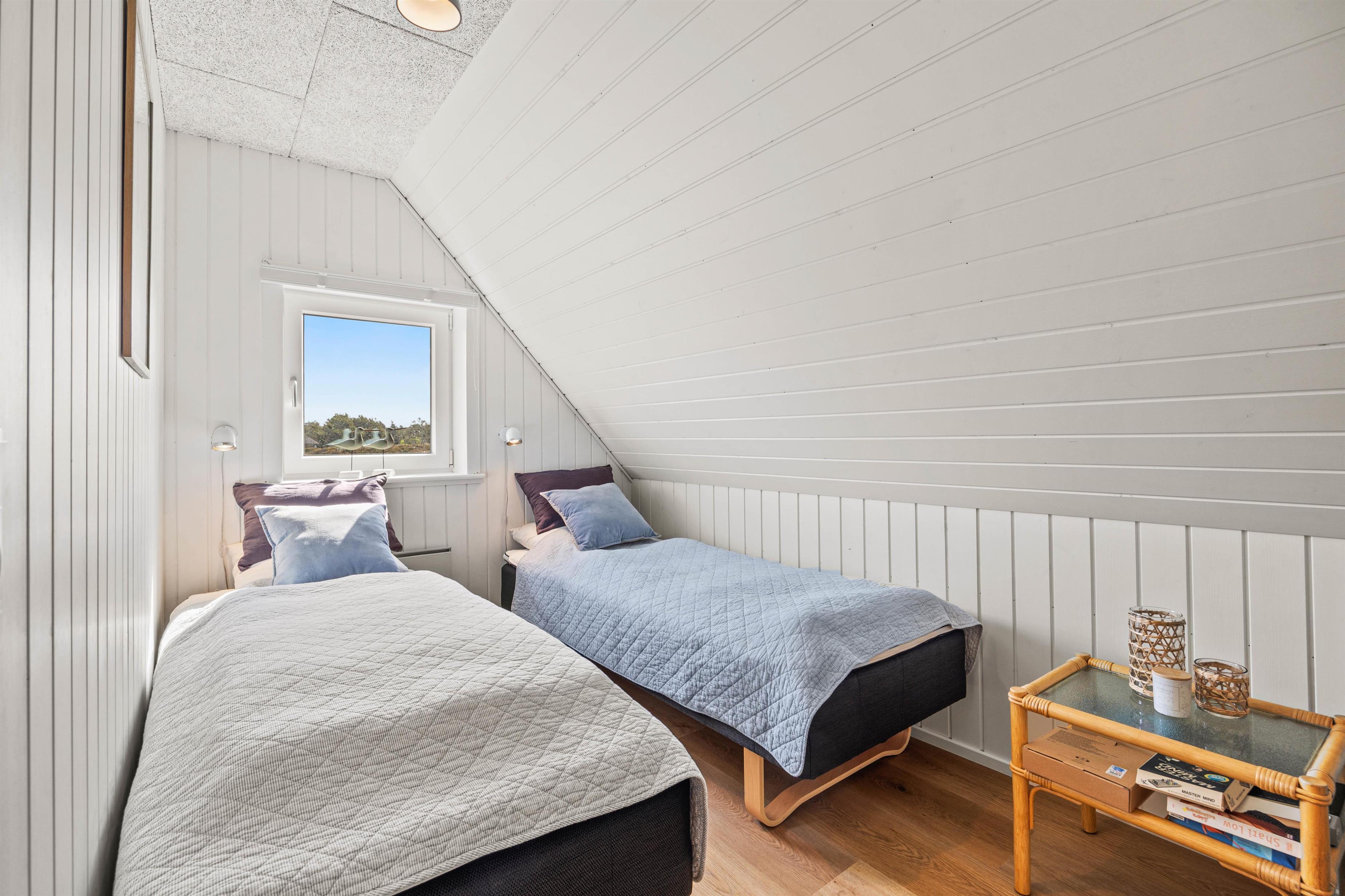 Det 83 m² store sommerhus byder desuden på 1 badeværelse med gulvvarme samt 3 gode soveværelser. Alle soveværelser ligger på 1. sal. Et af værelserne er indrettet med en dobbeltseng, det andet har 2 enkeltsenge og det tredje soveværelse er indrettet med en enkeltseng.
