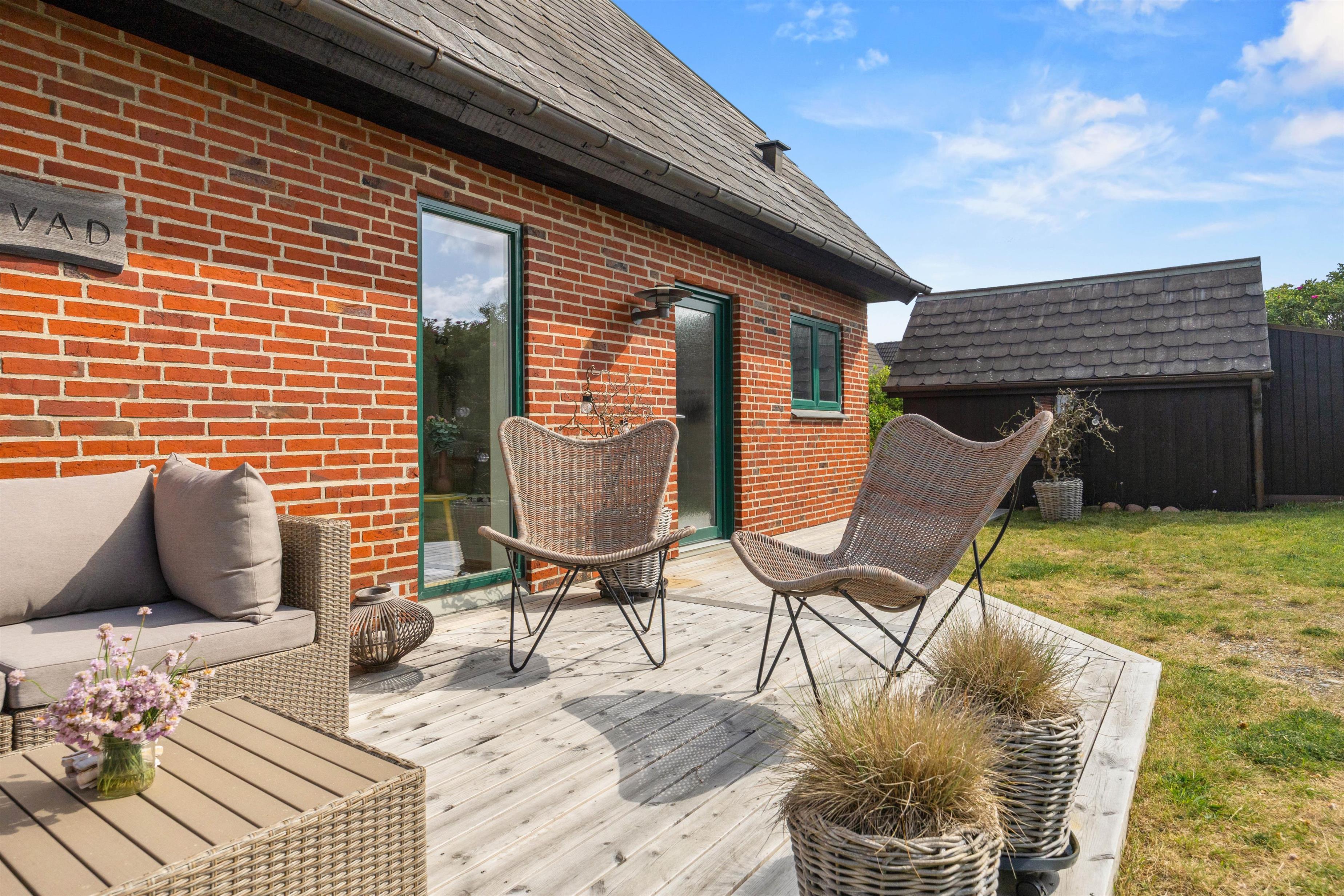 Der er mange dejlige hjørner omkring dette sommerhus, og der står solvogne og havemøbler klar til at I kan nyde dagen omkring feriehuset. Om aftenen kan I tænde op for grillen og nyde aftensolen på den overdækkede terrasse.
