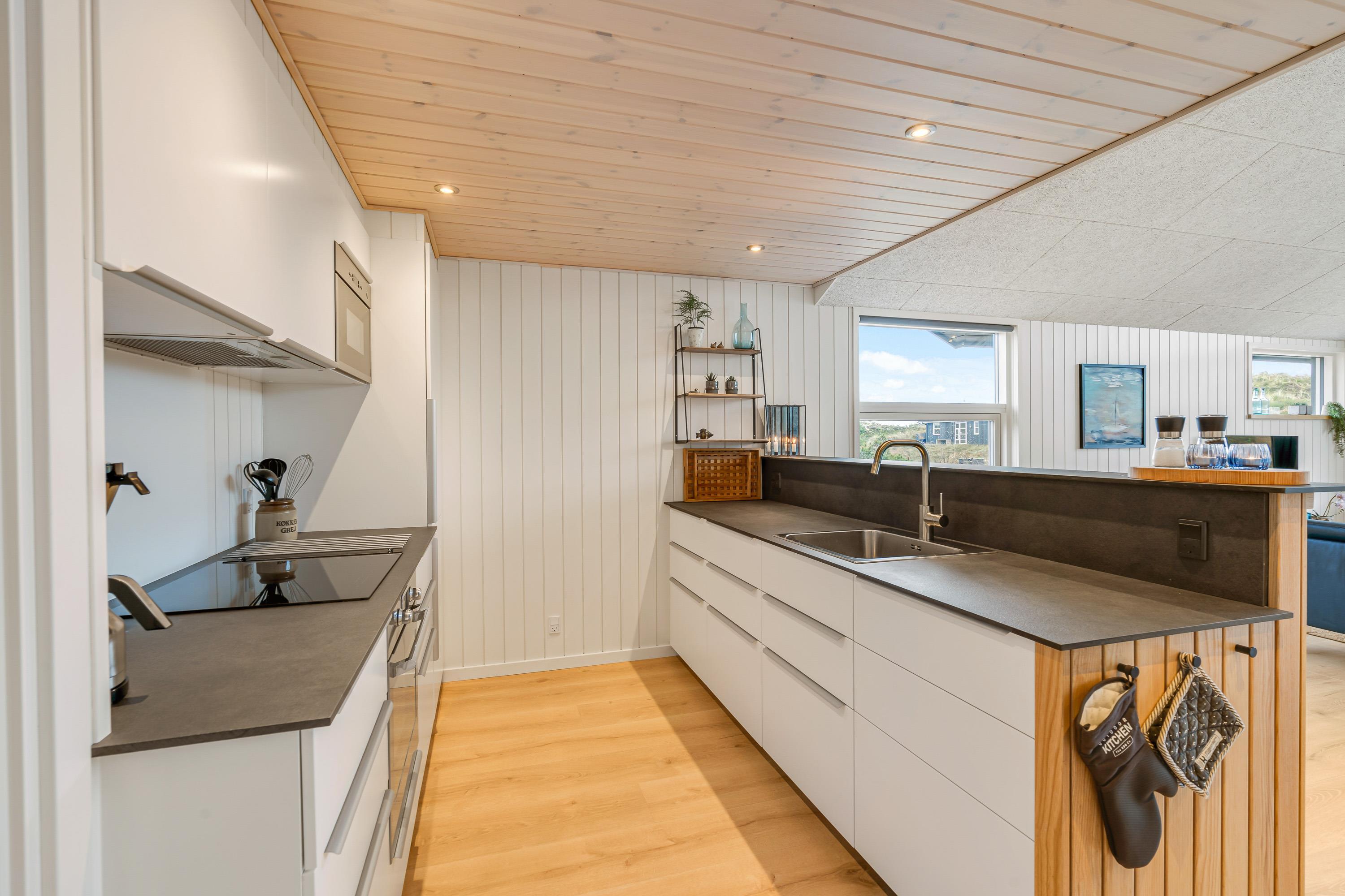 Det store samlingspunkt for jer i sommerhuset vil uden tvivl blive opholdsrummet, der forener køkken, stue og spiseplads. Her er der virkelig mulighed for, at I kan nyde hinandens selskab til fulde med madlavning, spisning, spil og film. Tænder I op i brændeovnen, sørger den for at sprede dejlig varme og for at fuldende den hyggelige feriestemning.