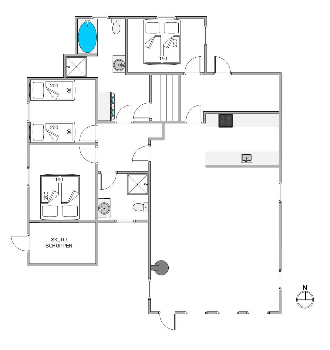 I sommerhuset er der hele 2 badeværelser, der begge endda er udstyret med gulvvarme, så I hverken skal stå i kø eller fryse fødderne fra morgenstunden. På det ene af badeværelserne har I desuden mulighed for at blive forkælet med masser af afslapning i spaen og saunaen.