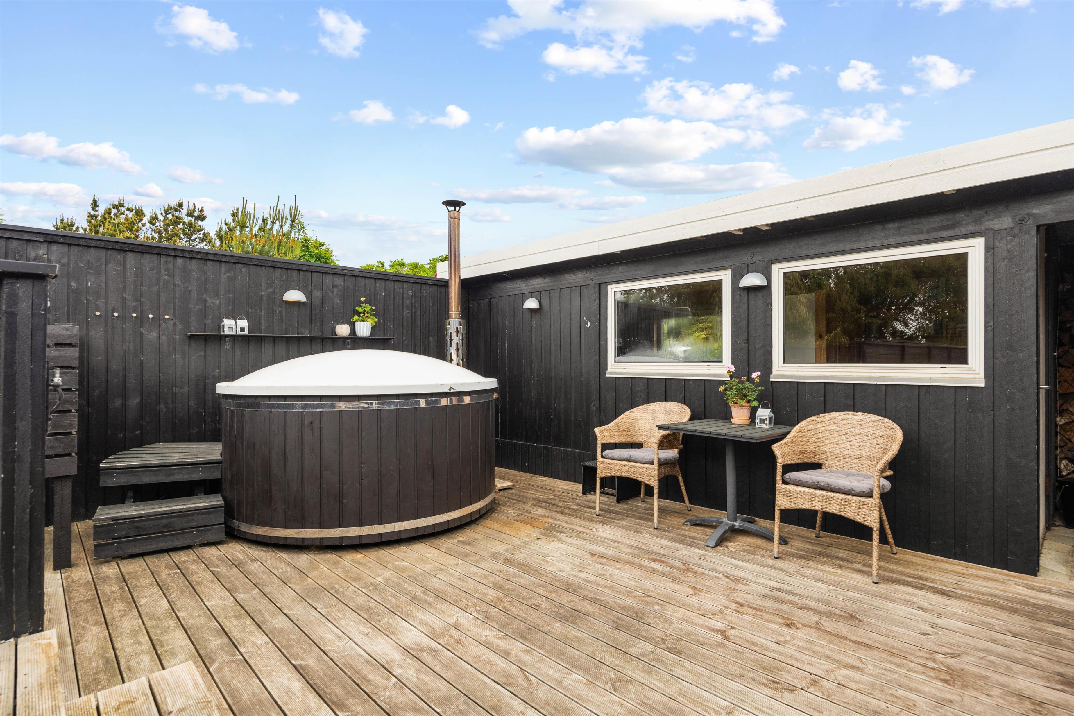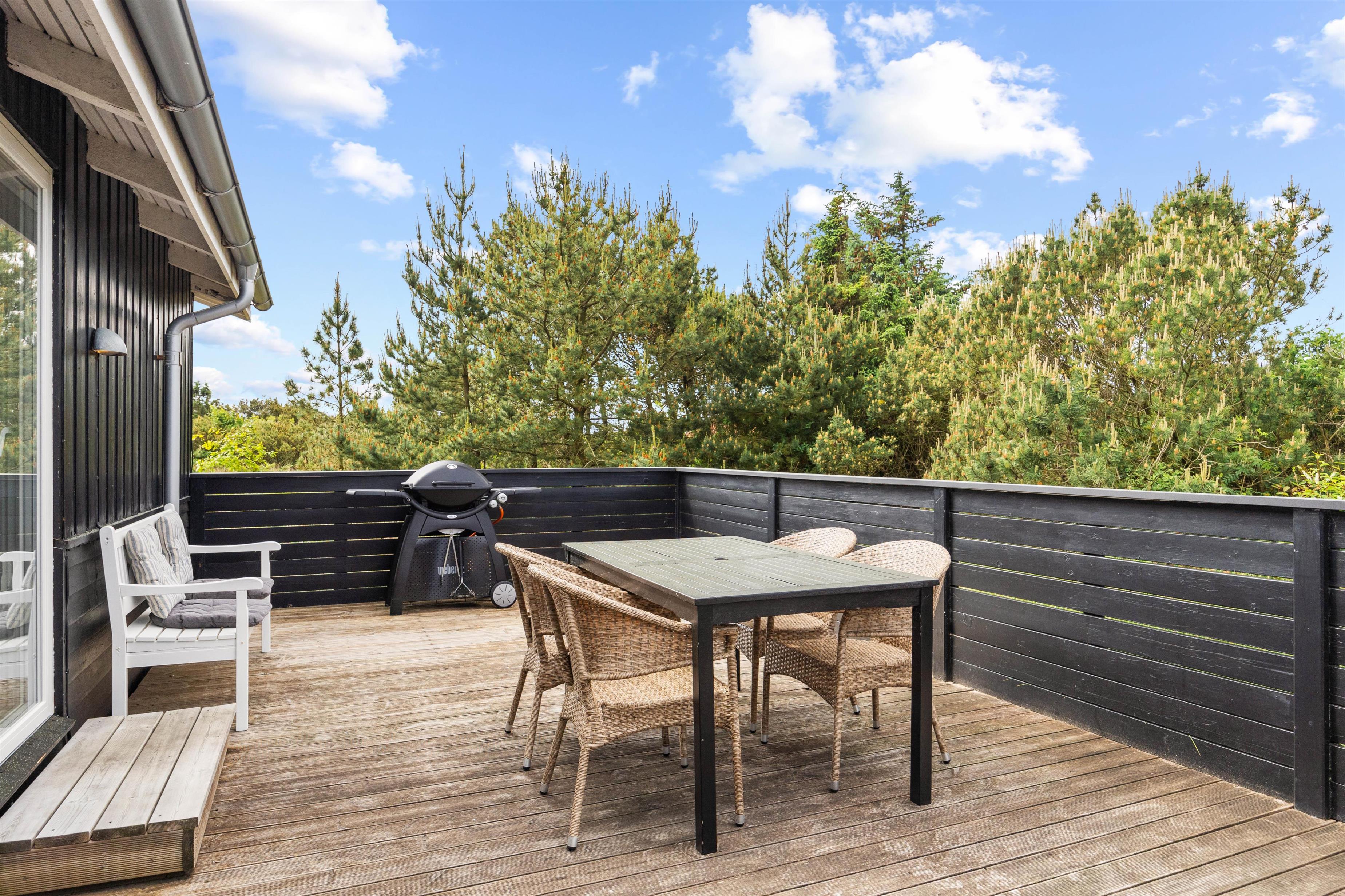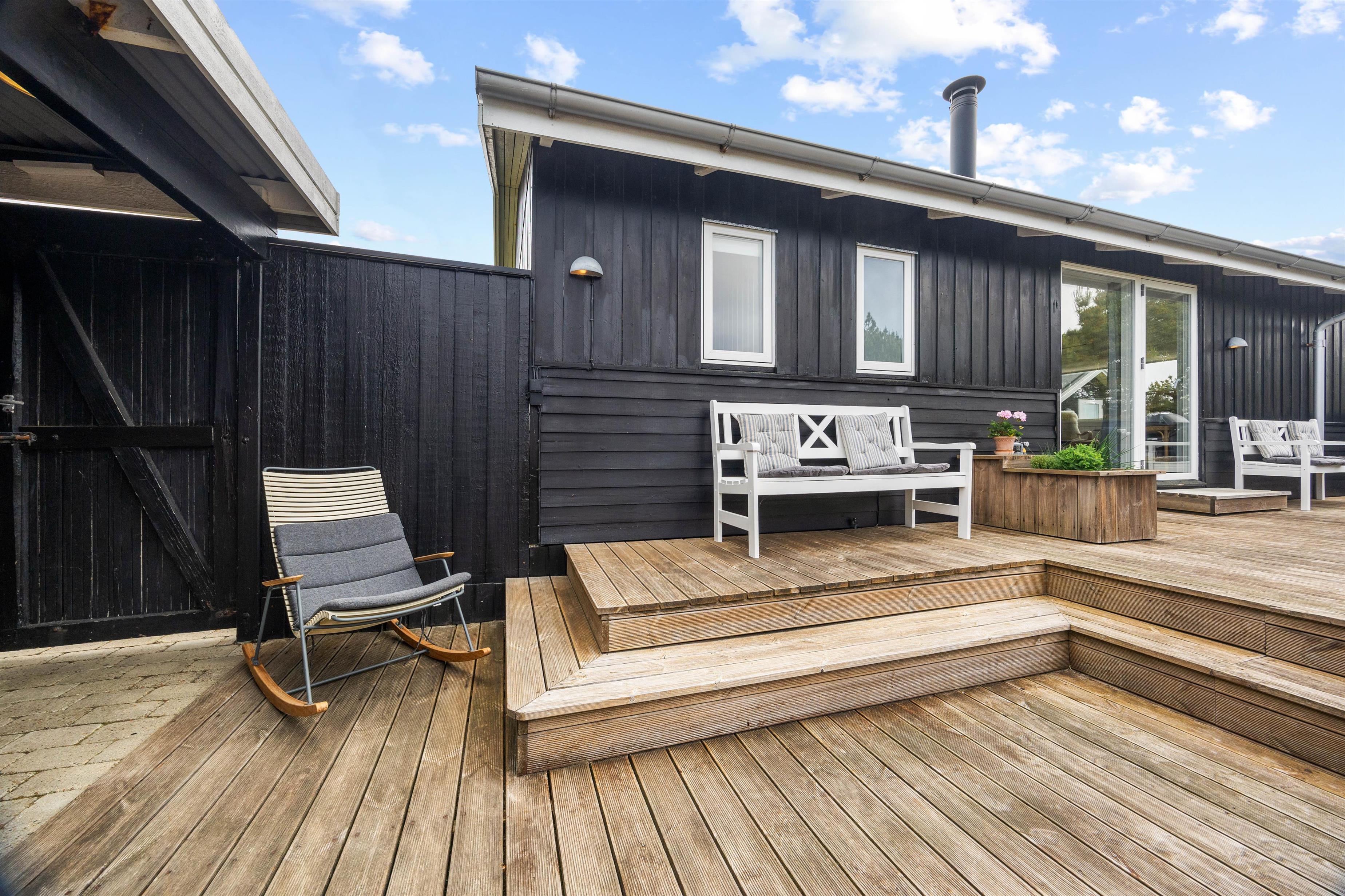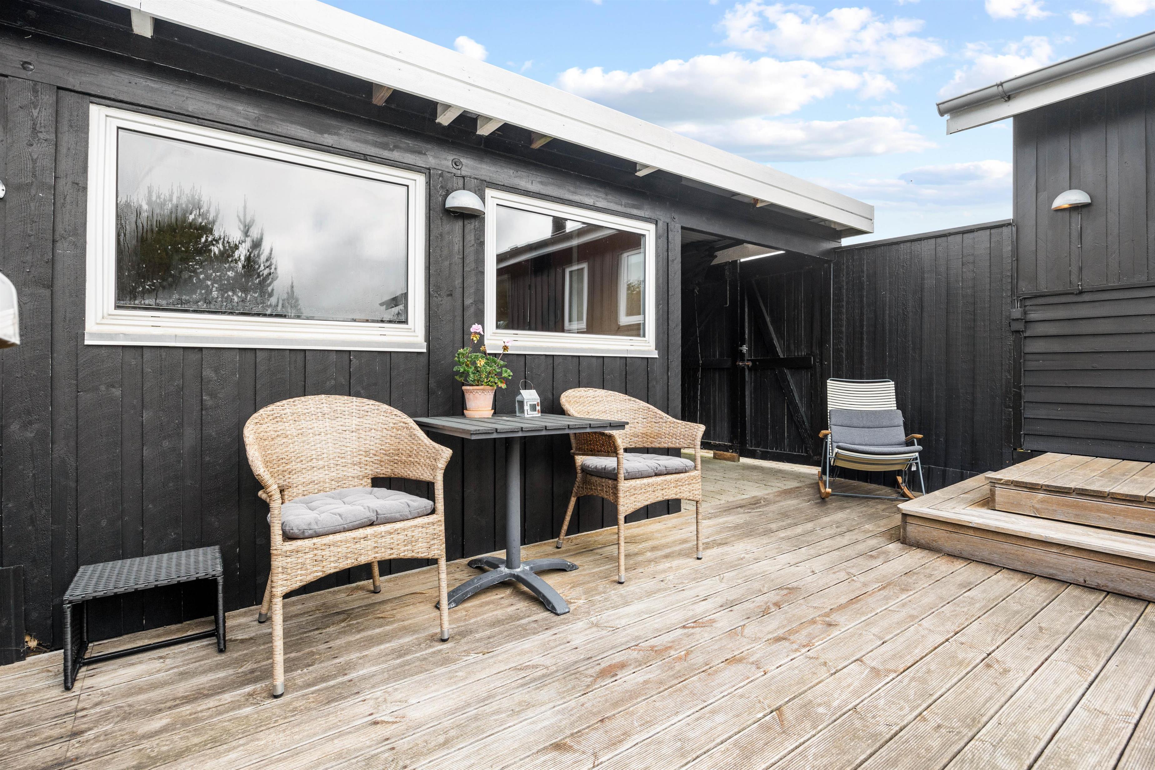 Lige udenfor sommerhusets alrum er der lagt den skønneste terrasse: På terrassen er der mange dejlige hjørner, hvor solvogne og havemøbler står klar til, at I kan nyde nogle dejlige dage. Om aftenen kan I tænde op for grillen og nyde aftensolen på den dejlige vestvendte terrasse, som I kan træde ud på fra sommerhusets alrum.