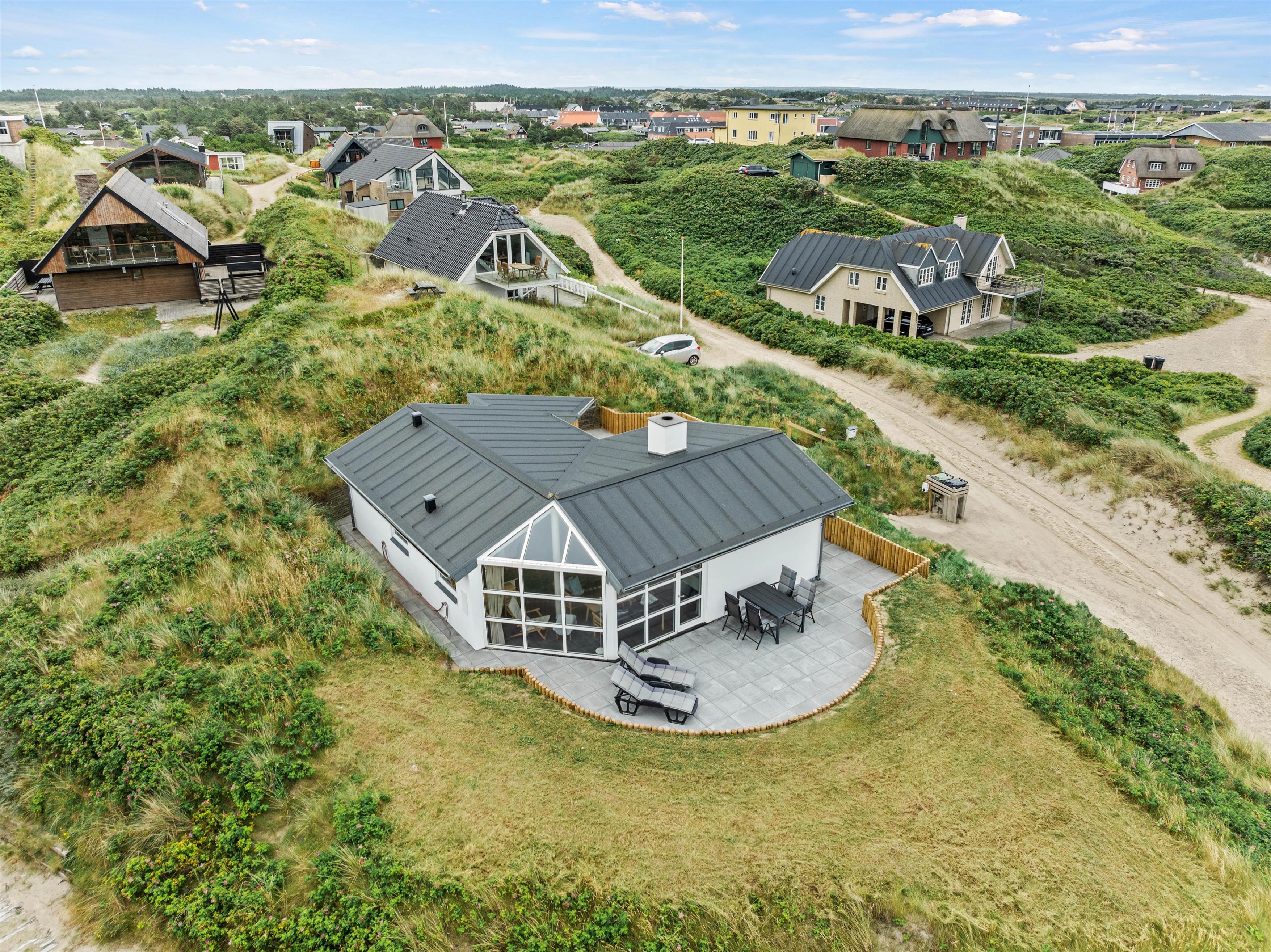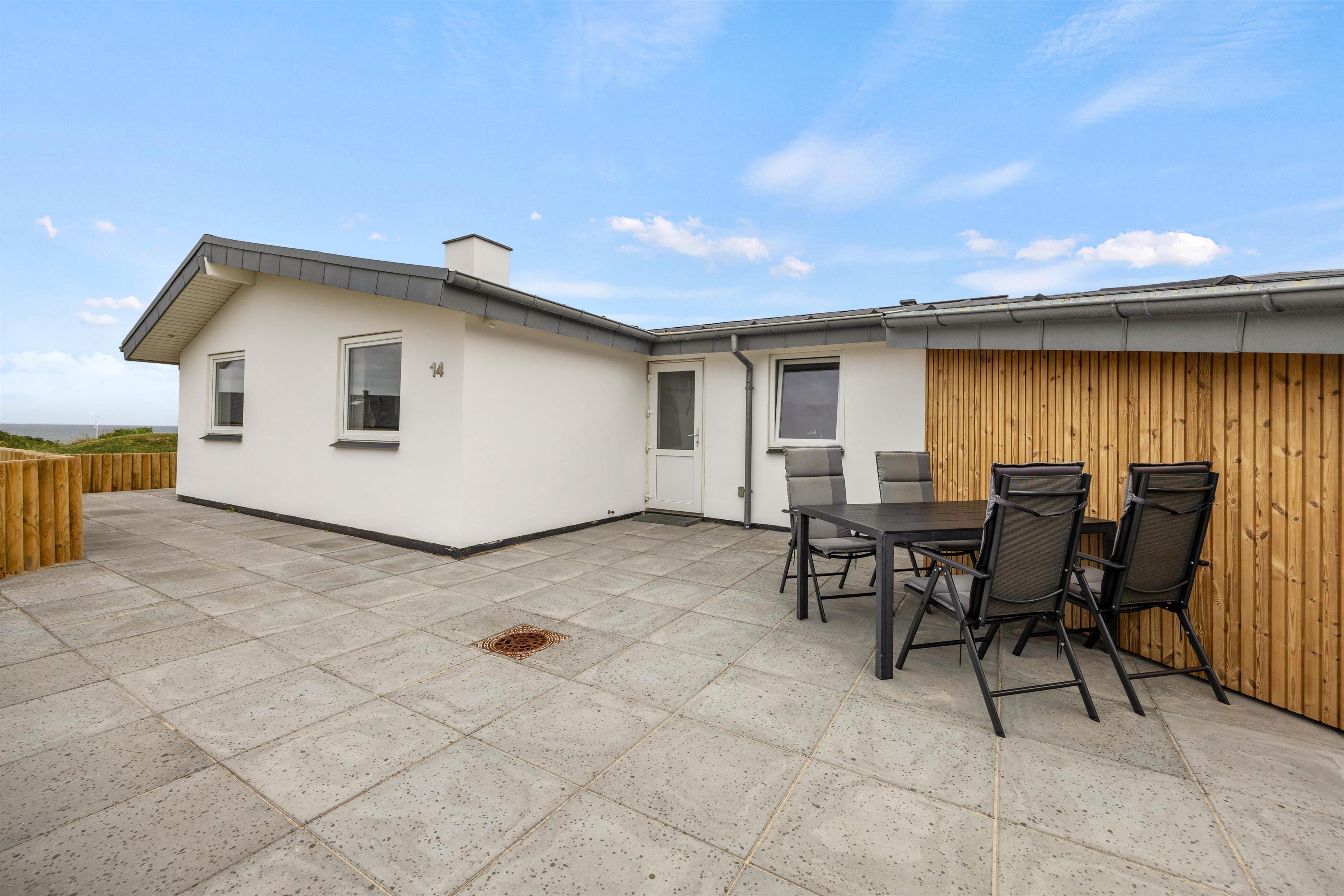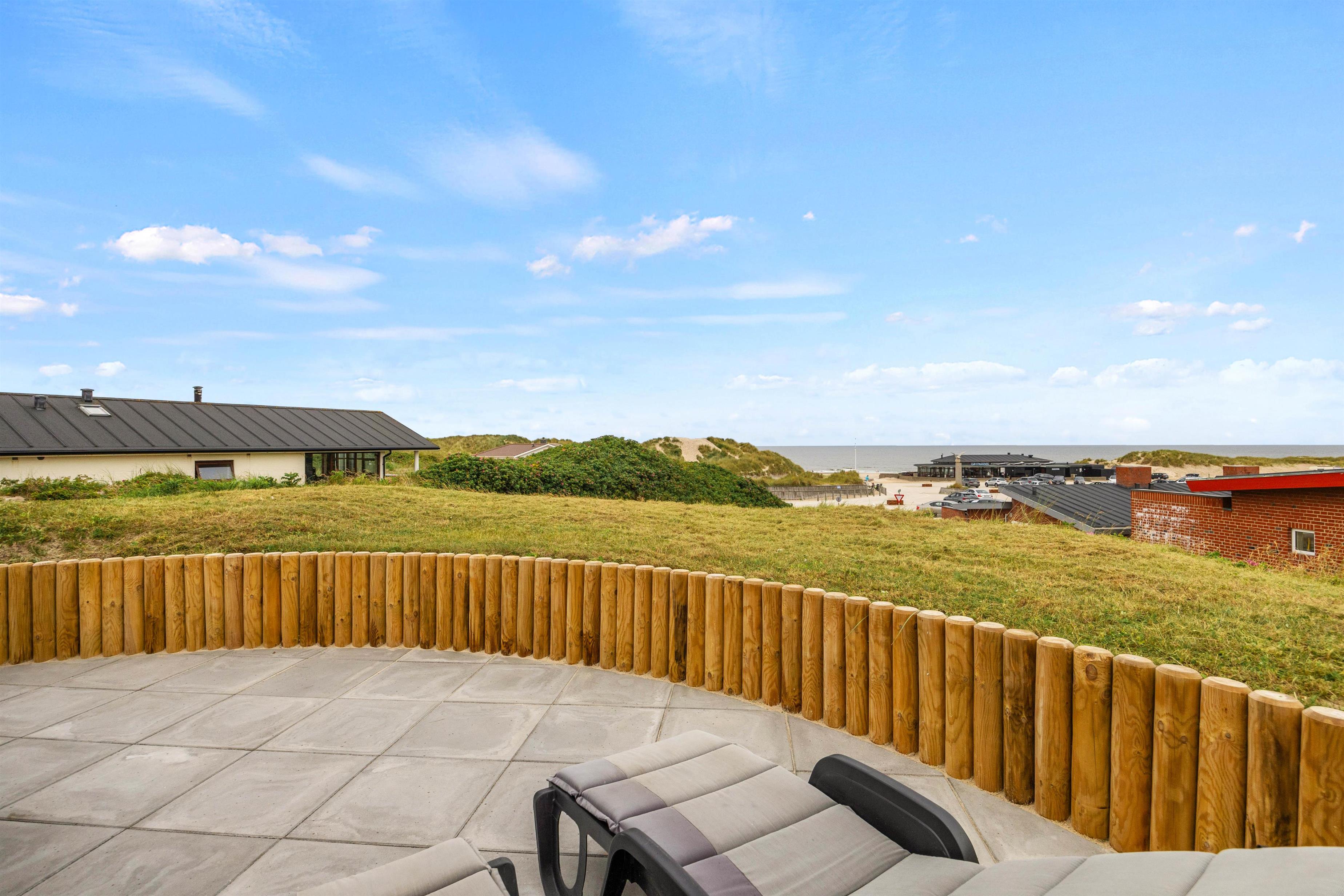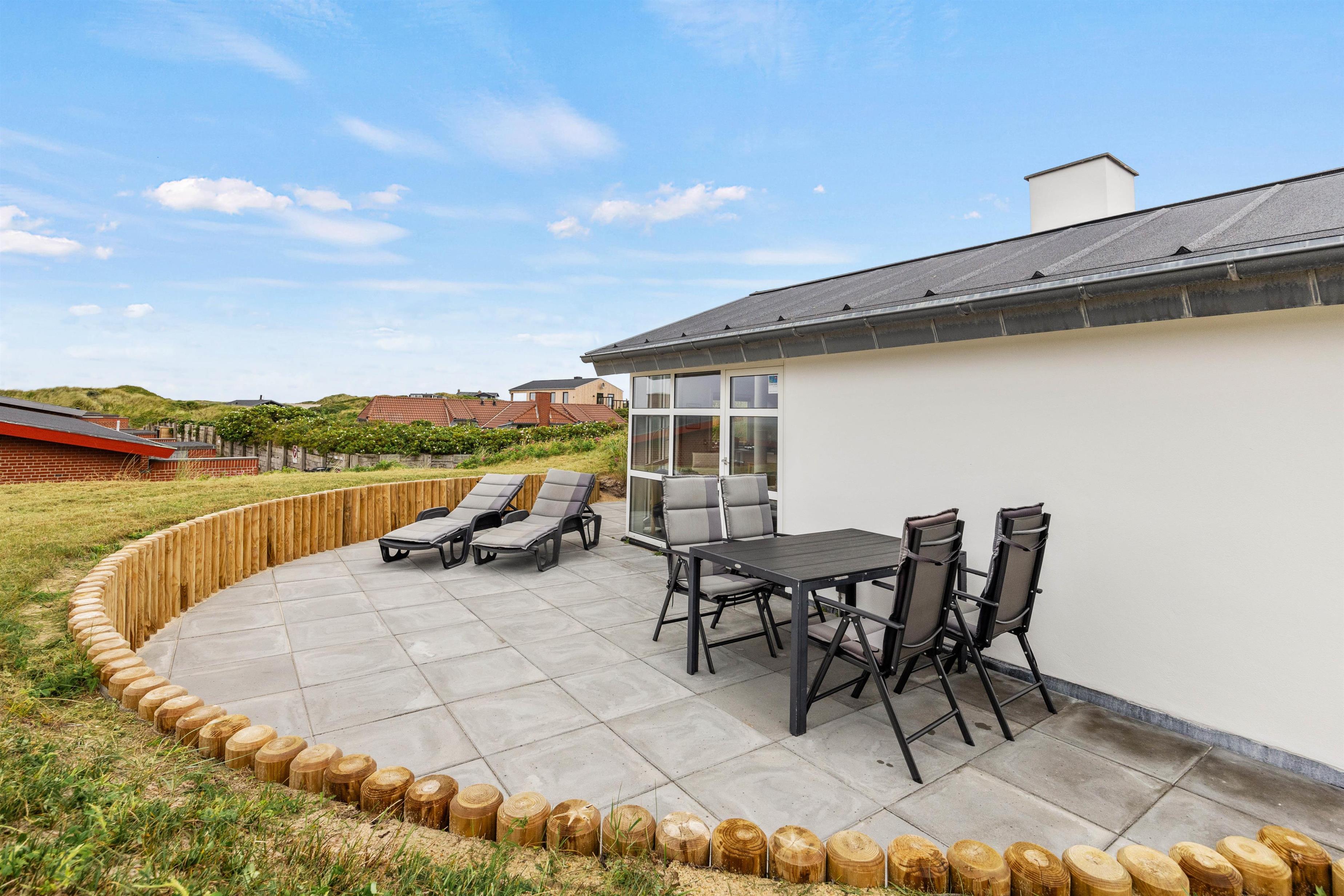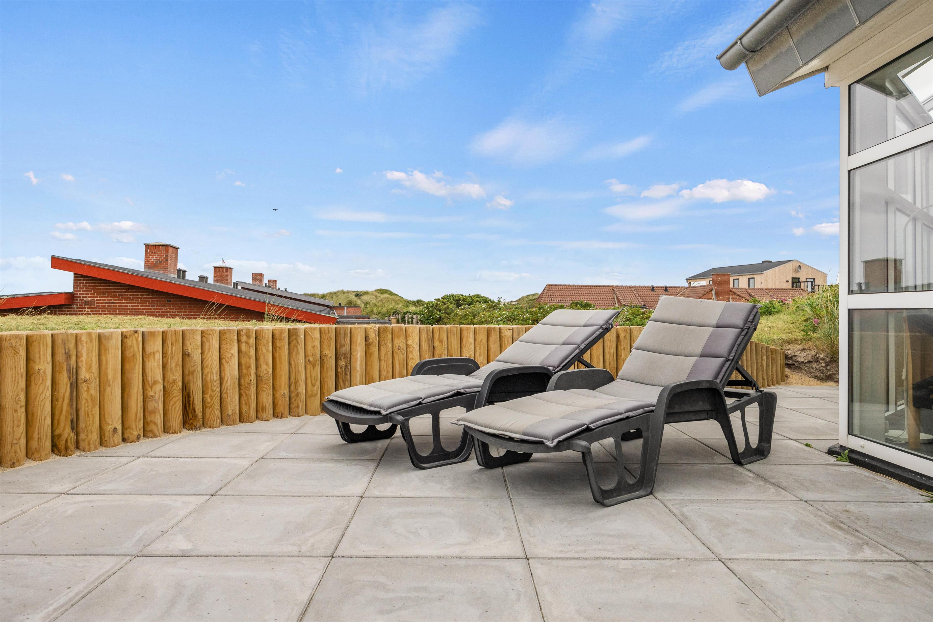 Uanset tidspunktet på dagen, er det stort set altid muligt at finde et hyggeligt sted på terrassen. Nyd roen og klitterne omkring jer. Her kan I nyde kaffen, solbage og til aften tænde op i grillen. Tilbered et ekstra lækkert måltid og slut aftenen af med solnedgangen på stranden.