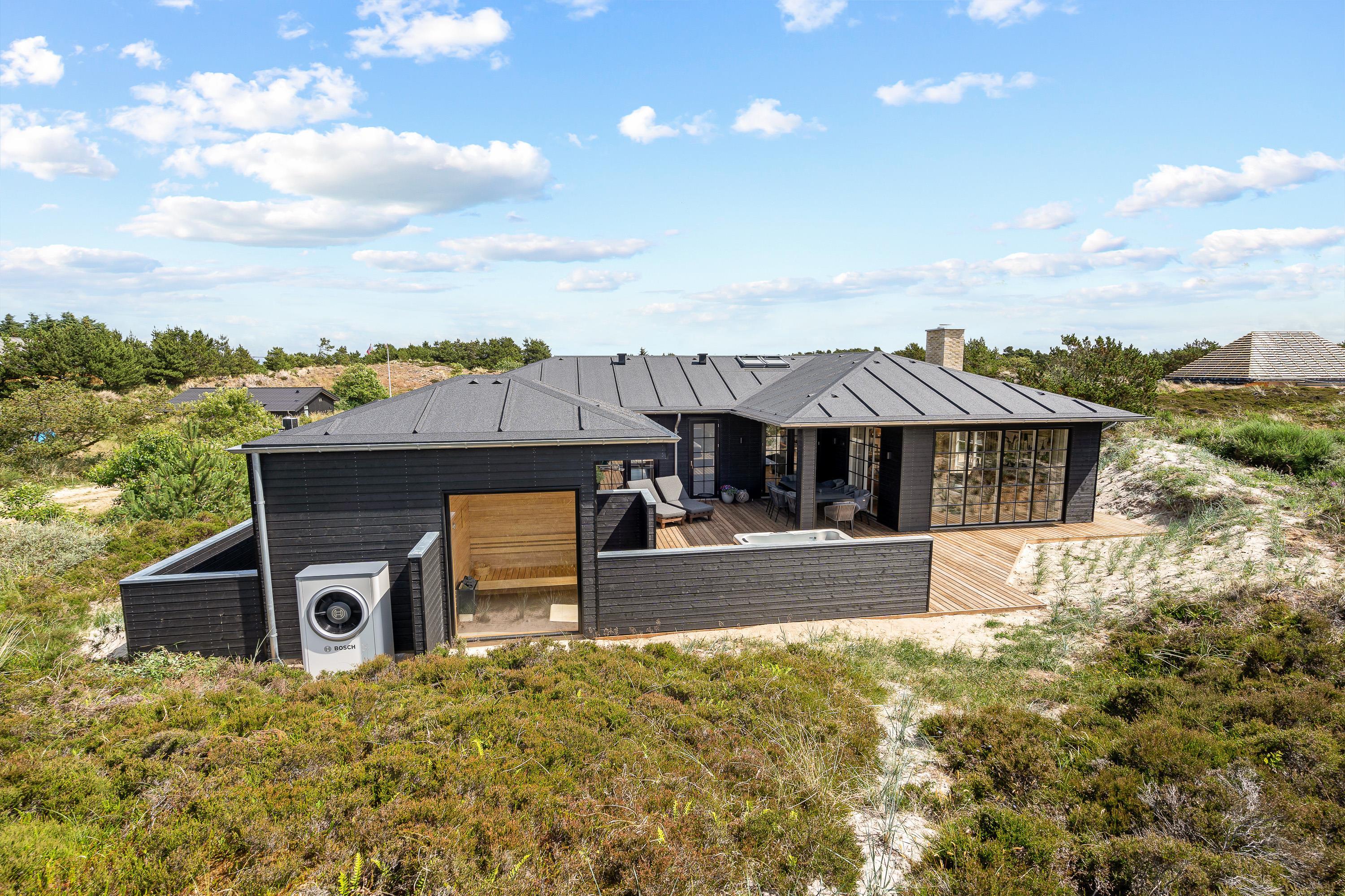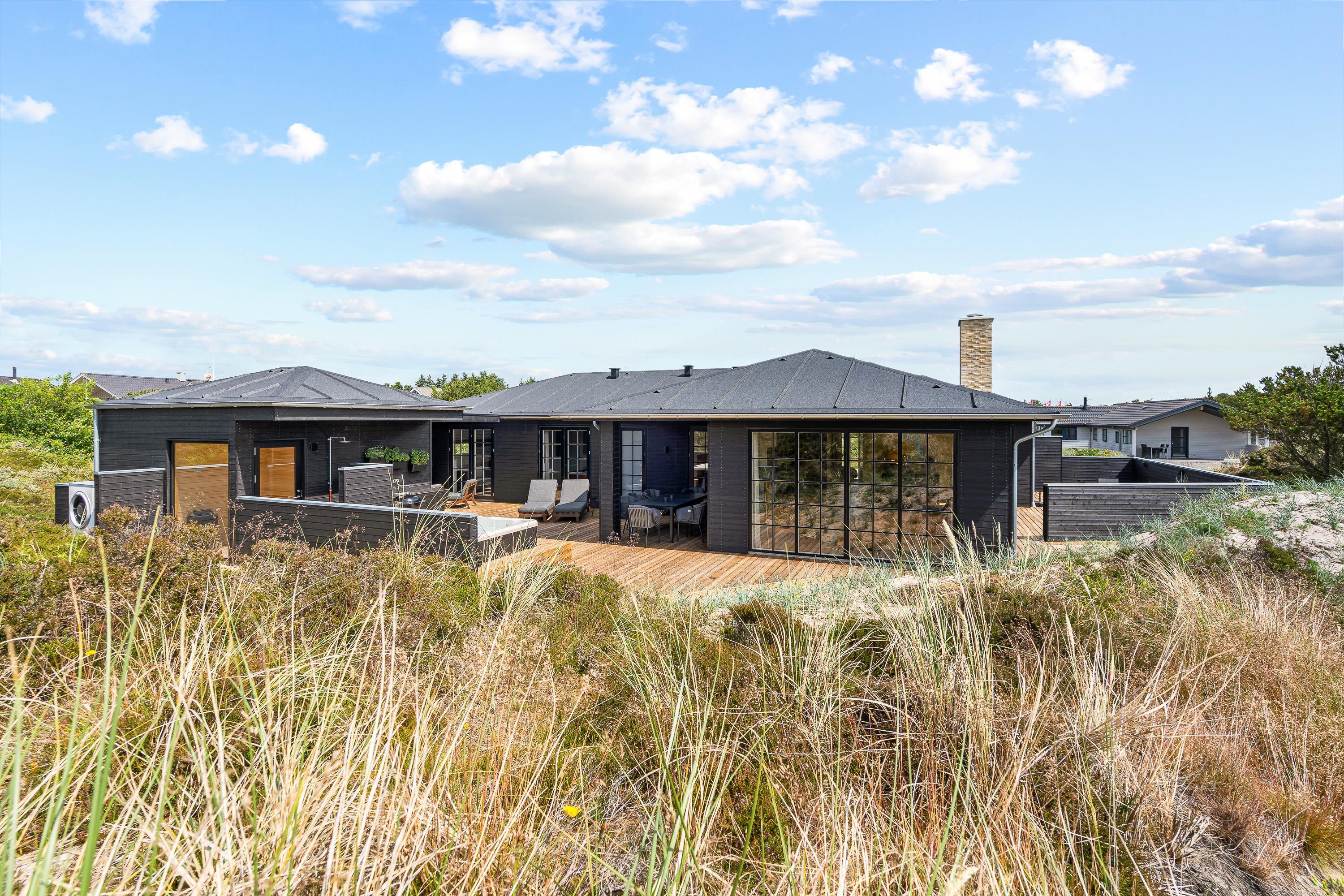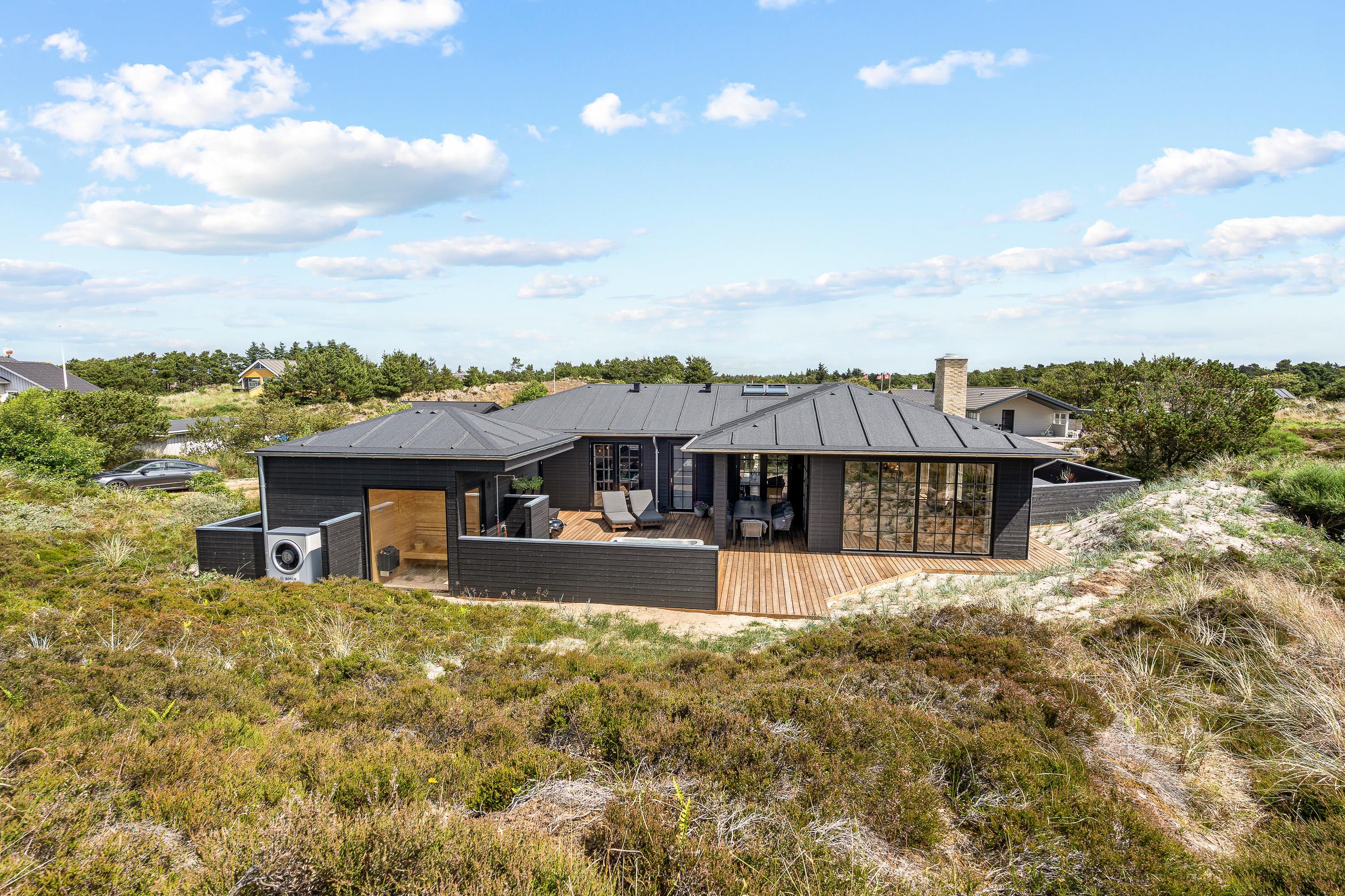 Til jer, der gerne vil holde en ferie i naturskønne omgivelser tæt på Vesterhavet og samtidig nyde en masse afslapning og luksus, er dette sommerhus på Frytlevej 8 det perfekte valg. Det moderne sommerhus, der er bygget i 2022, ligger forenden af en blind vej, kun 700 meter fra Vesterhavet og byder på blandt andet udespa, udesauna, udebruser og billardbord. Her er noget for enhver, og I vil uden tvivl få jer en dejlig ferie i dette sommerhus. Feriehuset rummer plads til 8 personer, og har I hund, er den også velkommen. Desuden er det muligt at lade jeres el-bil op ved feriehusets ladestander - eget kabel (type 2) medbringes.