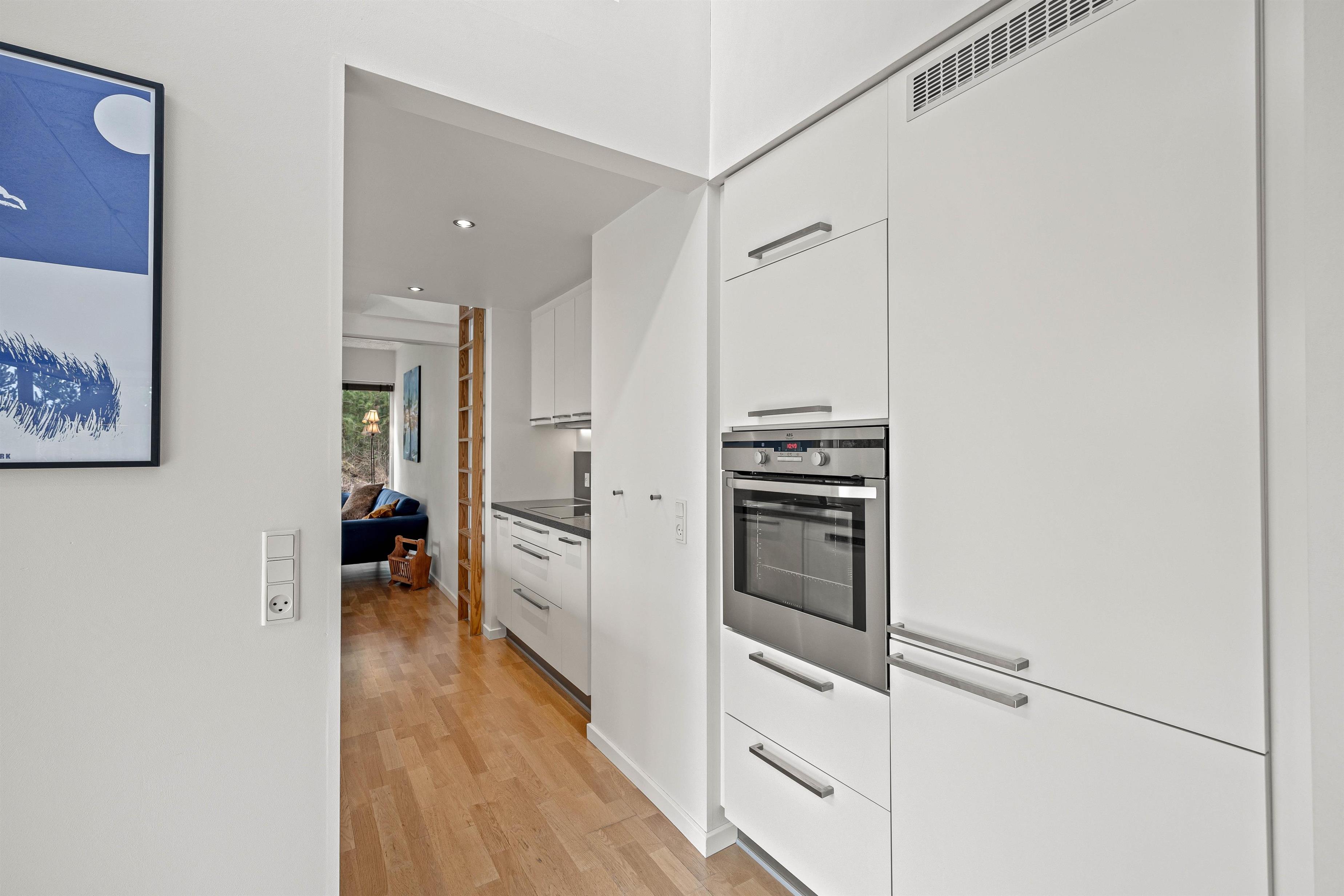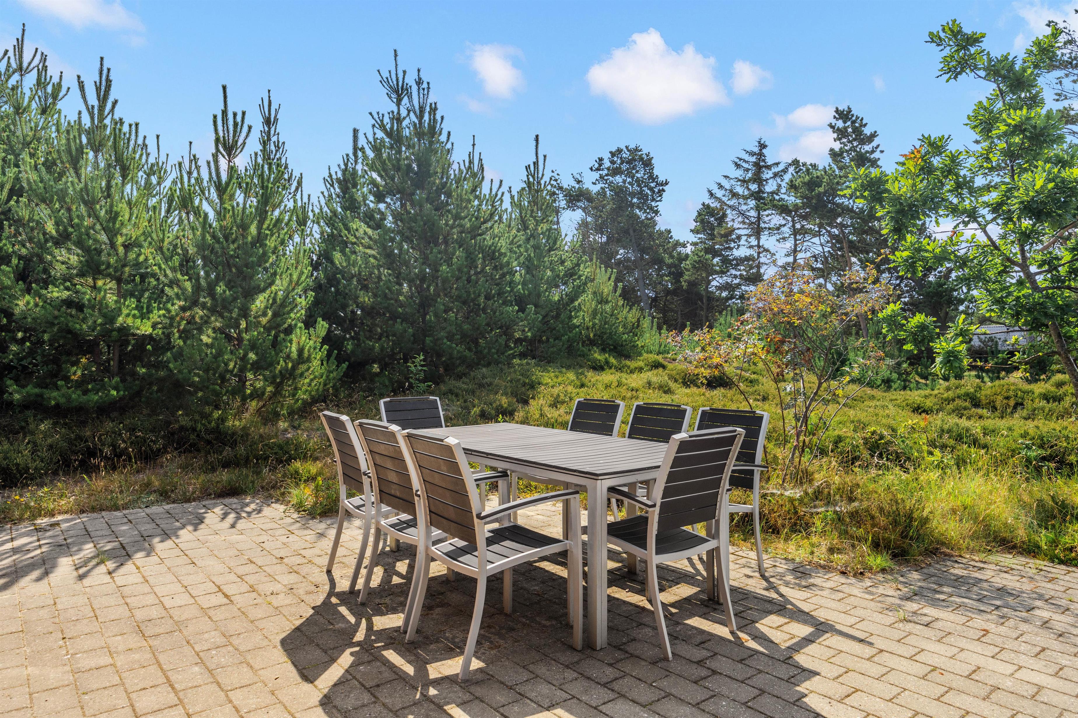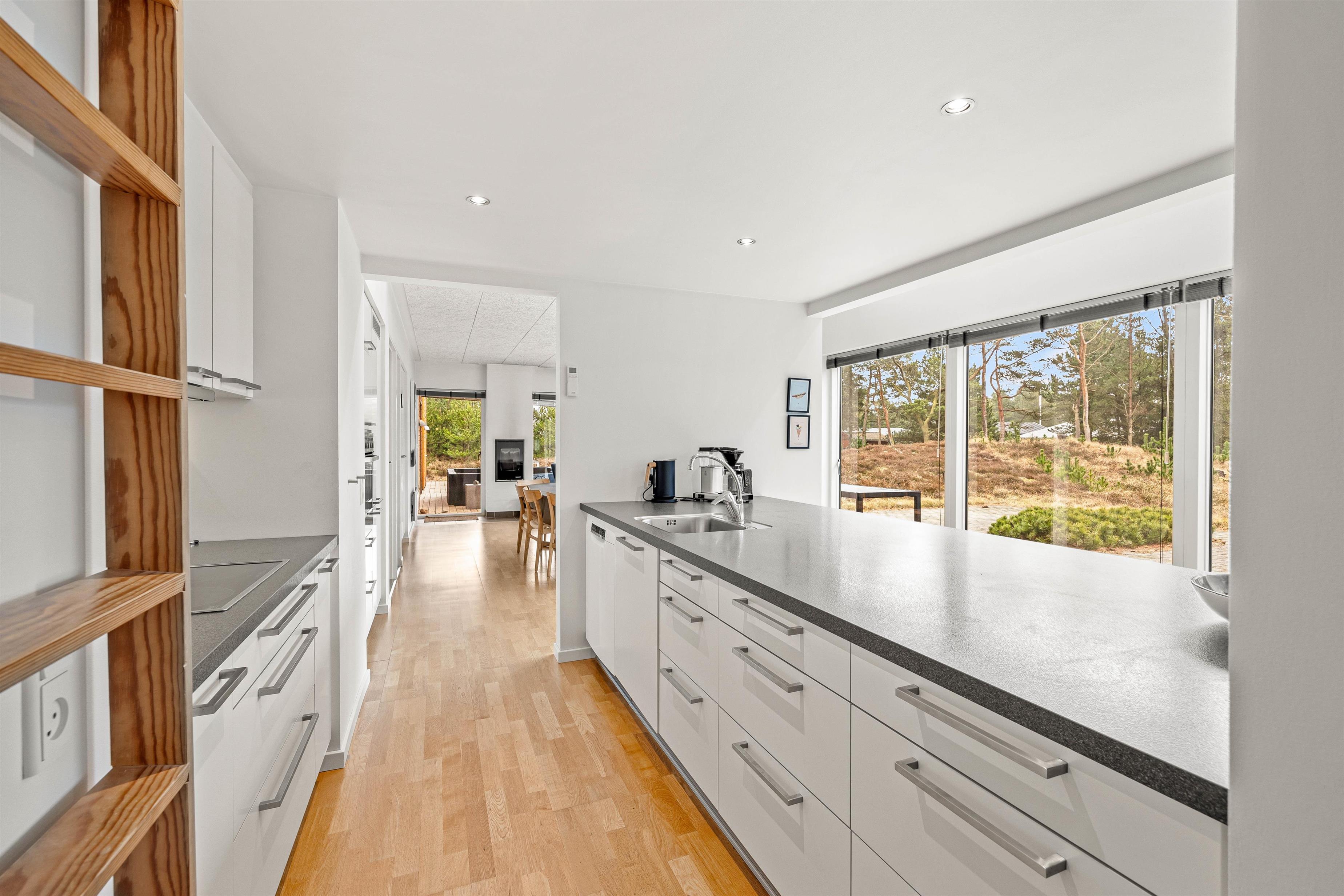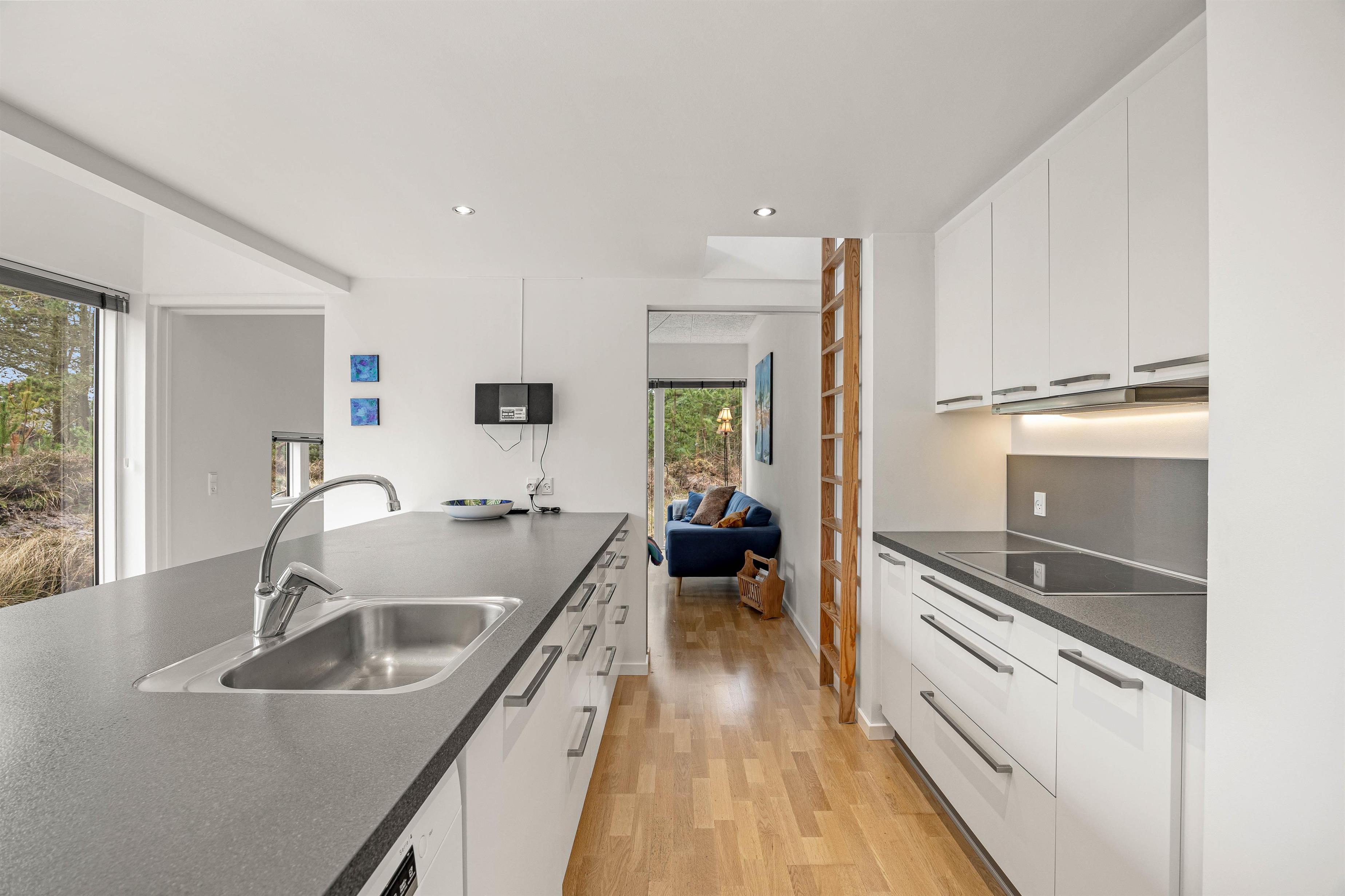 Sommerhusets køkken, som ligger i direkte forbindelse med stuen, er velindrettet, og udstyret opvaskemaskine og en 80 L separat fryser. Til sommerhusets køkken hører også en udendørs grill – ved hjælp af denne kan I nyde jeres tilberedte måltider direkte på terrassen, som byder en skøn udsigt til de naturskønne omgivelser, som denne egn byder på.