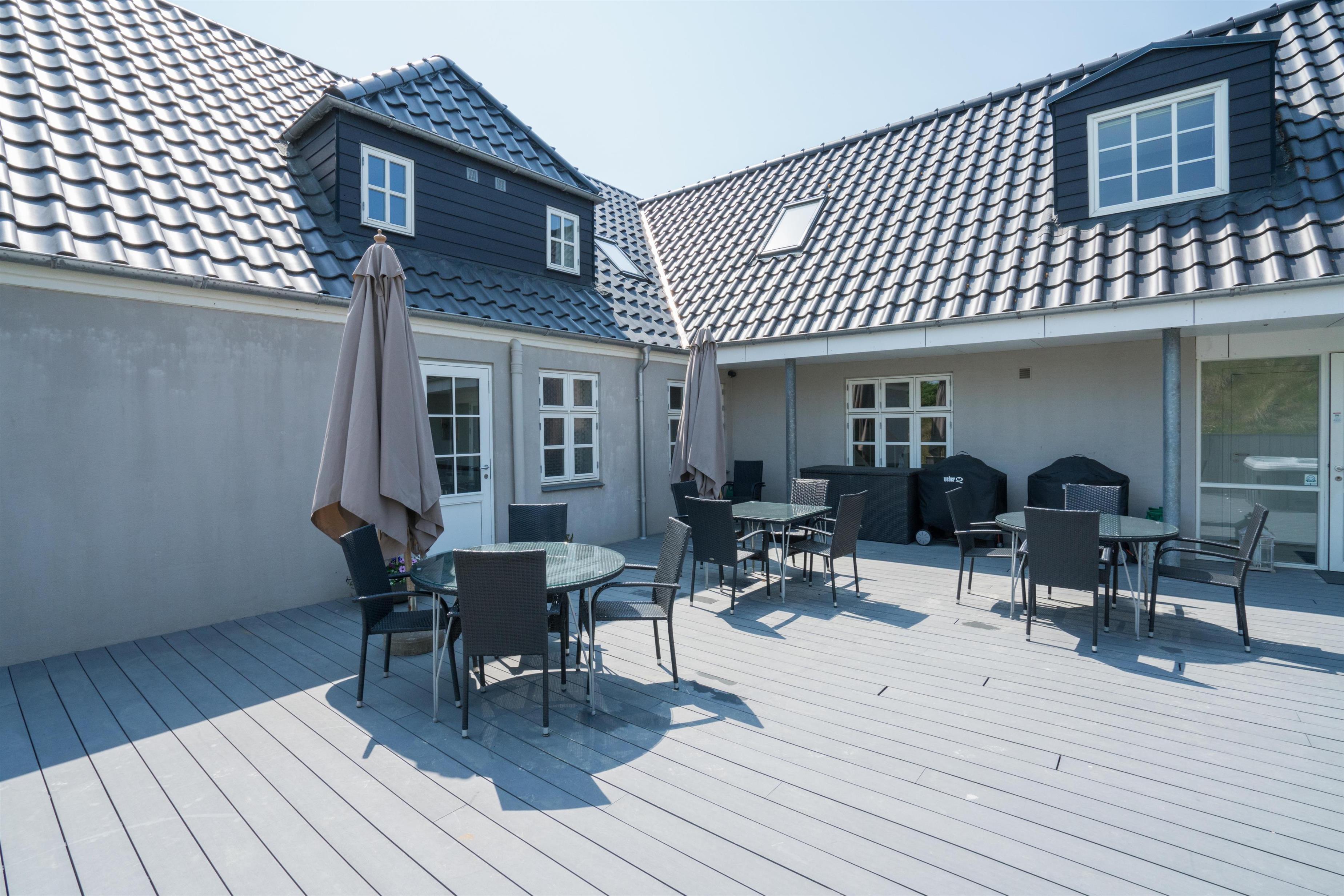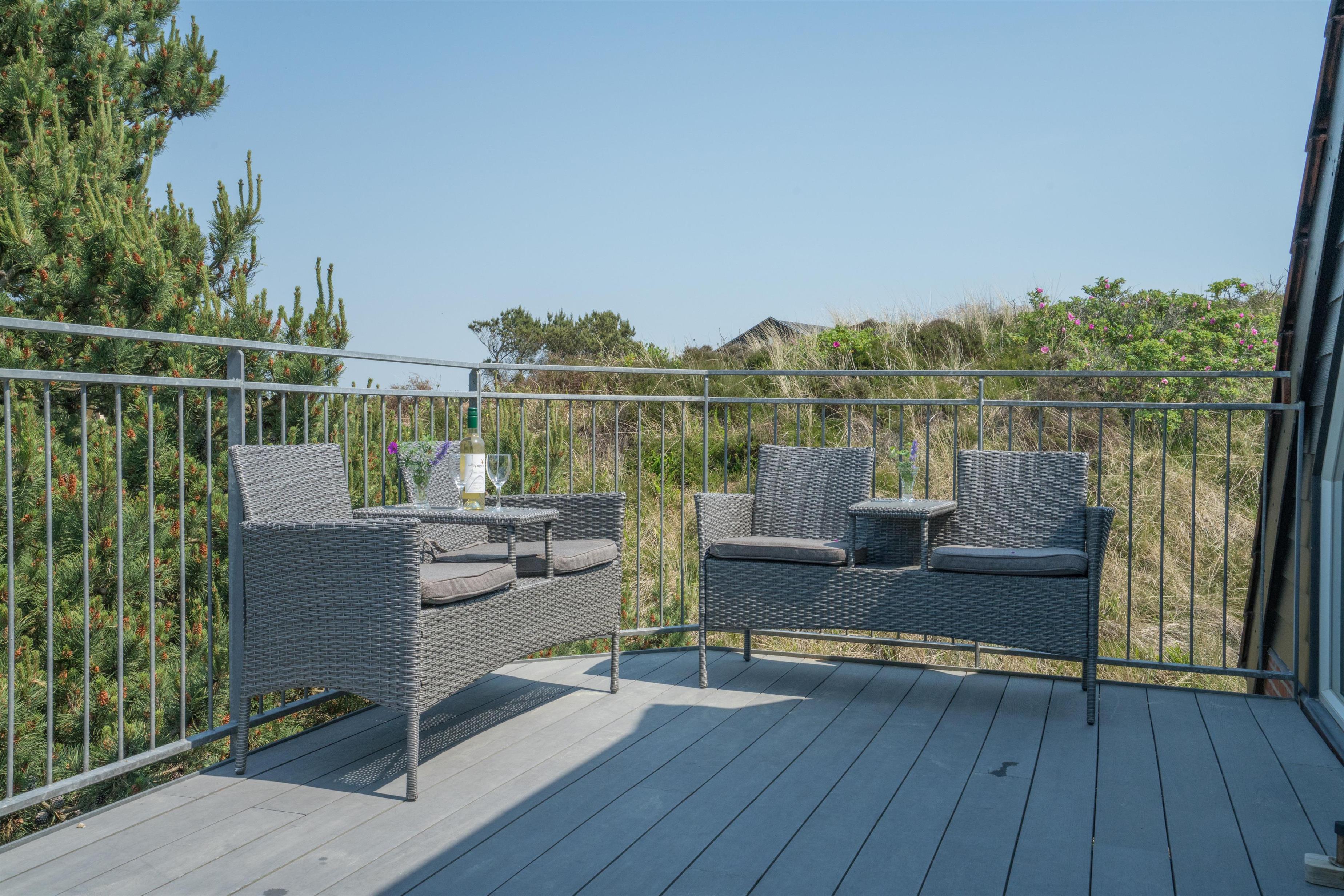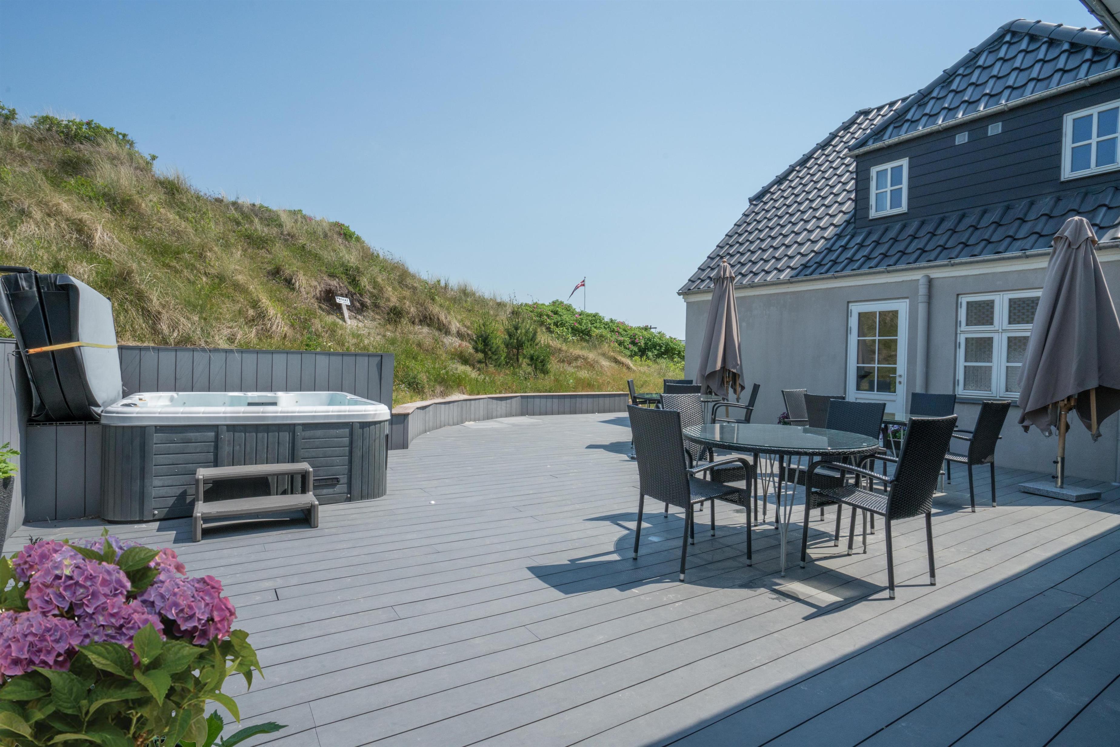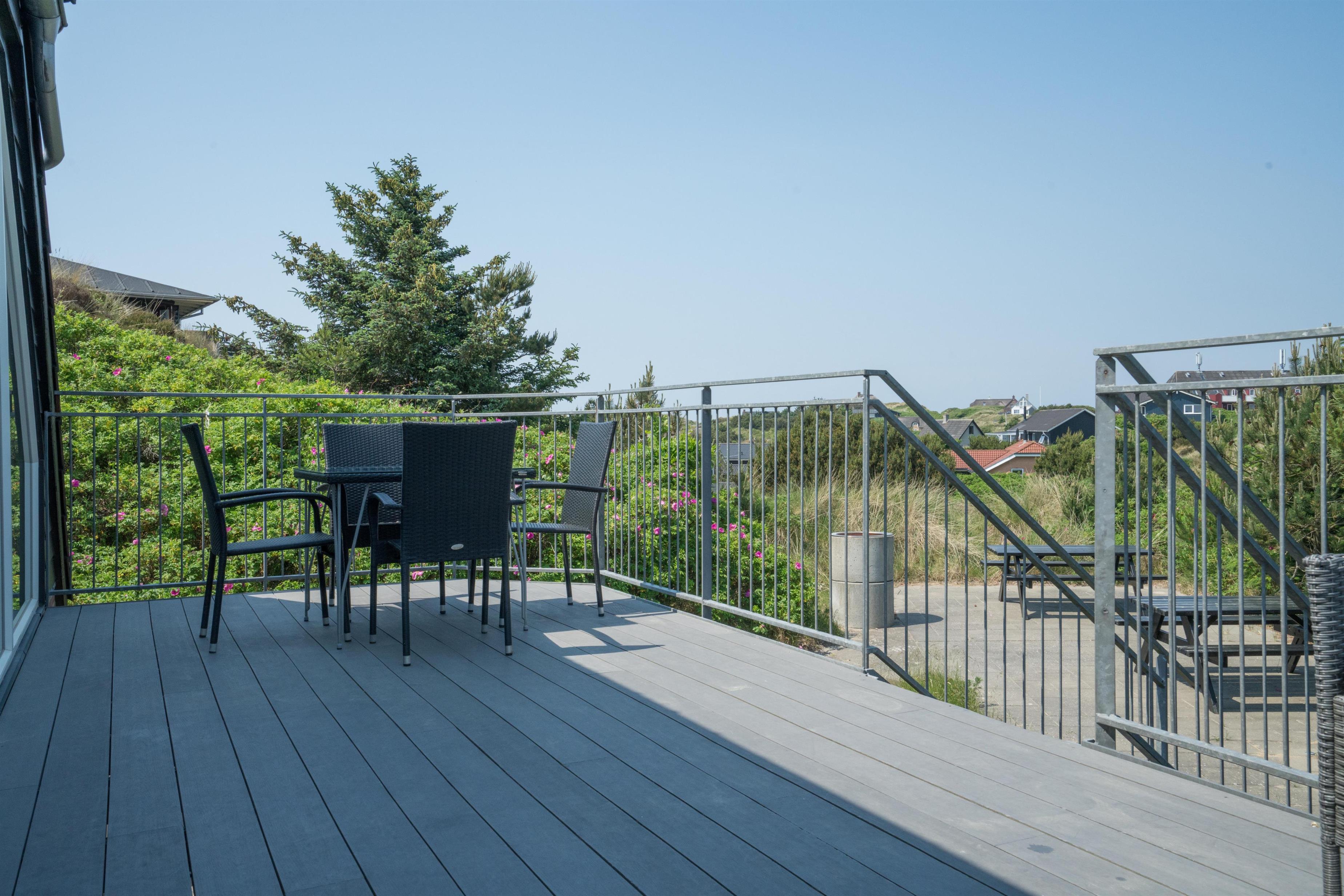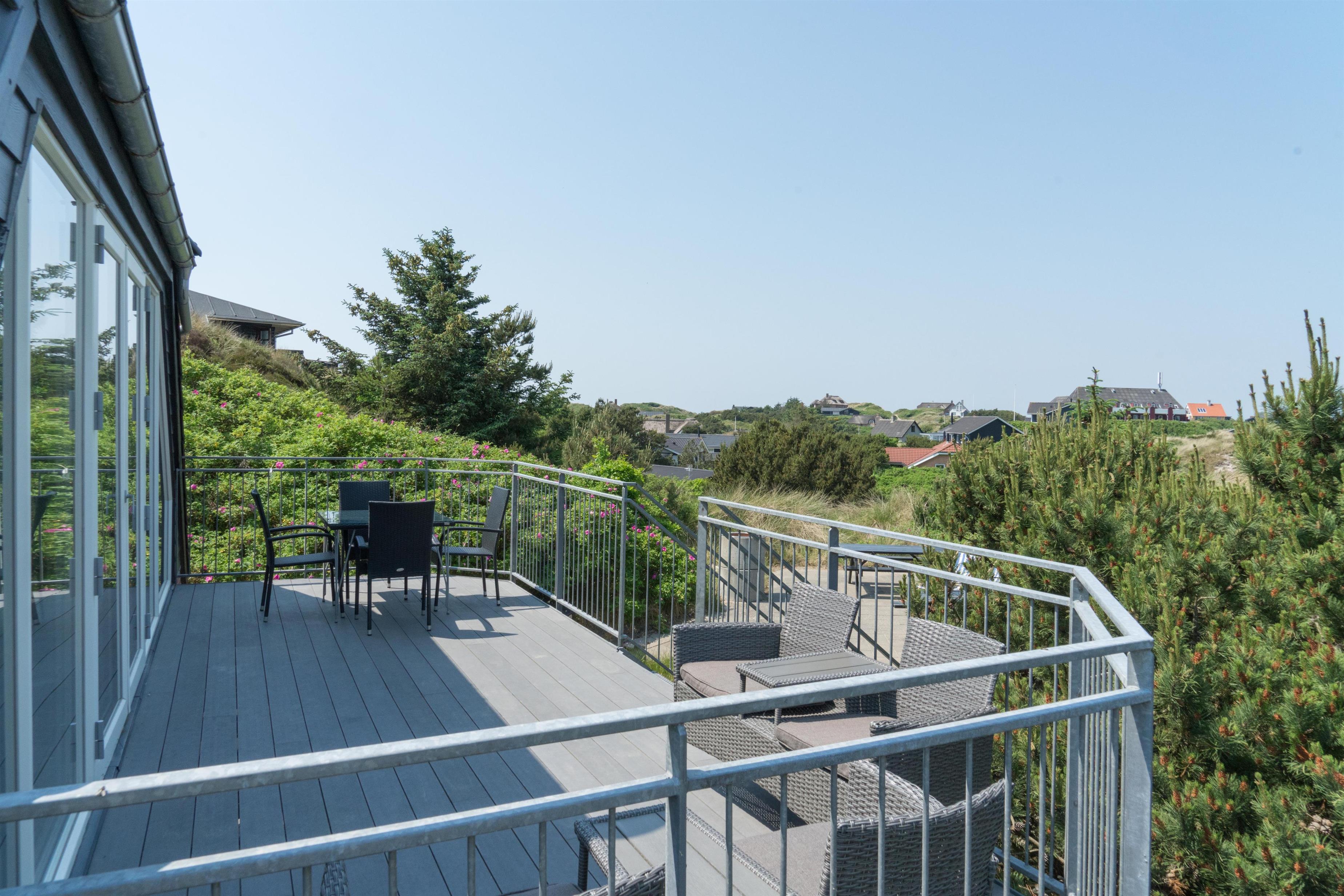 På 1 sal kan man samles til hygge og afslapning. Der er herfra adgang til den nord-vest vendte altan som byder på flotte solnedgange med en malerisk udsigt ud over det spændende sommerhusområde. Der er tre store møblerede terrassemiljøer rundt om huset.