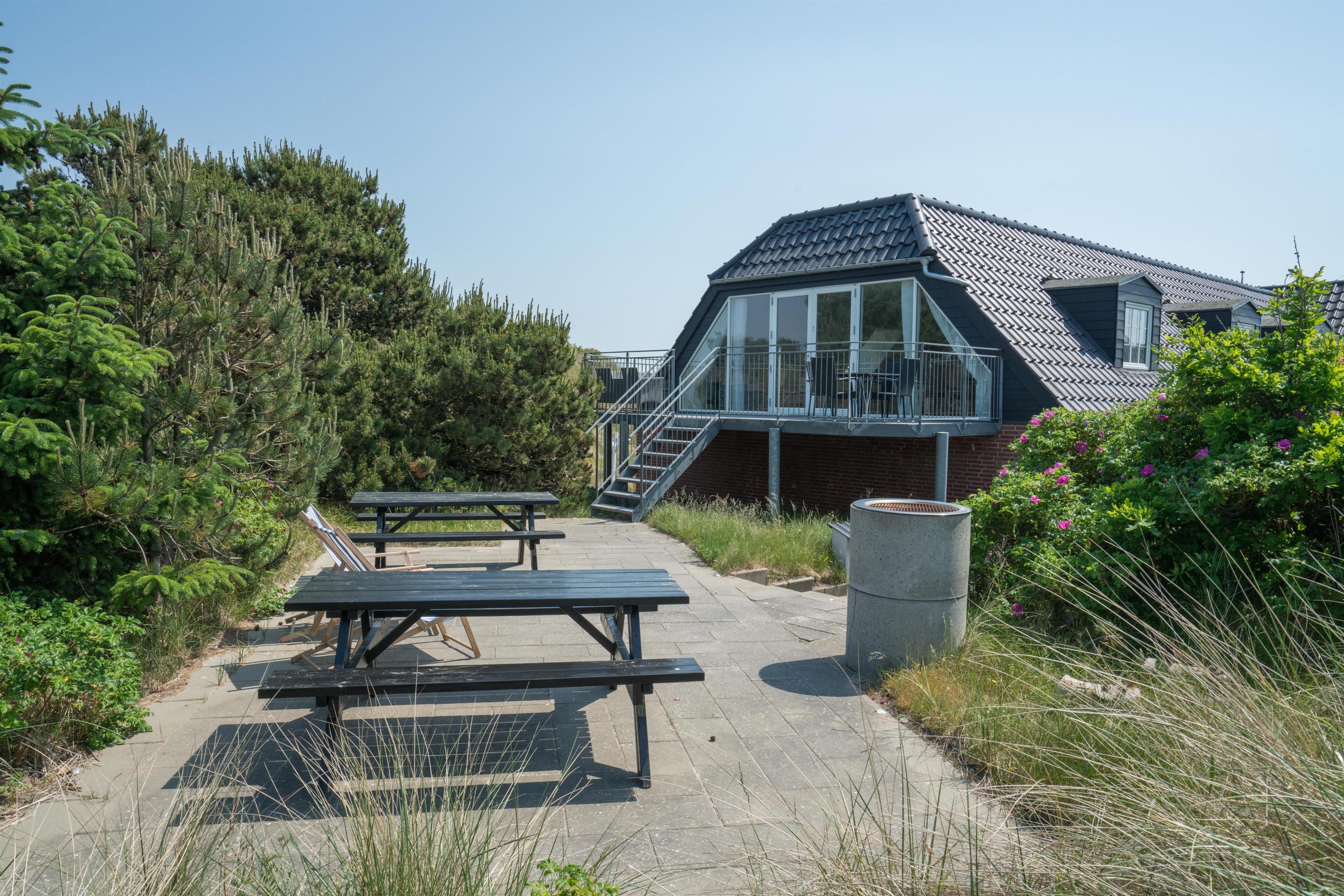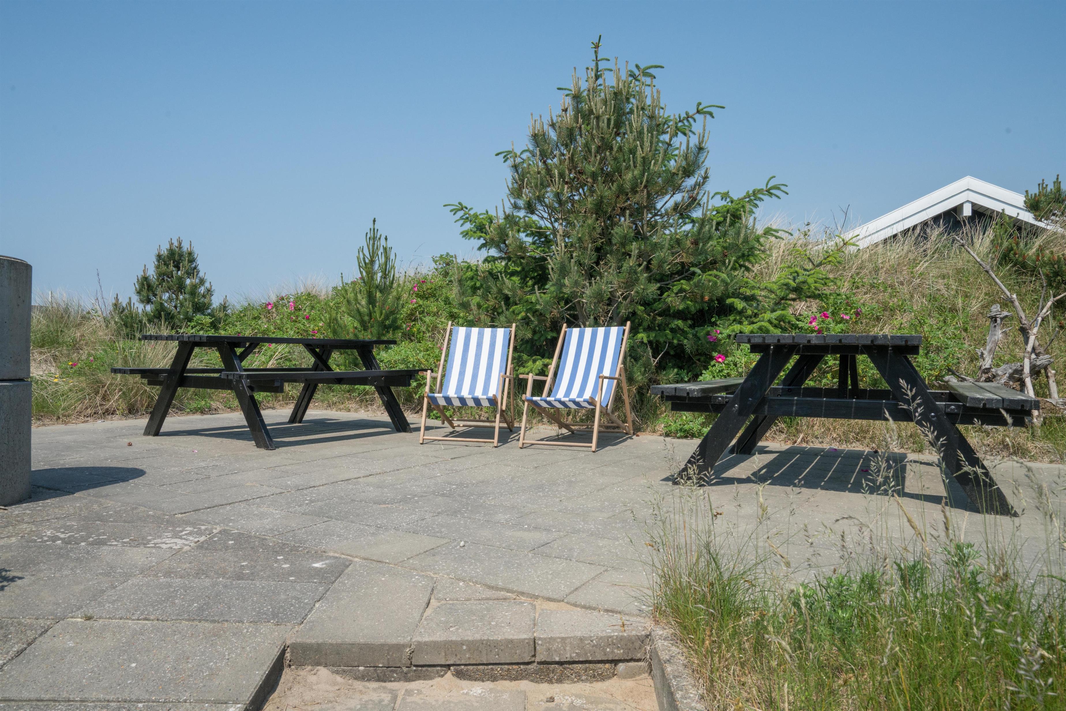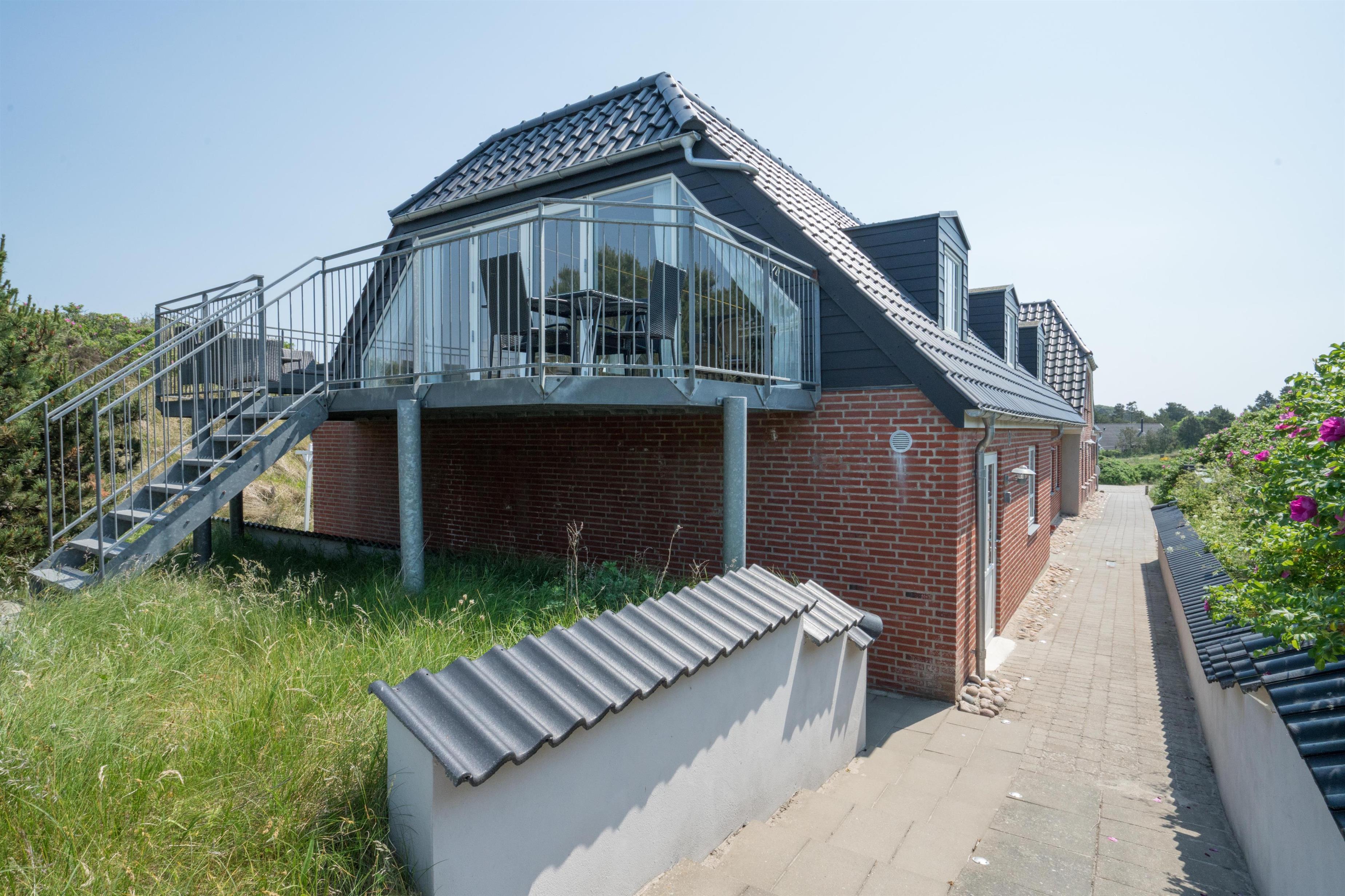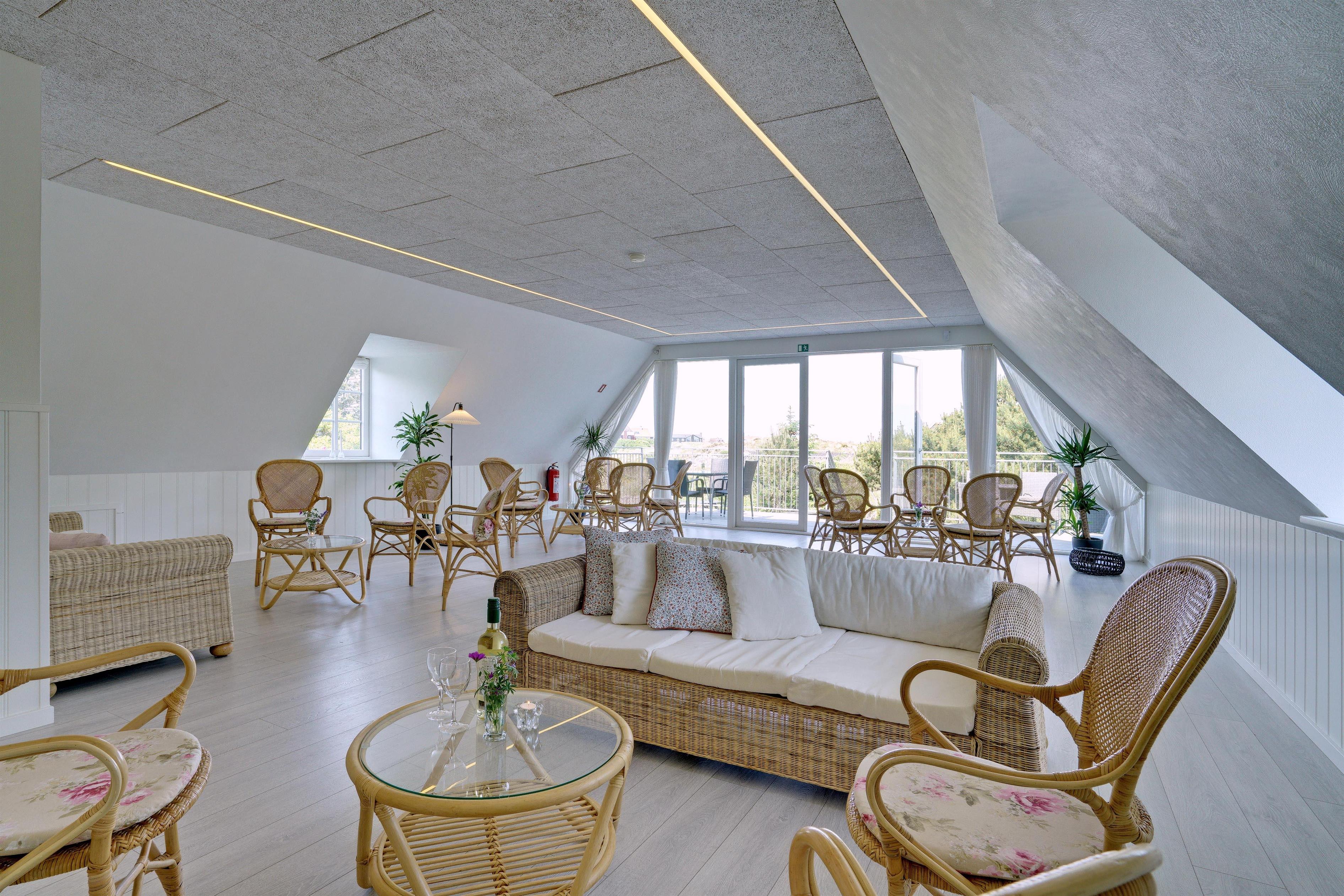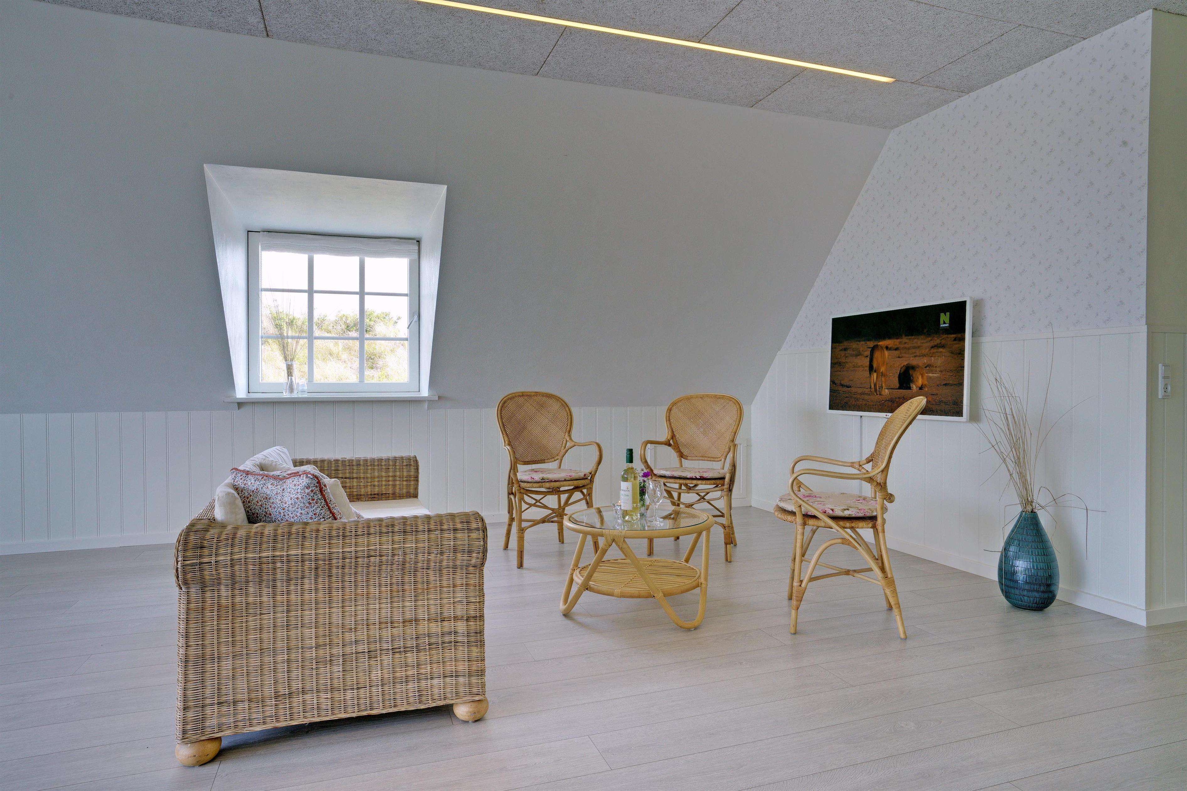 På 1 sal kan man samles til hygge og afslapning. Der er herfra adgang til den nord-vest vendte altan som byder på flotte solnedgange med en malerisk udsigt ud over det spændende sommerhusområde. Der er tre store møblerede terrassemiljøer rundt om huset.