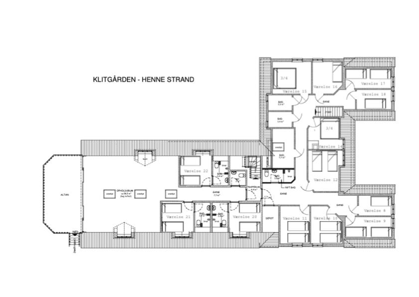 Sovepladserne er fordelt på 17 værelser bestående af 13 dobbeltværelser og 4 enkeltværelser. I tilstødende anneks er der mulighed for at til leje yderligere 5 dobbeltværelser, alle med eget bad, toilet og lille tekøkken, samt et tilstødende sommerhus med 3 værelser med i alt 8+2 sovepladser, så den samlede overnatnings kapacitet på Klitgaarden er på 50 personer.