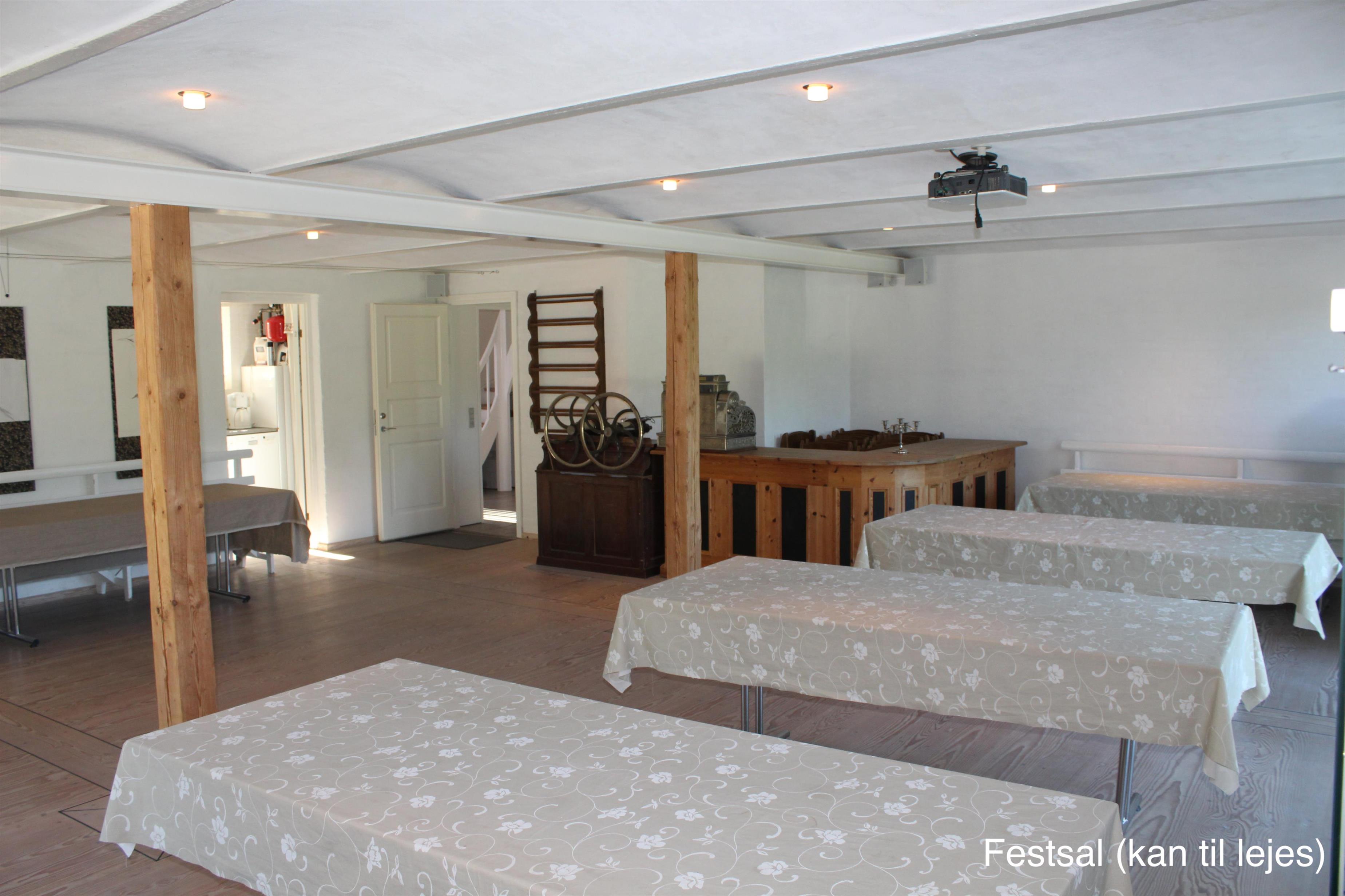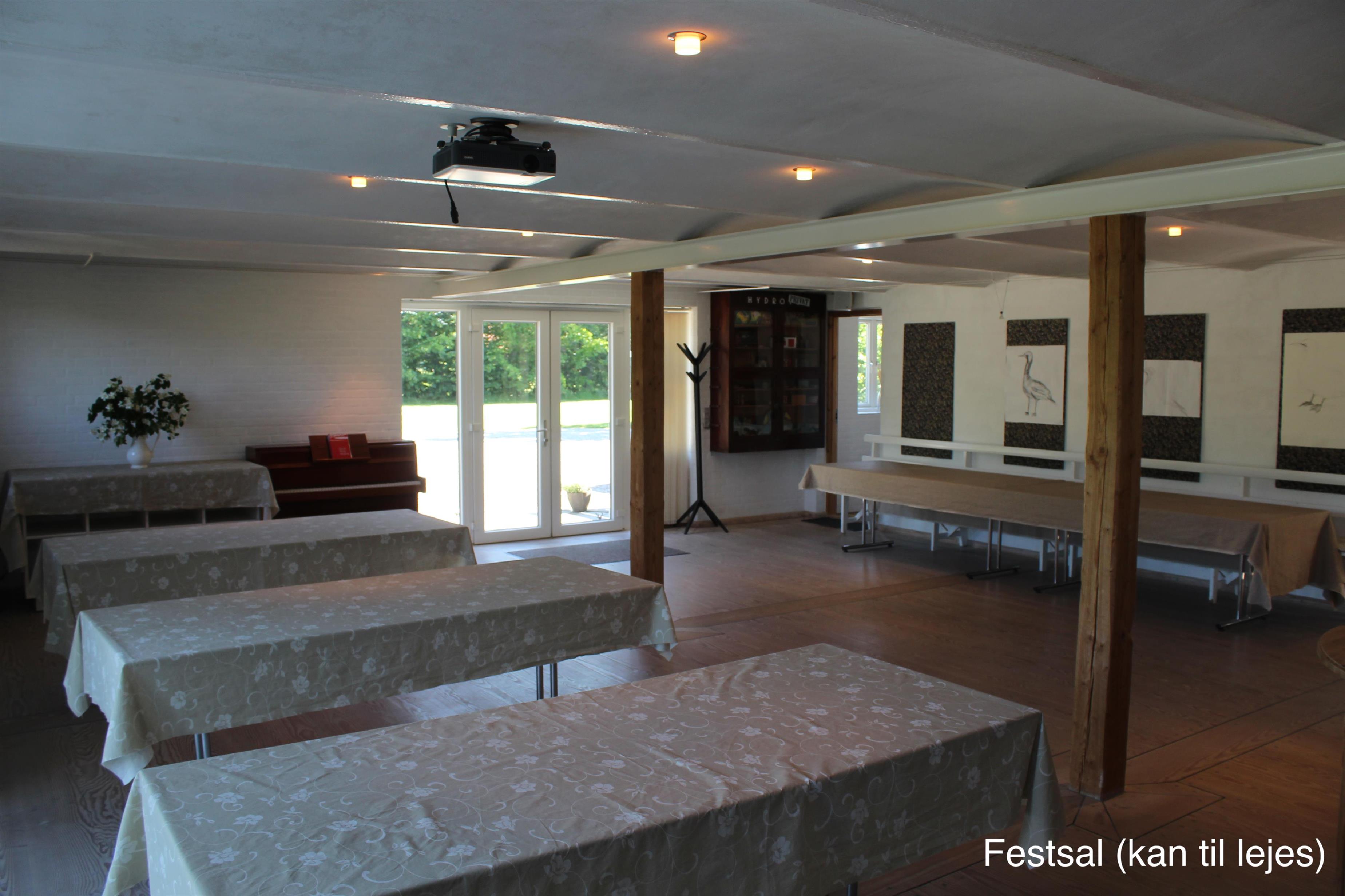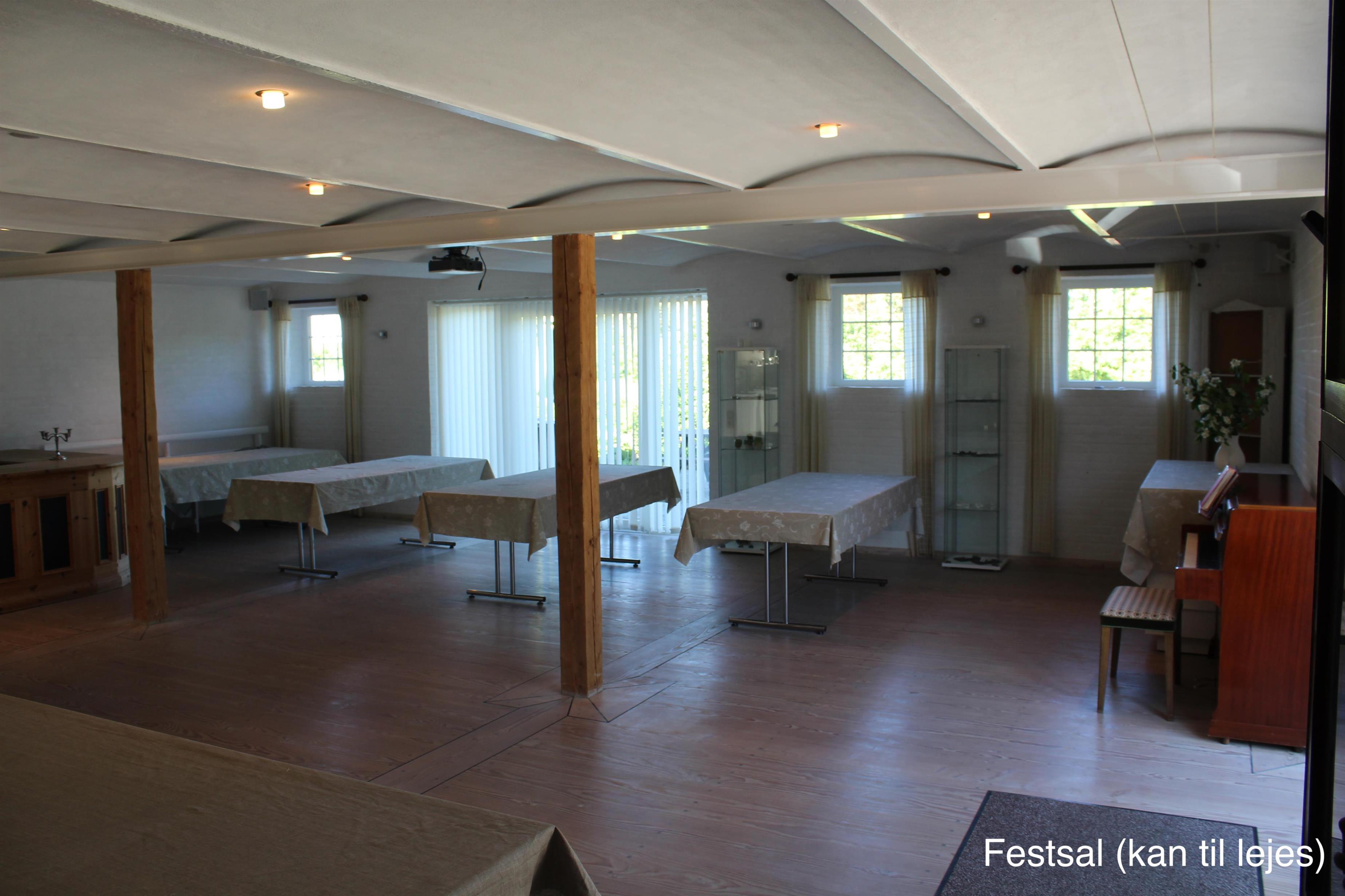 I umiddelbar forbindelse med køkkenet kan til lejes en 75 m2 stor festsal med plads til 50-60 personer, og anretter køkken med tilhørende service. Ring og hør nærmere.