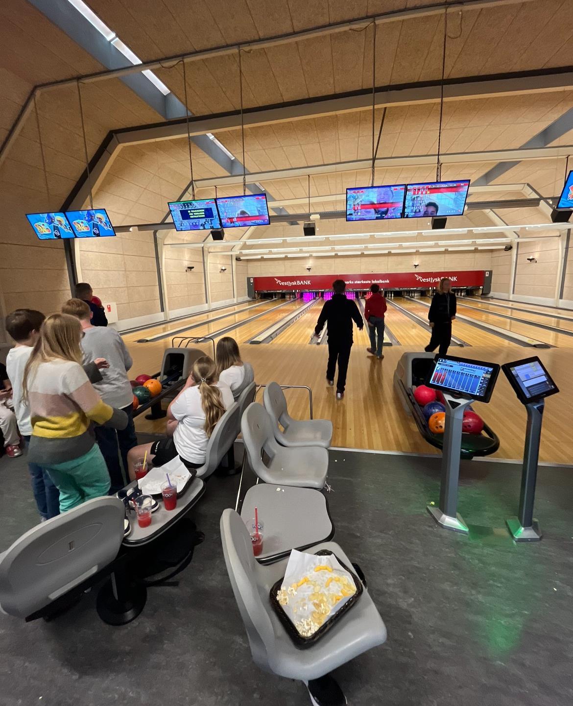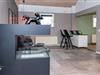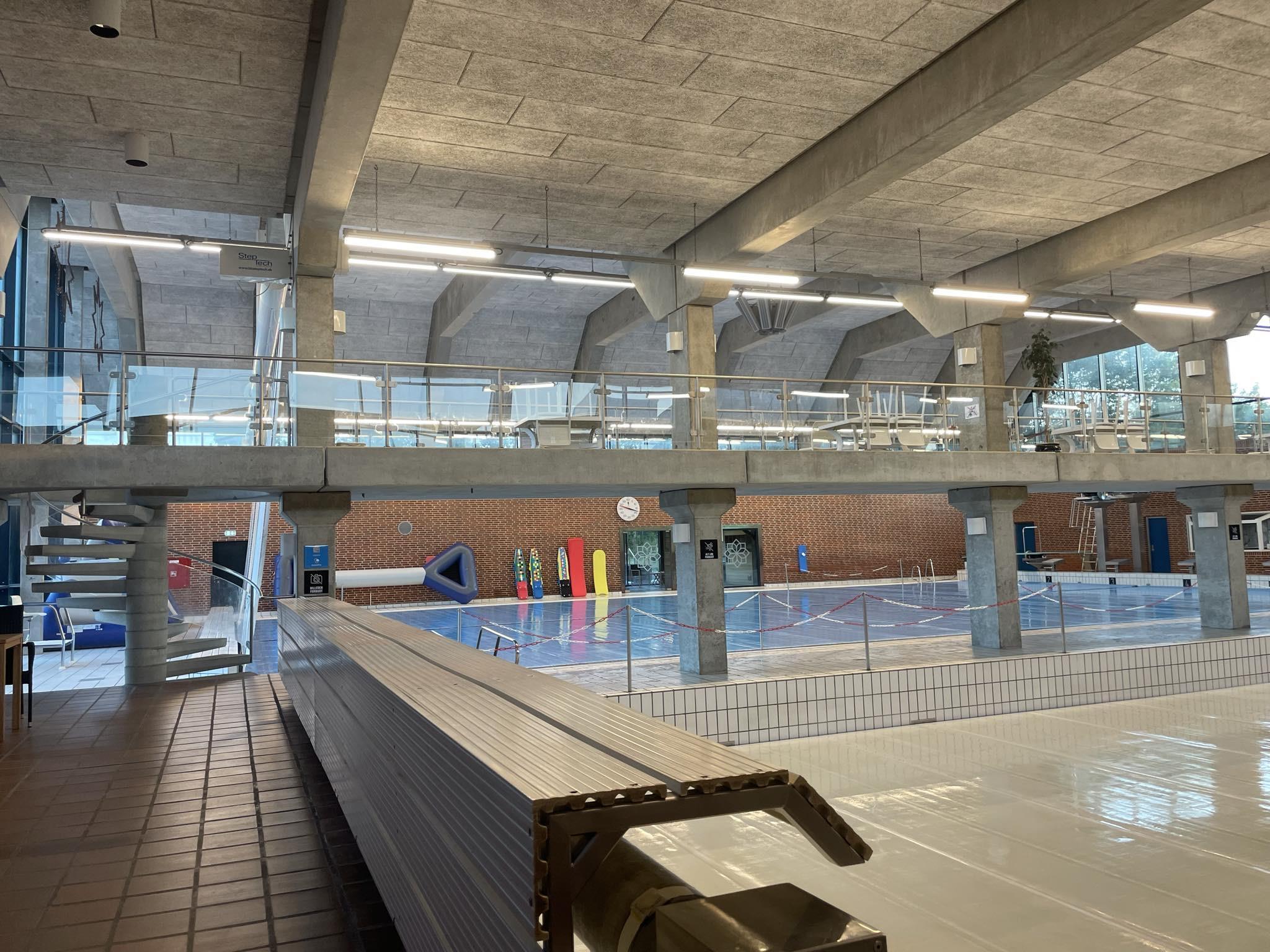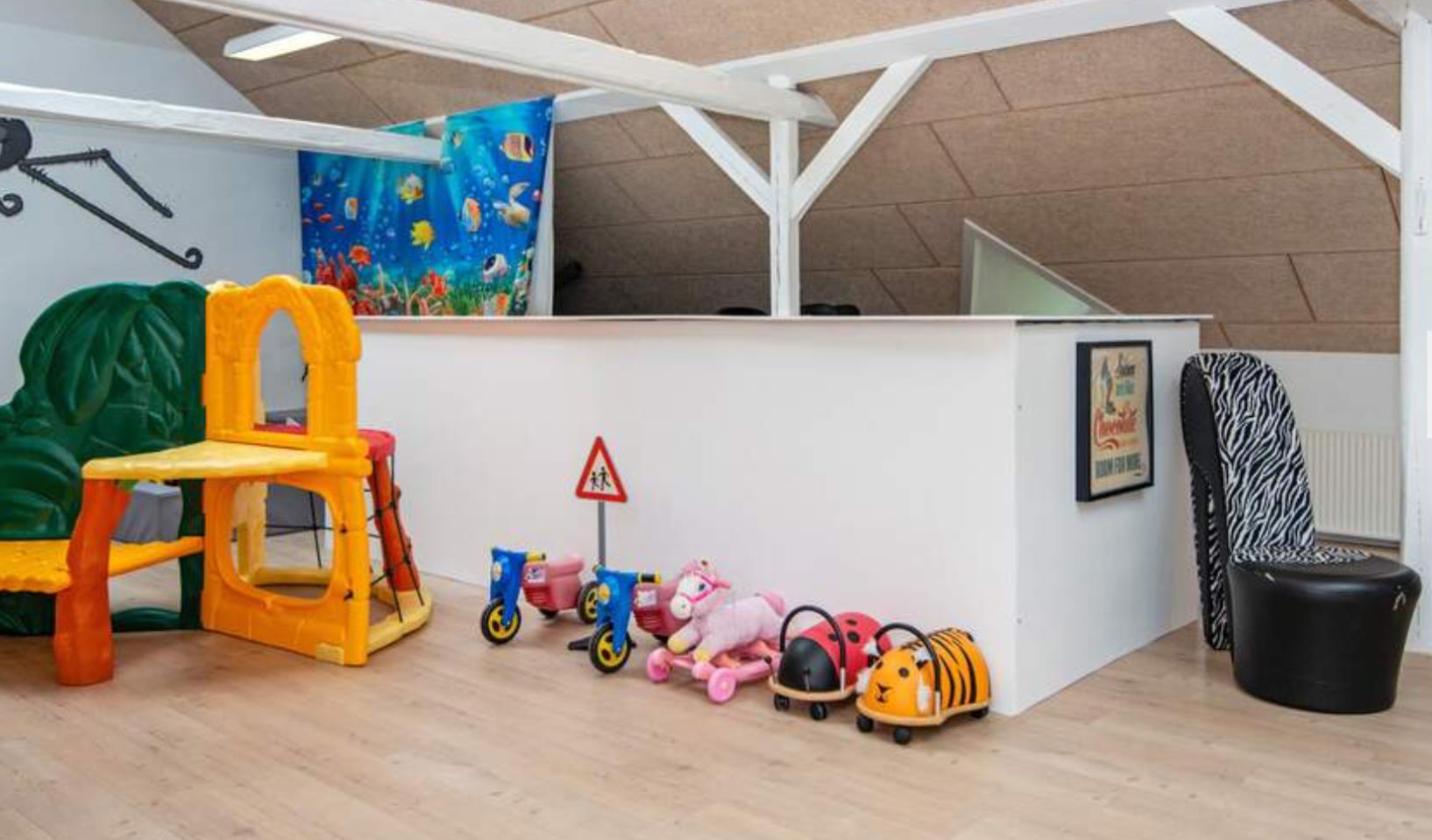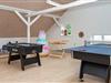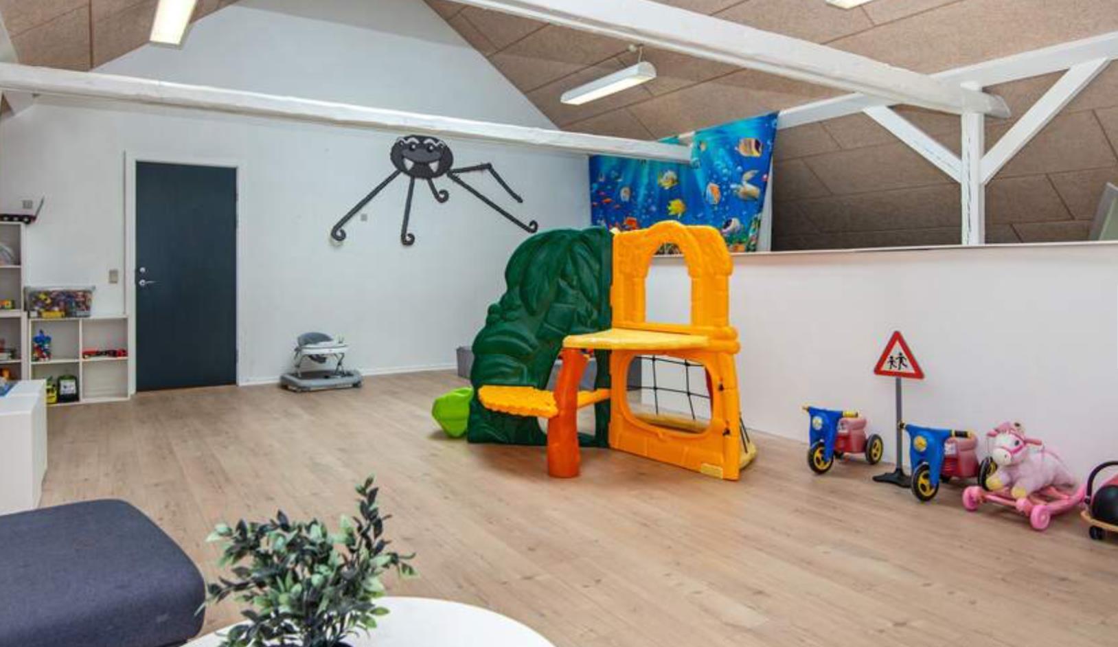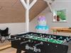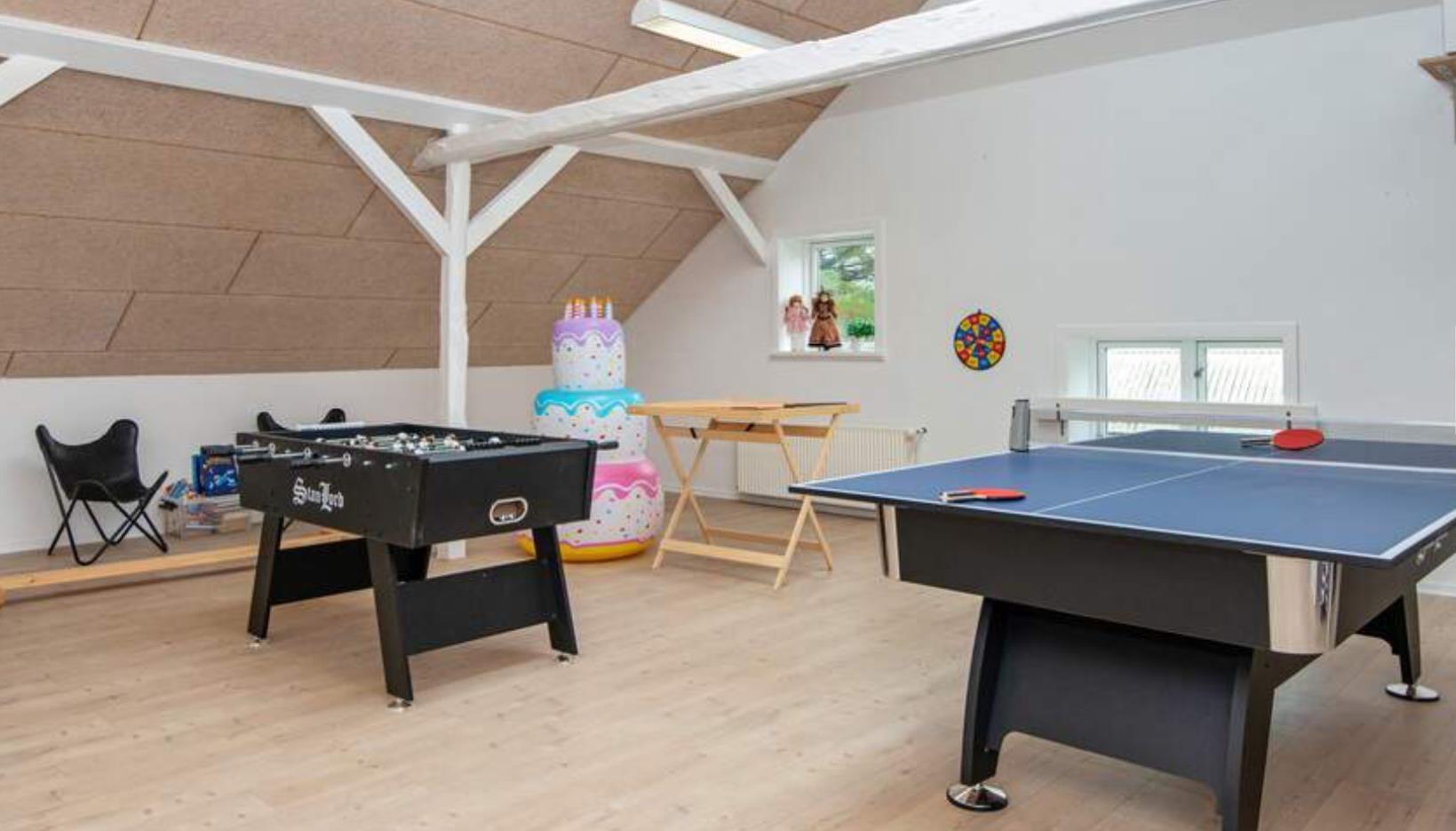 Stort aktivitetsrum med motionsredskaber, fodboldbord, bordtennisbord og boldbassin.