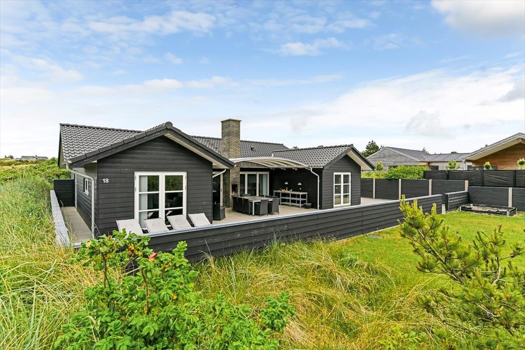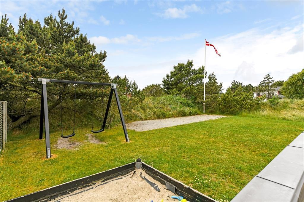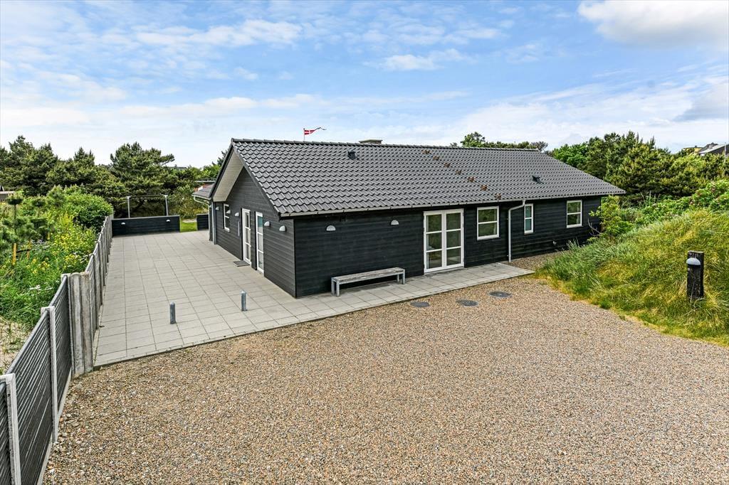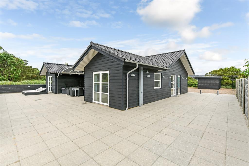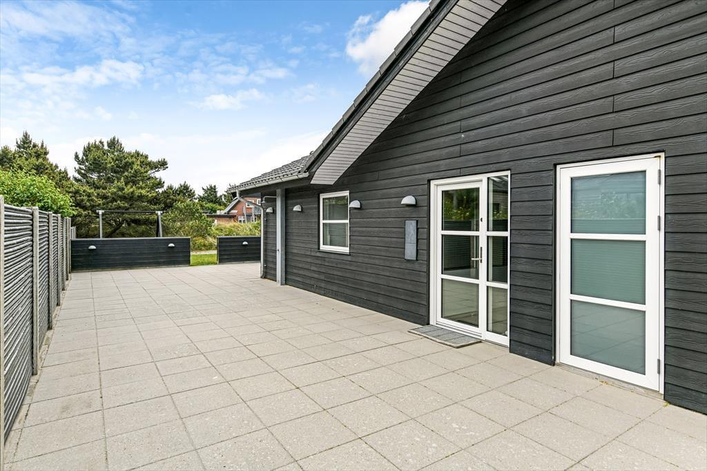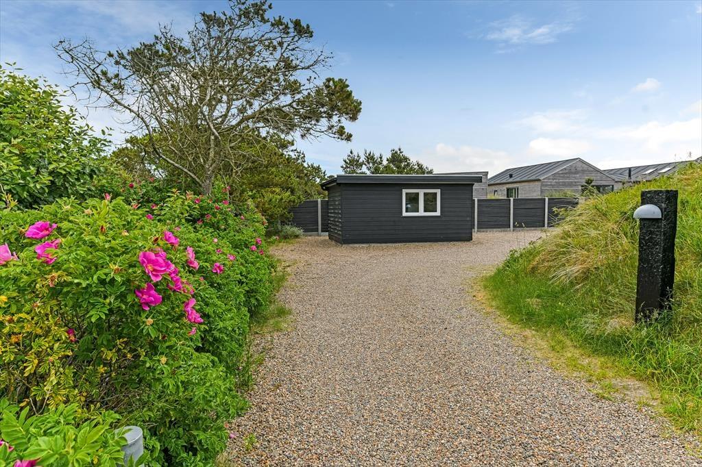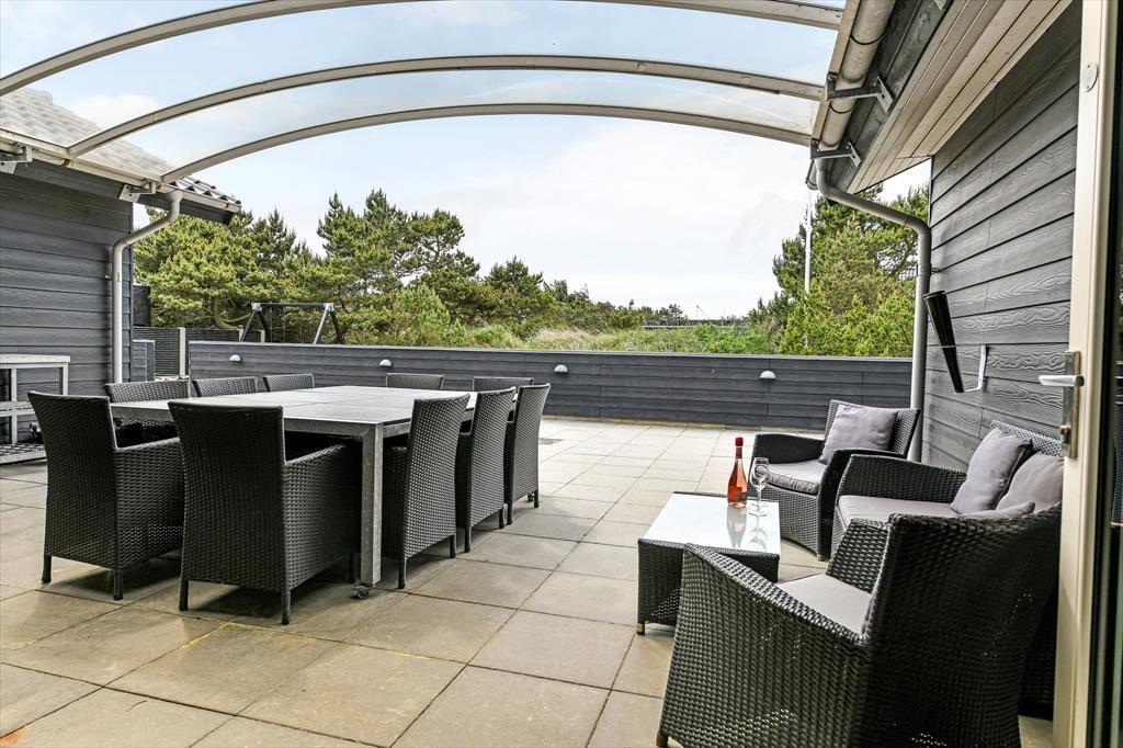 Når solen skinner, og himlen står blå over Henne Strand, er det oplagt at trække ud på den dejlige terrasse, som omkranser sommerhuset. Her kan du nyde morgenkaffen i ro og mag, mens dagens planer langsomt tager form. De store terrassedøre åbner op til en oase under åben himmel, hvor udemiljøet bliver en naturlig forlængelse af opholdsrummet indenfor. Her kan du finde en god plads i solen, læne dig tilbage i havemøblerne og lade roen falde over dig, mens fuglene kvidrer og duften af sommer fylder luften. Når dagen går på hæld, er det oplagt at tænde op i grillen og samle familien omkring et lækkert måltid – og når mørket falder på, kan du nyde stilheden og det smukke aftenlys under stjernehimlen. Her er plads til både leg, afslapning og nærvær i det fri.