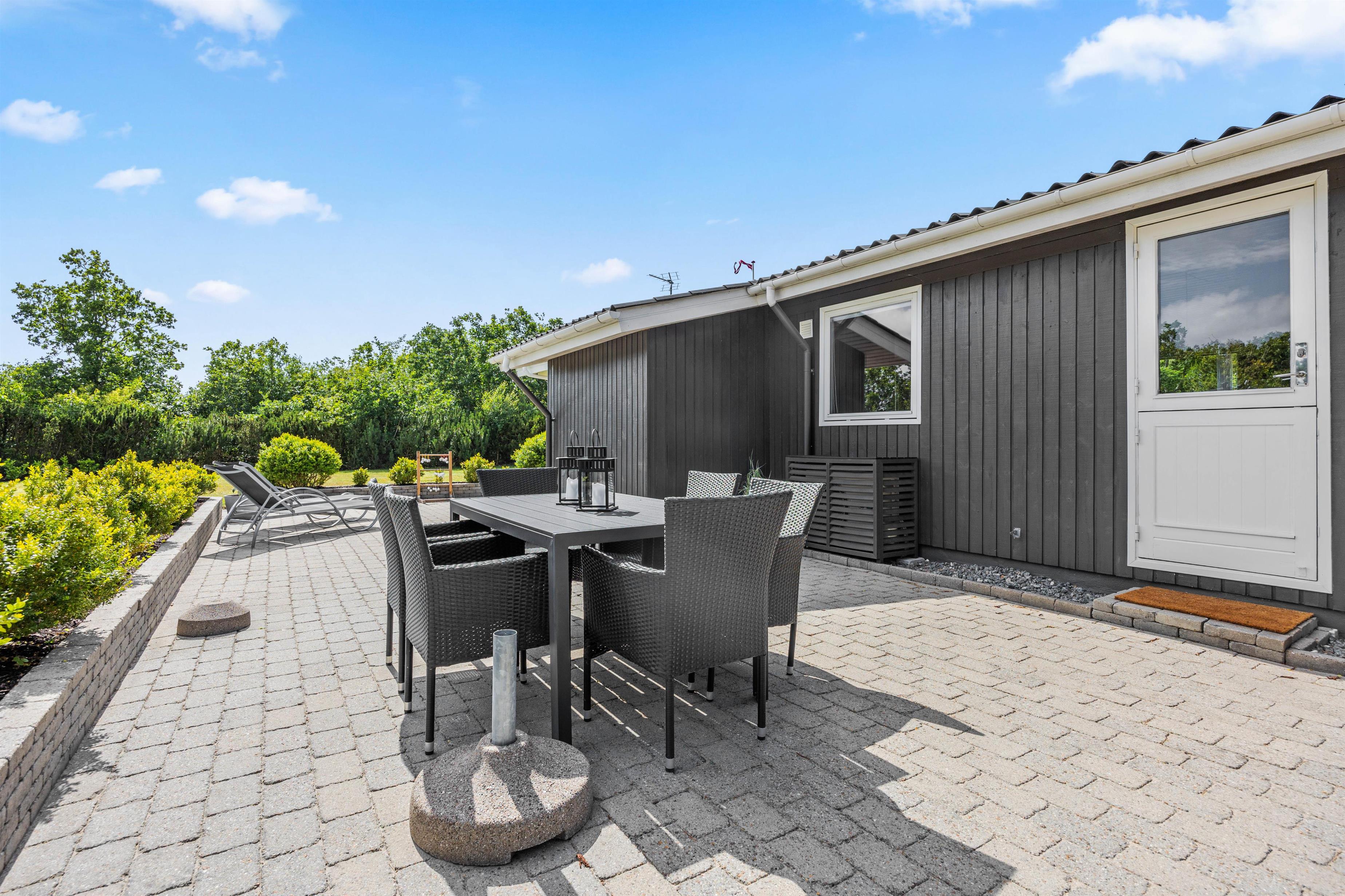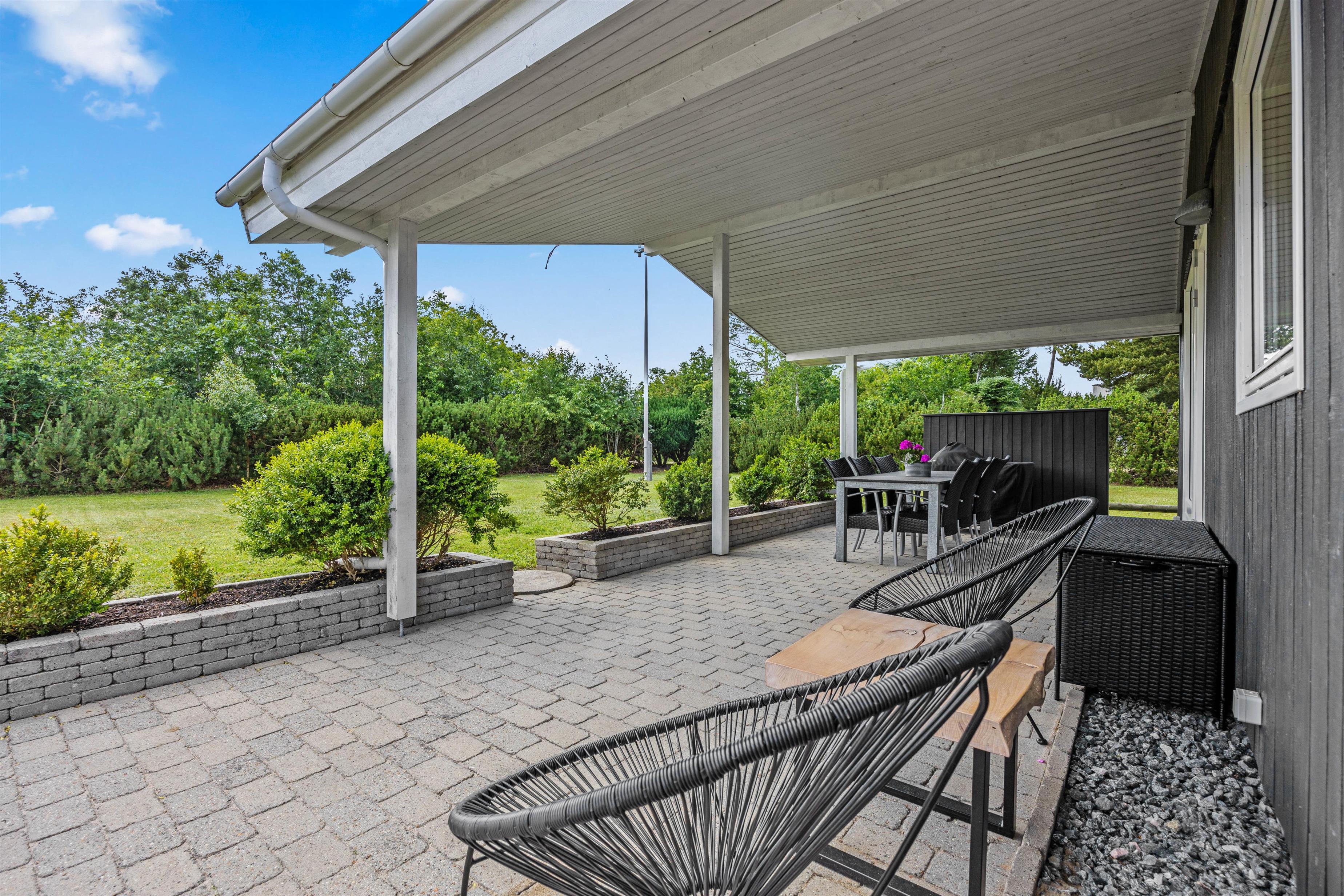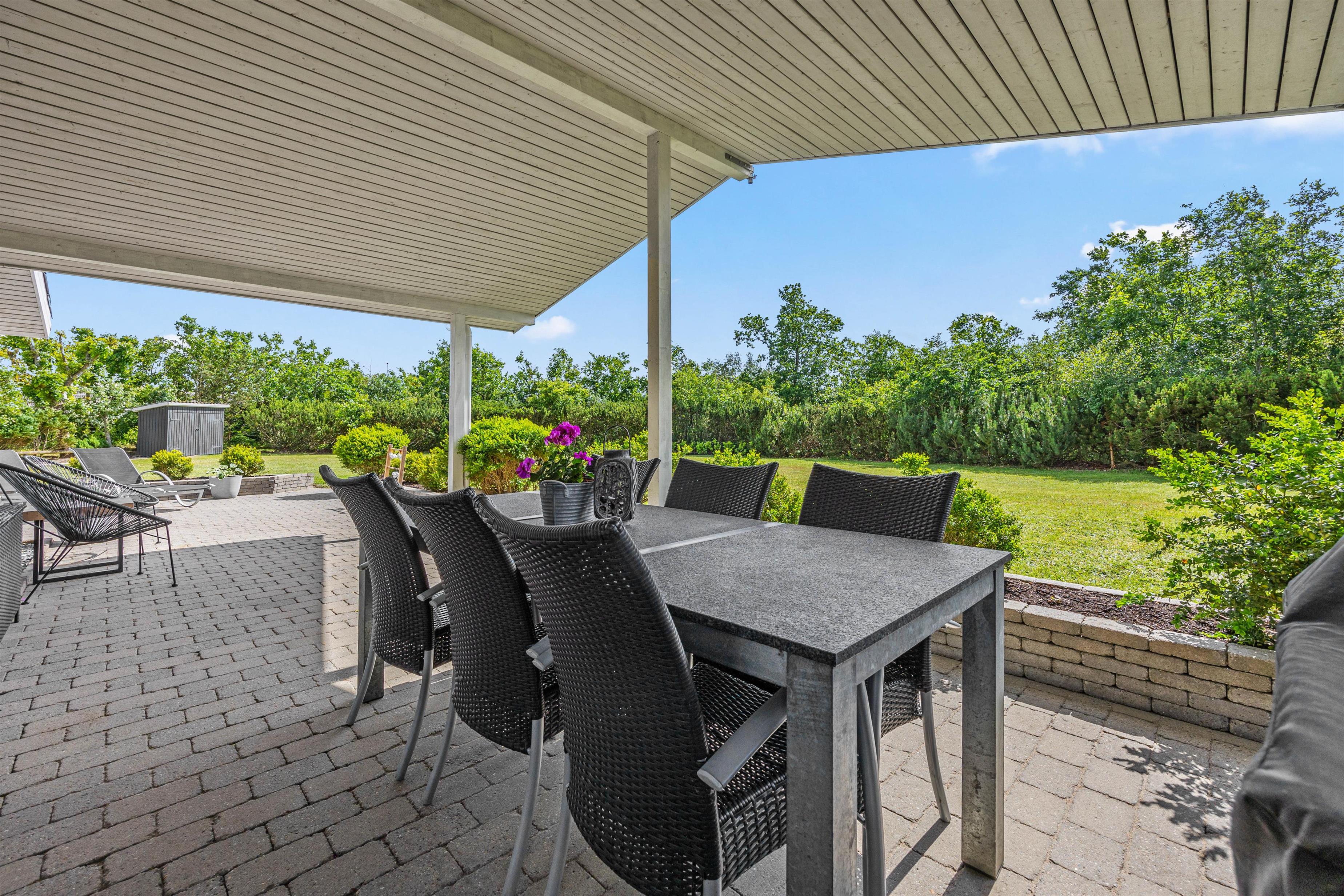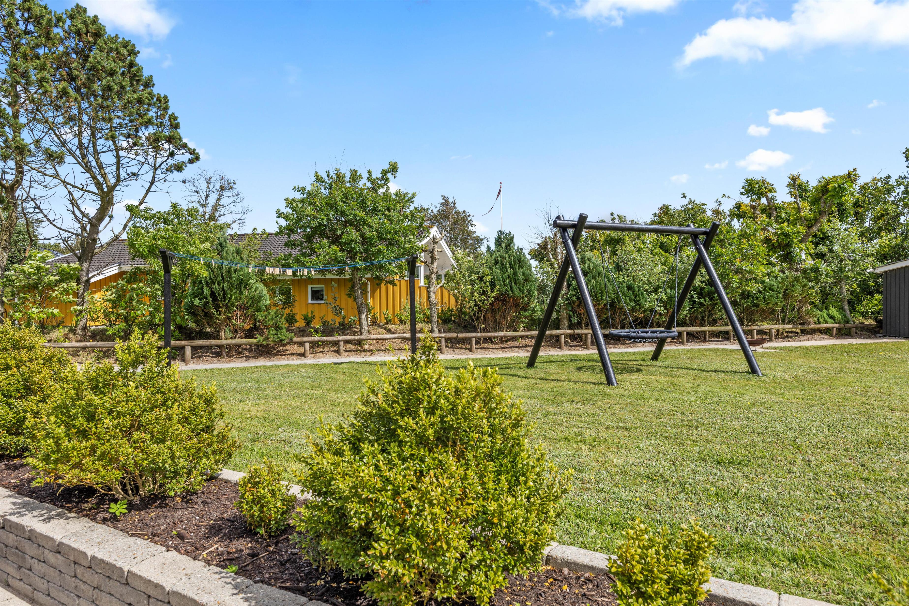 Sommerhuset er perfekt for familier med små børn og en firbenet ven. Grundstykket på over 1400 m2 byder på en skøn græsplæne, hvor børnene – og hunden - kan løbe og lege. Der er også en gynge, som vil være et sikkert hit. De voksne kan slappe af i de komfortable havemøbler, der er stillet rundt omkring på terrassen. Under den overdækkede terrasse kan I nyde de lange sommeraftener med god mad fra grillen og hyggelige stunder med familien.