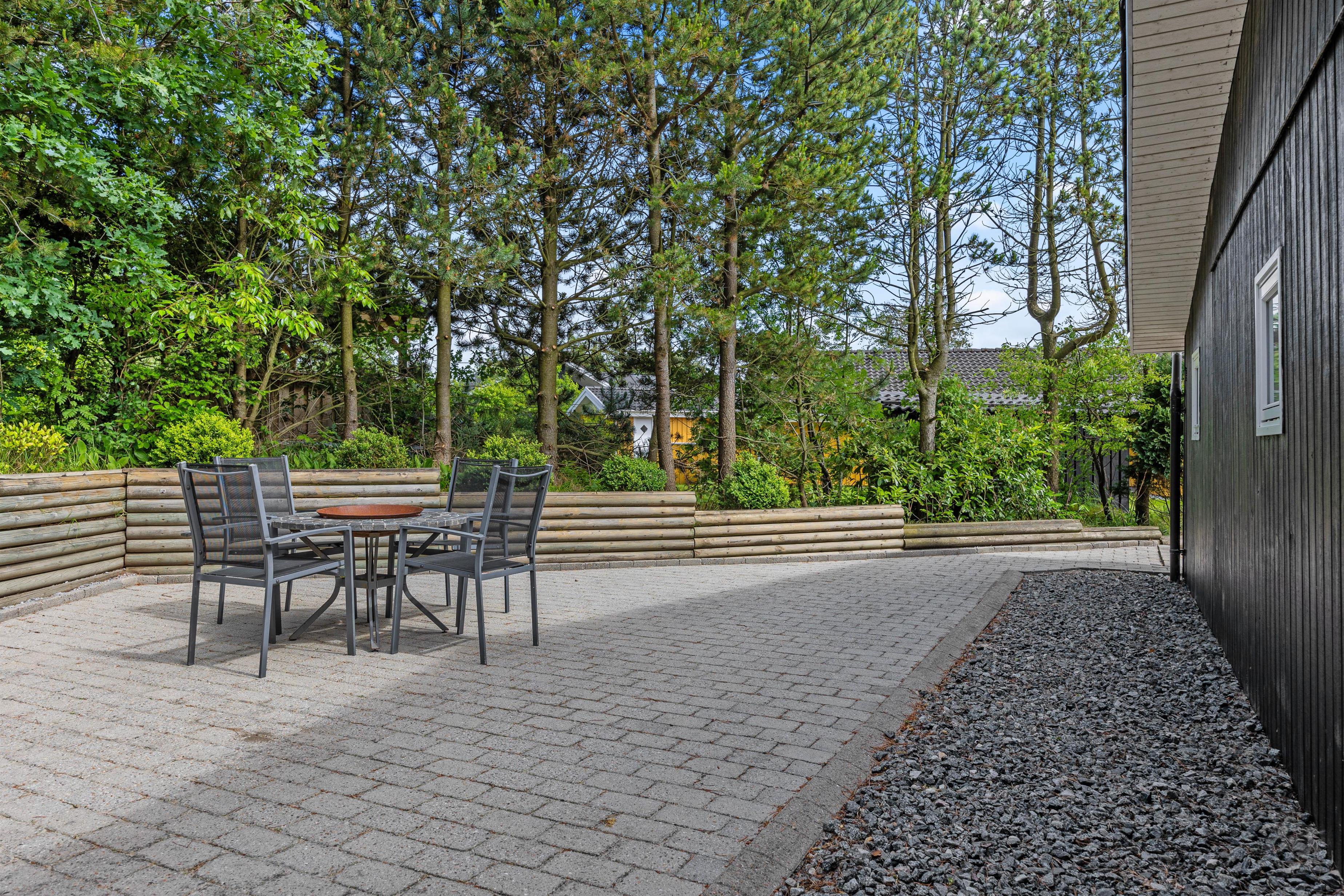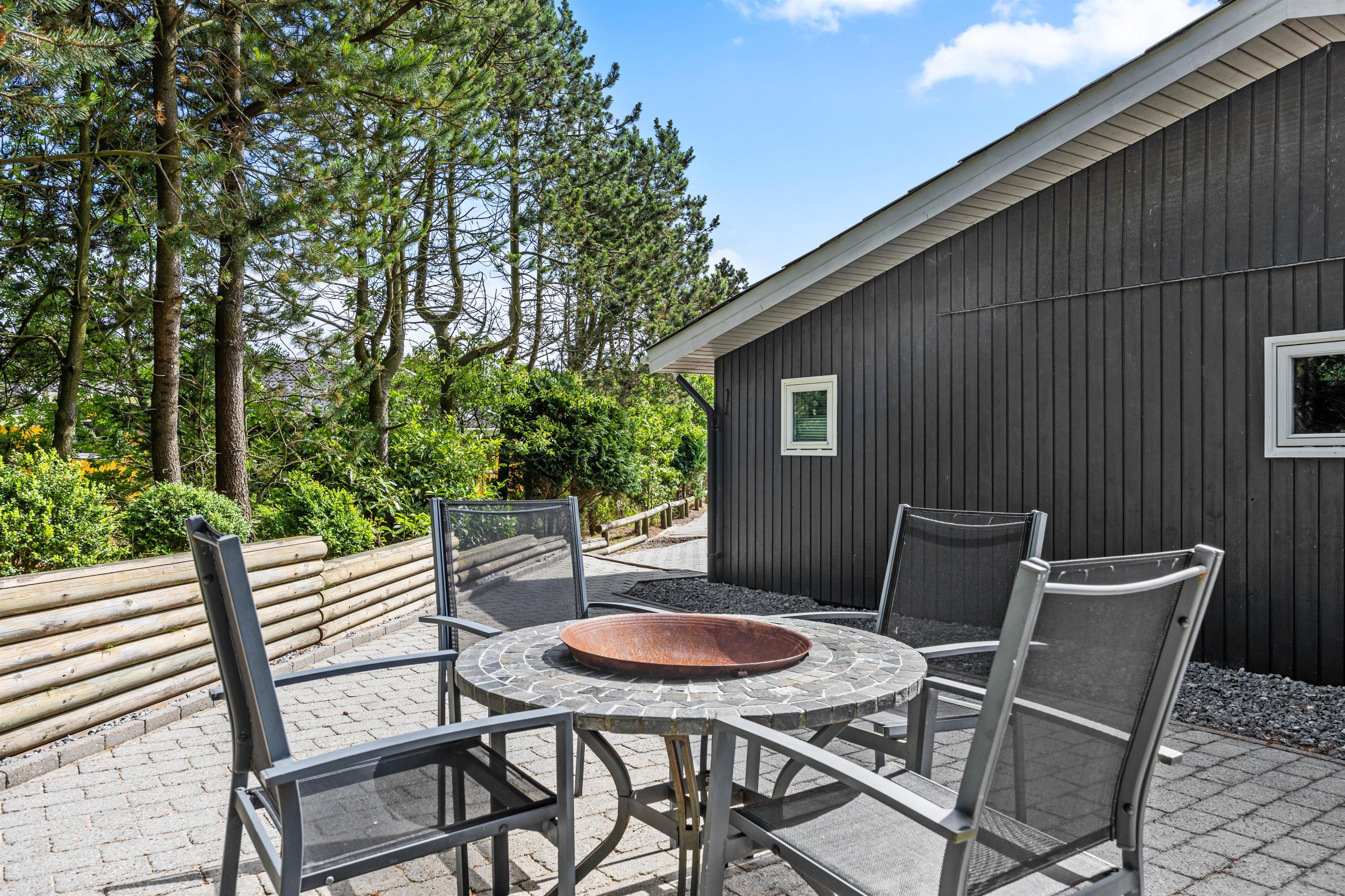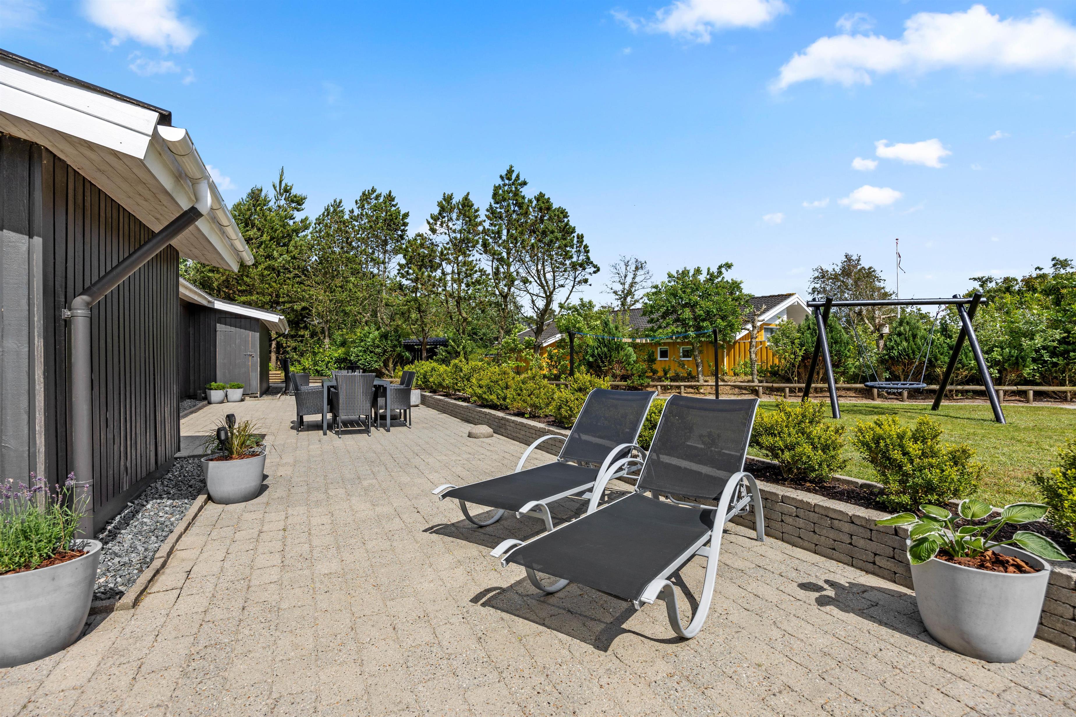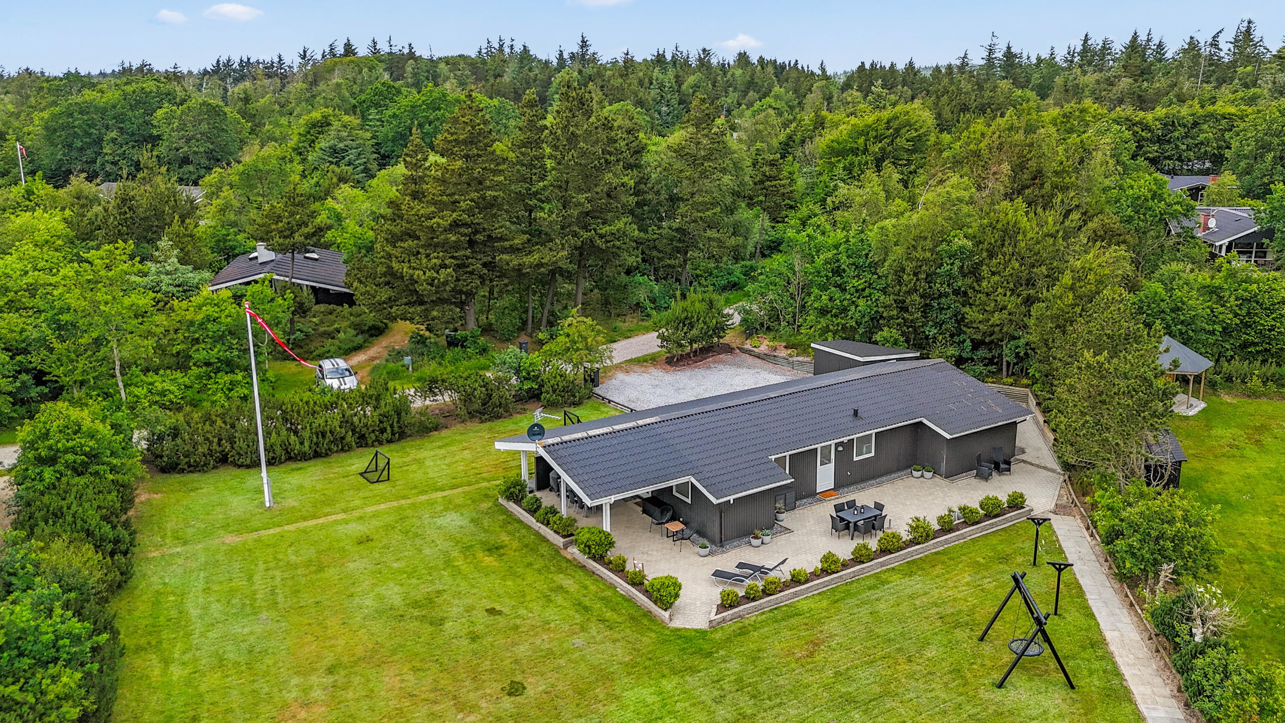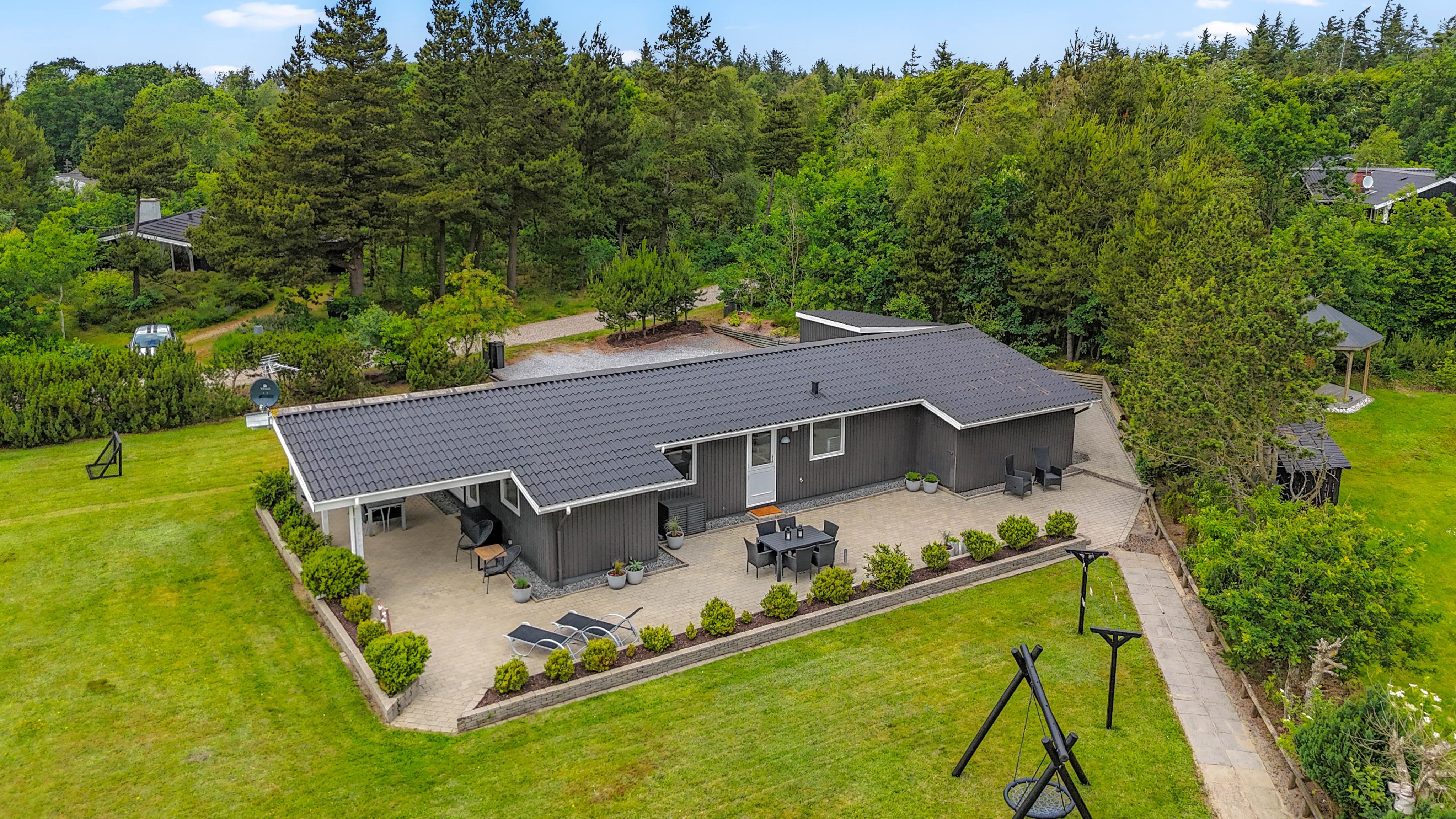 Sommerhuset er perfekt for familier med små børn og en firbenet ven. Grundstykket på over 1400 m2 byder på en skøn græsplæne, hvor børnene – og hunden - kan løbe og lege. Der er også en gynge, som vil være et sikkert hit. De voksne kan slappe af i de komfortable havemøbler, der er stillet rundt omkring på terrassen. Under den overdækkede terrasse kan I nyde de lange sommeraftener med god mad fra grillen og hyggelige stunder med familien.