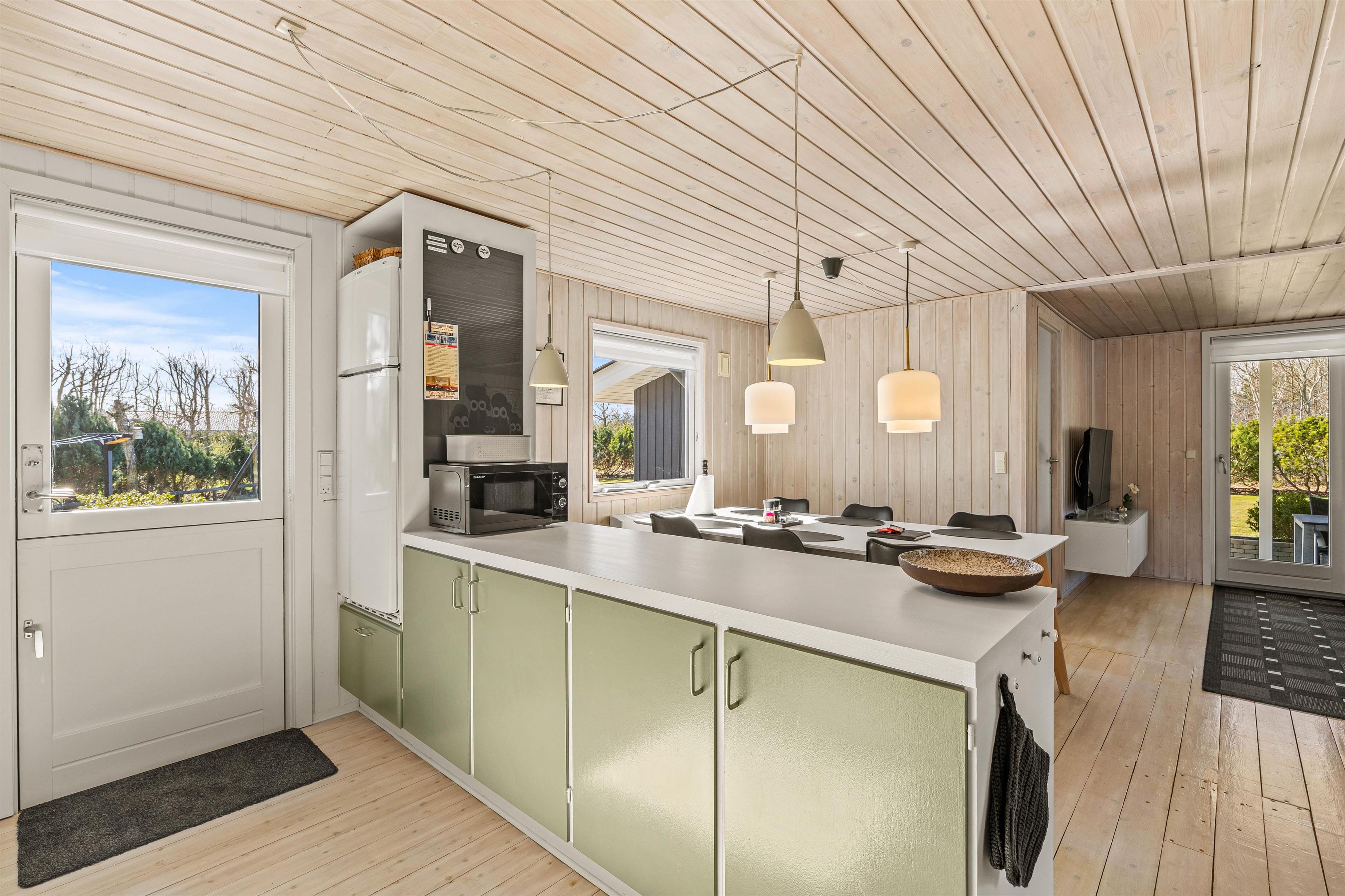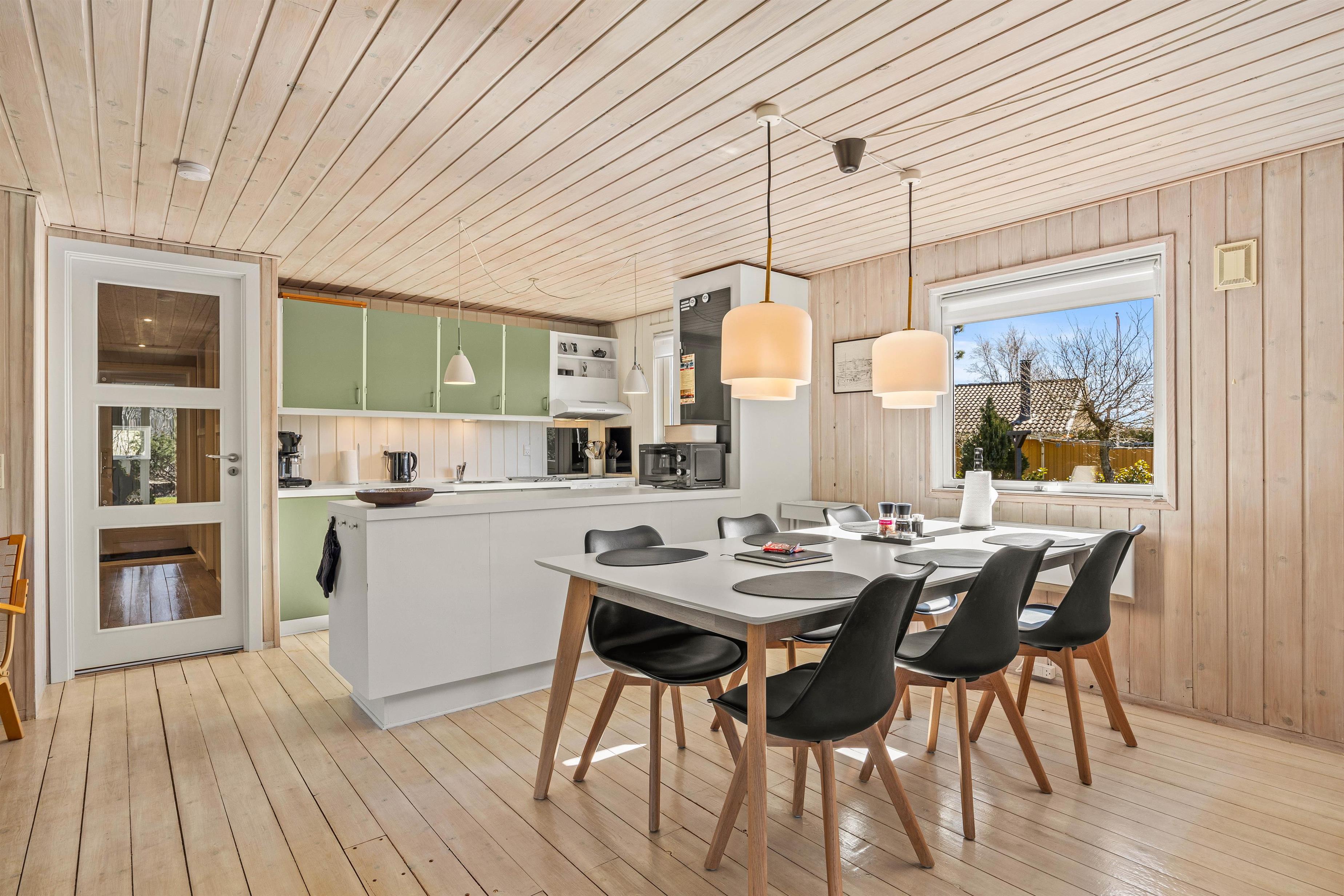 Sommerhuset er udstyret med alle de moderne bekvemmeligheder, som gør opholdet både bekvemt og problemfrit. Den installerede luft til luft varmepumpe sikrer behagelige temperaturer året rundt. Og i det veludstyrede køkken finder I en opvaskemaskine, der frigiver tid fra huslige pligter. Sommerhuset har et skønt nyt og rummeligt badeværelset med indlagt gulvvarme. Der er en gang med skabe, så der er god plads til ferietøjet.