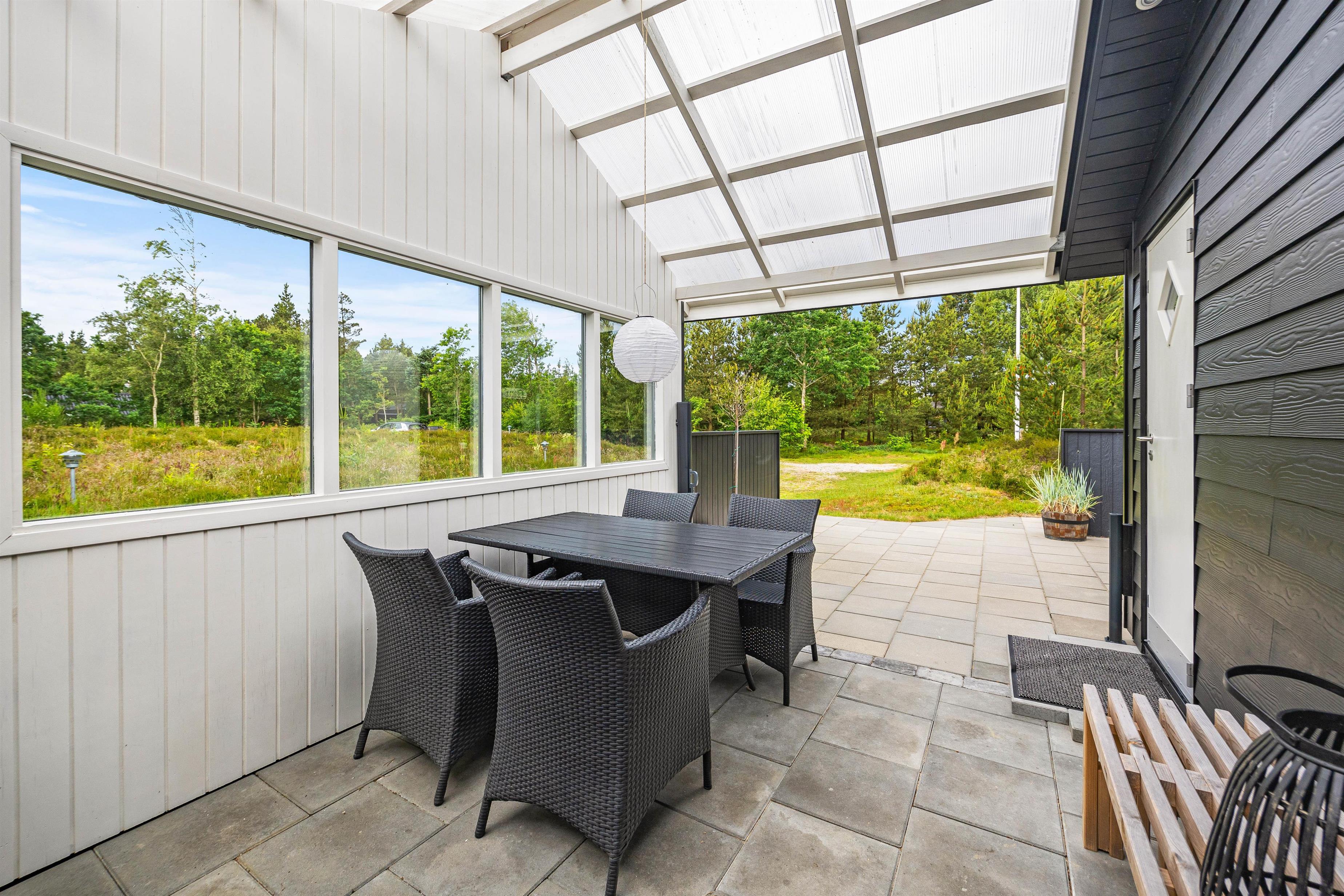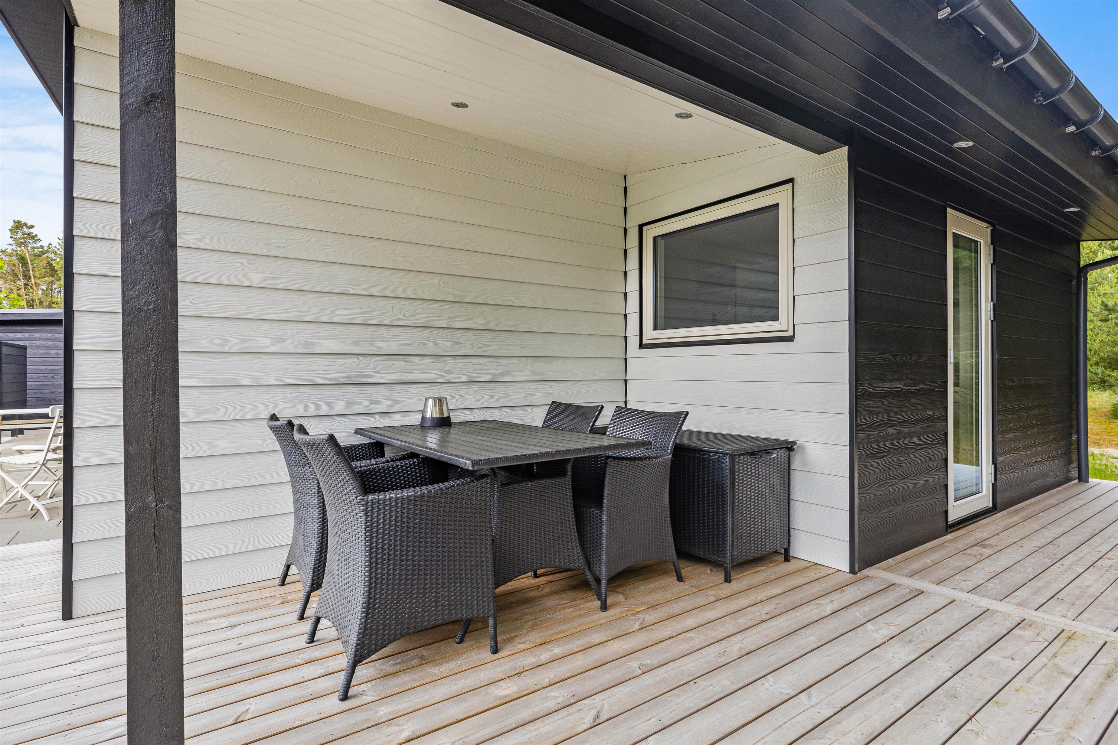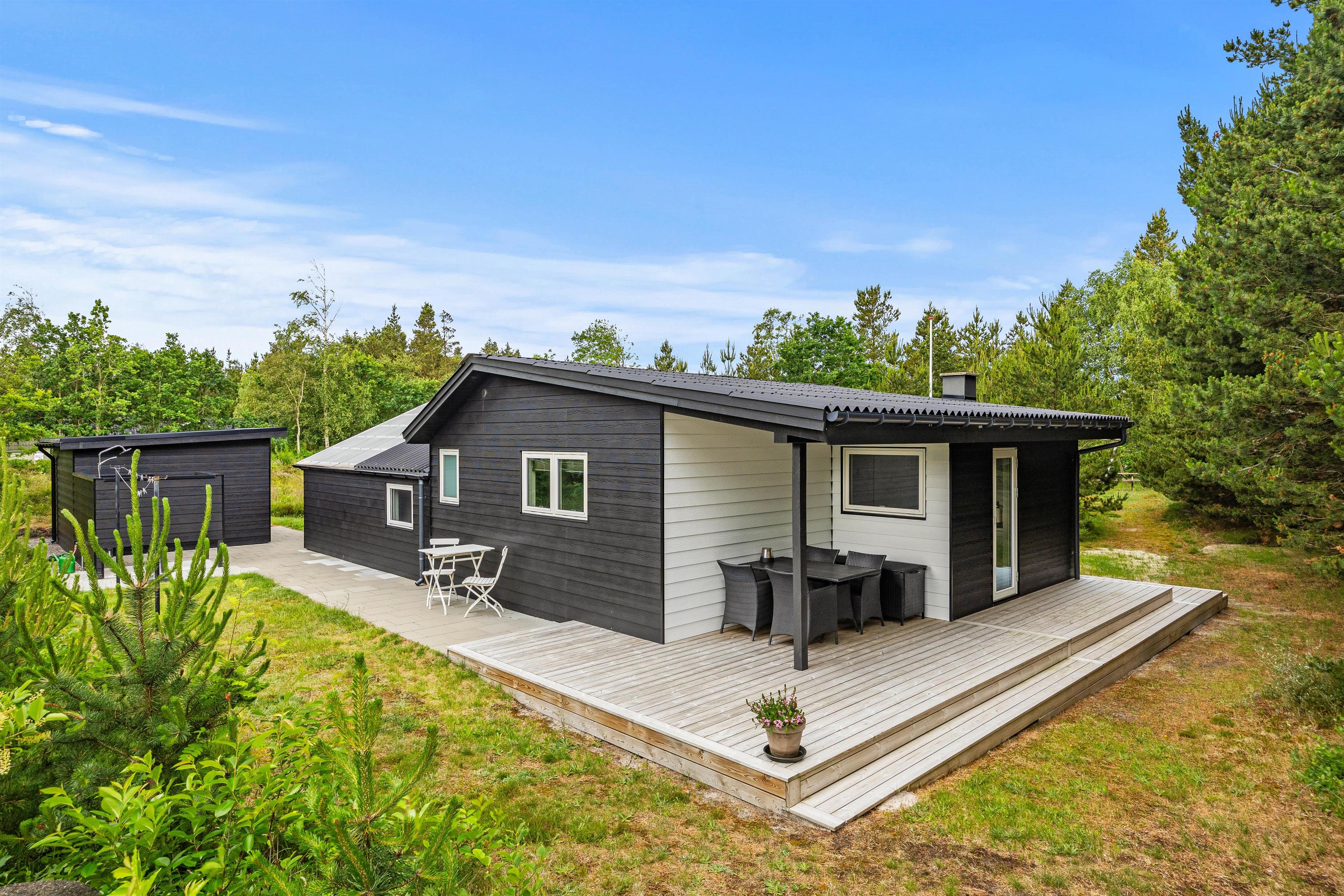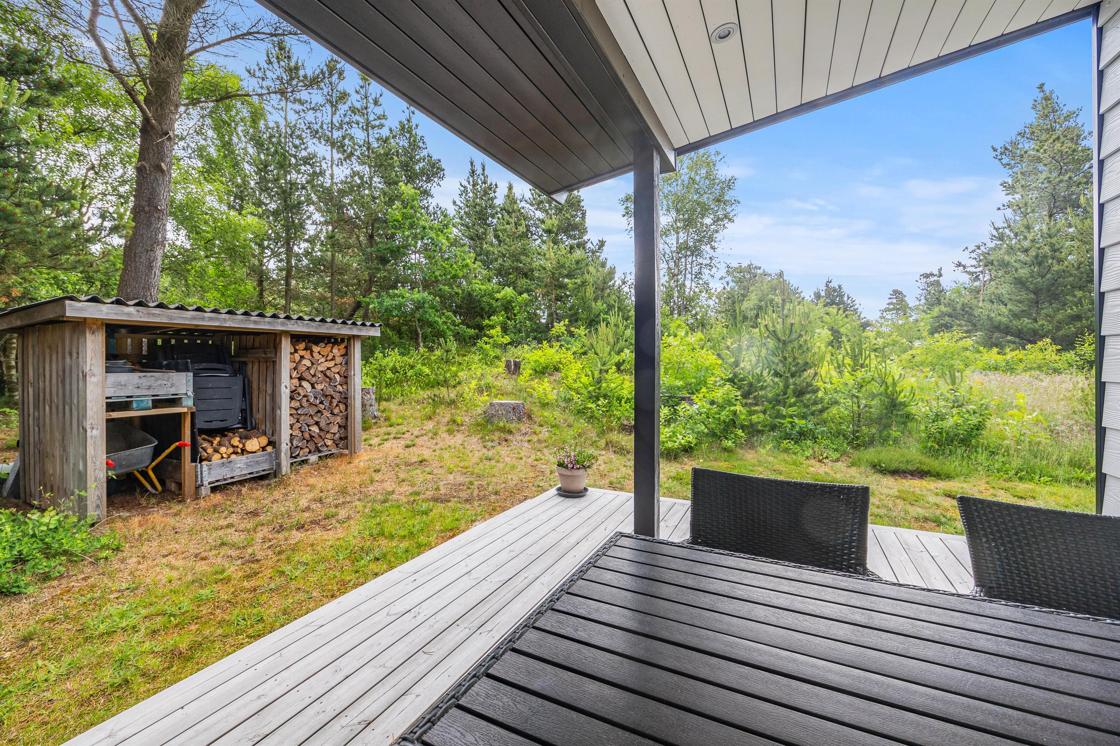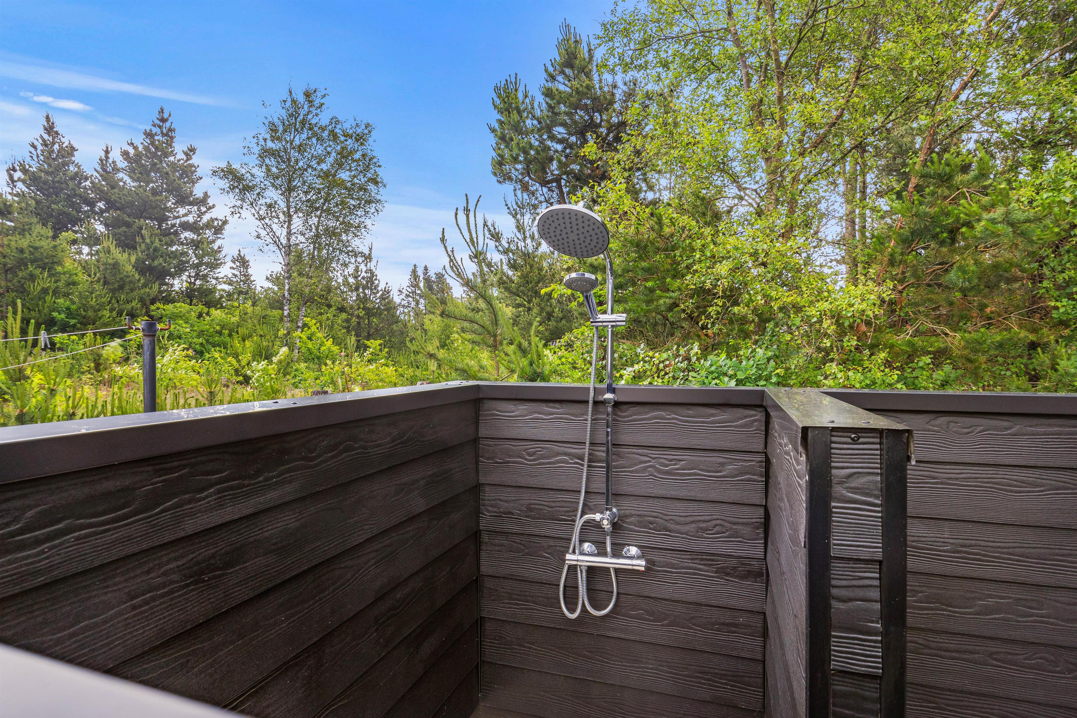 Sommerhuset er indrammet af en dejlig terrasse, hvor I kan slappe af i de komfortable havemøbler, solbade på liggestolene, spise udendørs eller trække jer tilbage med en god bog. I kan altid finde en rolig plet til en af siderne. Hvis solen er for stærk, kan en hurtig douche under udebruseren* friske op. Tænd op i gasgrillen og slut dagen af med et lækkert grillmåltid, imens skyggerne bliver lange.