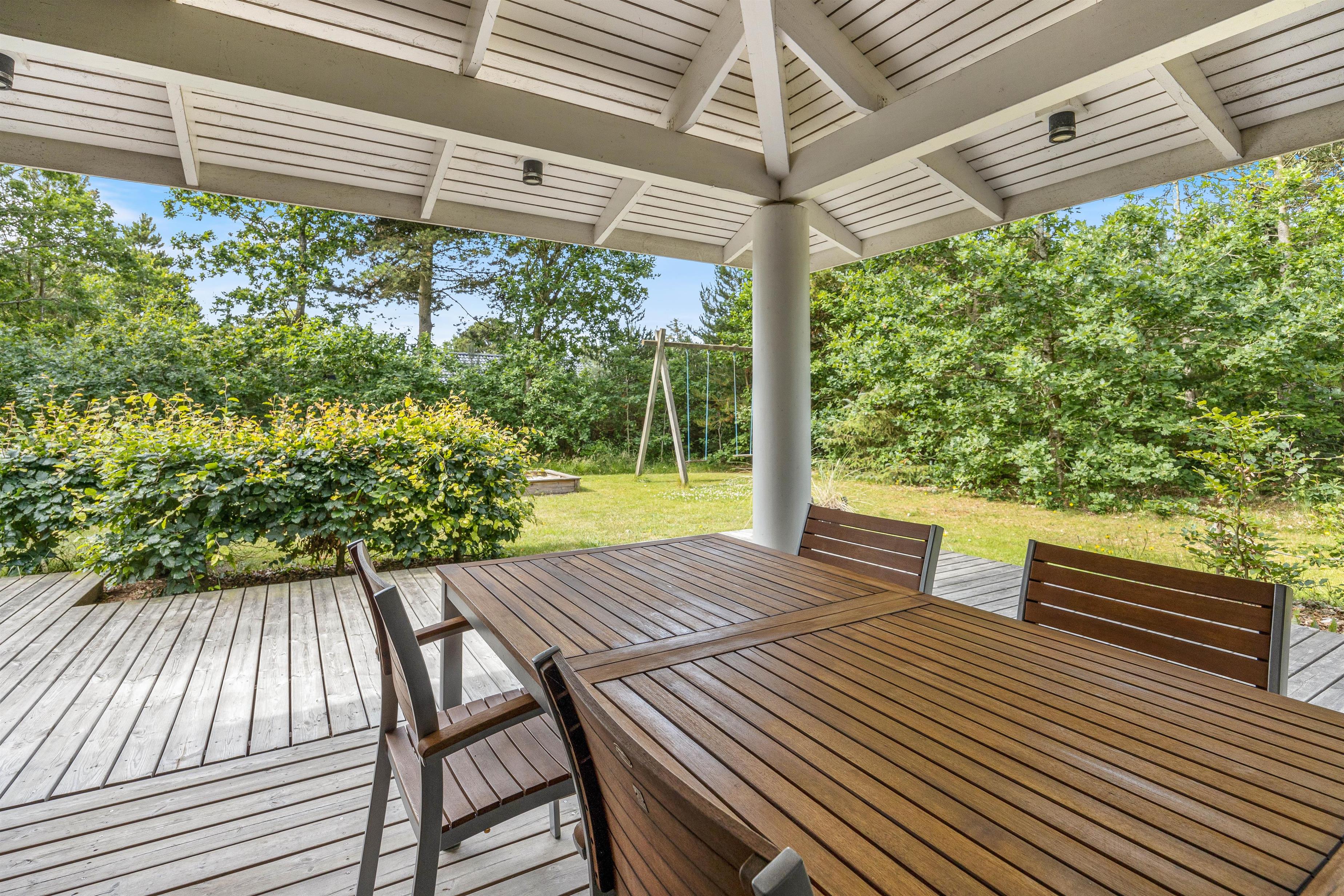 Sommerhusets udeområde inviterer hele ferieflokken til at tilbringe feriens varme og solrige dage udendørs. Til feriens yngste gæster er der en have, hvor de har god plads at boltre sig på, samt en sandkasse og et gyngestativ.