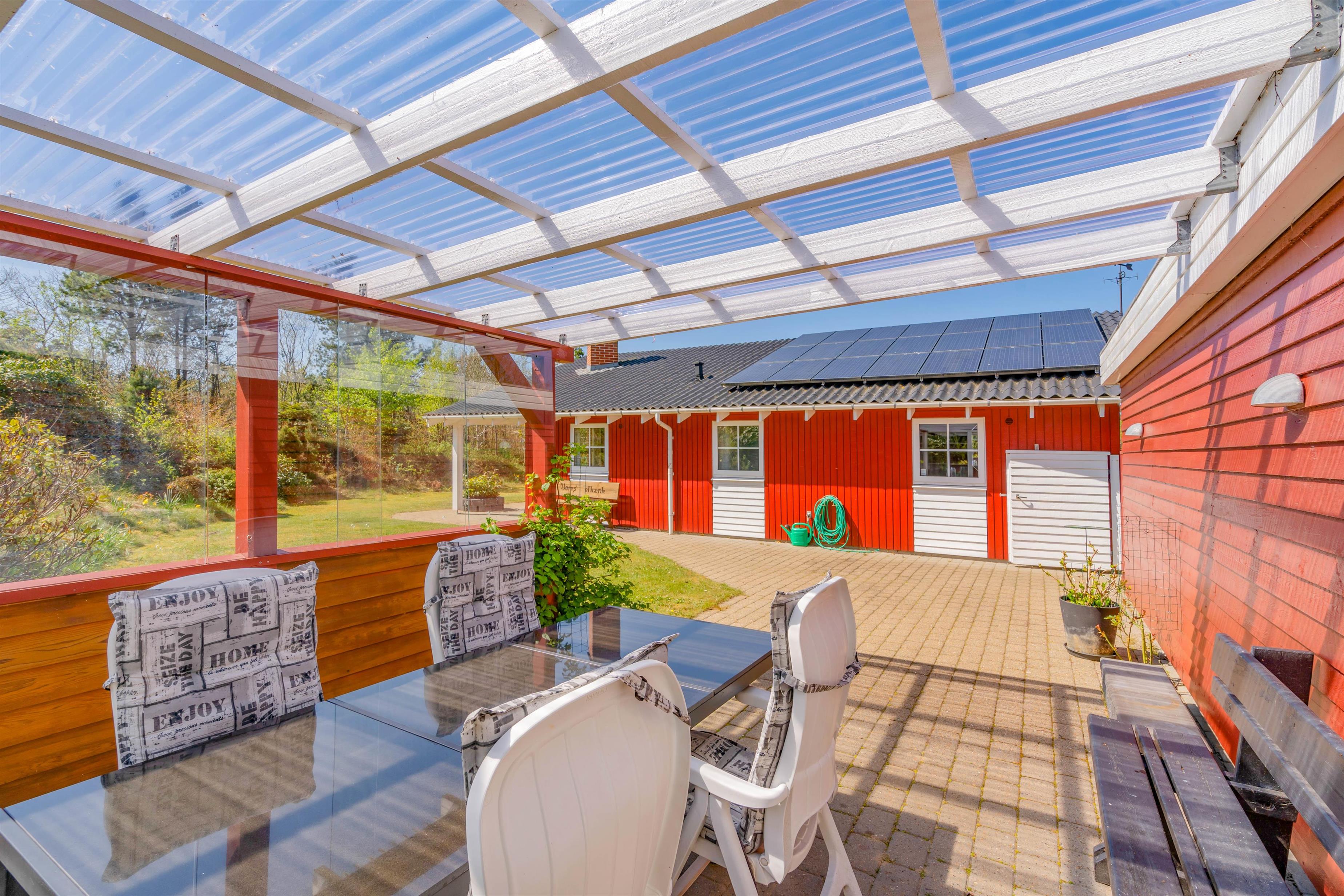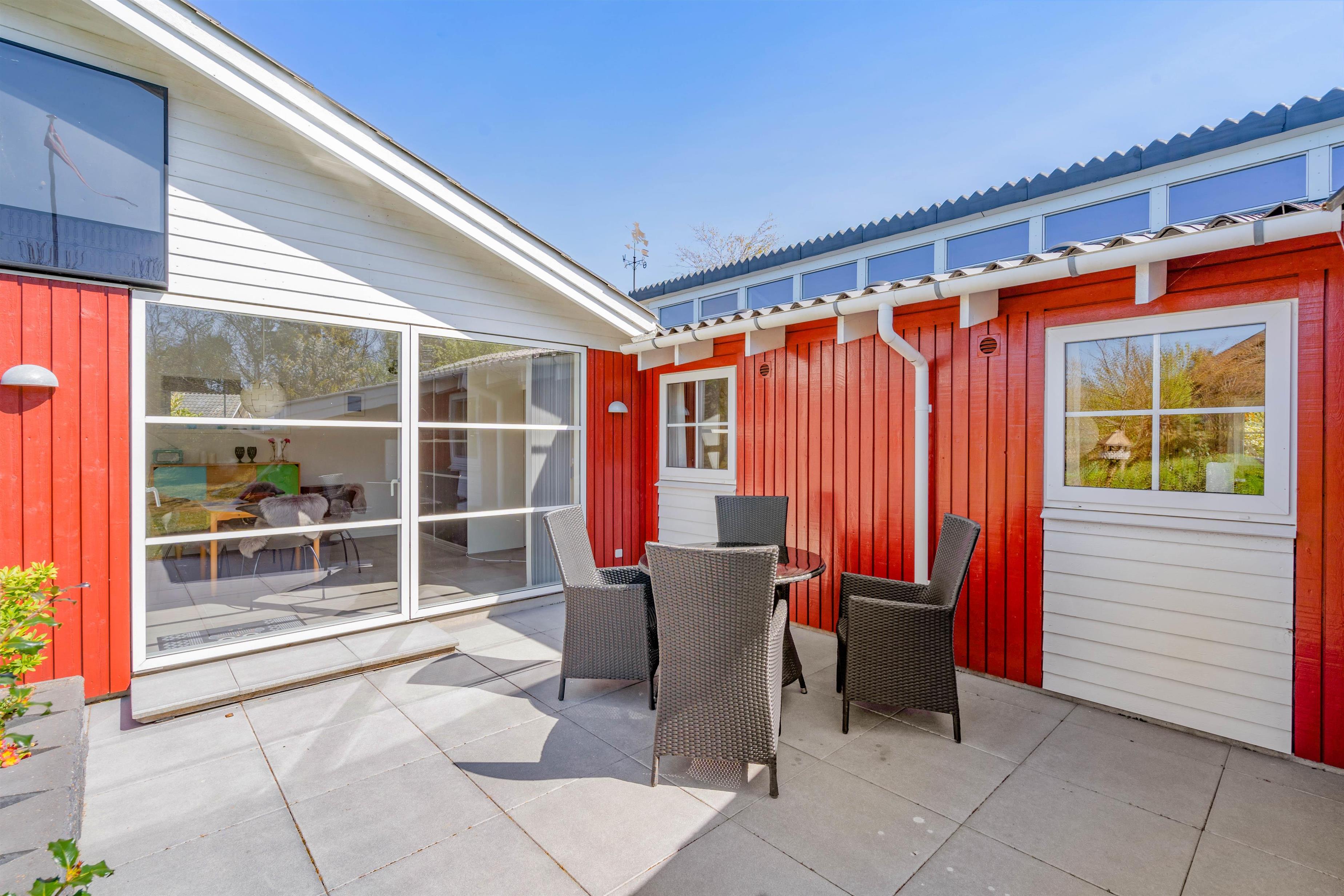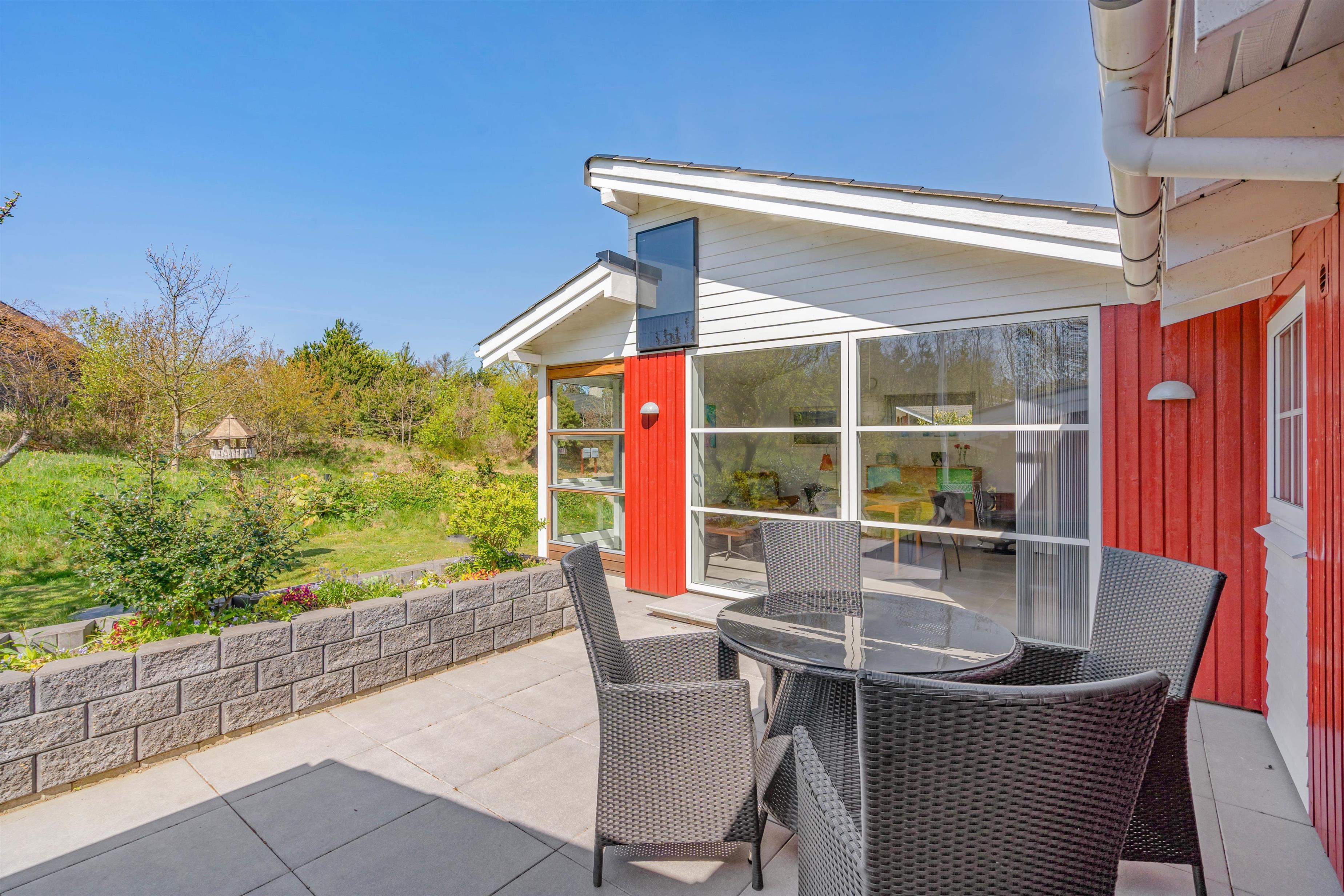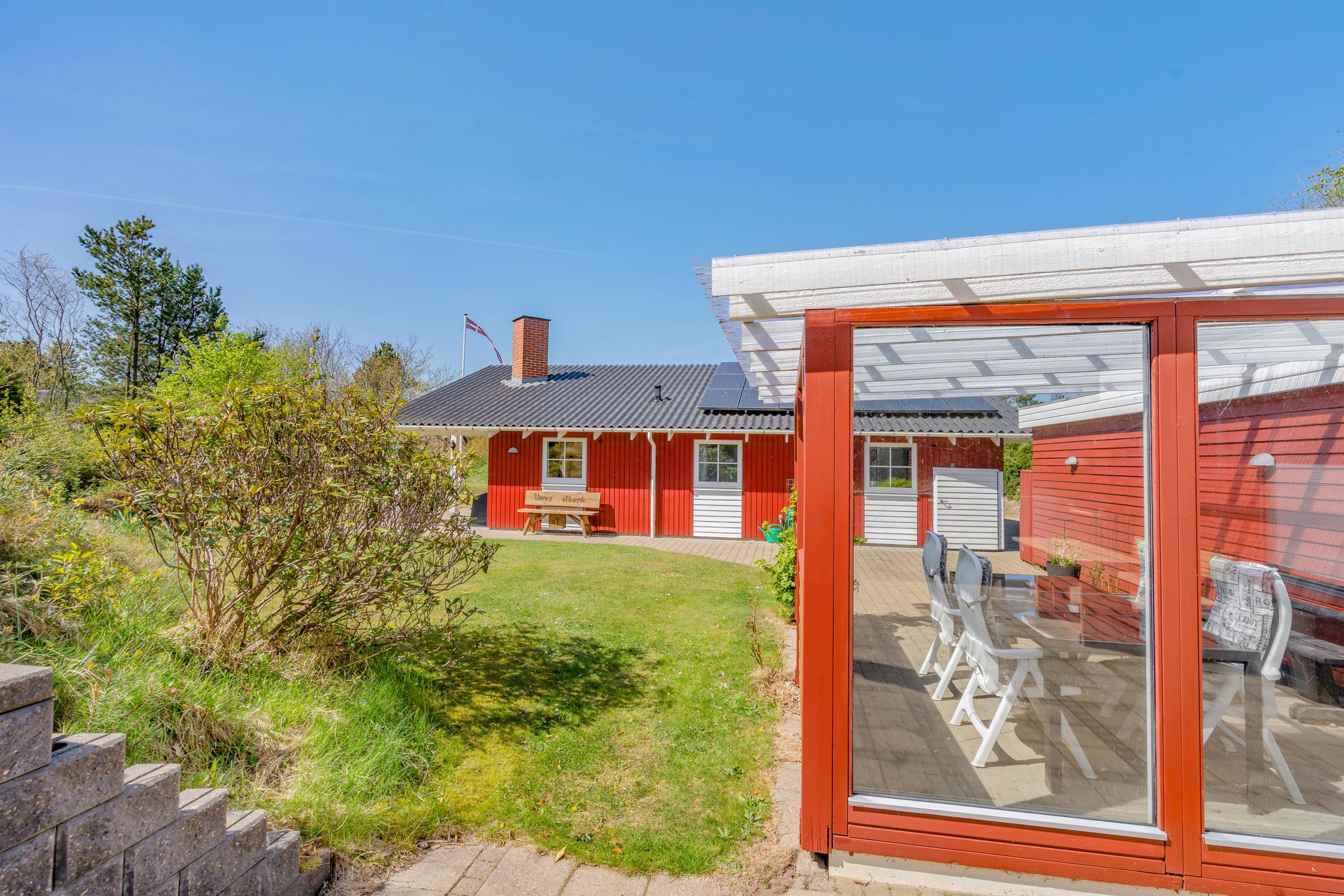 Udendørs byder sommerhuset på et dejligt udeområde, hvor I har en skøn have og flere gode terrasser, som I kan tilbringe de solrige feriedage på. På terrasserne har I havemøbler og liggestole, som I kan læne jer tilbage i på en god plads i solen.