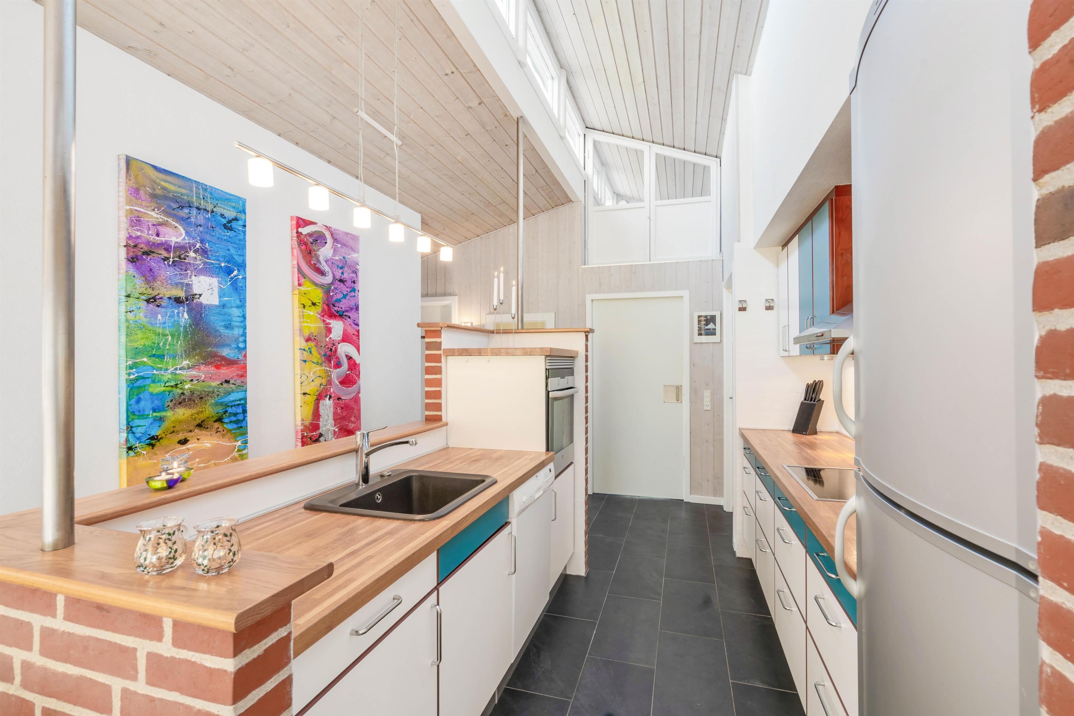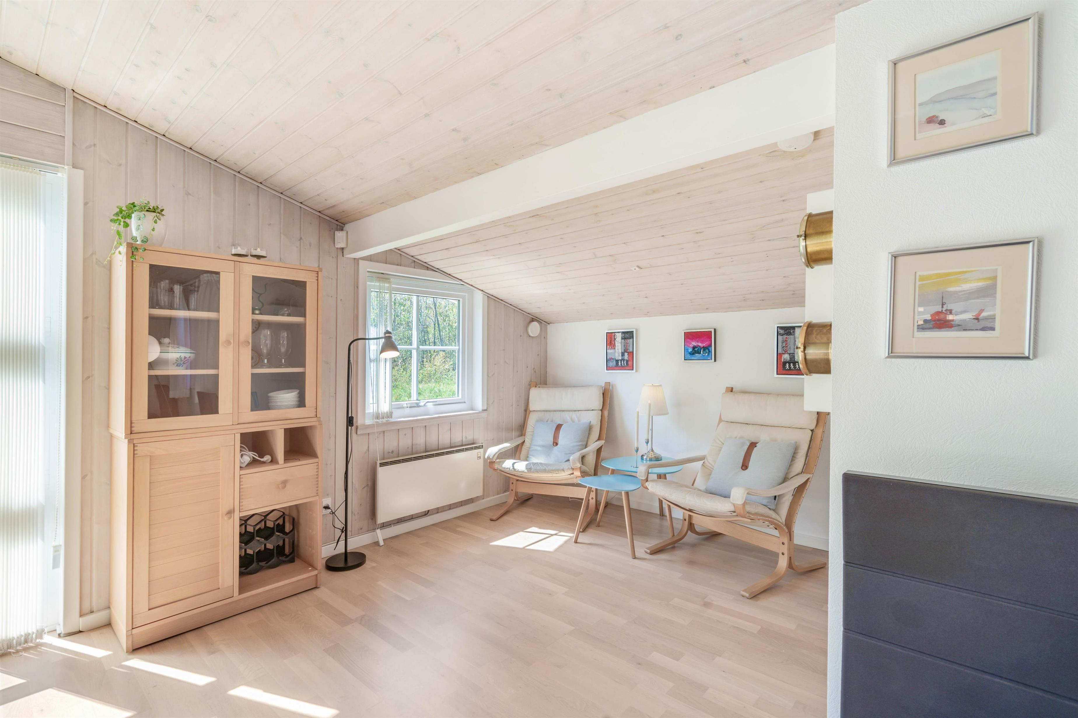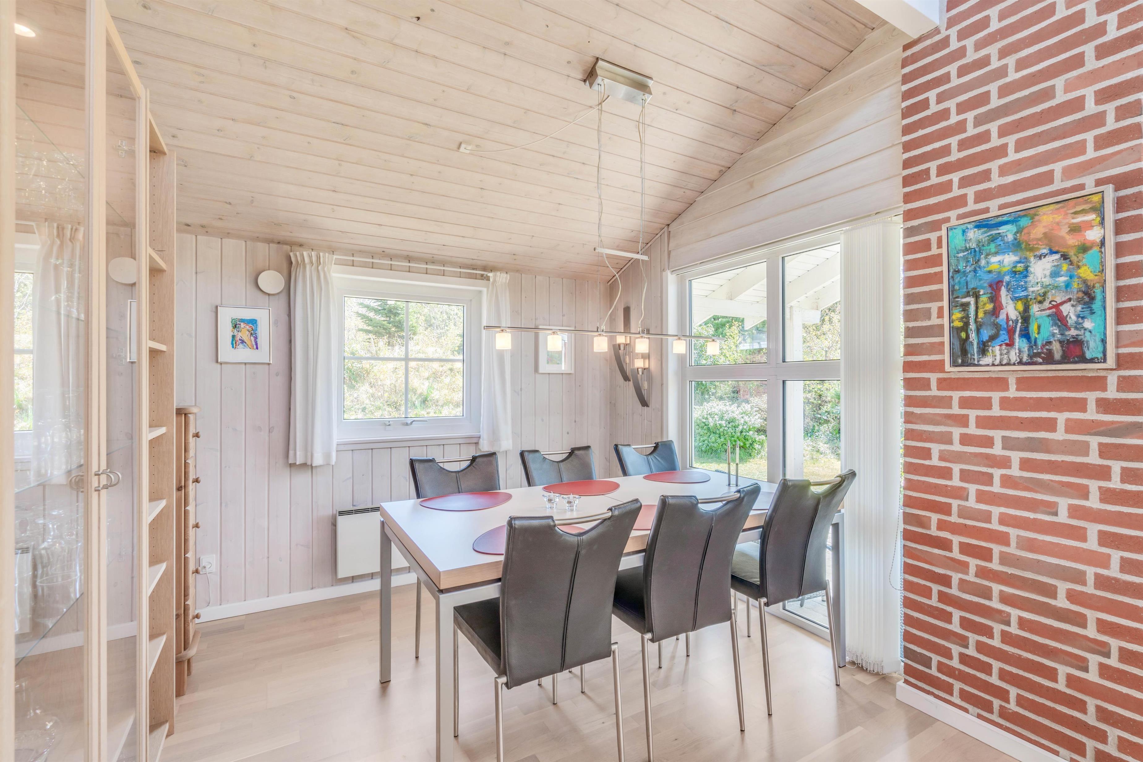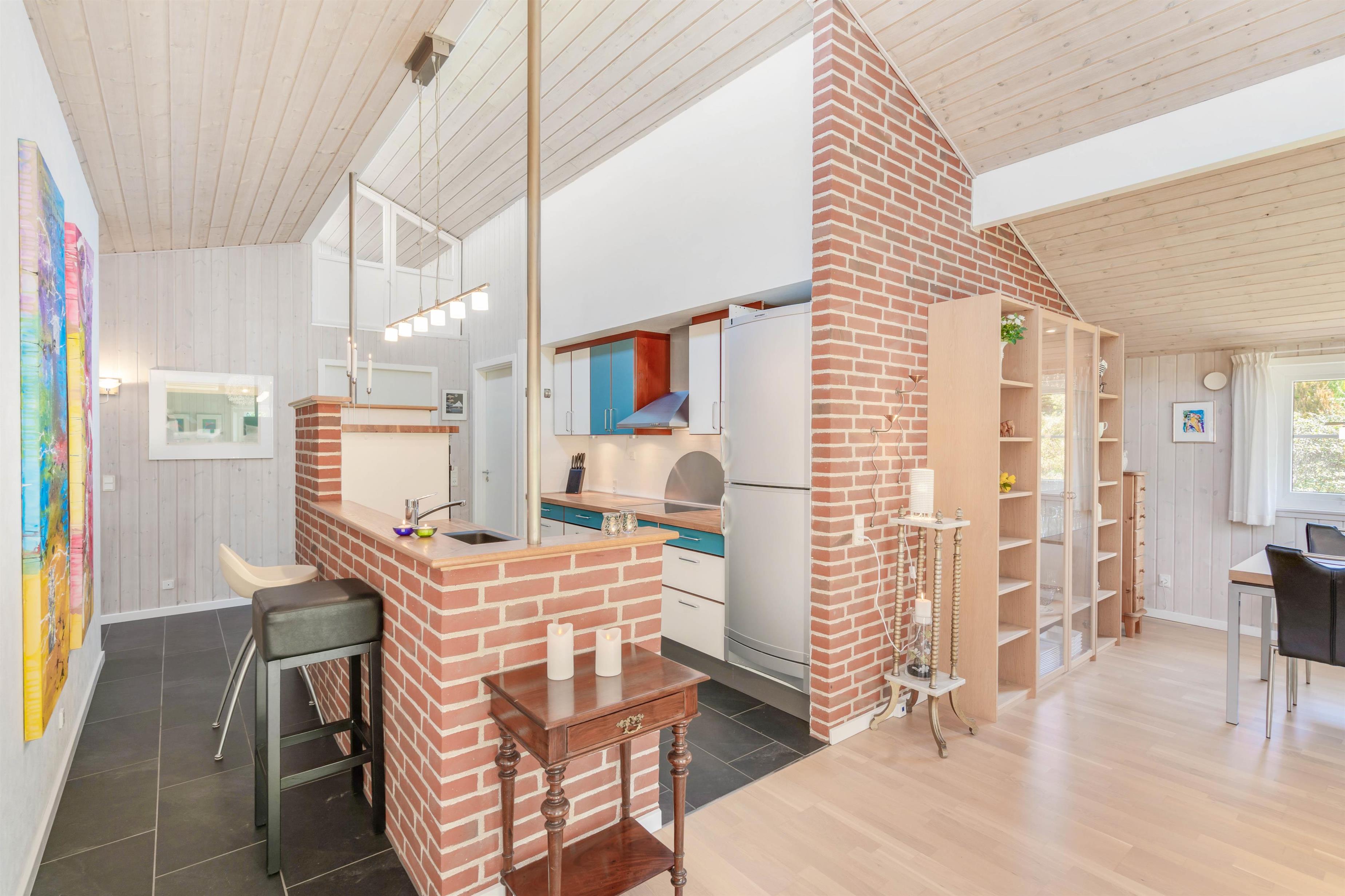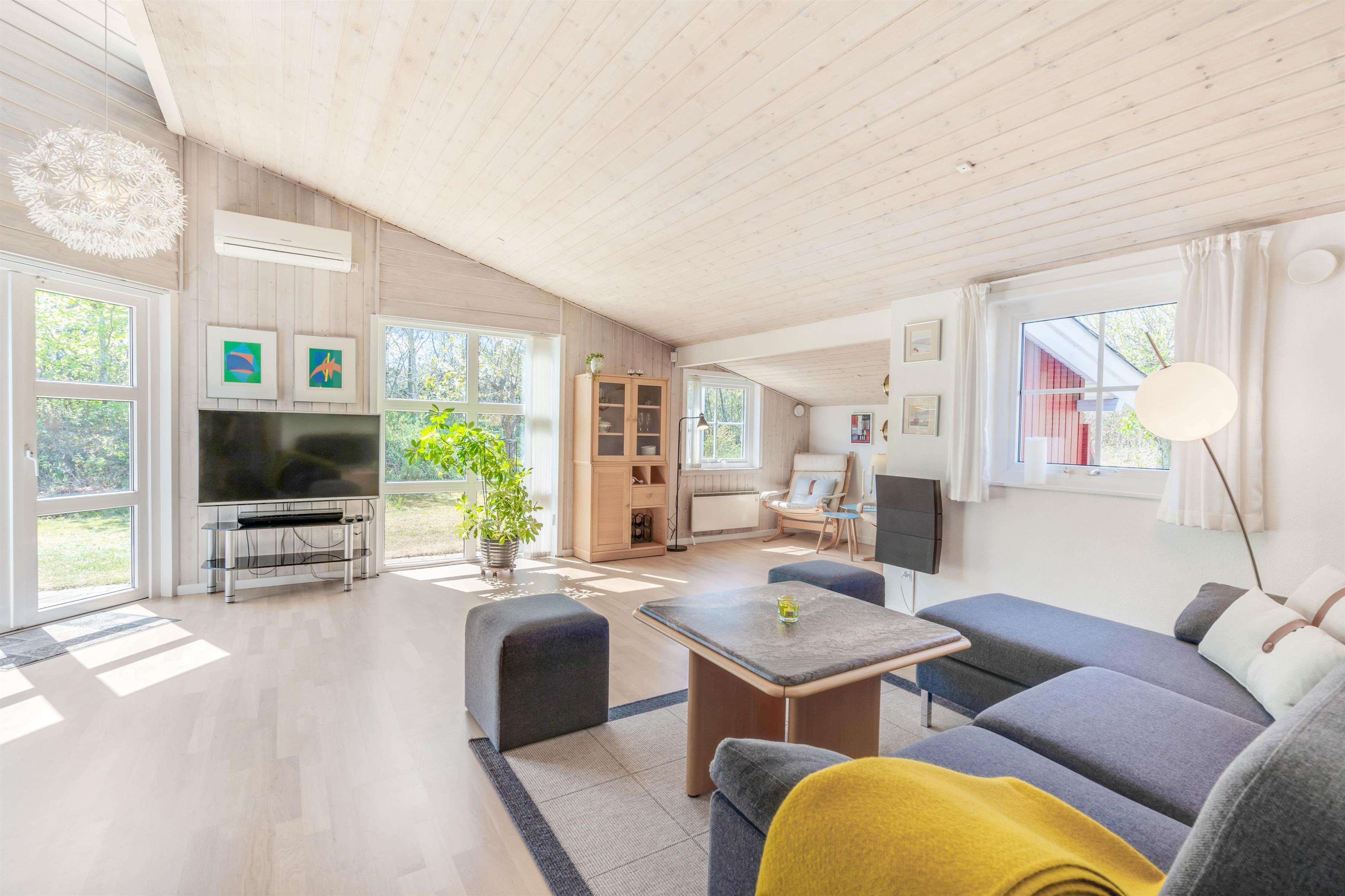 I vil helt sikkert også komme til at tilbringe mange hyggelige timer i feriehusets alrum, hvor køkken, stue og spisestue ligger i åben forbindelse. I alrummet kan I samles om at lave mad, spille spil og se gode film, mens brændeovnen knitrer i baggrunden og fuldender feriestemningen. Udover brændeovn sørger varmepumpen for en behagelig temparatur i alle rum. De monterede solceller vil bidrage med at holde det samlede energiforbrug nede.