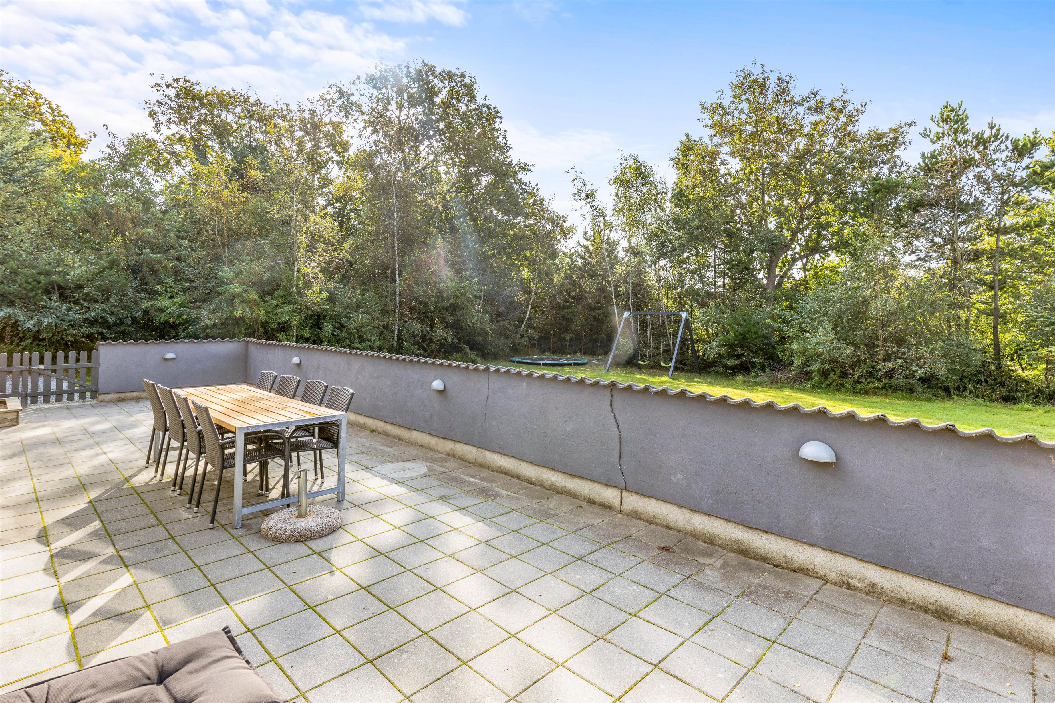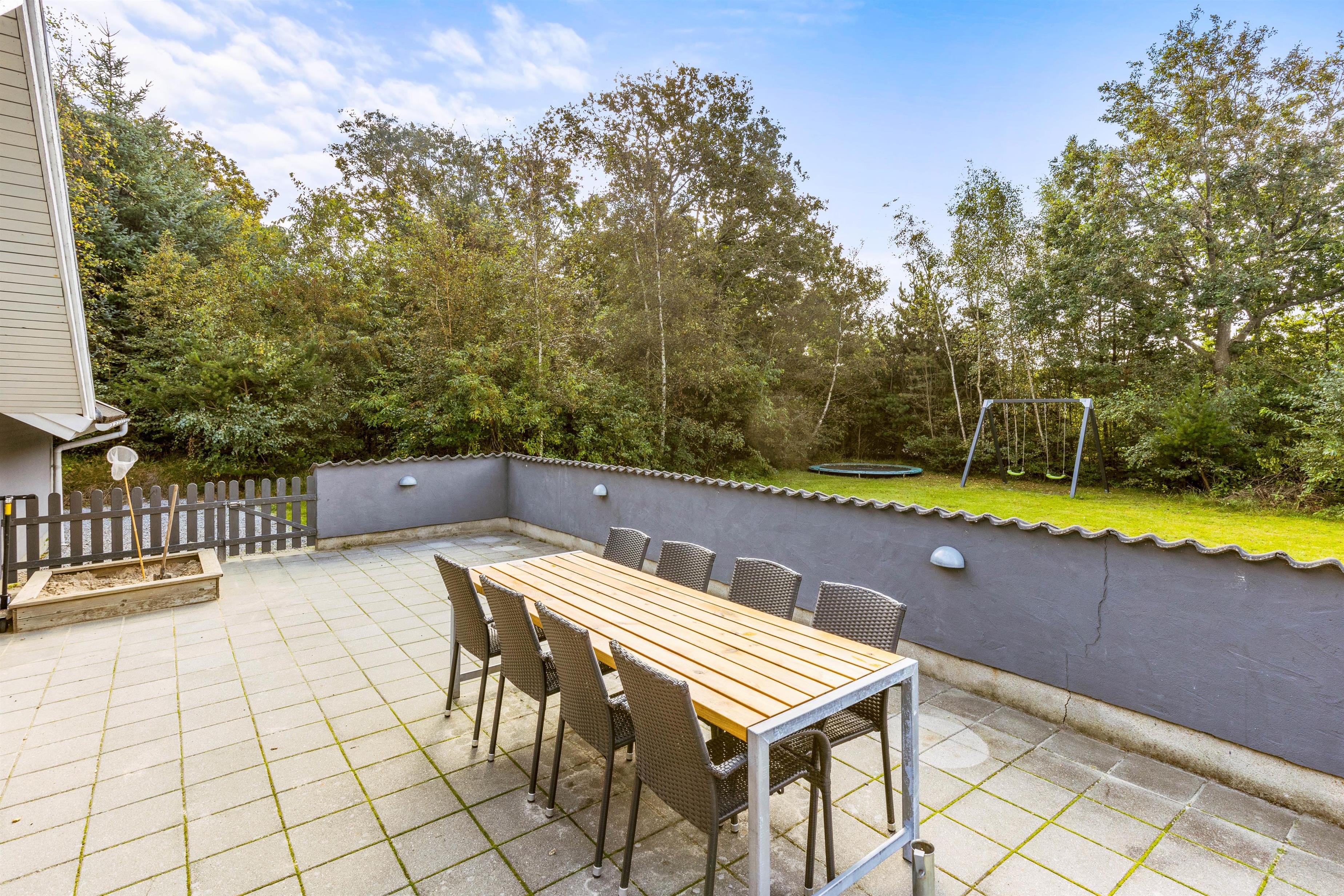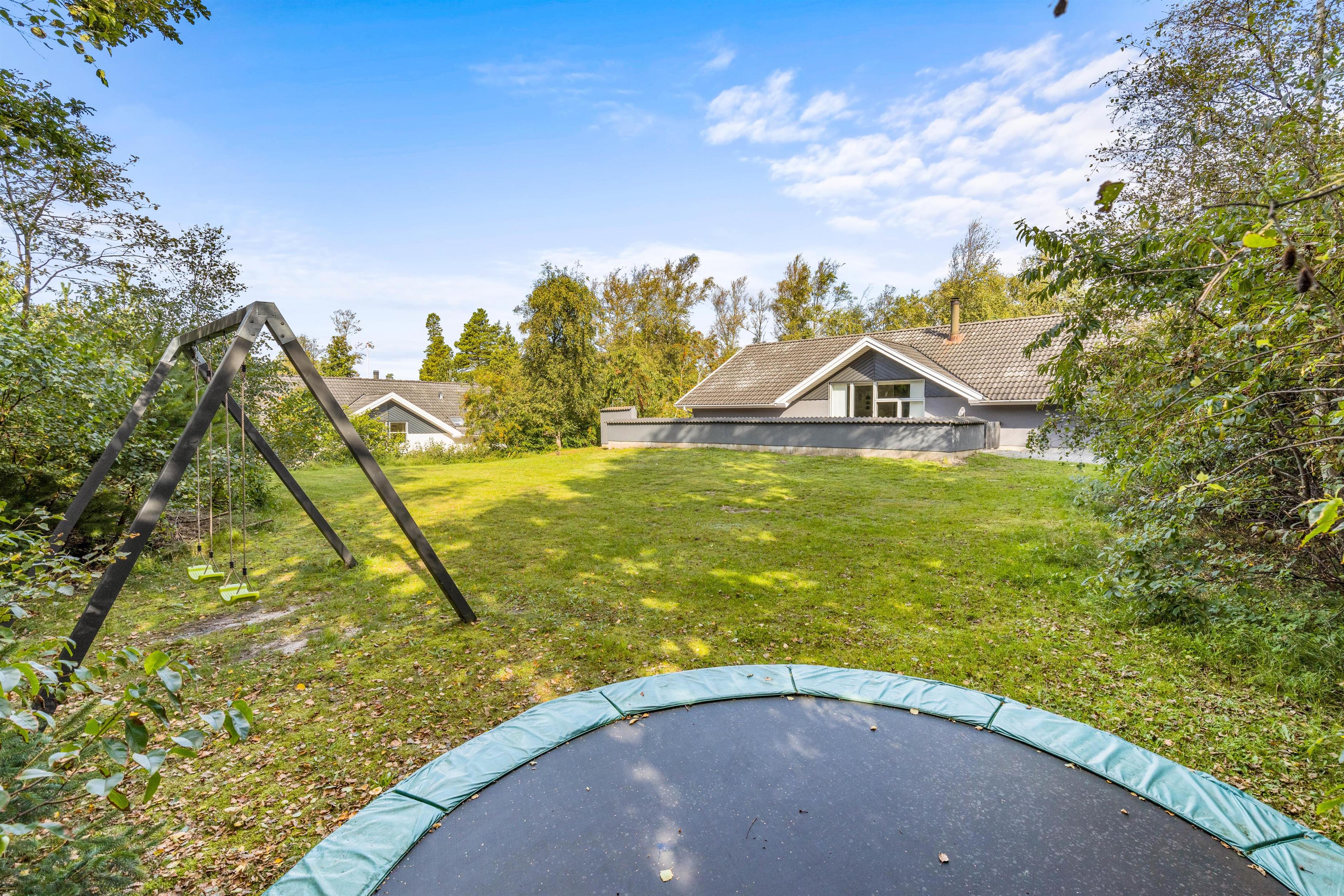 Sommerhuset ligger på en dejlig plænegrund med mange aktiviteter for børnene. Der er bl.a. både gynge, sandkasse og trampolin – et stort hit for børn i alle aldre. Der en lukket terrasse, som byder op til hyggeligt samvær med både grill og diverse havemøbler, og efter en tur i Vesterhavet, kan man skylle sandet af under den udendørs bruser*!