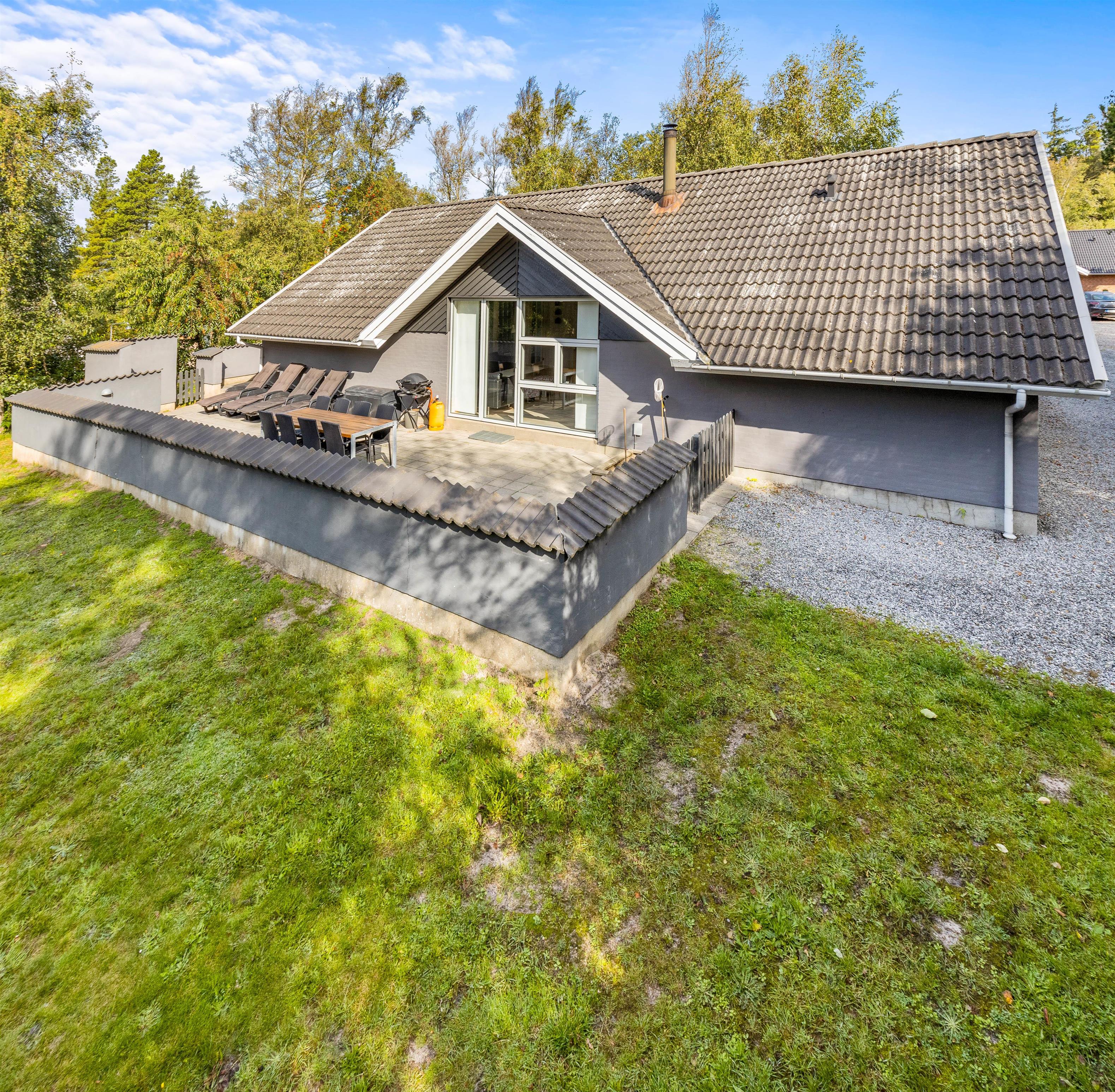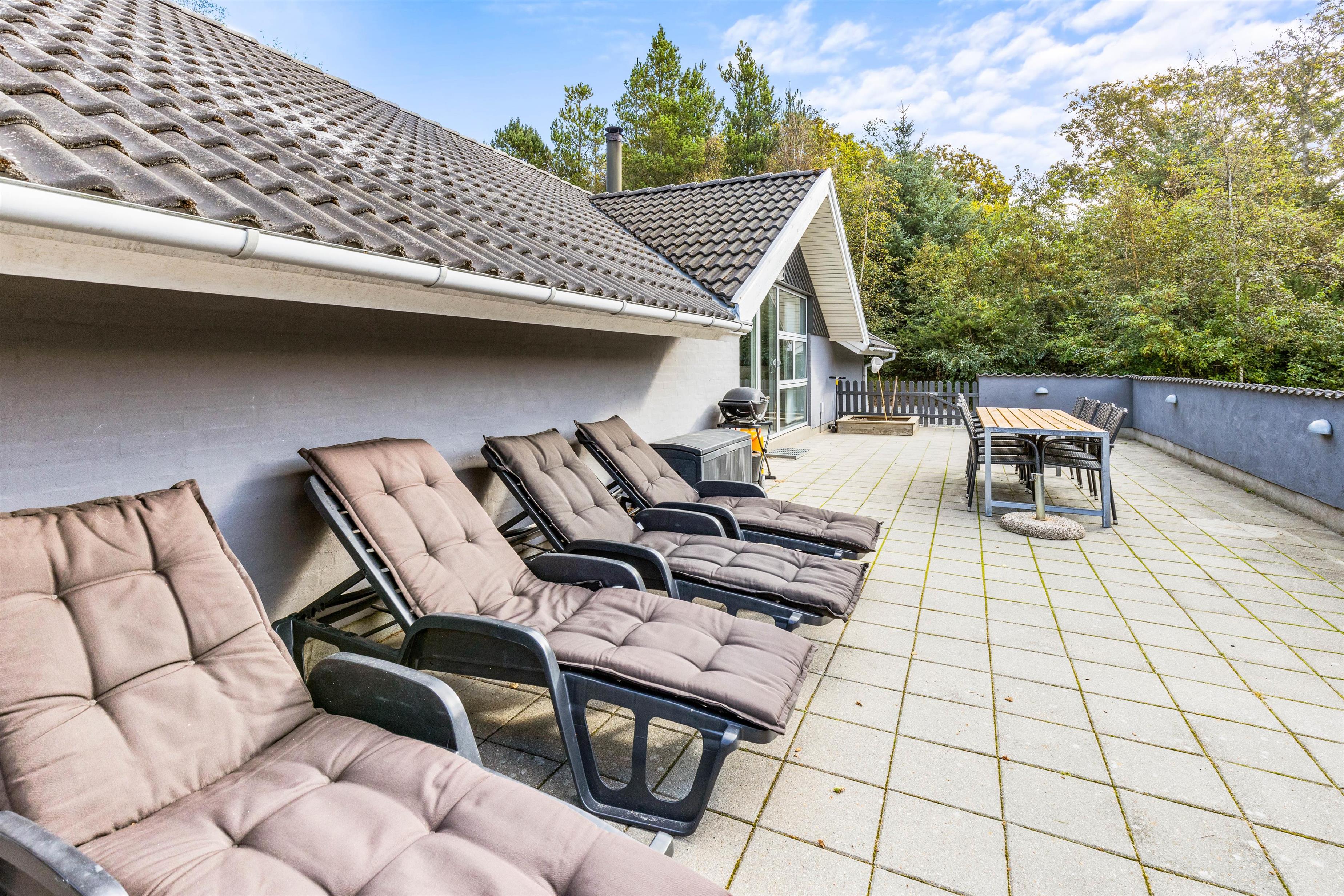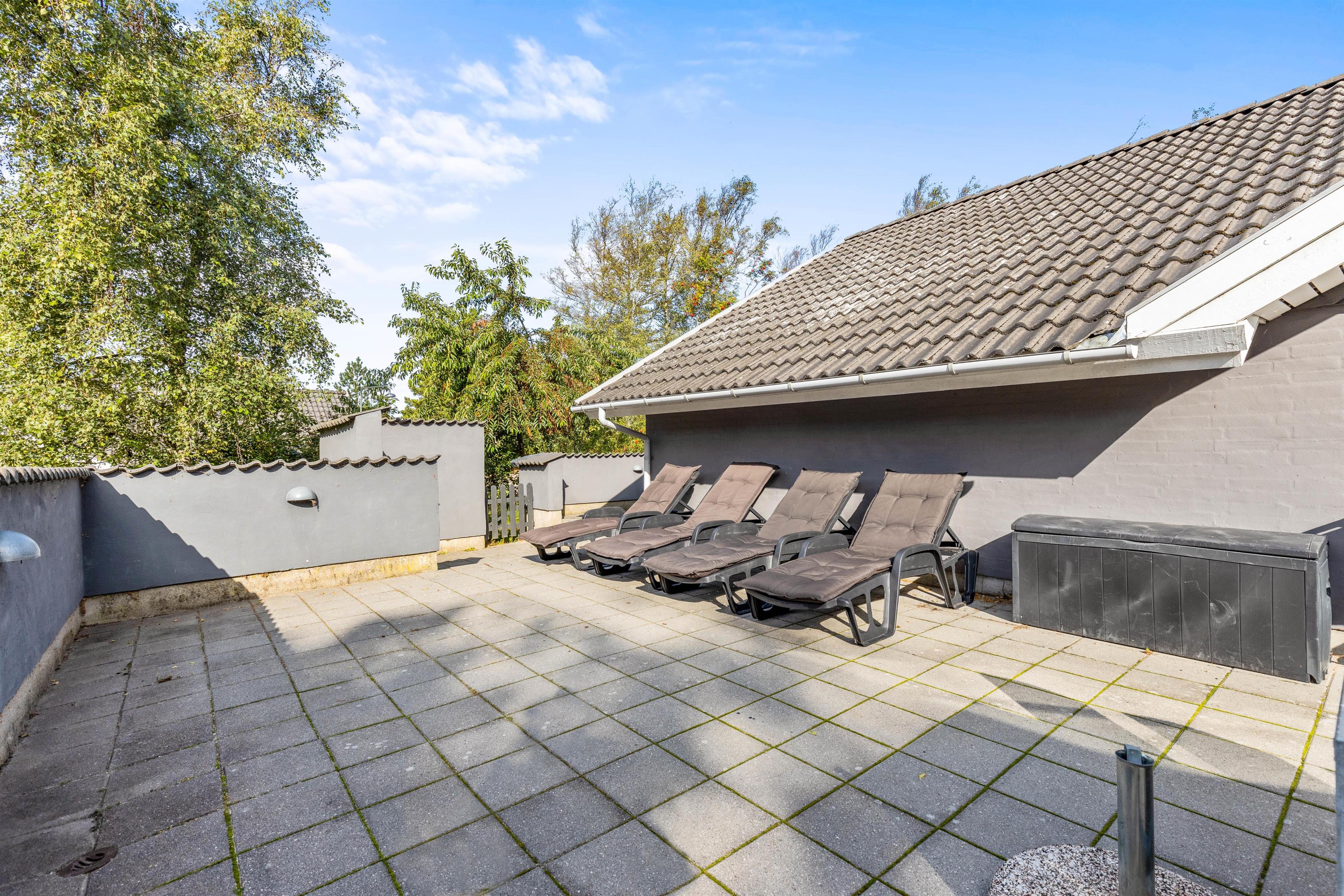 Sommerhuset ligger på en dejlig plænegrund med mange aktiviteter for børnene. Der er bl.a. både gynge, sandkasse og trampolin – et stort hit for børn i alle aldre. Der en lukket terrasse, som byder op til hyggeligt samvær med både grill og diverse havemøbler, og efter en tur i Vesterhavet, kan man skylle sandet af under den udendørs bruser*!
