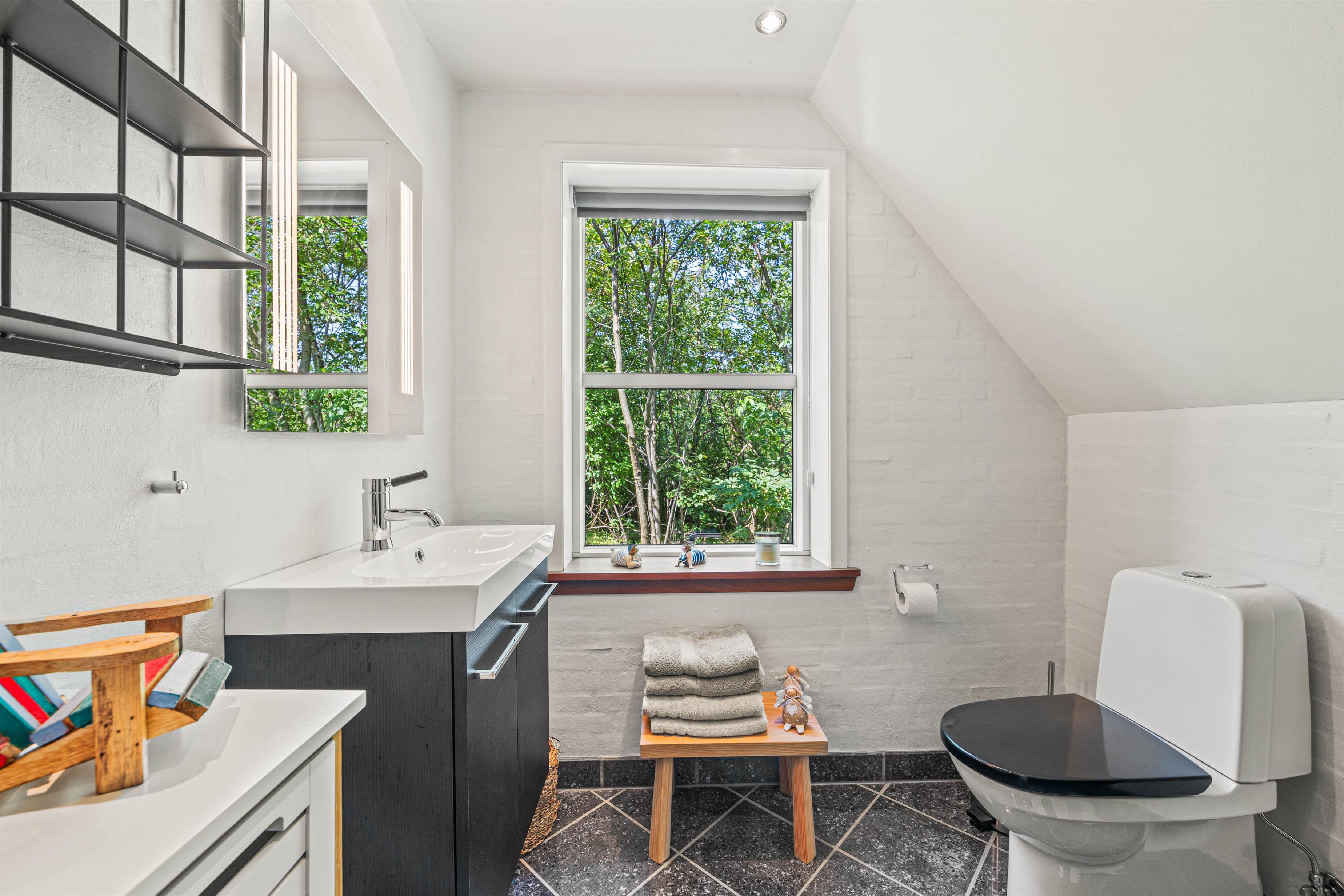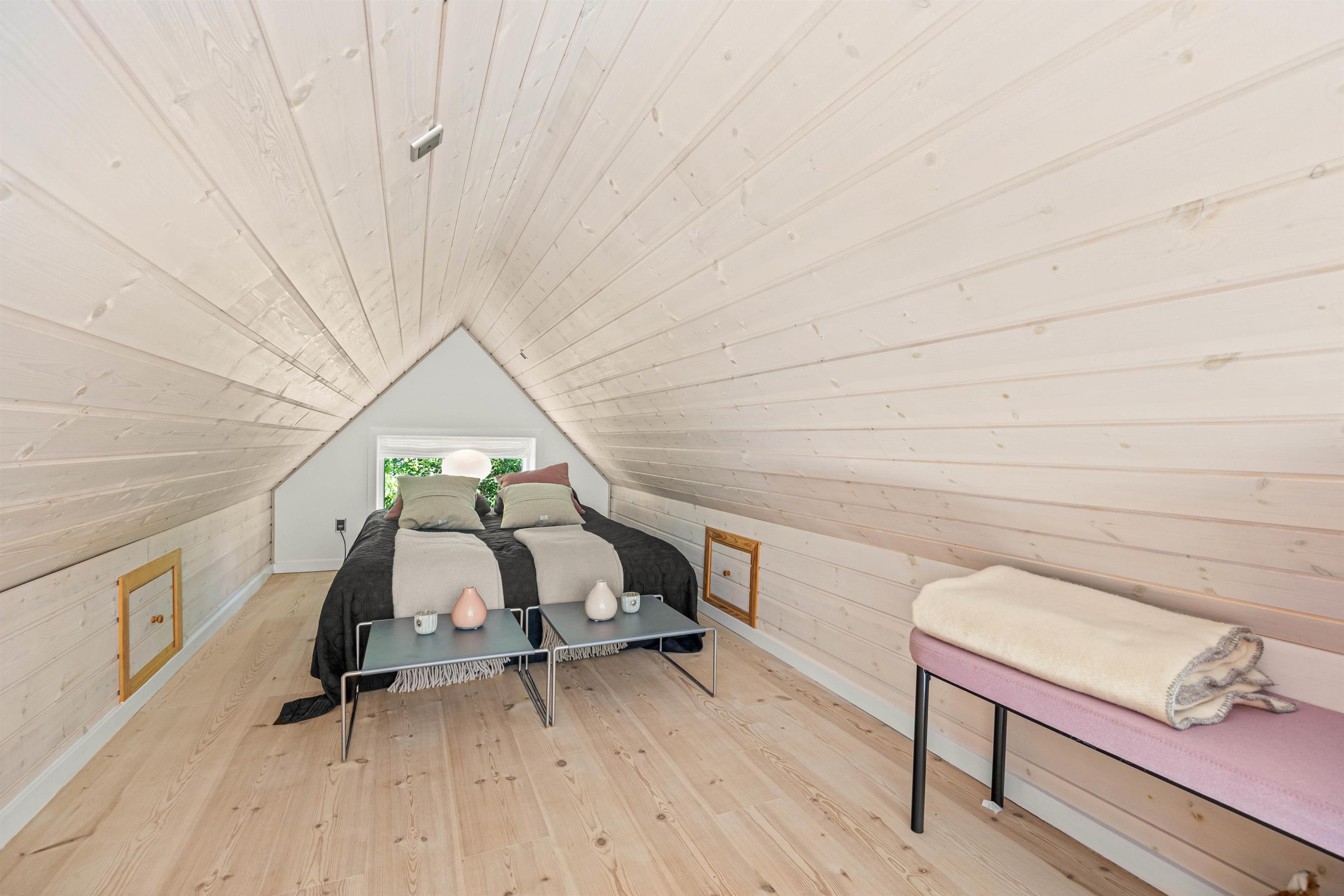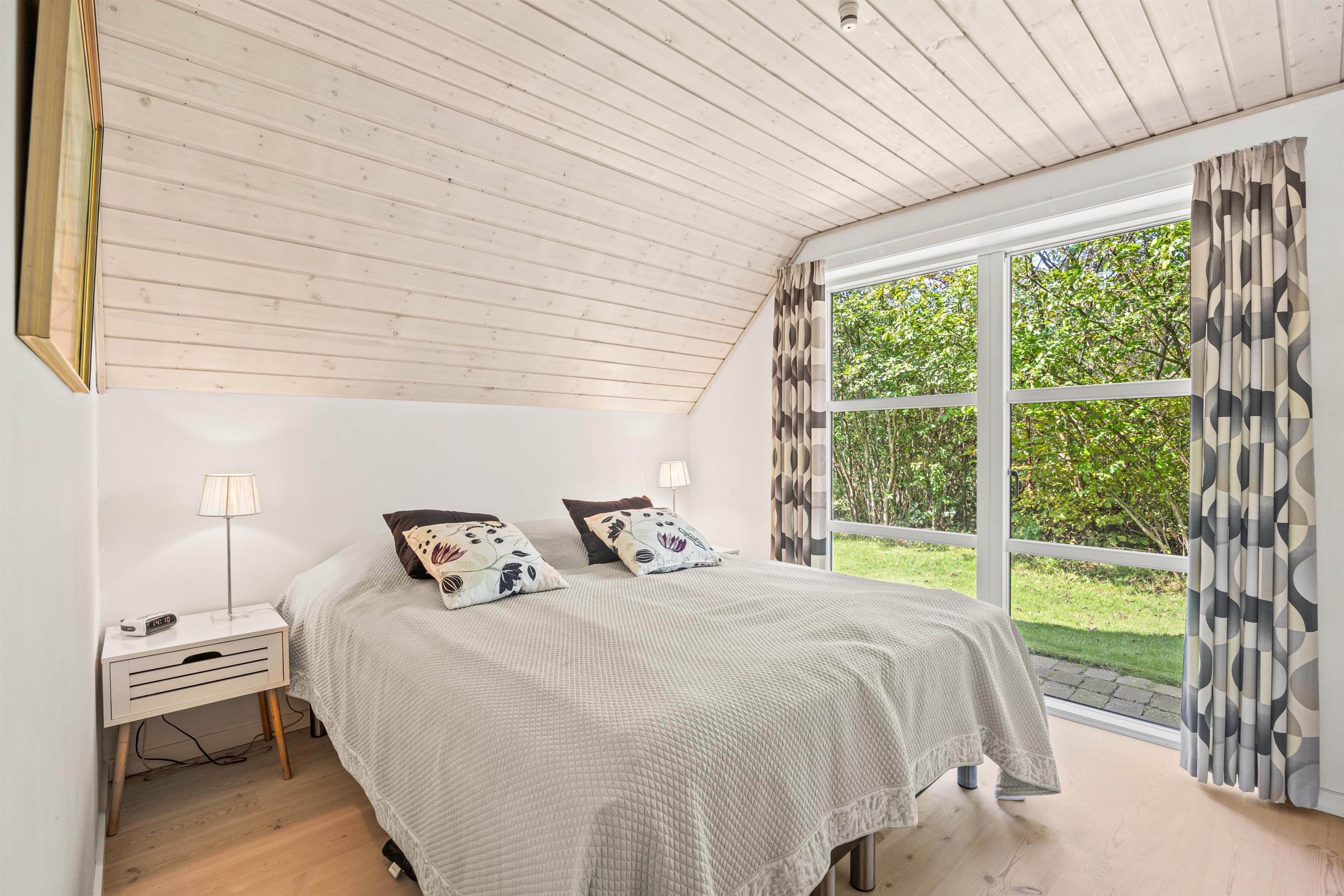 Sommerhusets 2 gode soveværelser, hver med en dobbeltseng, sikrer en god nats søvn. Igennem terrassedøren i det ene soveværelse kan I nyde udsigten til den unikke omkringliggende natur. En stejl trappe fører jer op til soveværelset på 1. etage, hvor sommerhuset anden dobbeltseng befinder sig.