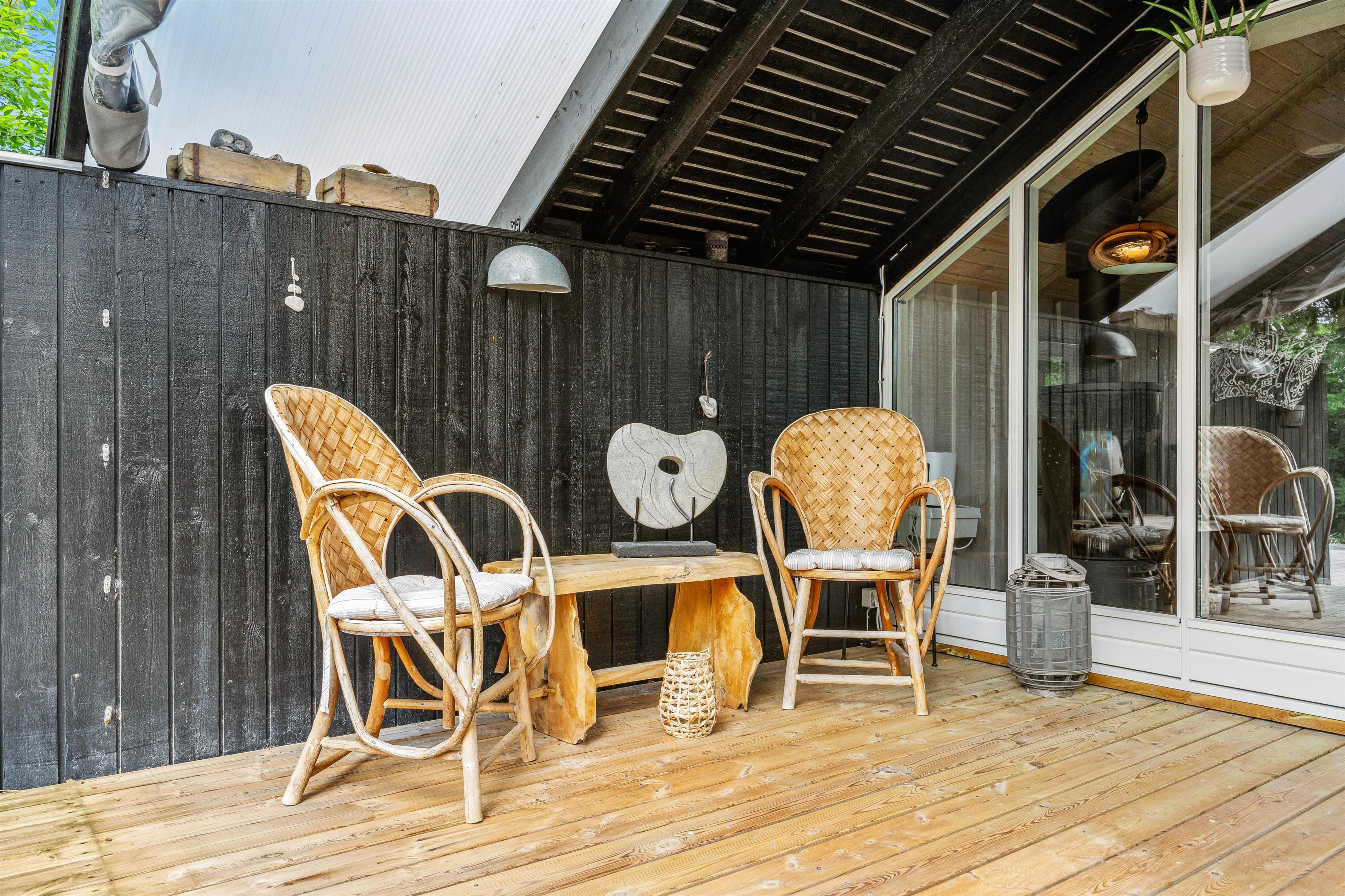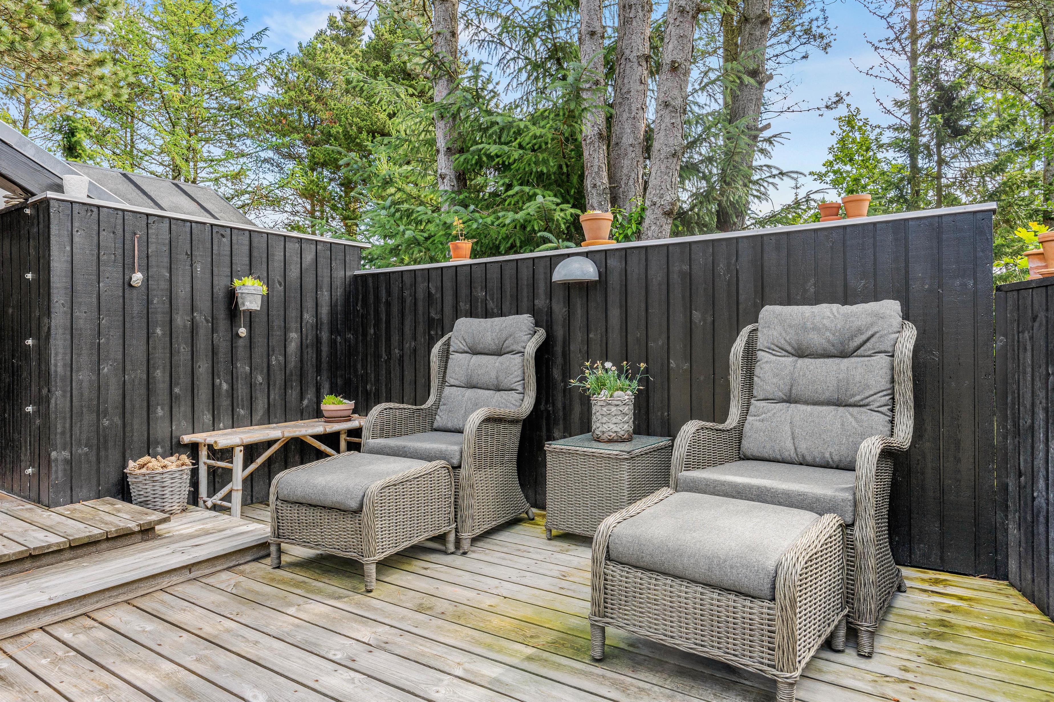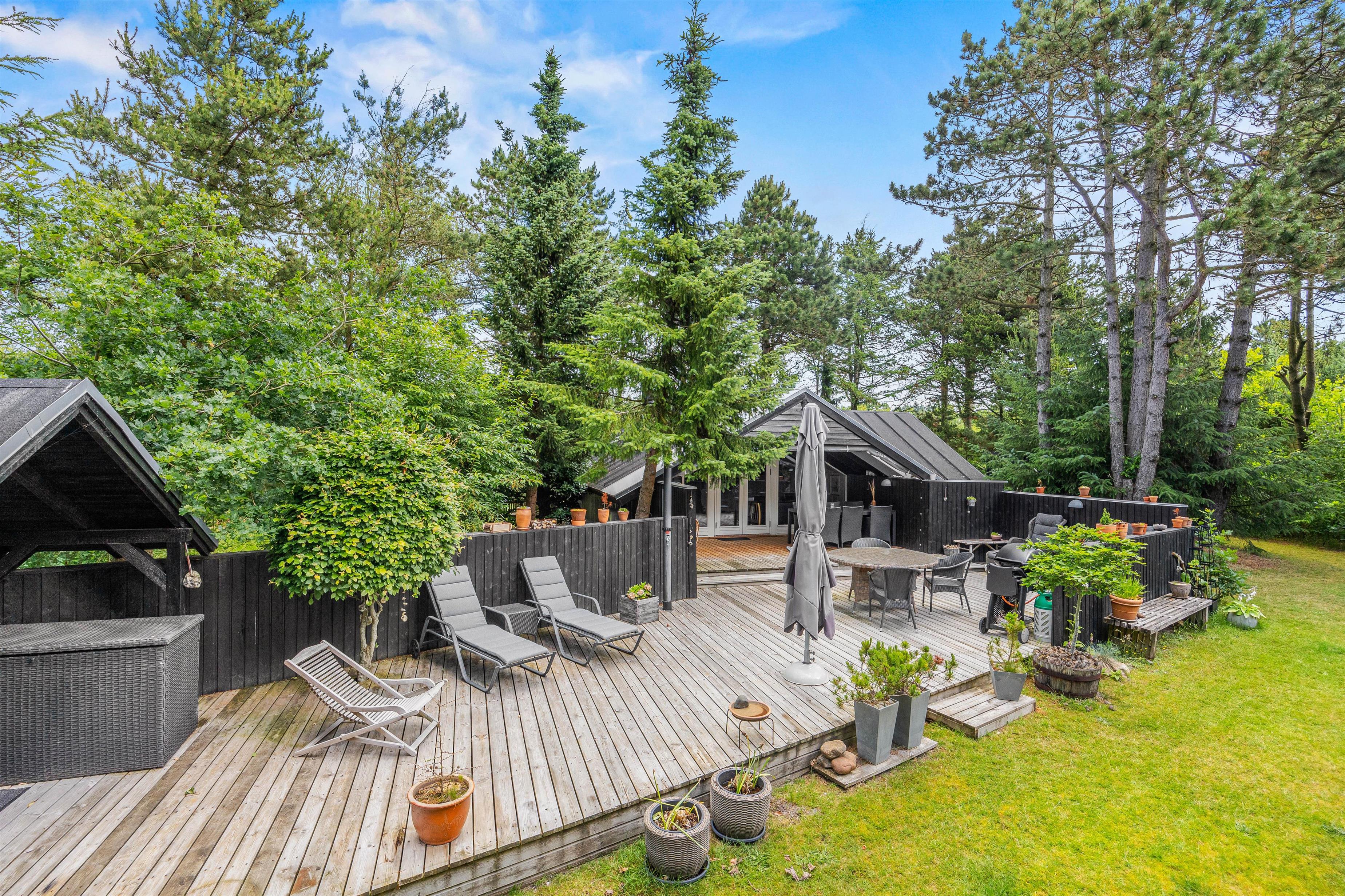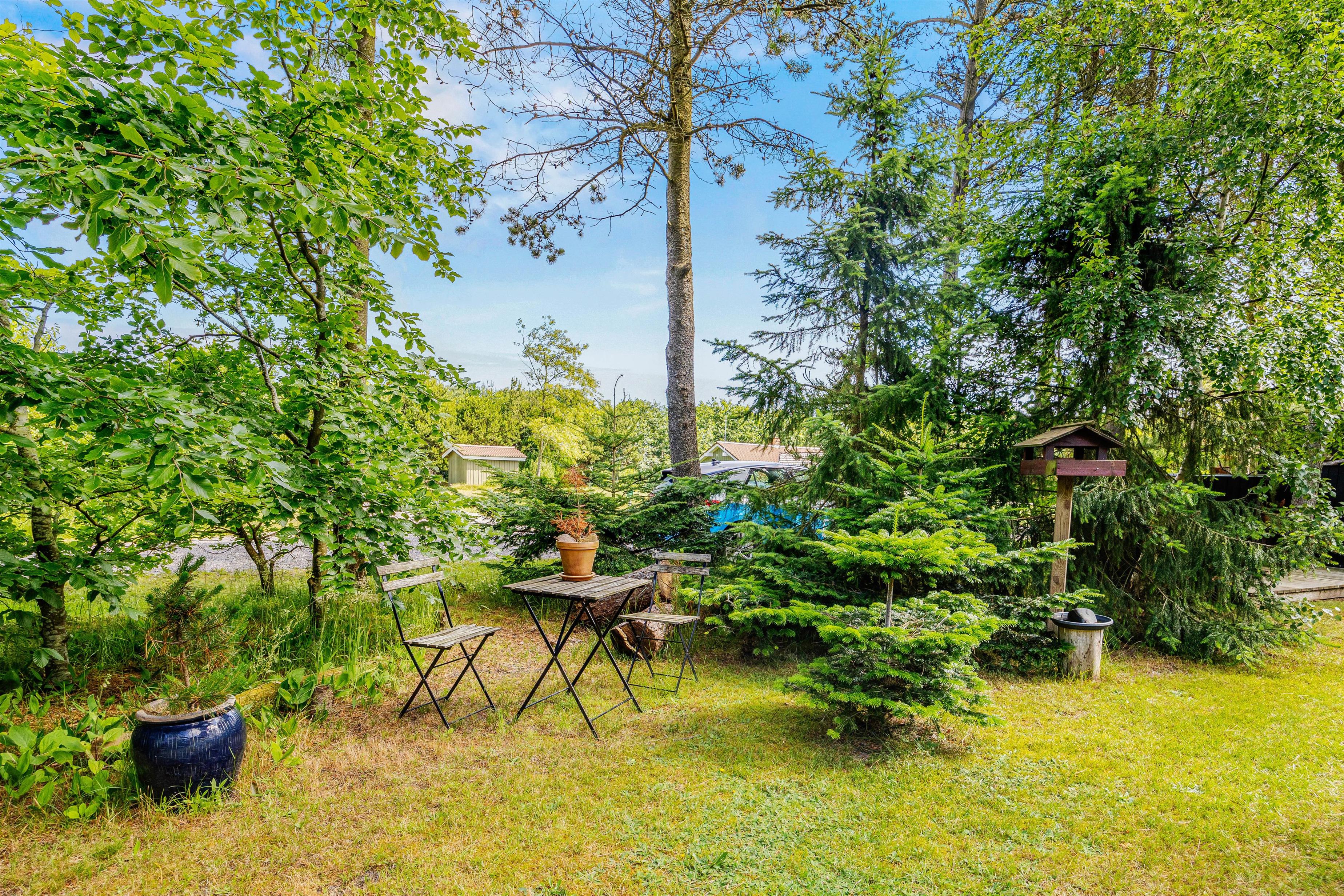 Også sommerhusets grund er yderst veludnyttet: rundt omkring i den hyggelige have er der placeret diverse siddepladser i adskillige hyggekroge: Her vil I uanset, hvor I befinder jer, opdage nye vinkler og skønne detaljer - i haven ligesom dens direkte omgivelse. Haven er delvis indhegnet, og kan I roligt lade børnene lege frit, imens I slapper af på den dejligt afskærmede terrasse, som er muligt at lukke helt af når aftenens kulde falder ned – eller for at sidde i regnvejret og kigge ud på den smukke granskov. På træterrassen, som er direkte forbundet med sommerhuset, kan I mødes for at nyde hjemmelavede måltider på grillen eller også kan den bruges til at ligge i hængekøjen og holde øje med fugle og egern.