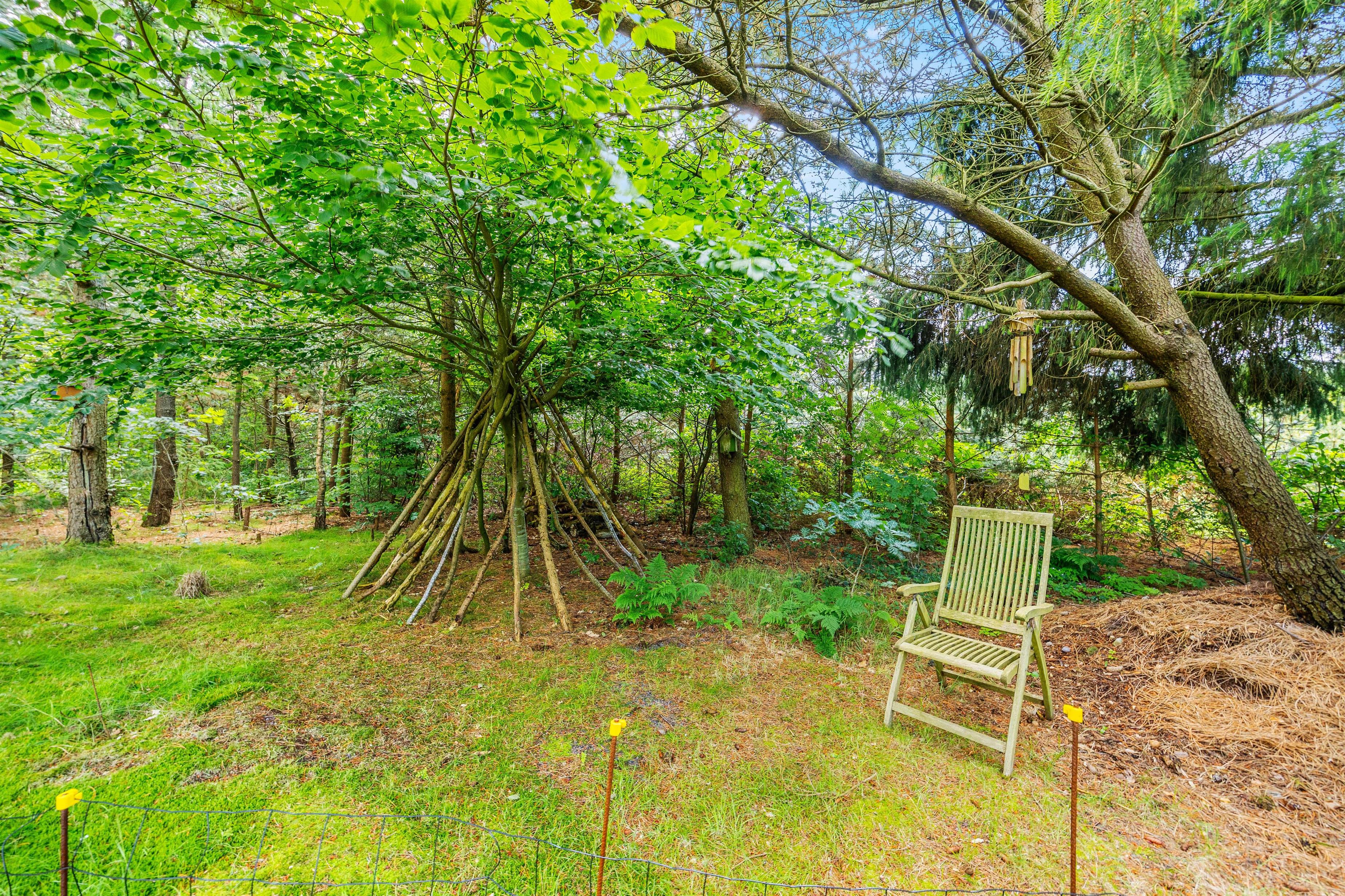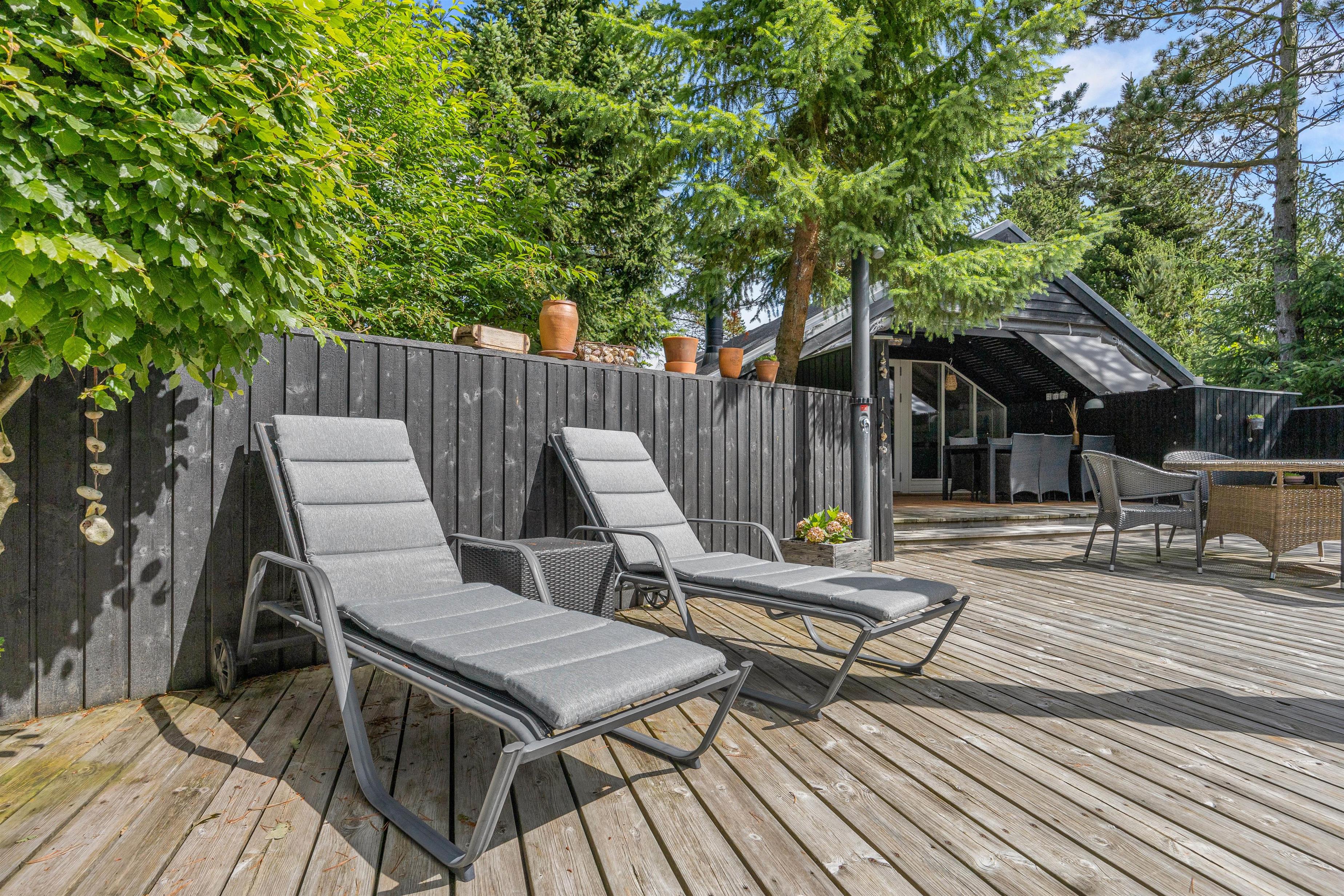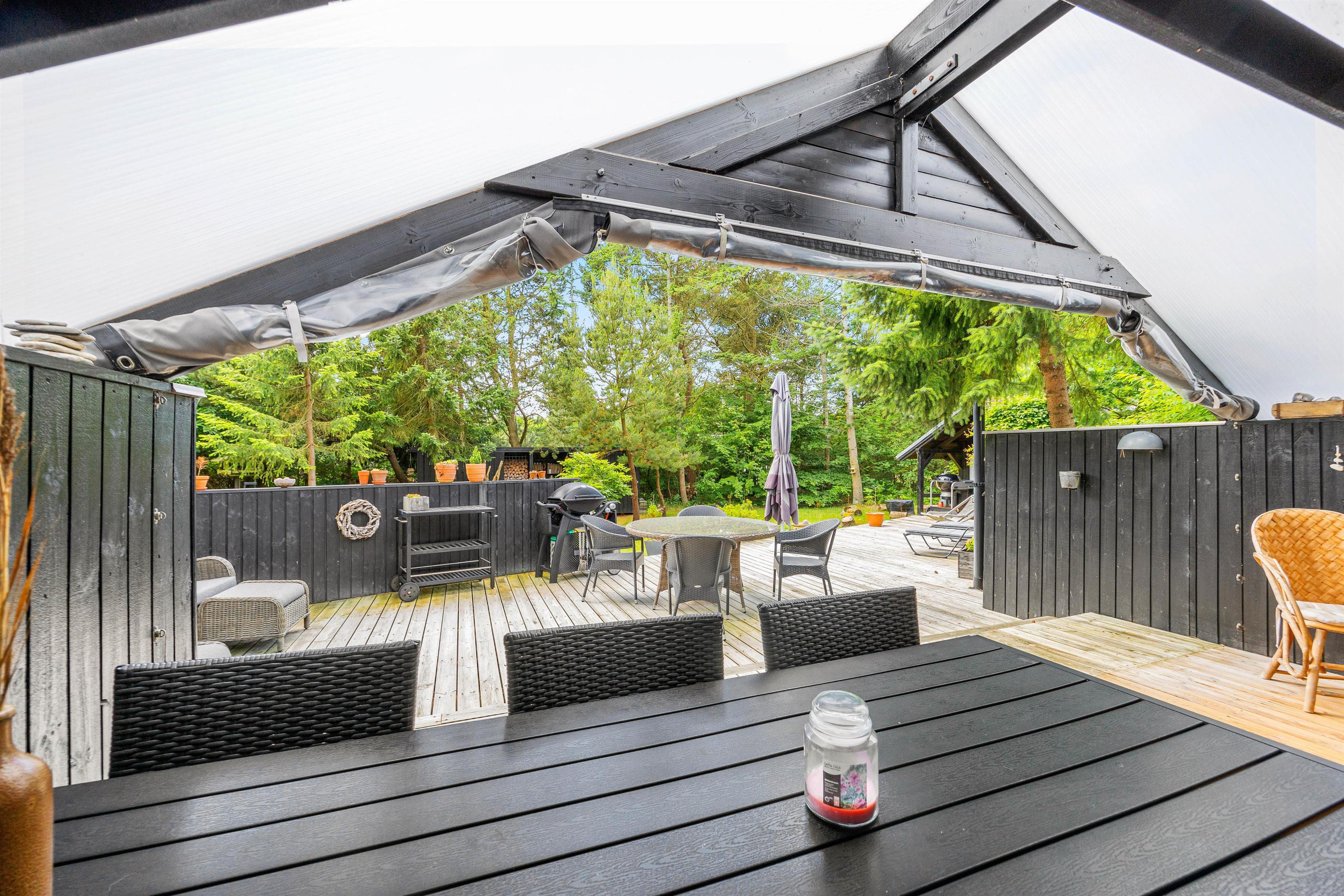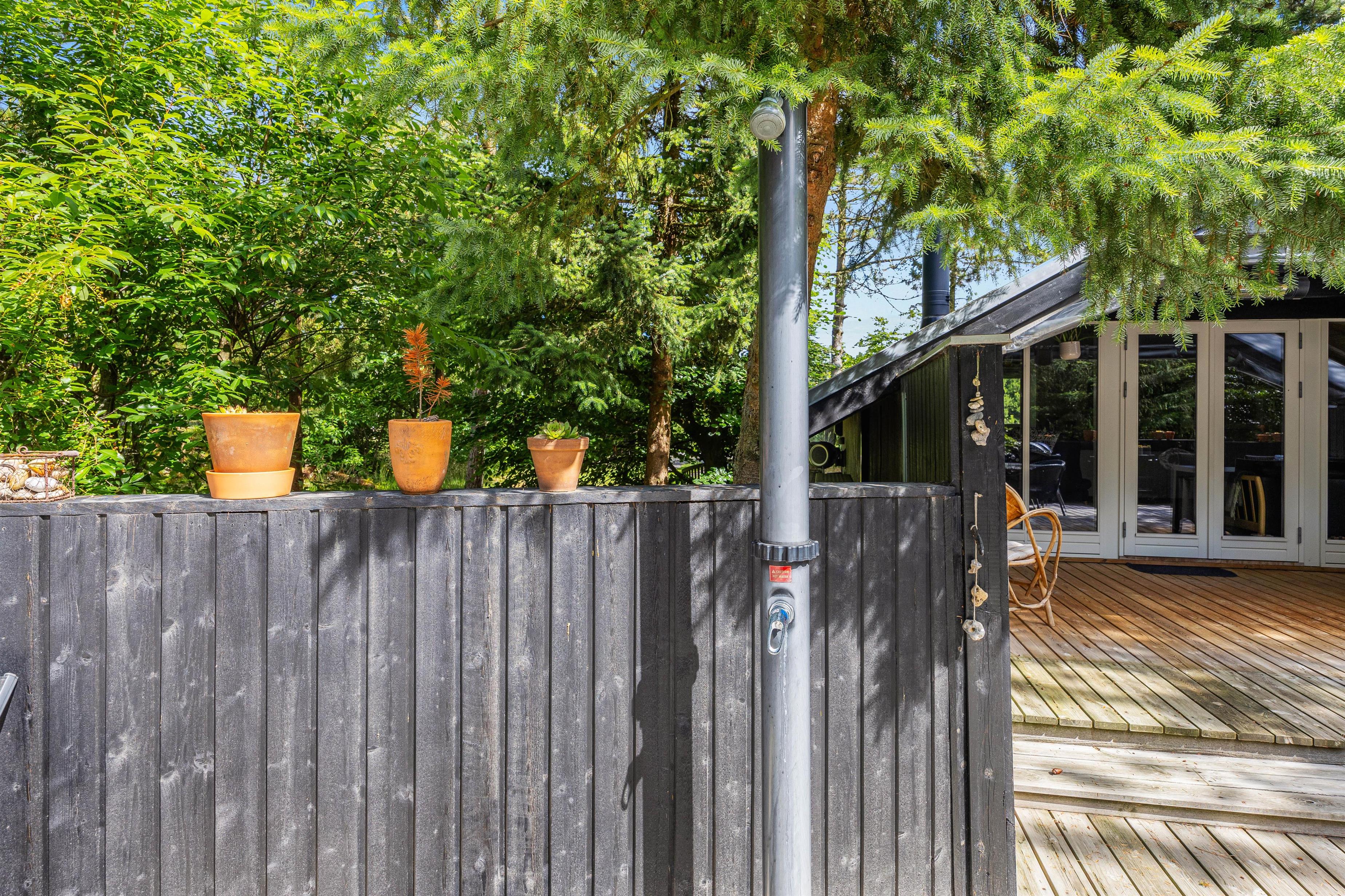 Også sommerhusets grund er yderst veludnyttet: rundt omkring i den hyggelige have er der placeret diverse siddepladser i adskillige hyggekroge: Her vil I uanset, hvor I befinder jer, opdage nye vinkler og skønne detaljer - i haven ligesom dens direkte omgivelse. Haven er delvis indhegnet, og kan I roligt lade børnene lege frit, imens I slapper af på den dejligt afskærmede terrasse, som er muligt at lukke helt af når aftenens kulde falder ned – eller for at sidde i regnvejret og kigge ud på den smukke granskov. På træterrassen, som er direkte forbundet med sommerhuset, kan I mødes for at nyde hjemmelavede måltider på grillen eller også kan den bruges til at ligge i hængekøjen og holde øje med fugle og egern.