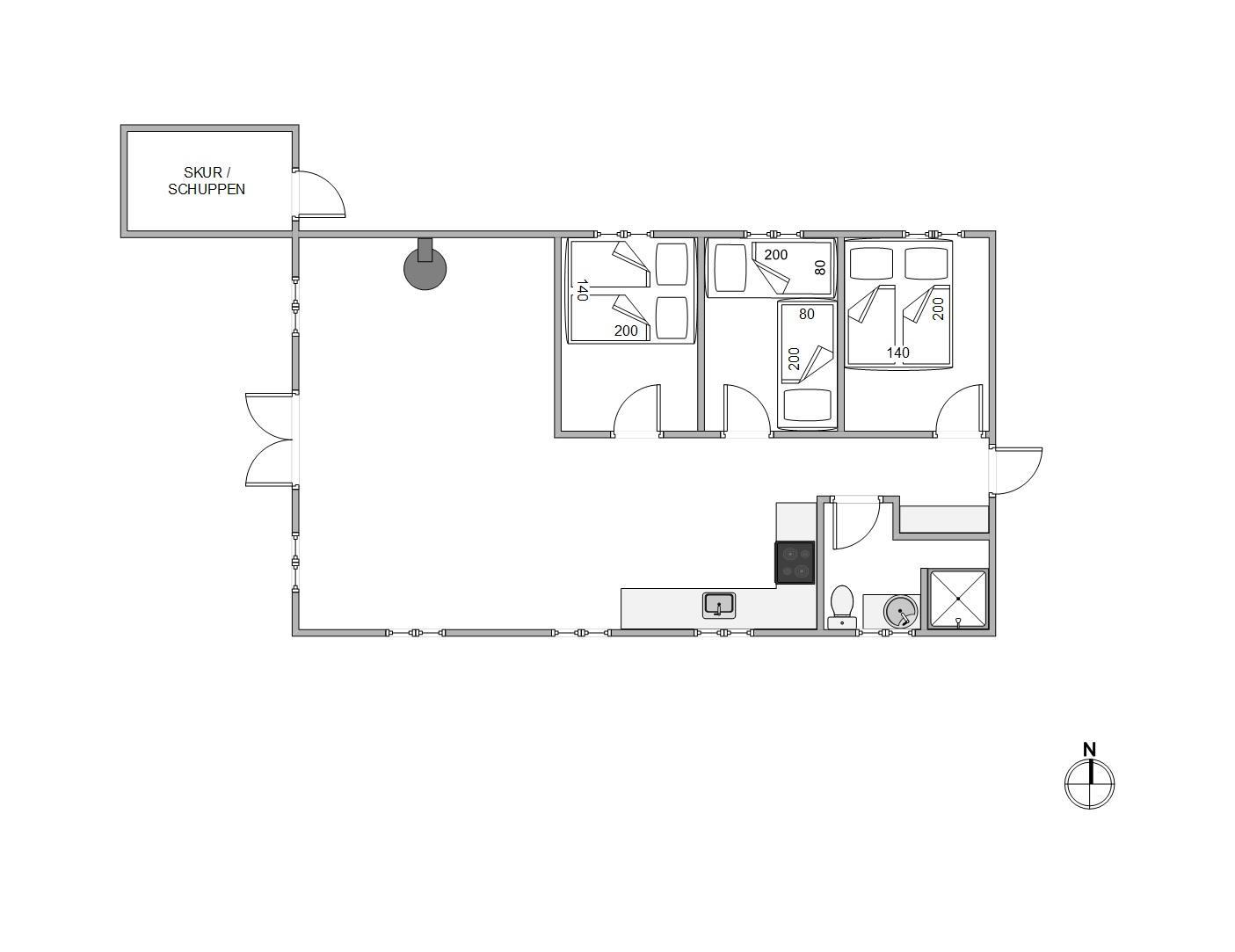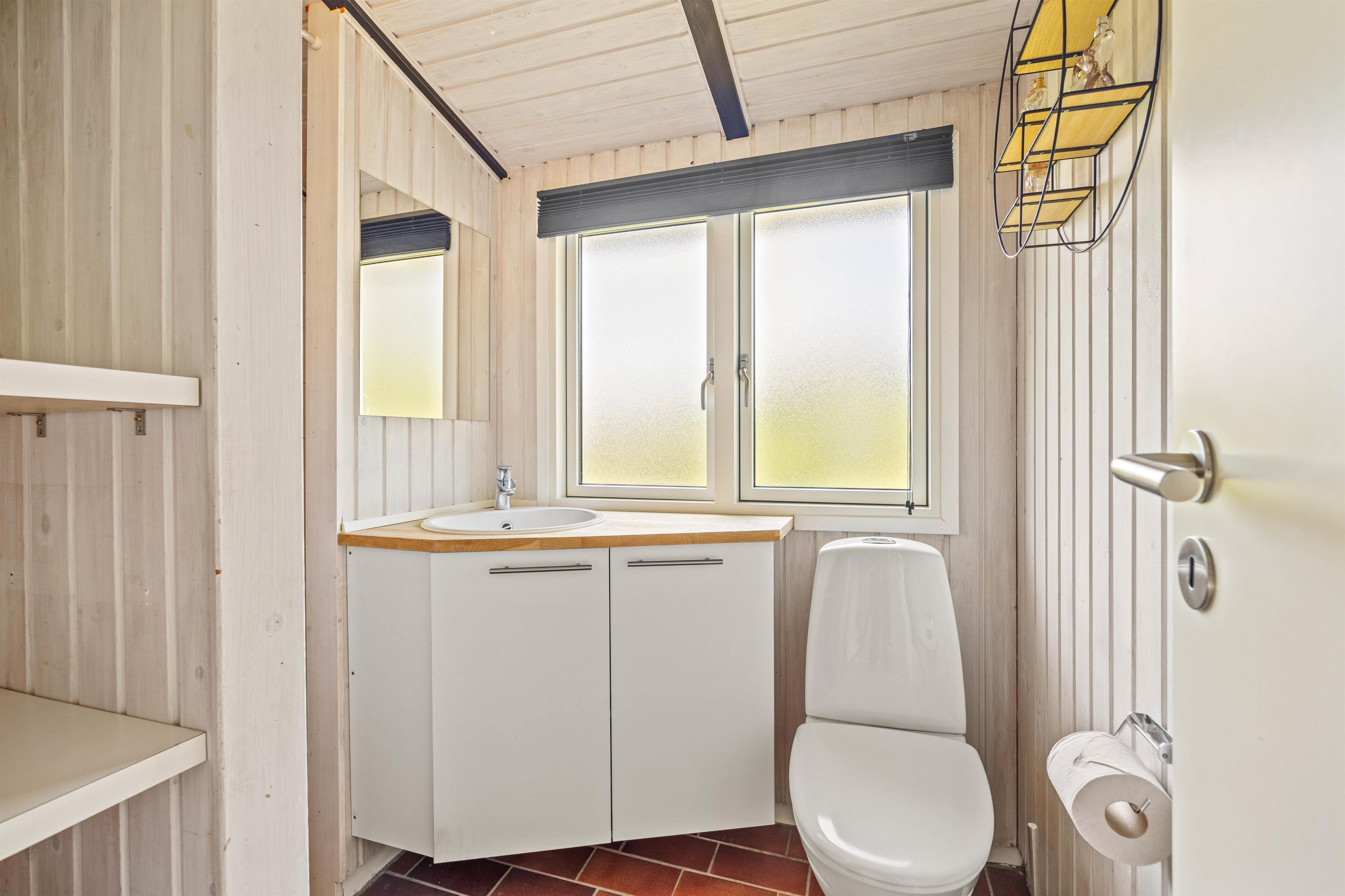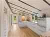 Den lyse stue med det åbne, veludstyrede køkken indbyder til masser af familietid. Den venlige og moderne indretning og de mørke loftsbjælker som kontrast på de lyse trælofter tilfører omgivelserne den helt klassiske sommerhuscharme. På de kølige dage kan I sætte jer til rette foran den knitrende brændeovn og varme jer på en kop kakao.