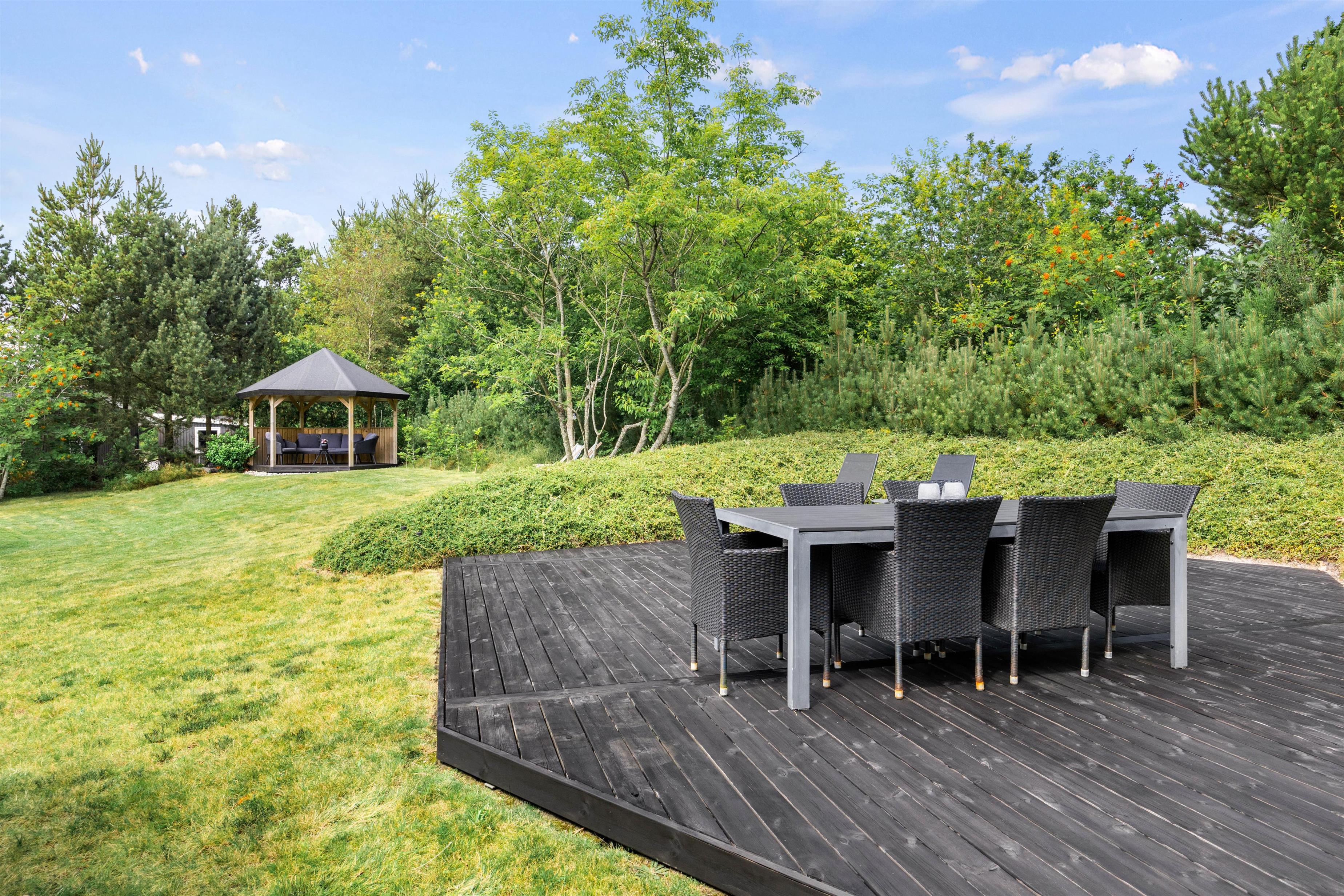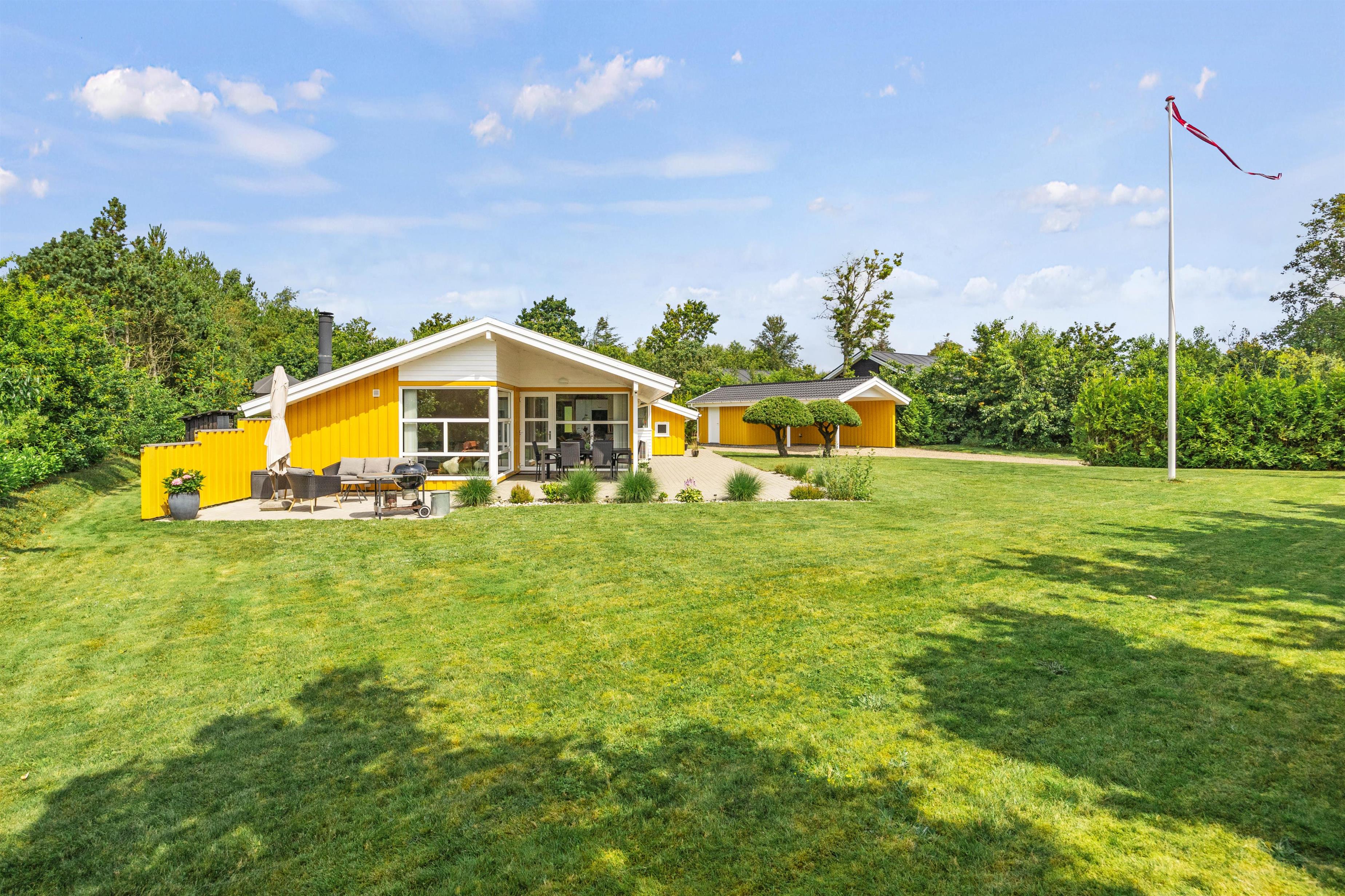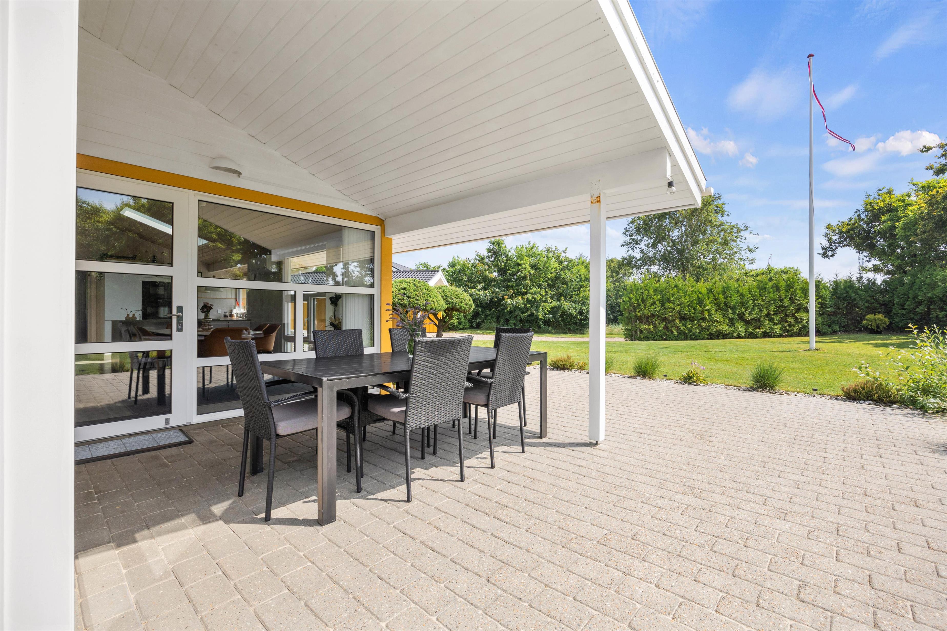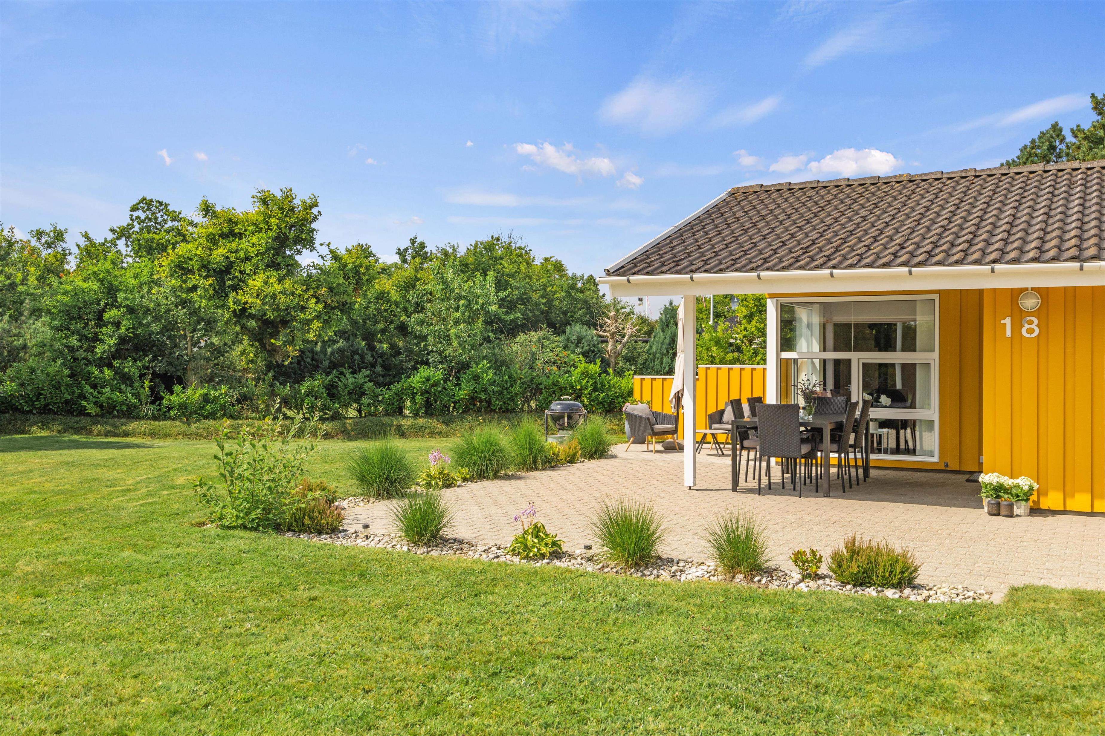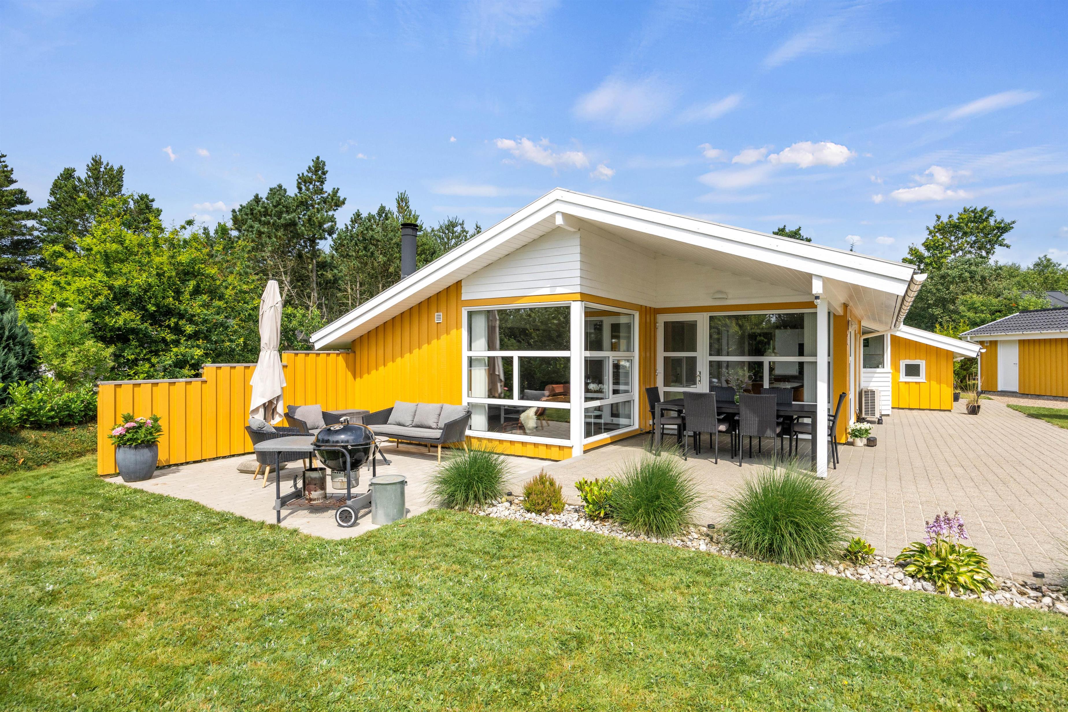 Feriehuset ligger på en stor og velplejet naturgrund. På den store afskærmede terrasse er der masser af plads og mulighed for at tanke sol, imens de små boltrer sig på græsplanen. Det overdækkede terrasseareal holder på varmen, når dagen går på hæld, beskytter for regnbyger eller for megen sol og er derfor det optimale sted for lange grillaftener.
