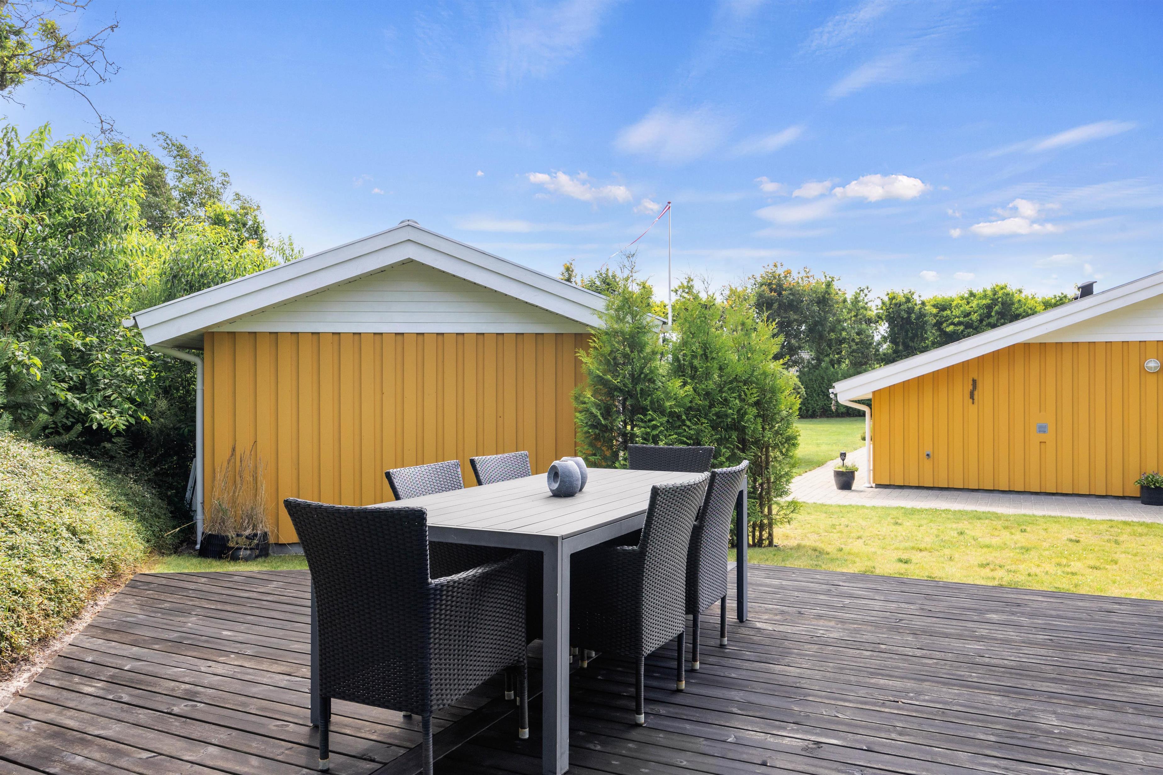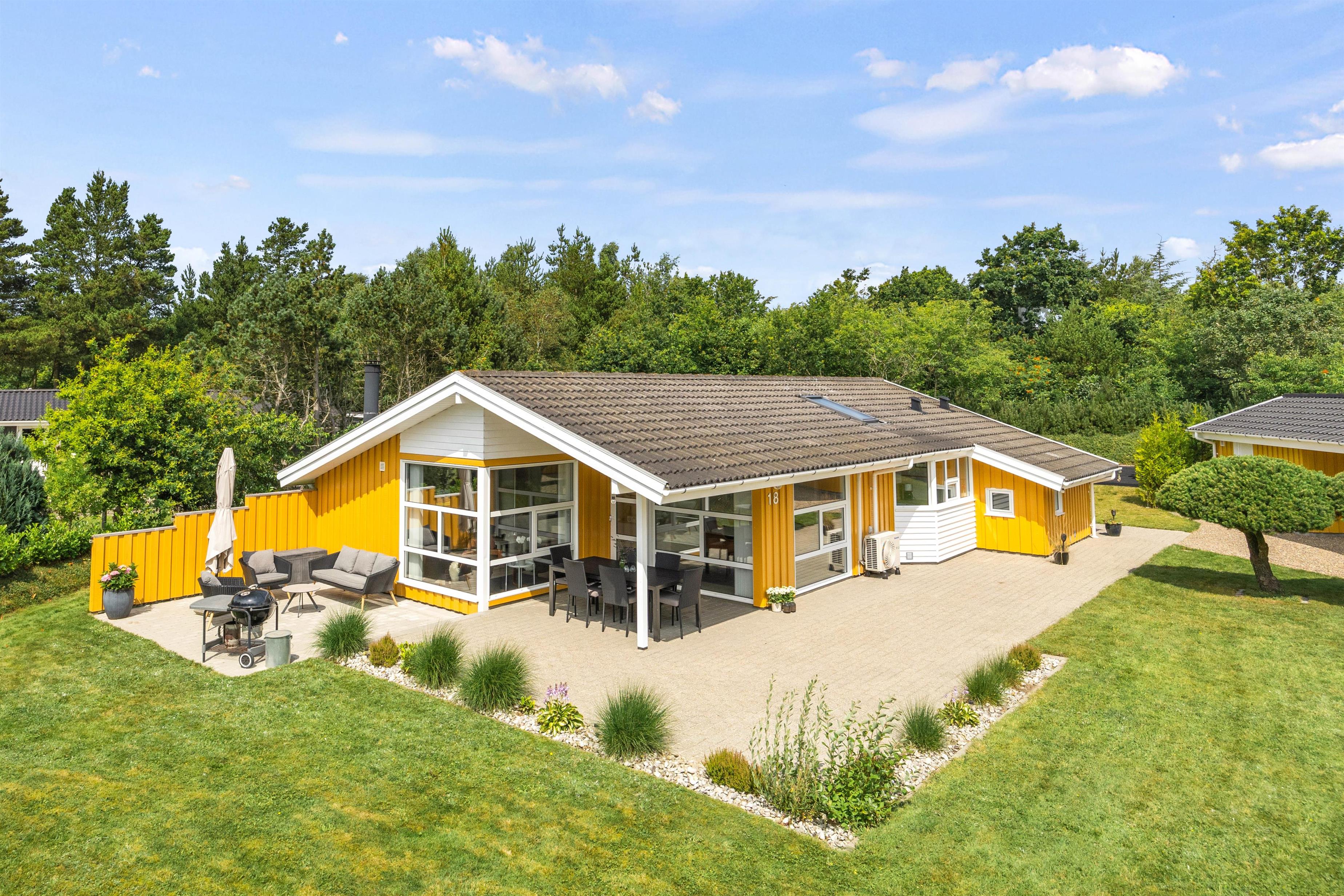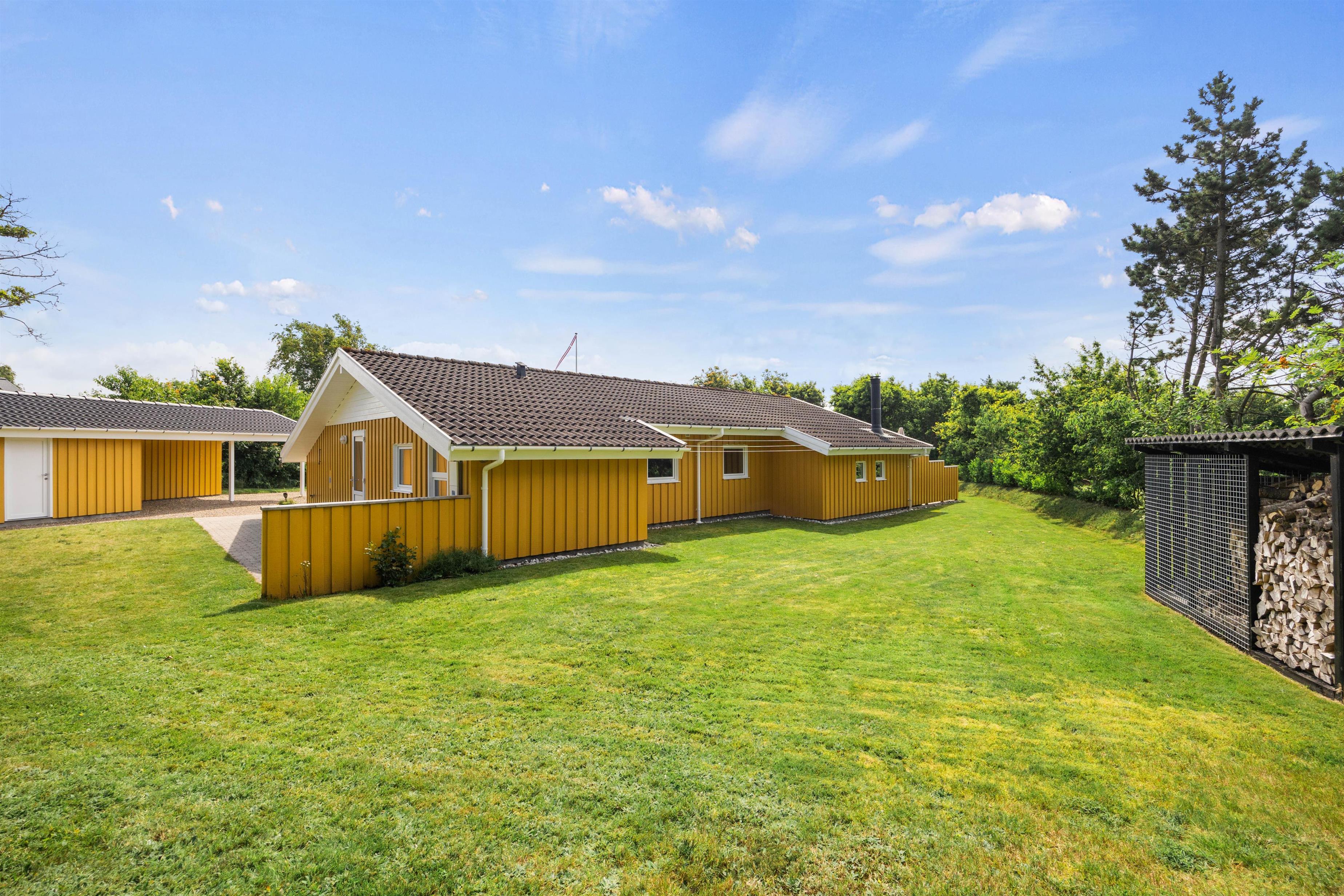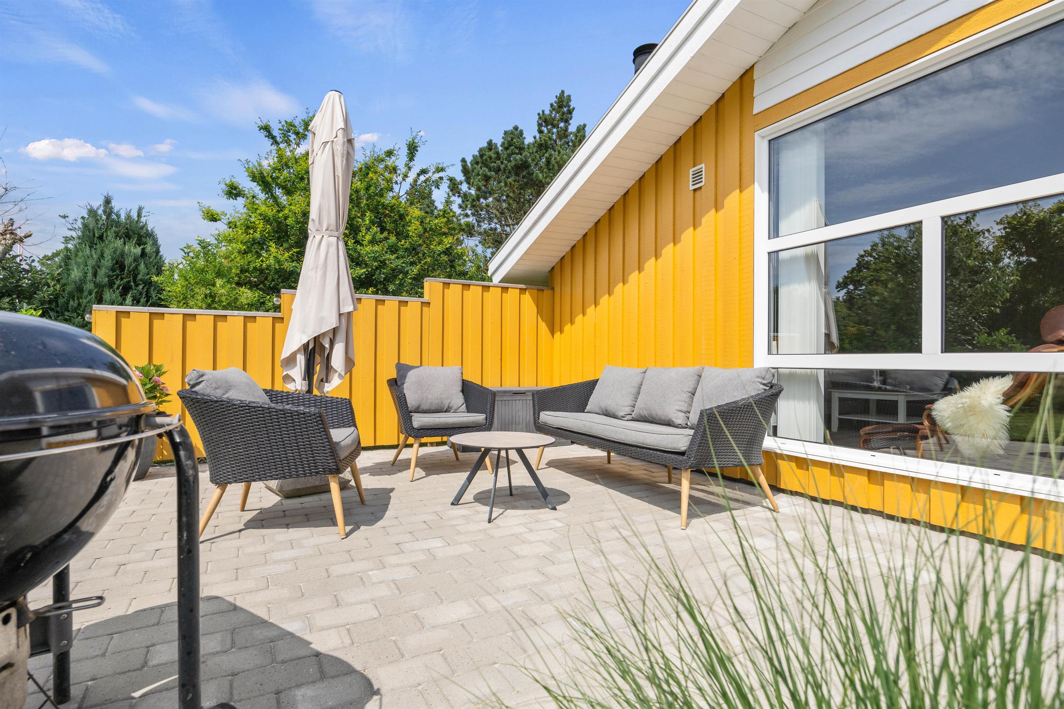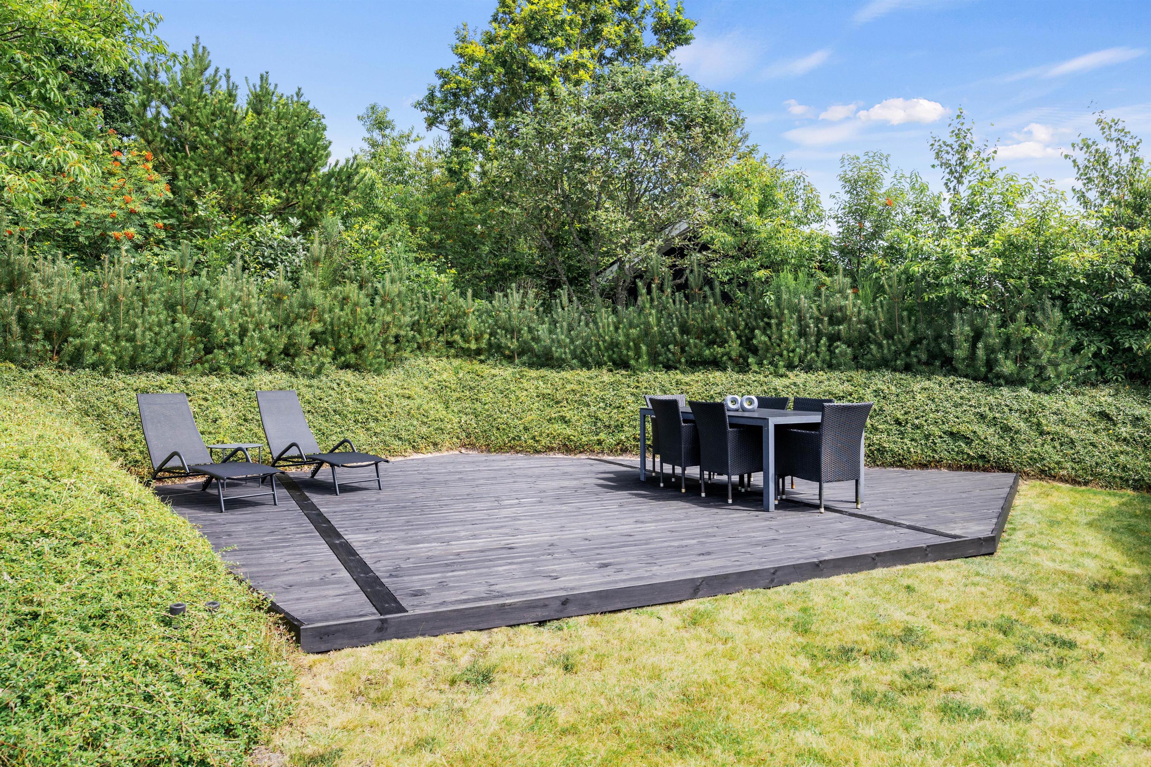 Feriehuset ligger på en stor og velplejet naturgrund. På den store afskærmede terrasse er der masser af plads og mulighed for at tanke sol, imens de små boltrer sig på græsplanen. Det overdækkede terrasseareal holder på varmen, når dagen går på hæld, beskytter for regnbyger eller for megen sol og er derfor det optimale sted for lange grillaftener.