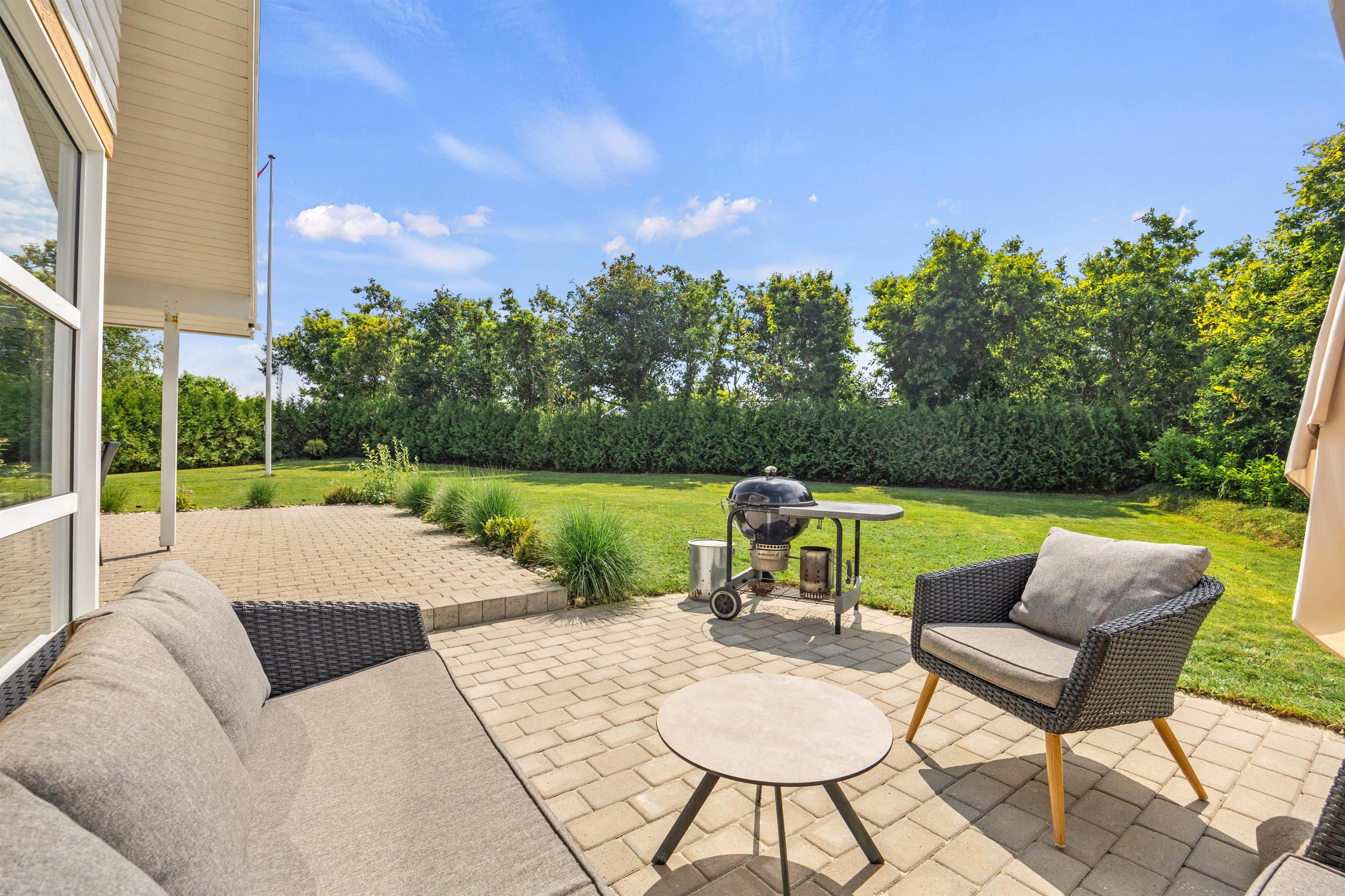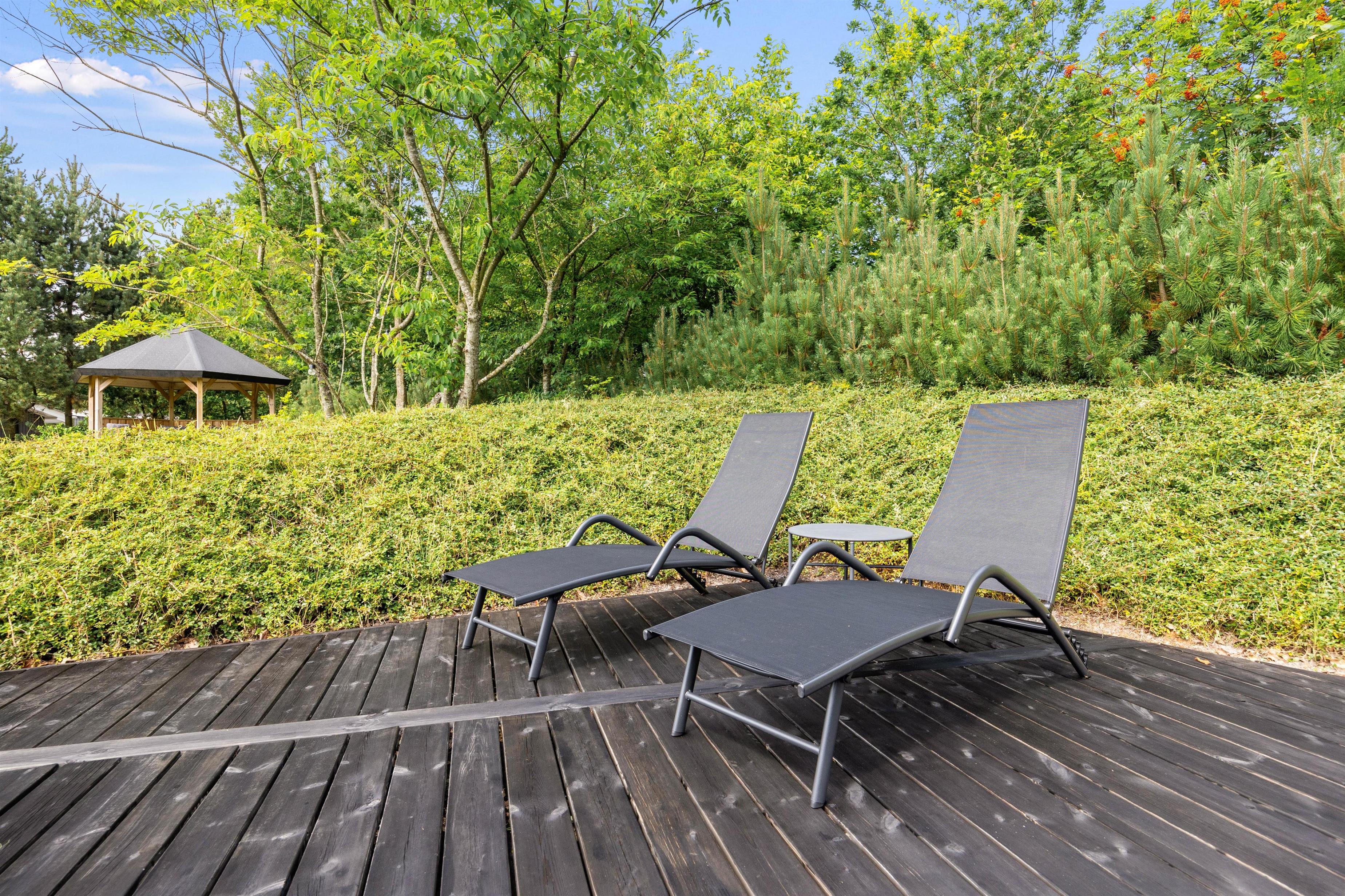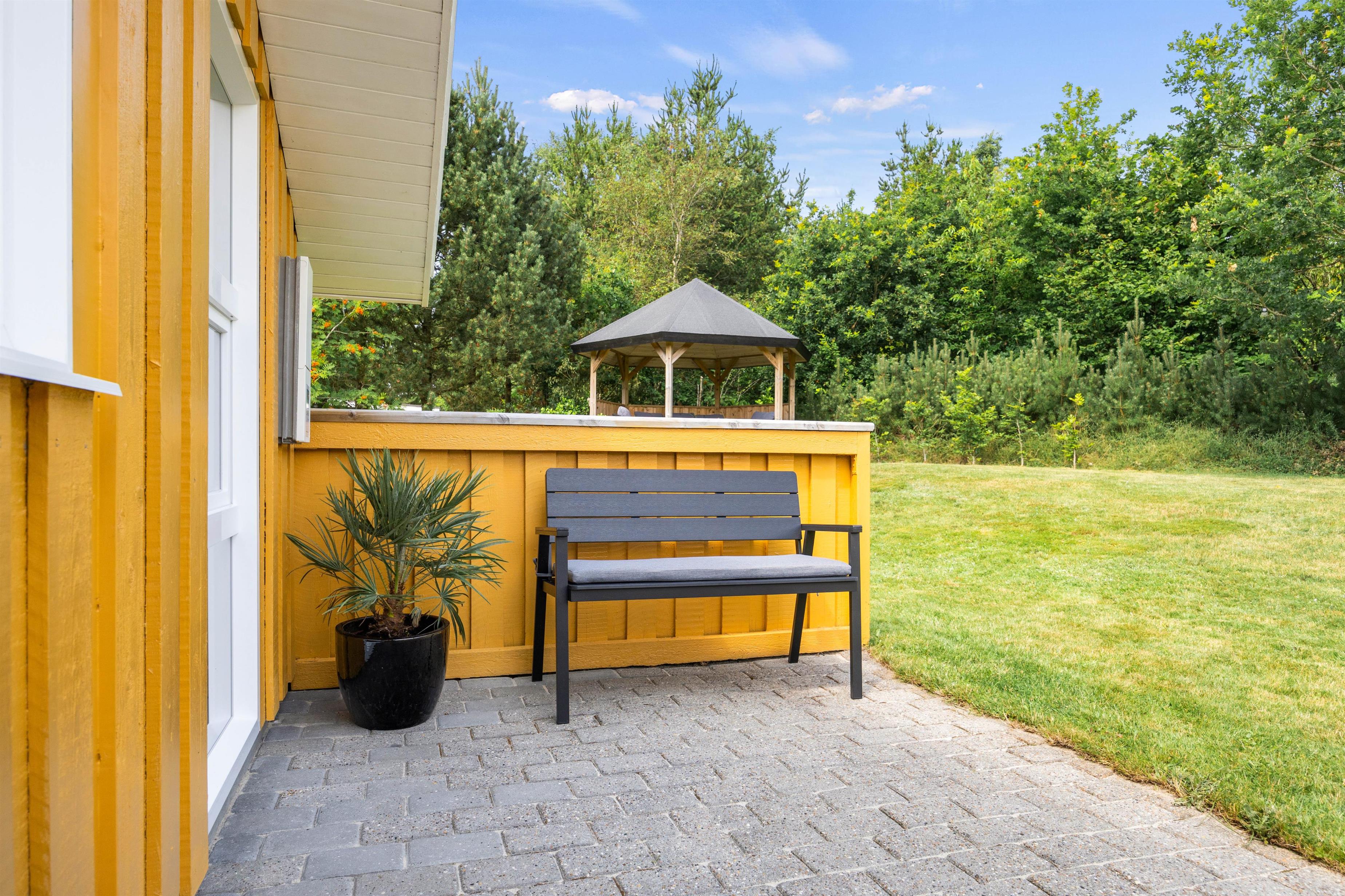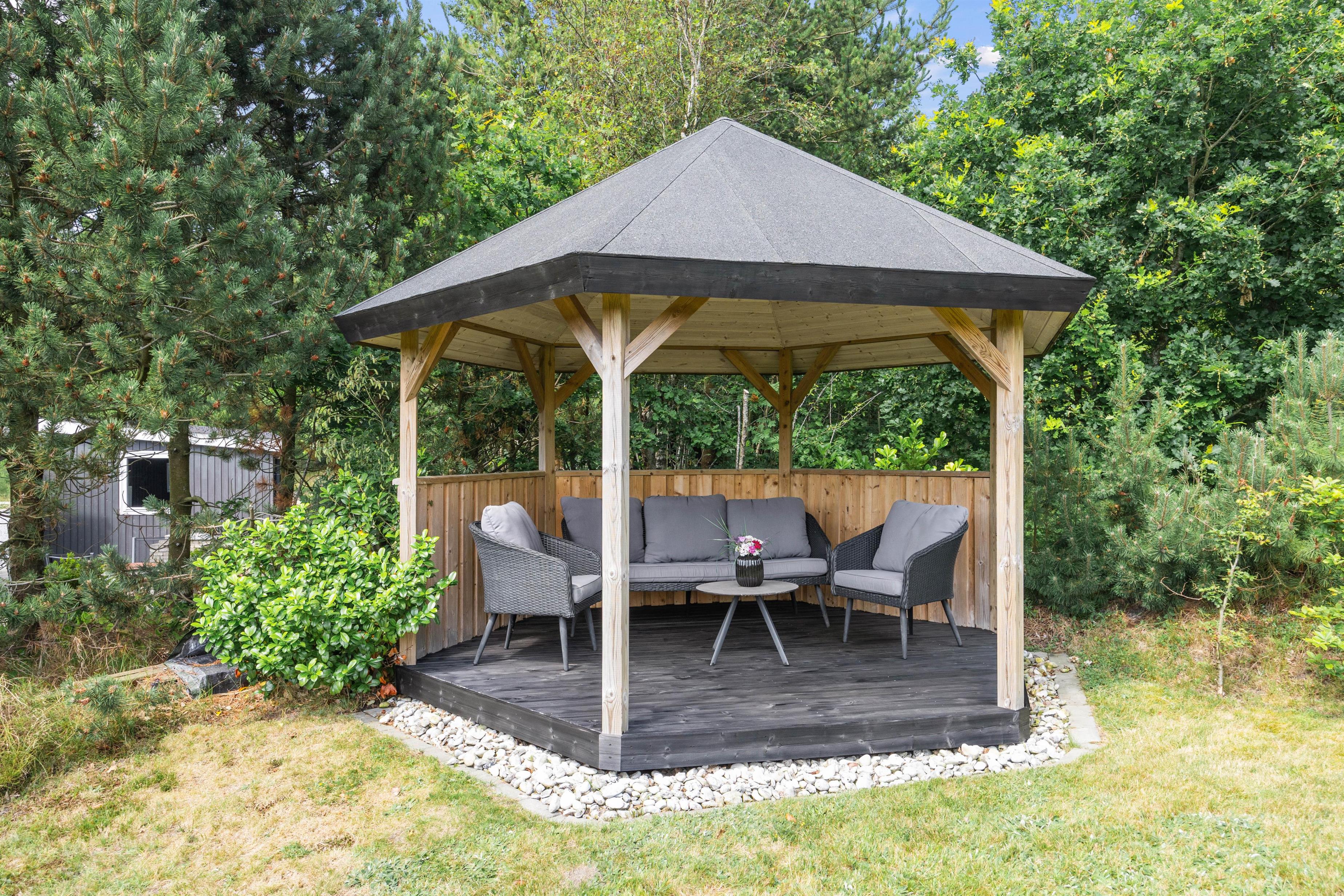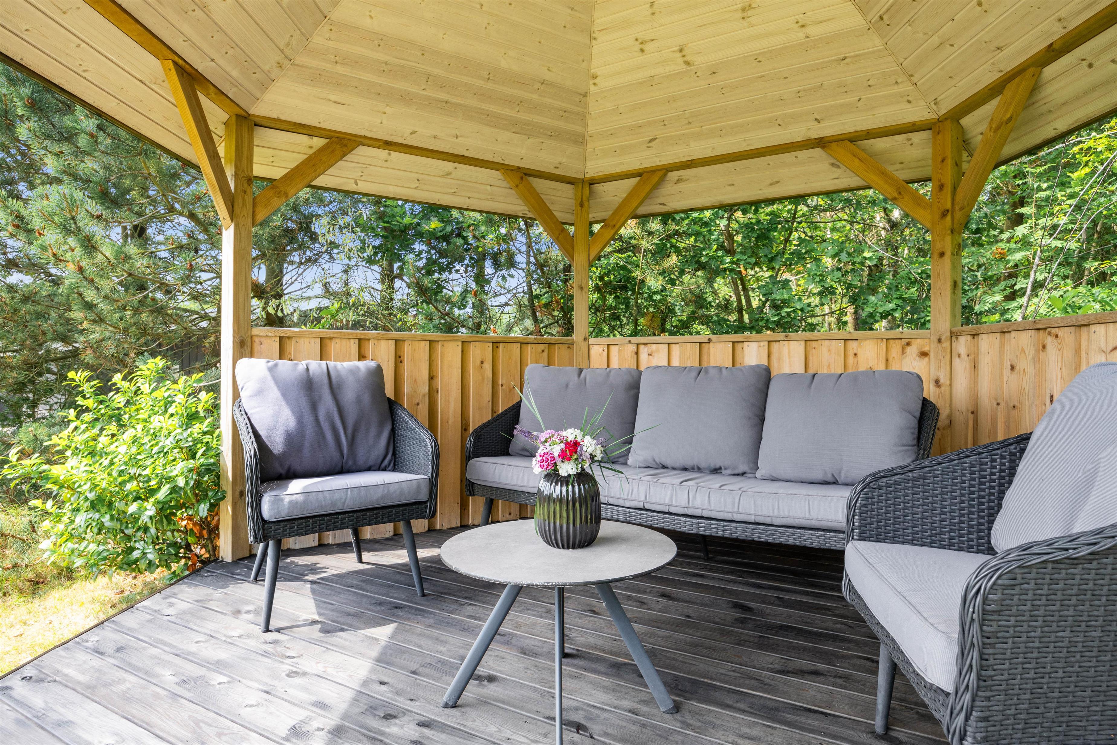 Feriehuset ligger på en stor og velplejet naturgrund. På den store afskærmede terrasse er der masser af plads og mulighed for at tanke sol, imens de små boltrer sig på græsplanen. Det overdækkede terrasseareal holder på varmen, når dagen går på hæld, beskytter for regnbyger eller for megen sol og er derfor det optimale sted for lange grillaftener.