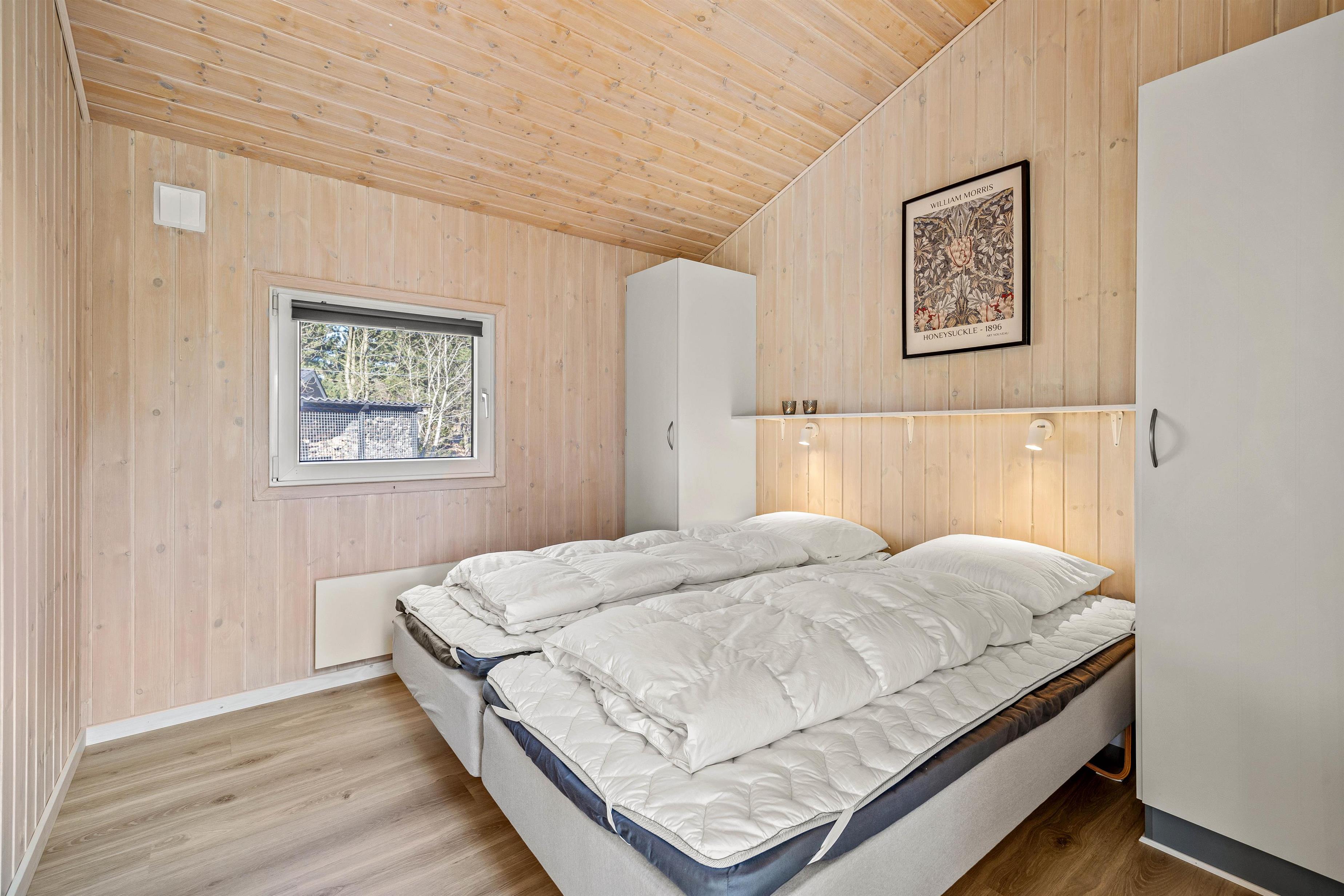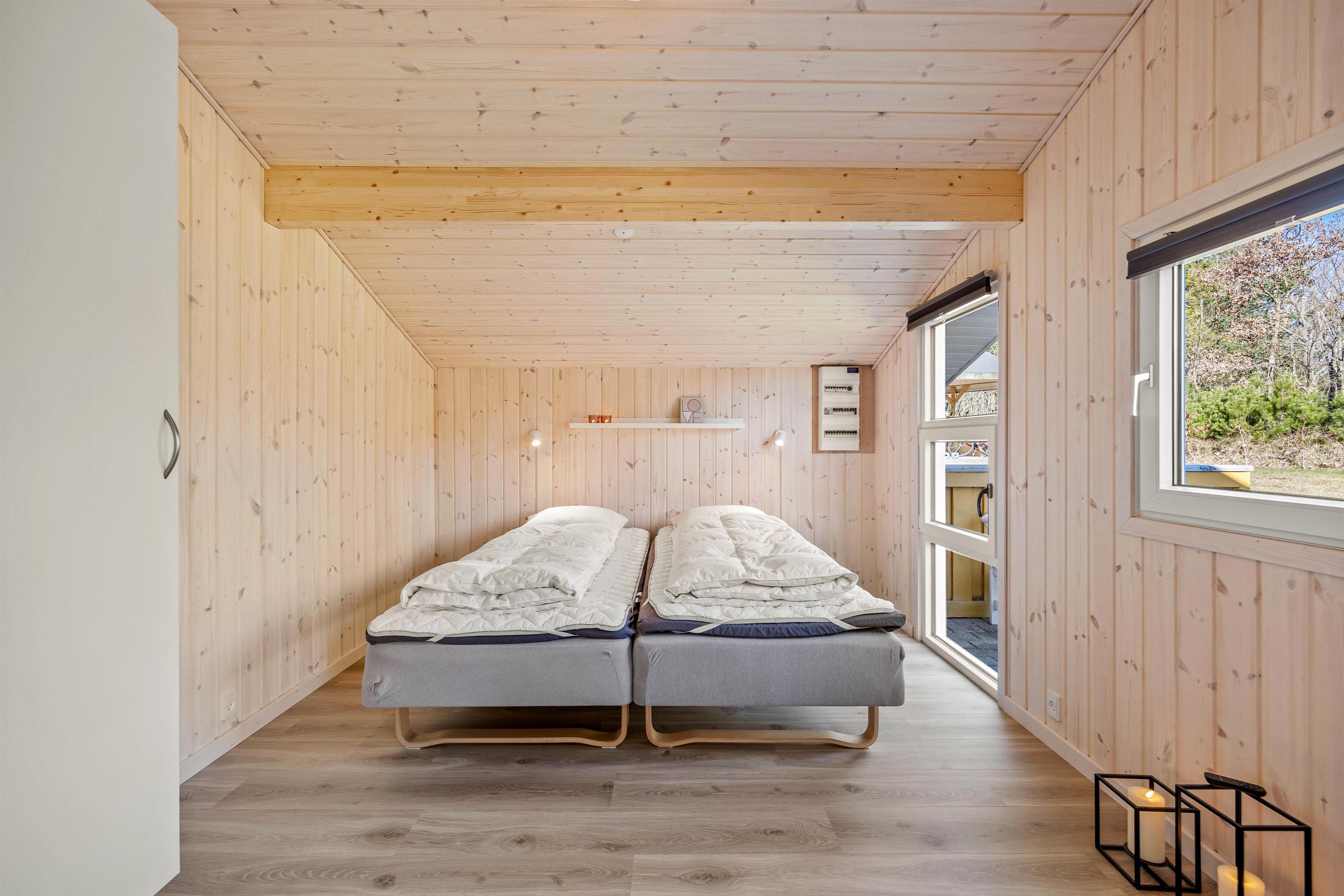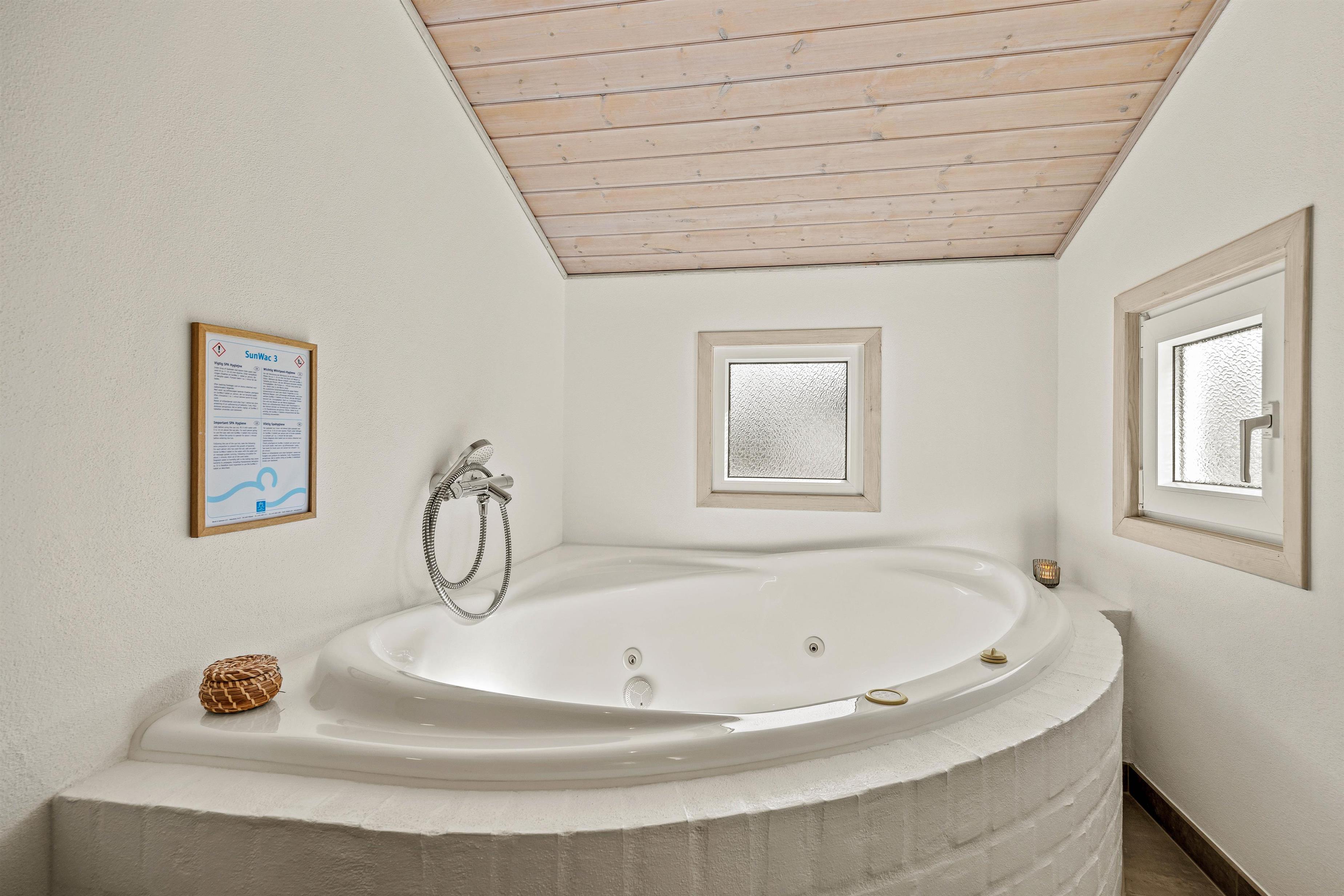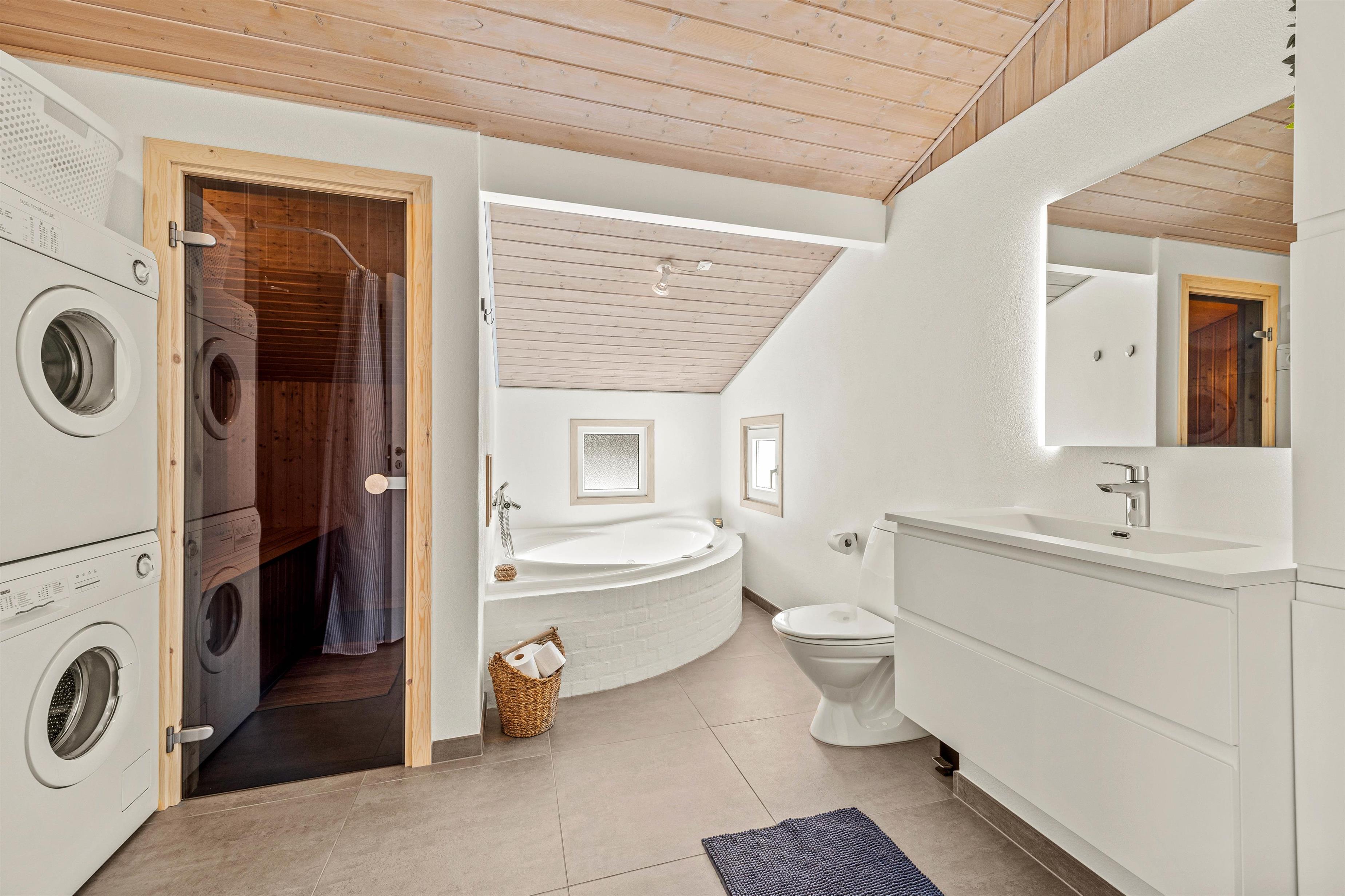 På Thomas Jensens Vej 18 er der rigelig mulighed for en afslappende ferietid for op til 6 personer. Her har I både et gæste-wc og et stort lækkert wellness-badeværelse med gulvvarme, vaskemaskine og tørretumbler. Fyld spaen og nyd en stund i det varme sprudlende vand, eller tænd op i saunaen og bliv varmet godt igennem, inden I får en god nats søvn i en af de brede senge: her er 2 dobbeltsenge (2x90x200) og 2 enkeltsenge at vælge imellem.