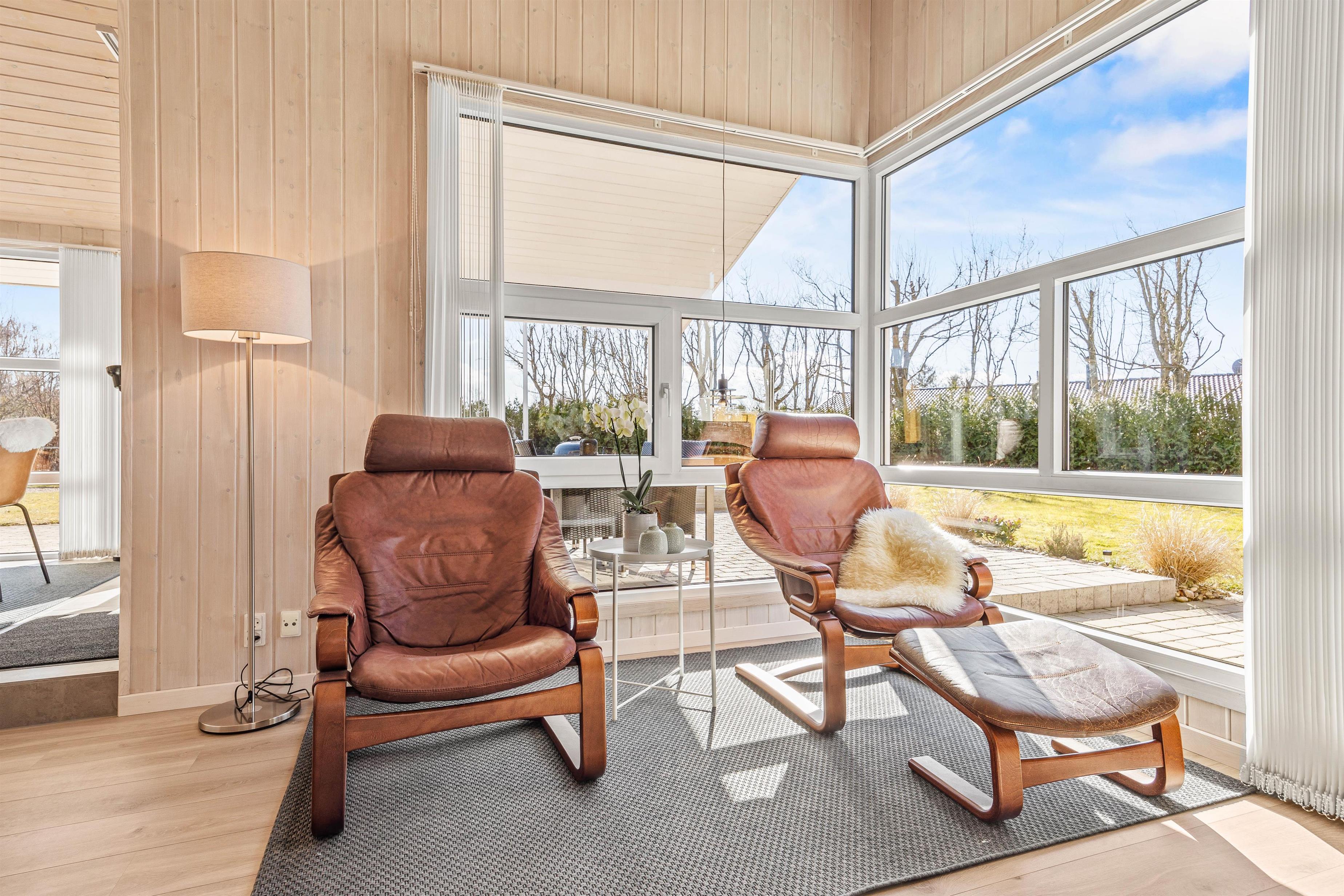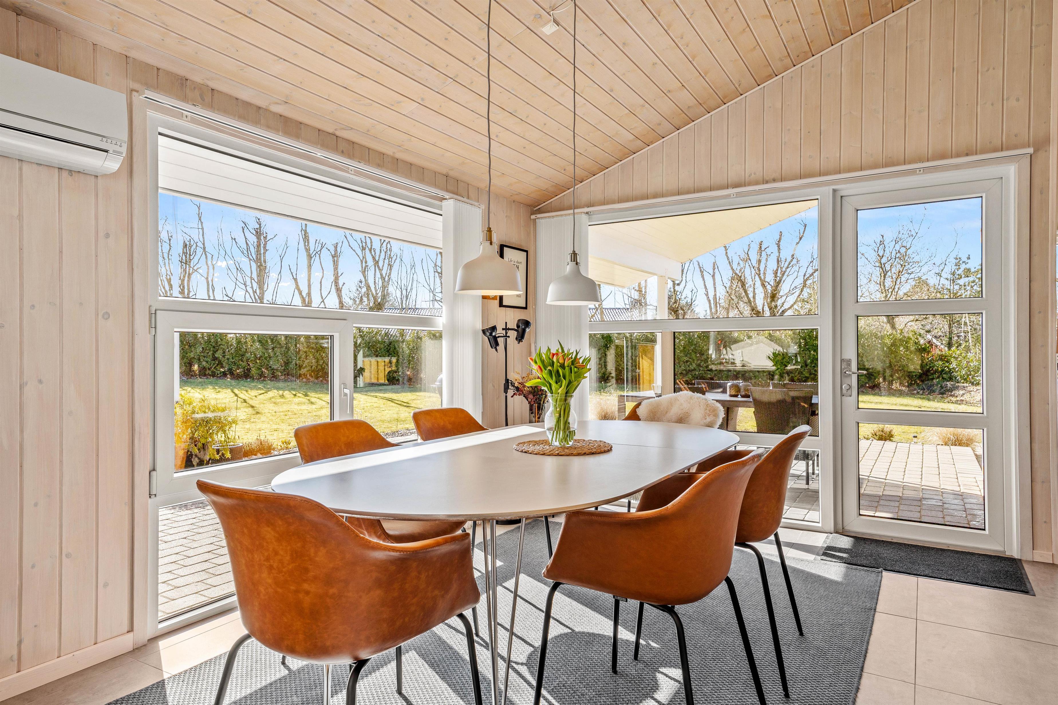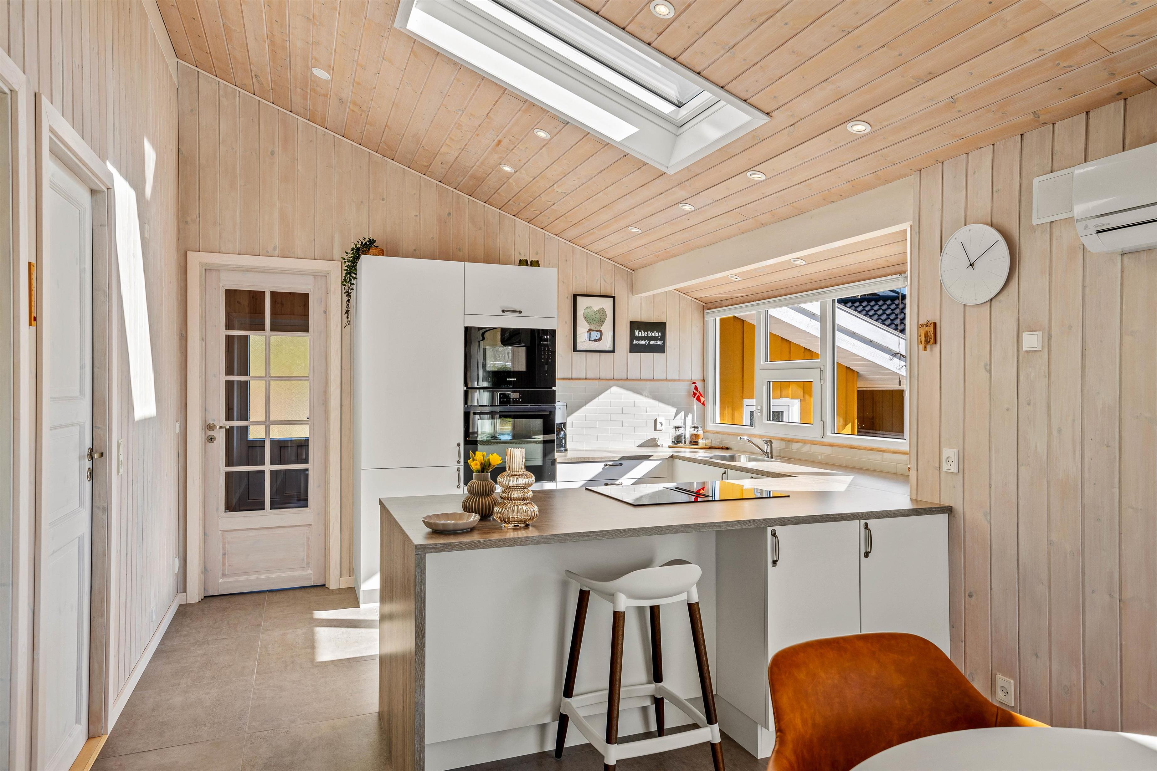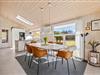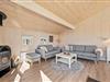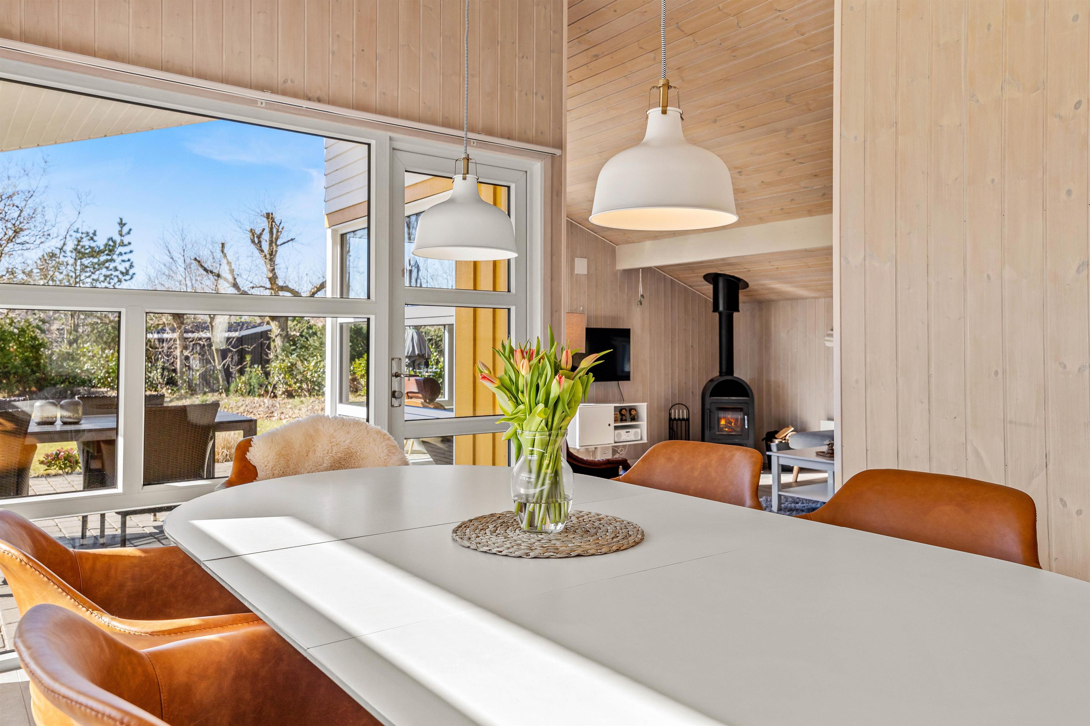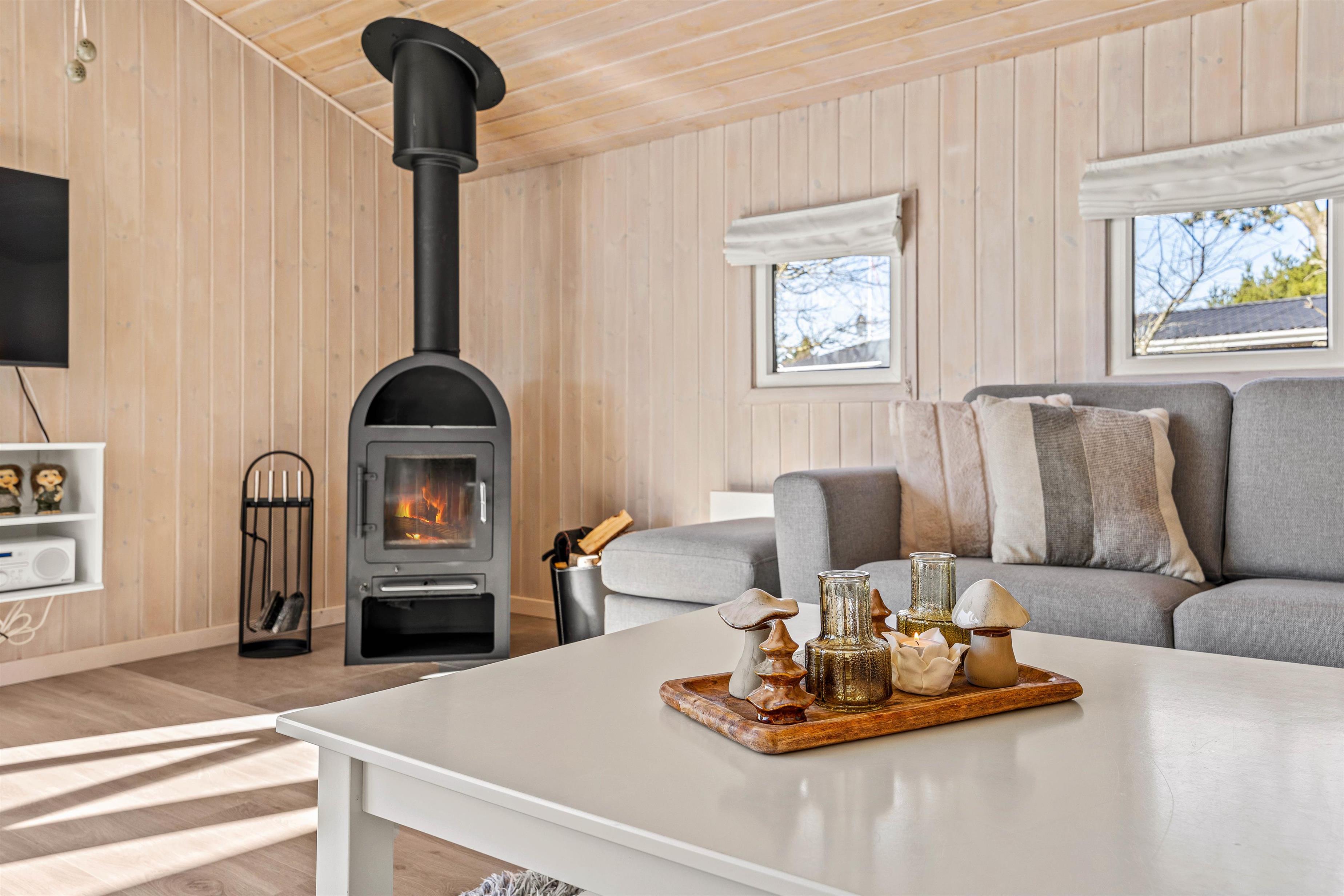 Dette feriehus er indrettet med stil og personlighed og med alle vigtige elementer til en skøn ferie, og bliver I straks mødt af en lys og moderne indretning. I stuen er der masser af gode siddemuligheder – her er både lækre lænestole, placeret optimalt for lysindfald og med læselamper for bogormene eller strikketanterne, samt bekvemme sofaer med fodstøtte. Her kan I efter en lang dag med masser af frisk vesterhavsluft samles til snak og hygge foran brændeovnen eller bare slænge ud foran fjernsynet. Det åbne køkken med spisebord og bekvemme stole indbyder til hyggelige stunder med fælles madlavning og samvær omkring spisebordet.