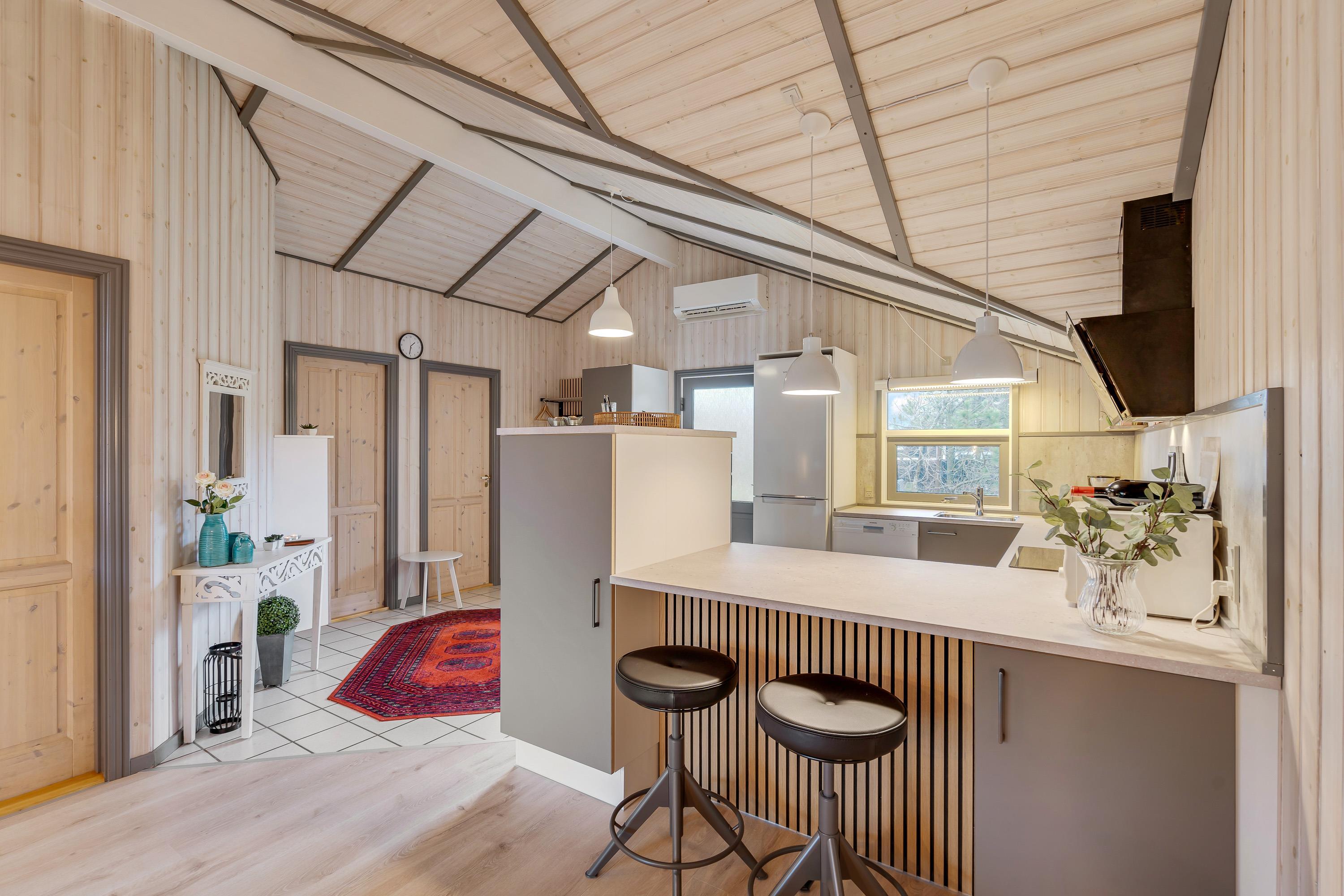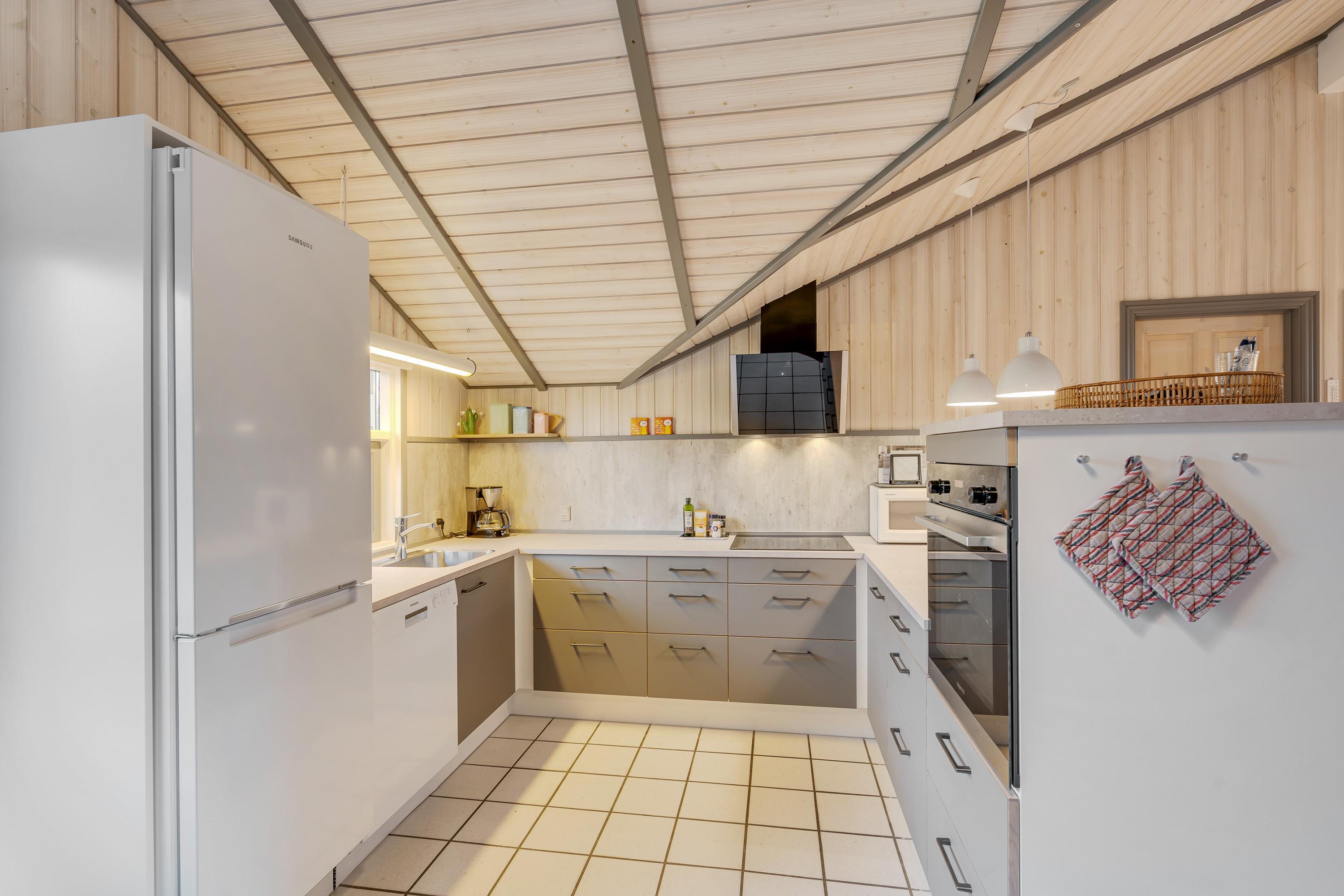 Det åbne køkken, som er renoveret i januar 2022, er veludstyret med opvaskemaskine, stort køle/fryseskab, ovn mv., og er ideelt til hygge omkring fælles madlavning. Køkken og stue befinder sig i det samme åbne rum, og det er med til at skabe en åben atmosfære, hvor hele familien kan samles ét sted, og hvor der er god plads til alle.