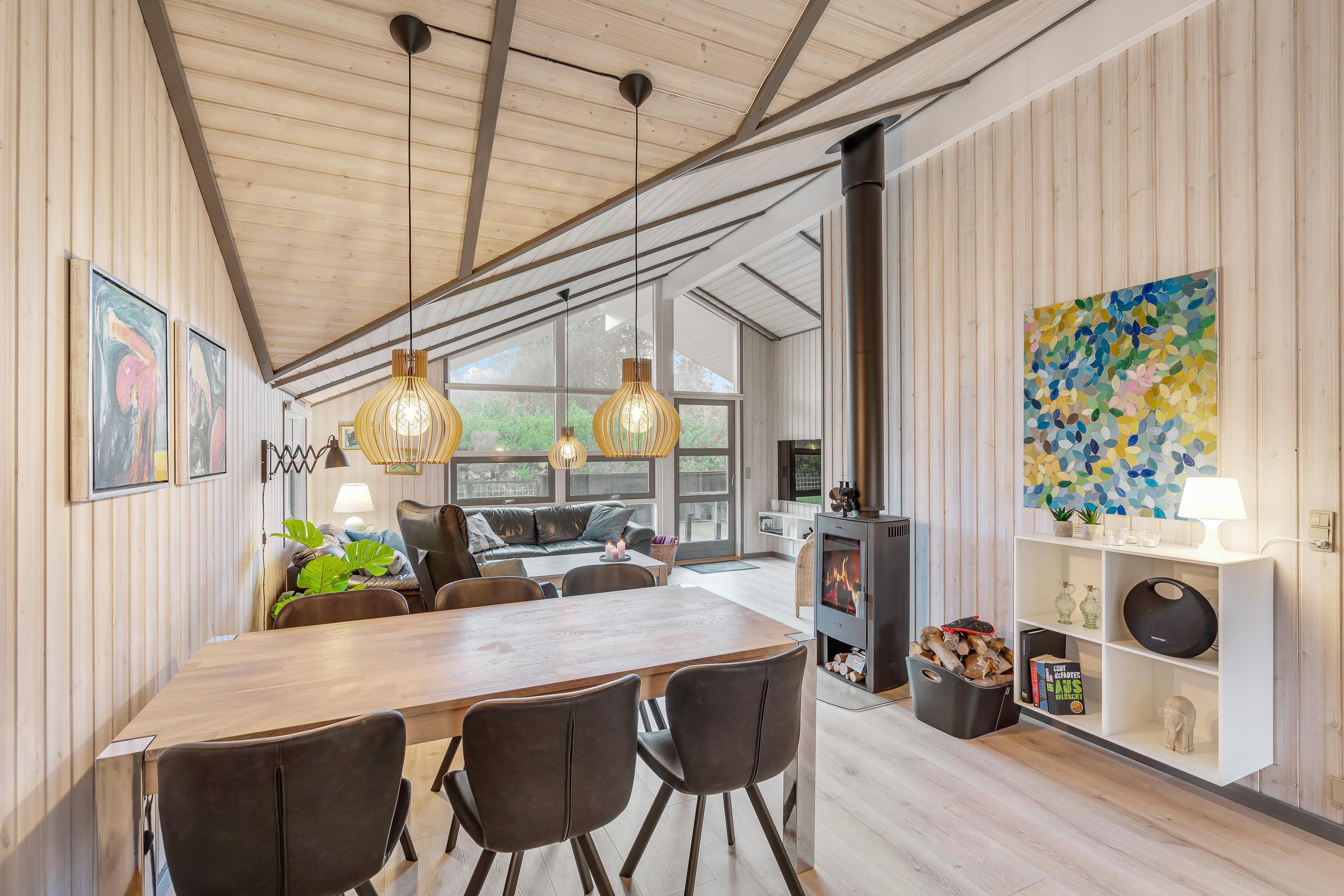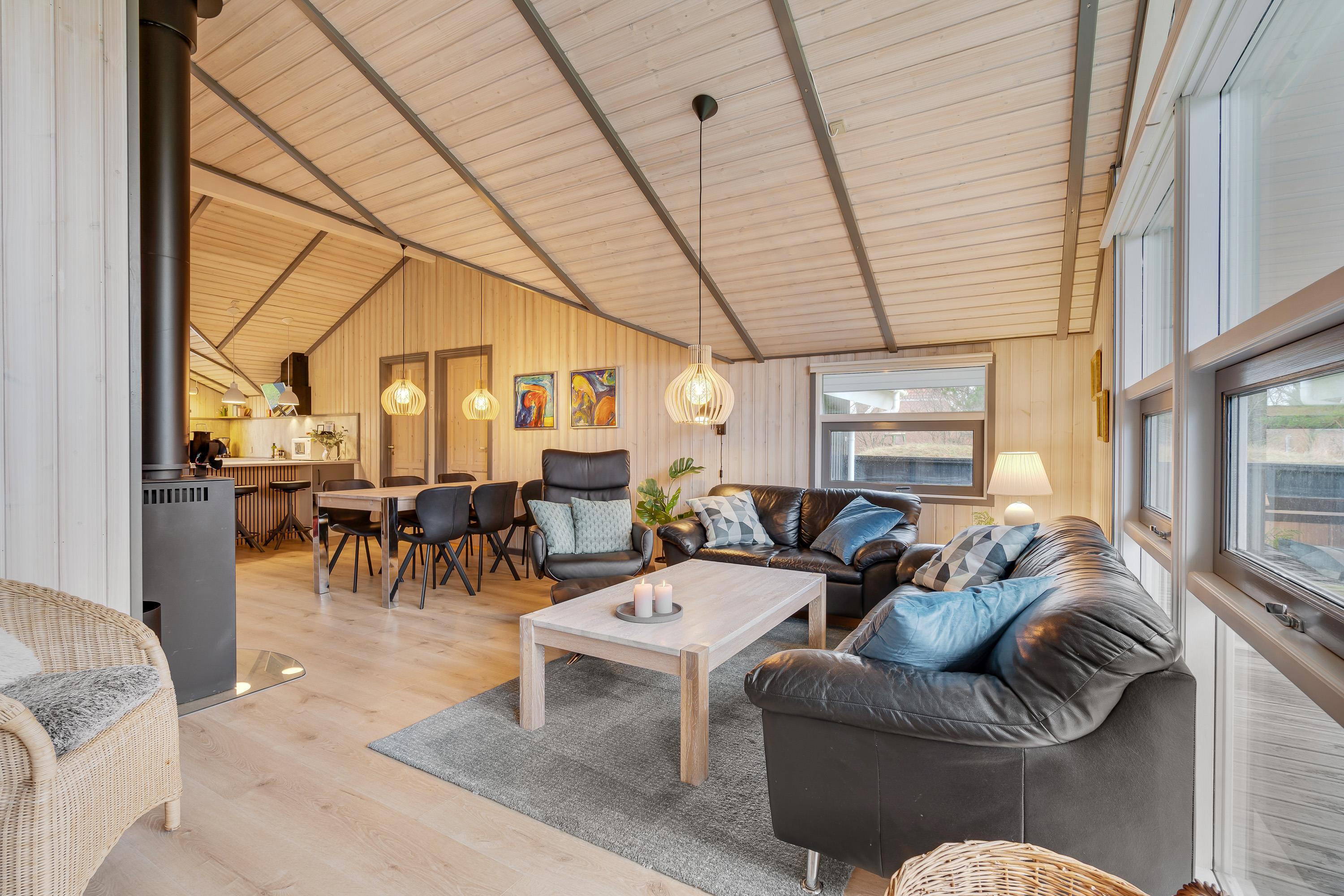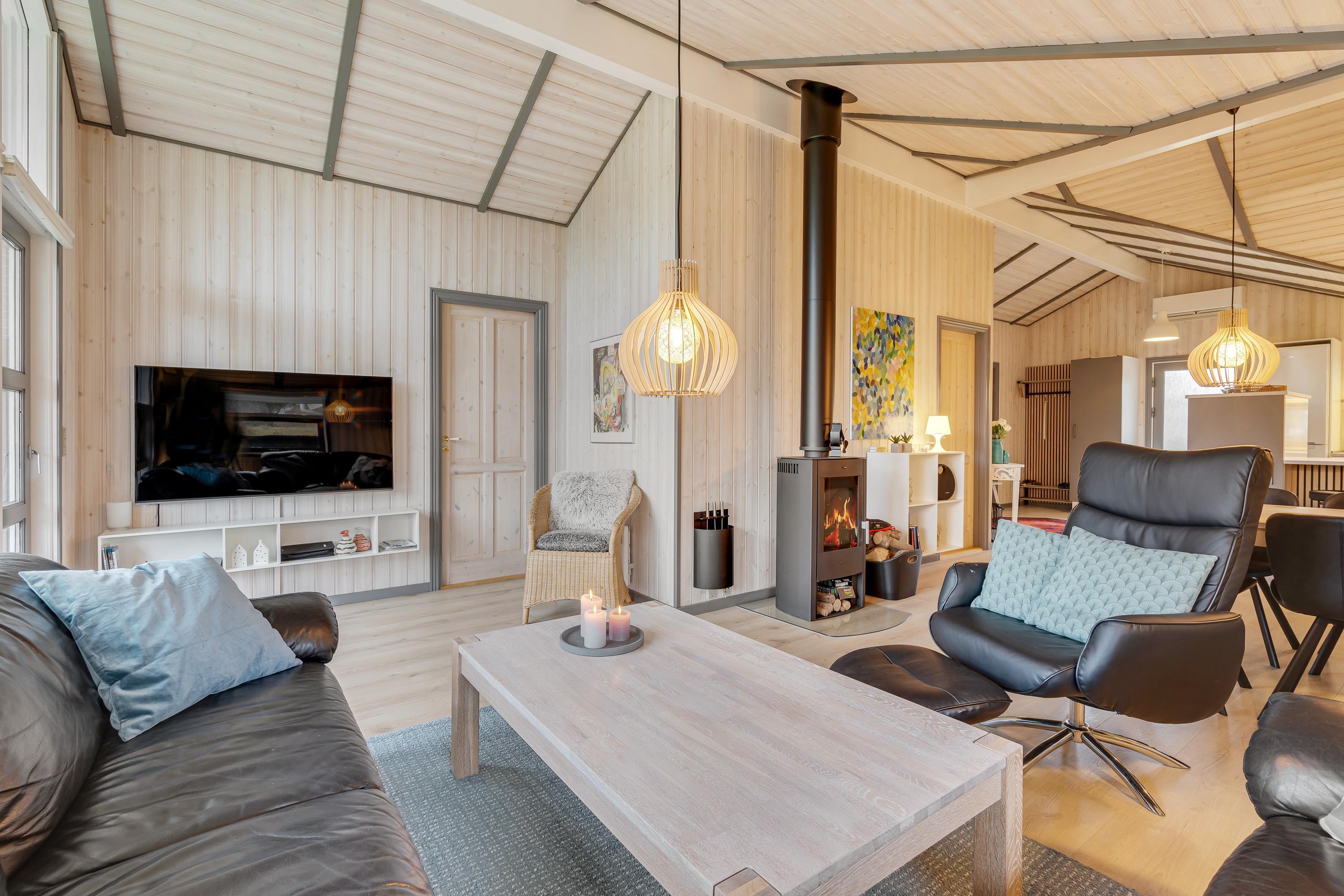 Hyg jer ved brændeovnsilden i opholdsstuens store sofahjørne med en bog eller en god film – eller få jeres bedste feriefotos uploadet til Facebook – I har gratis internetforbindelse i feriehuset.