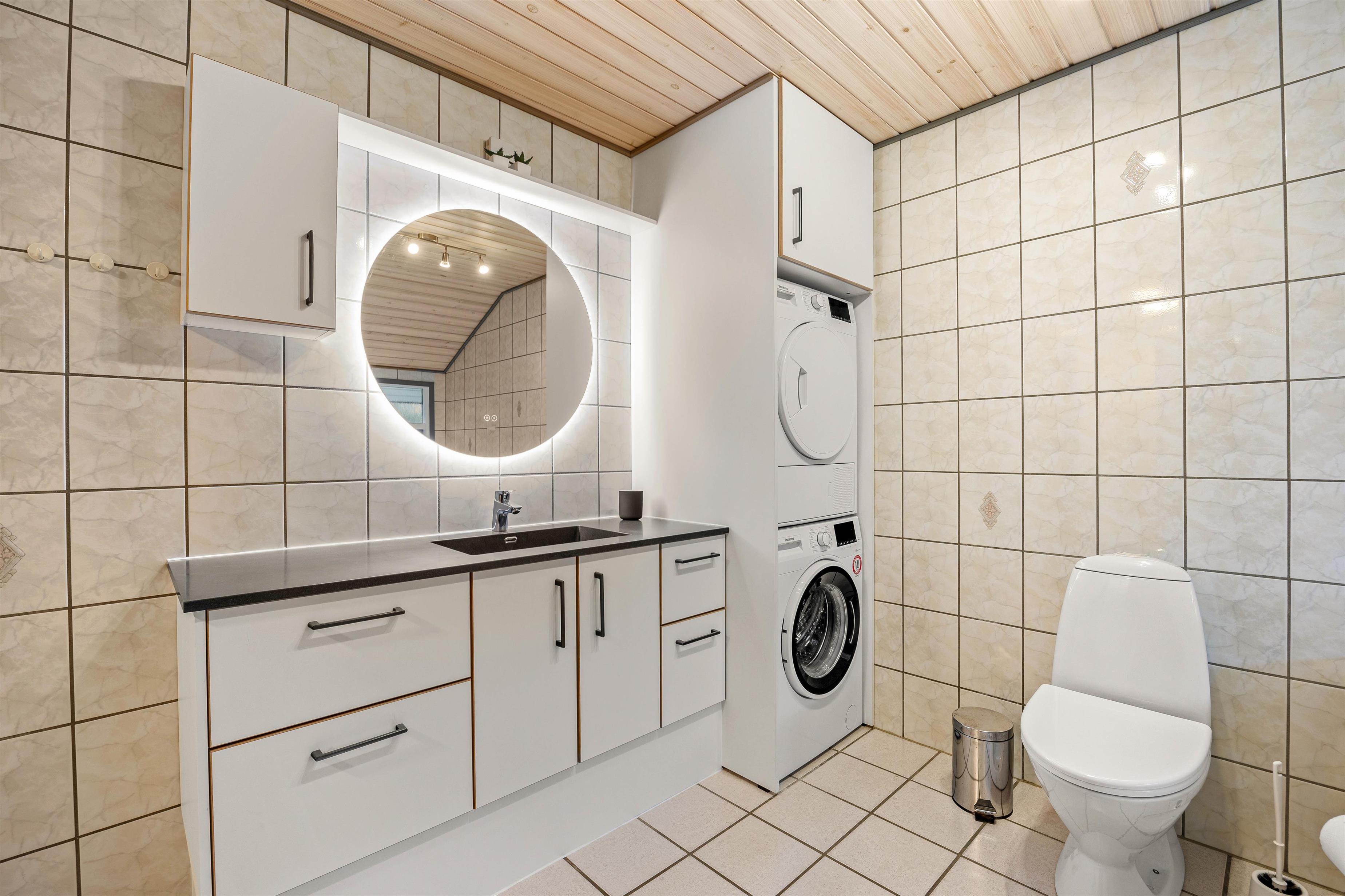 Feriehusets badeværelse og gæstetoilet er begge med gulvvarme, og en vaskemaskine og tørretumbler gør ferien ekstra afslappet.
