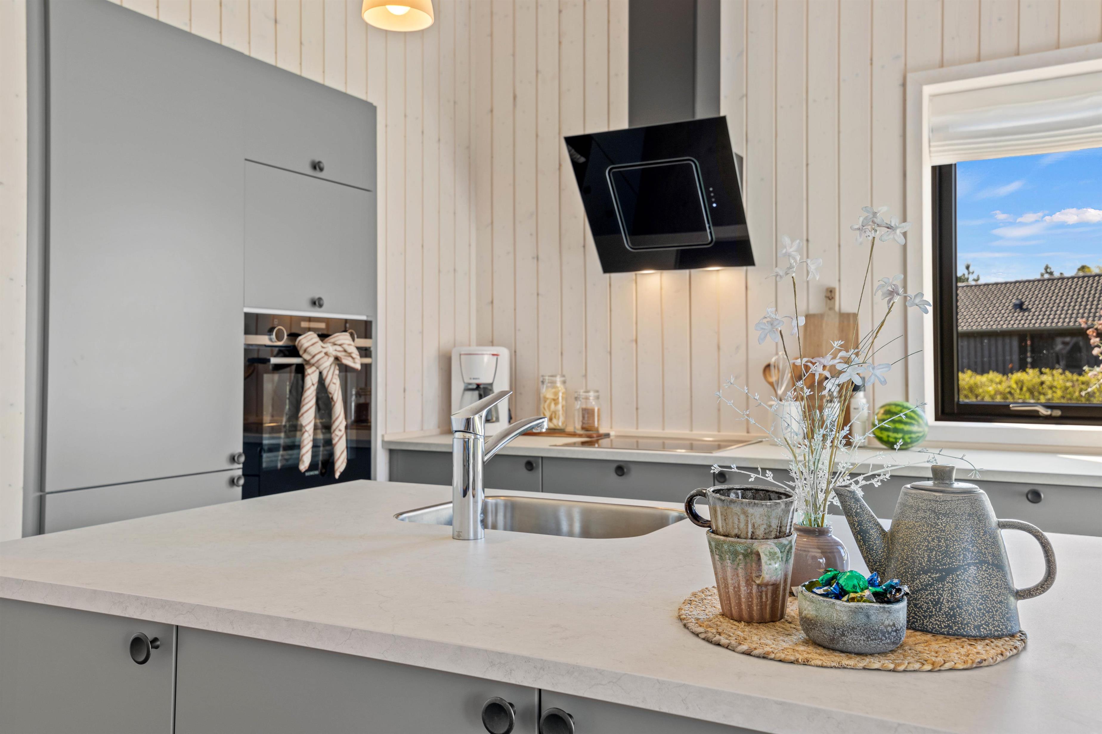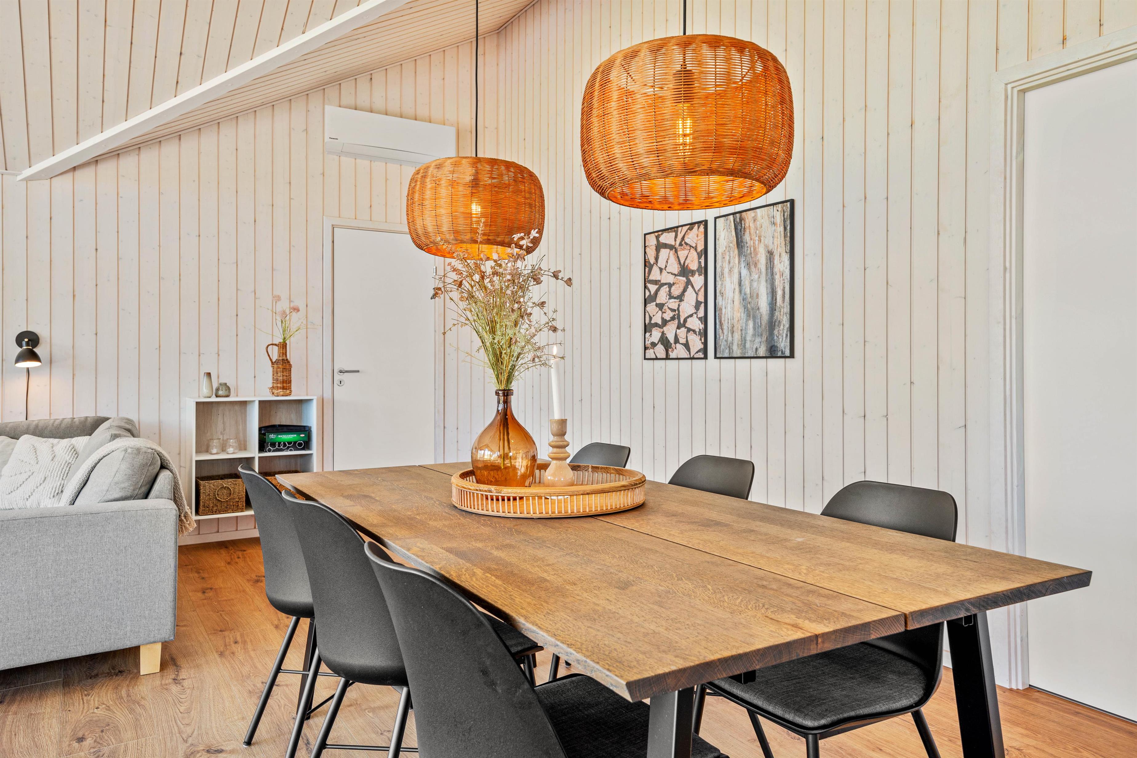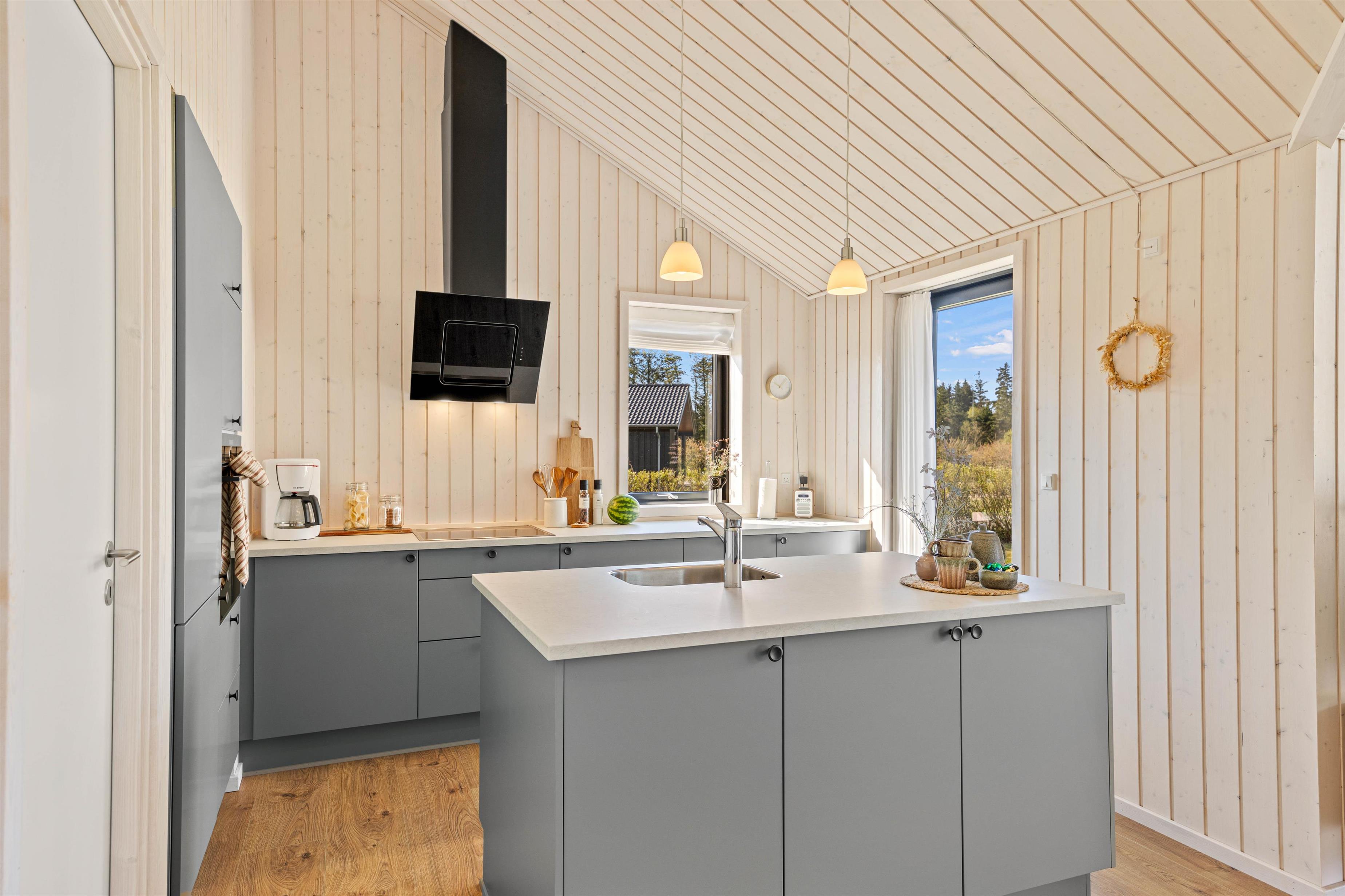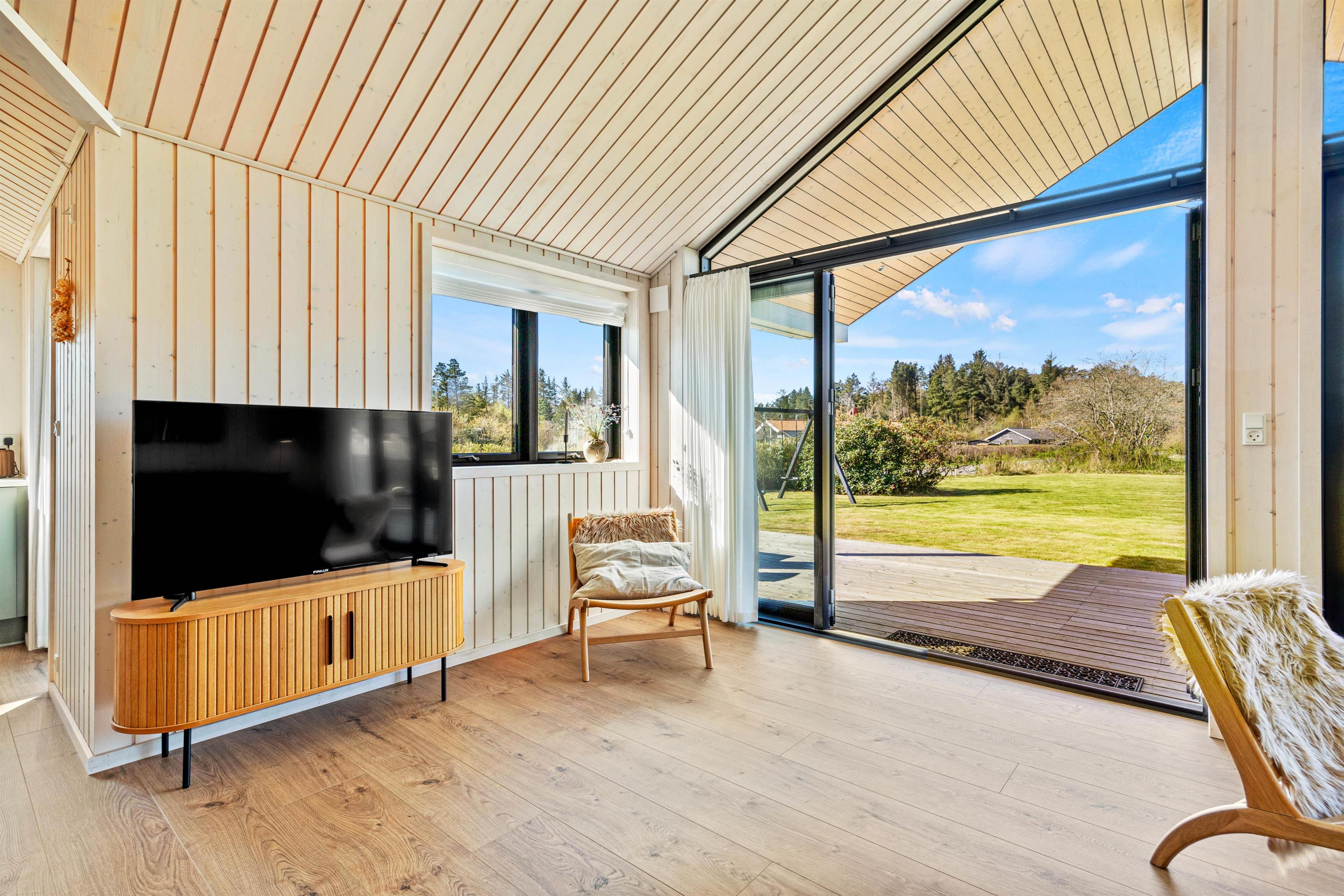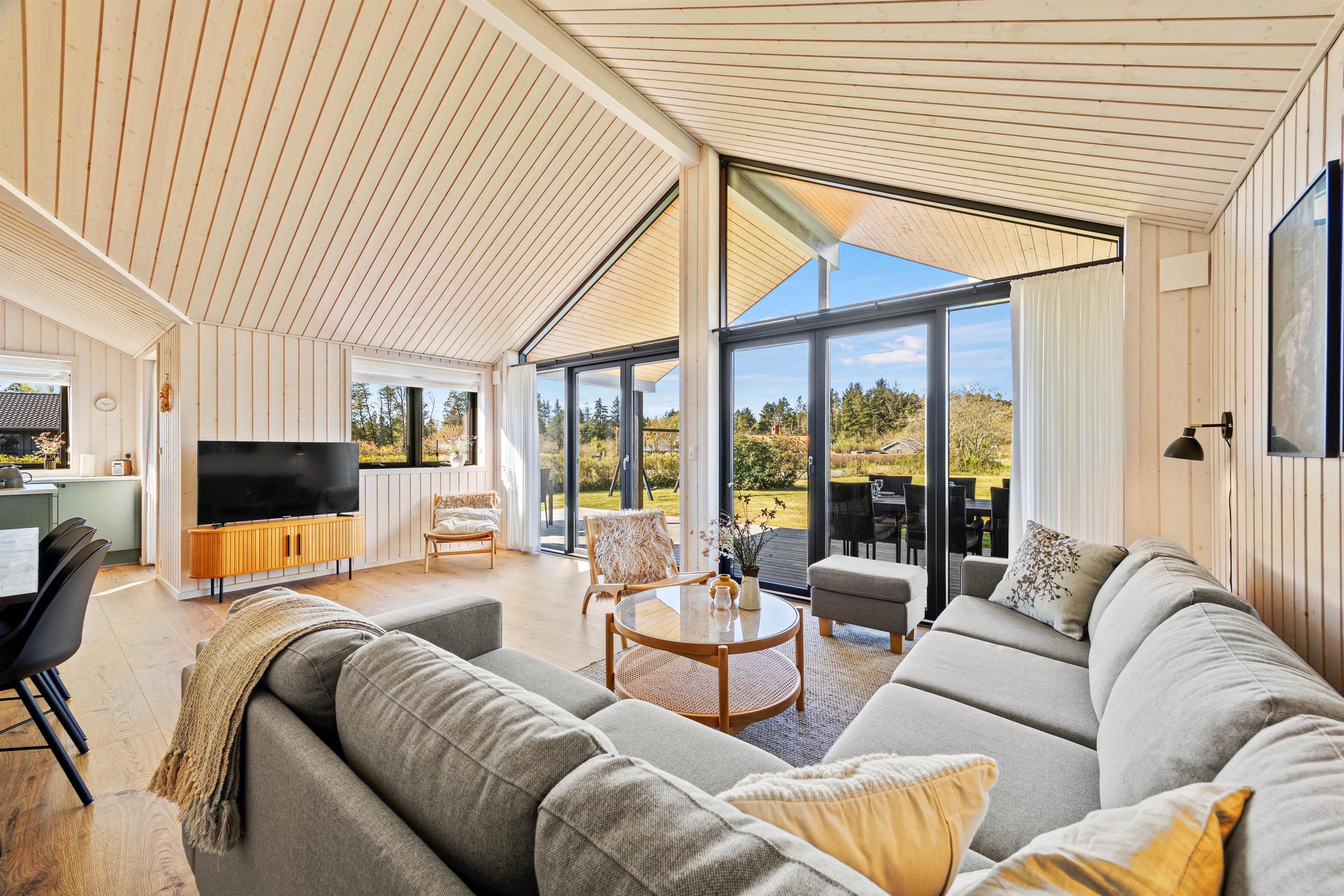 Det lyse og åbne alrum danner rammen om jeres ferie – her er køkken, spiseplads og opholdsområde samlet i ét indbydende rum, hvor I kan nyde feriedagene sammen. I stuen kan I slappe af i komfortable møbler, mens de store vinduespartier lader dagslyset strømme ind og skaber en behagelig atmosfære. Varmepumpen sørger for et stabilt og behageligt indeklima året rundt.