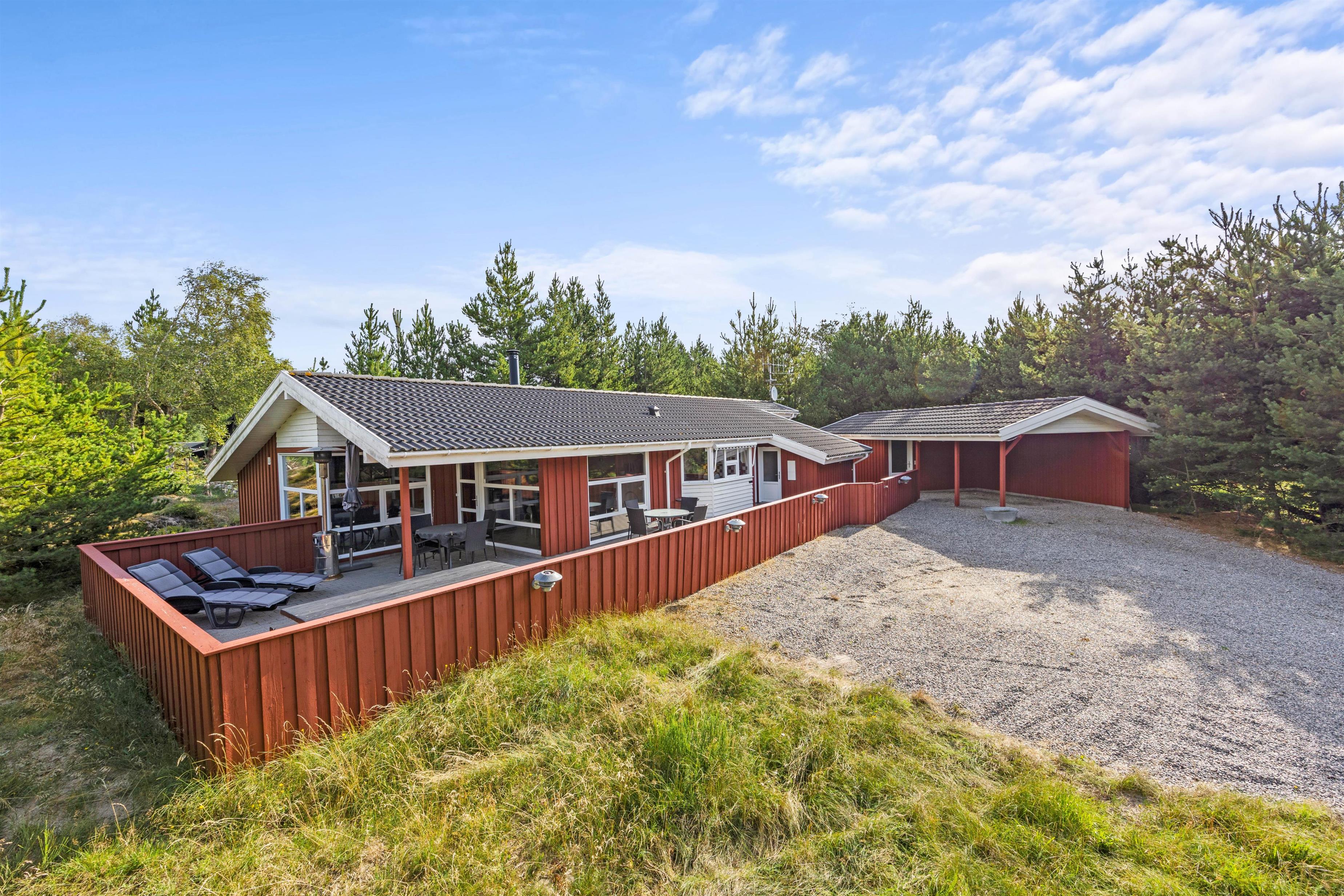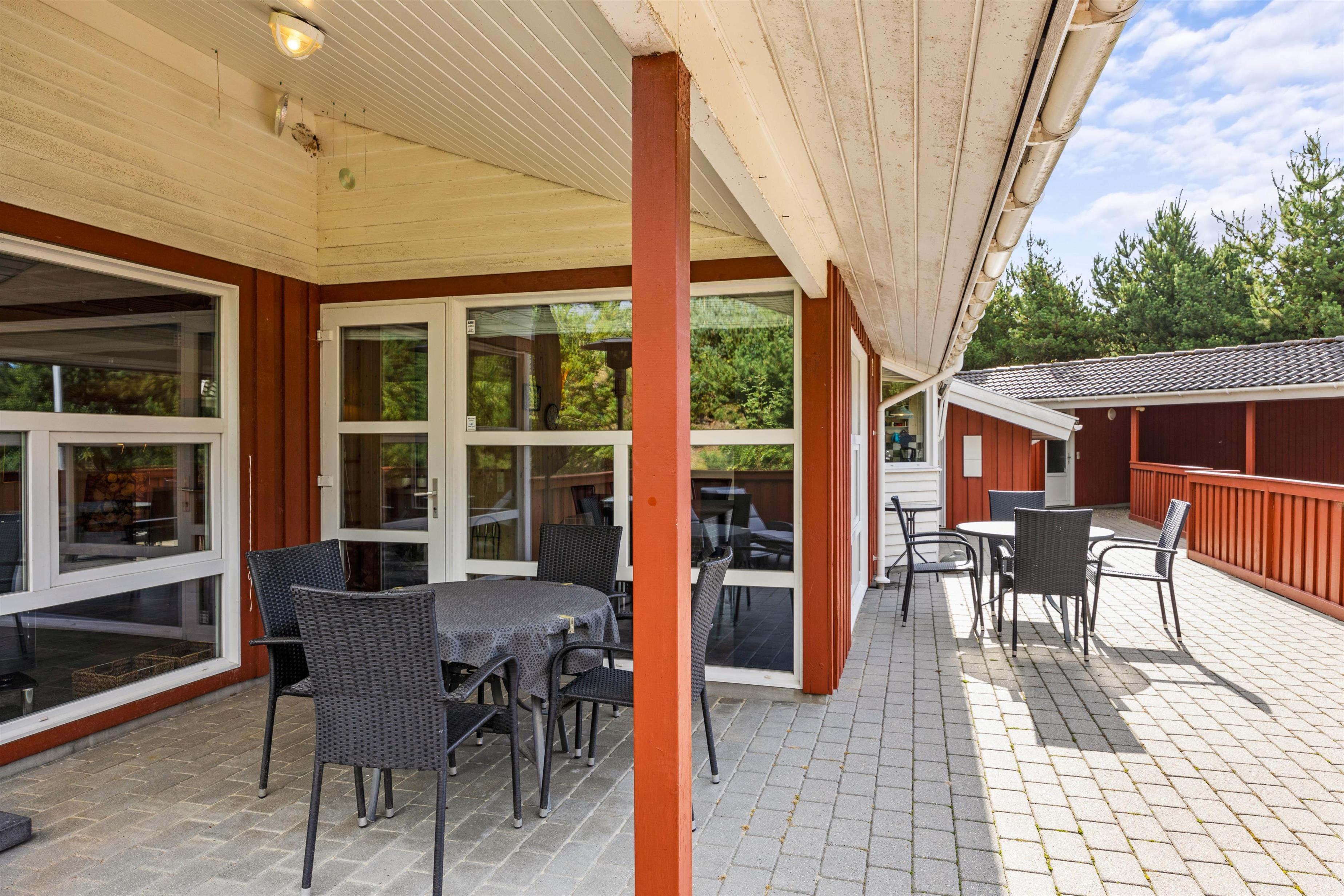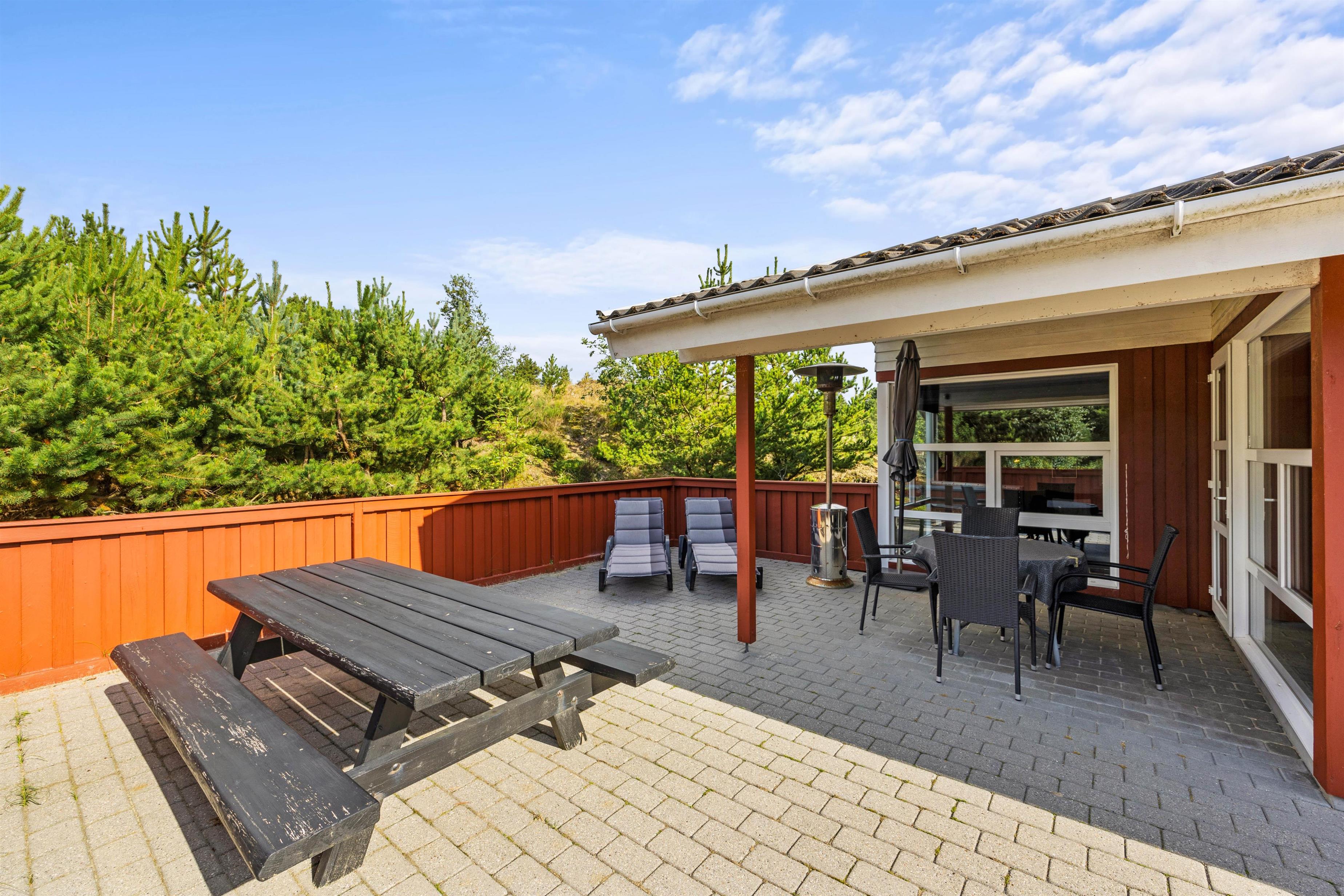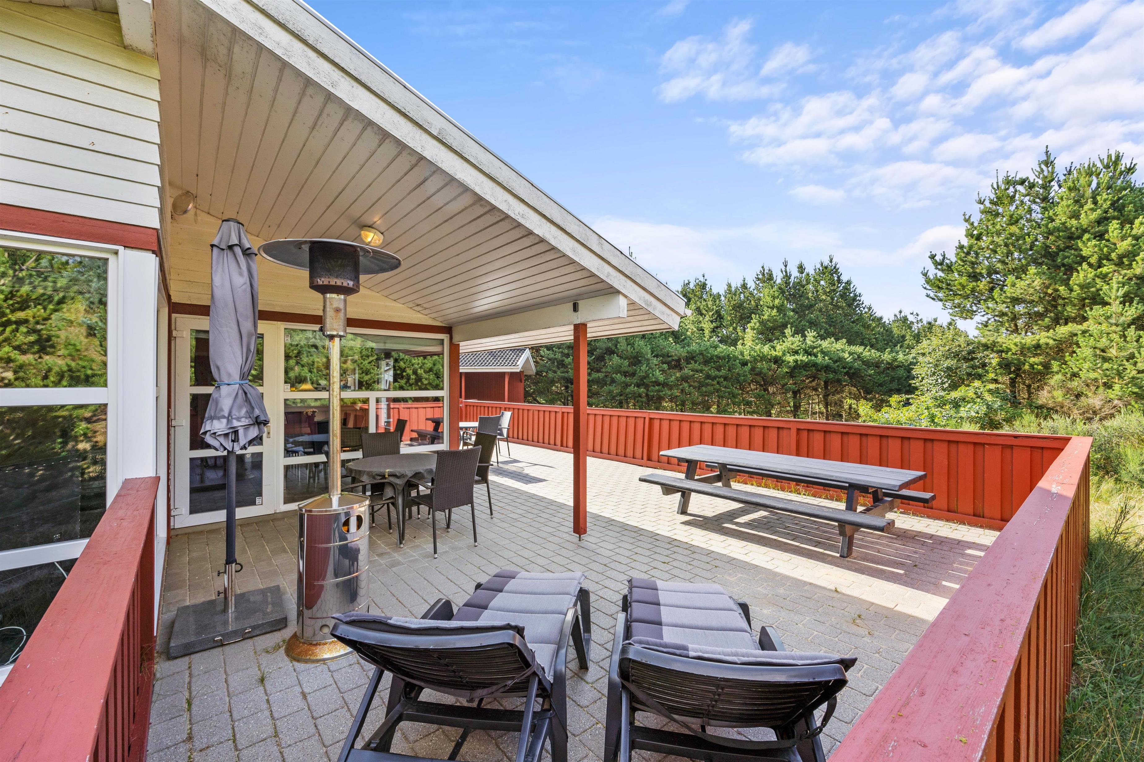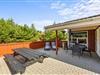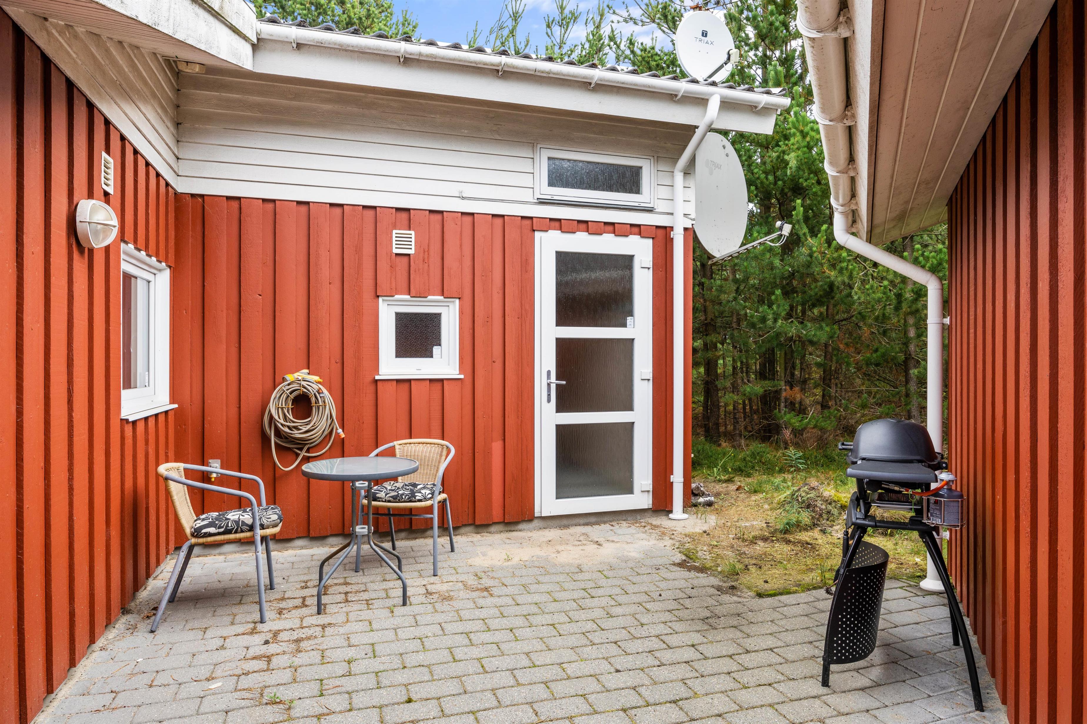 Fra feriehusets spisestue kan I træde direkte ud på den dejlige indhegnede terrasse, som I kan tilbringe feriens solrige dage på. Her står der komfortable havemøbler og liggestole klar til jer, så I kan finde jer godt til rette. Terrassen er desuden delvist overdækket, så der også er mulighed for at sidde i skygge. Og aftenen kan I samles her til aftensmaden, som kan tilberedes på feriehusets gasgrill.