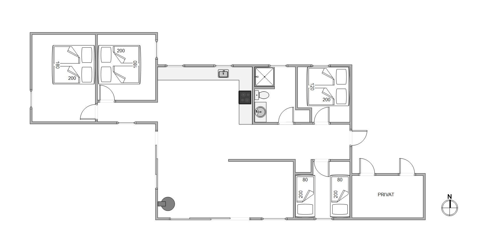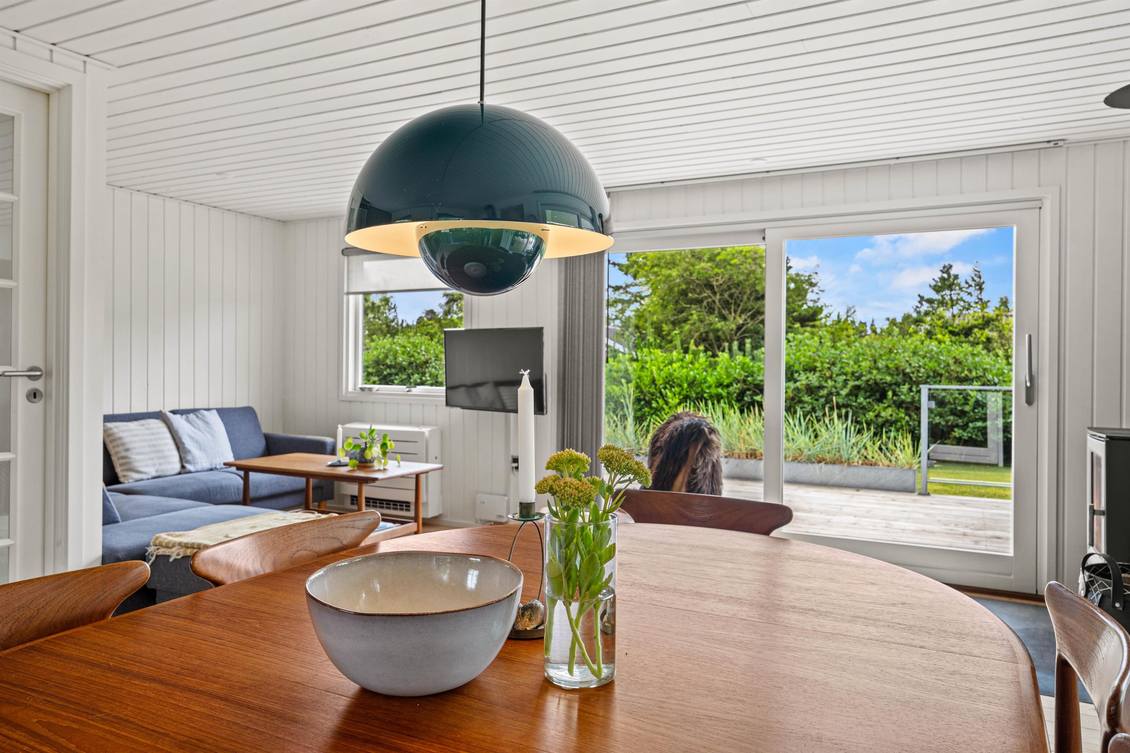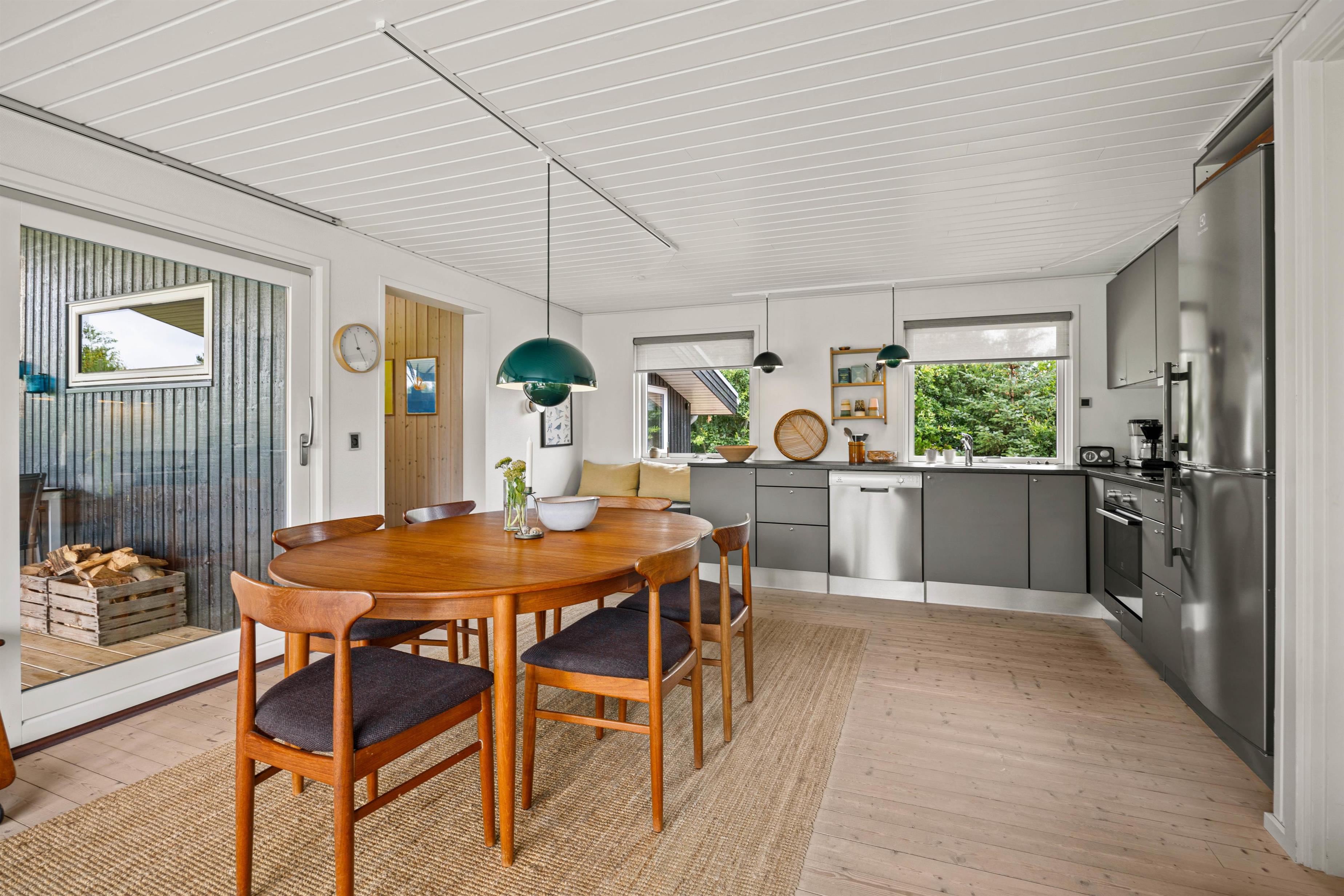 Sommerhusets absolutte samlingspunkt er opholdsrummet med det åbne moderne køkken, der er godt indrettet – naturligvis med en opvaskemaskine. Her er der plads til ”os-tid” med fælles madlavning, lange samtaler omkring det smukke spisebord eller fjernsynshygge i den bekvemme hjørnesofa. Det hele krones med en tændt brændeovn, hvis dansende flammer giver ekstra hyggestemning.