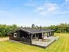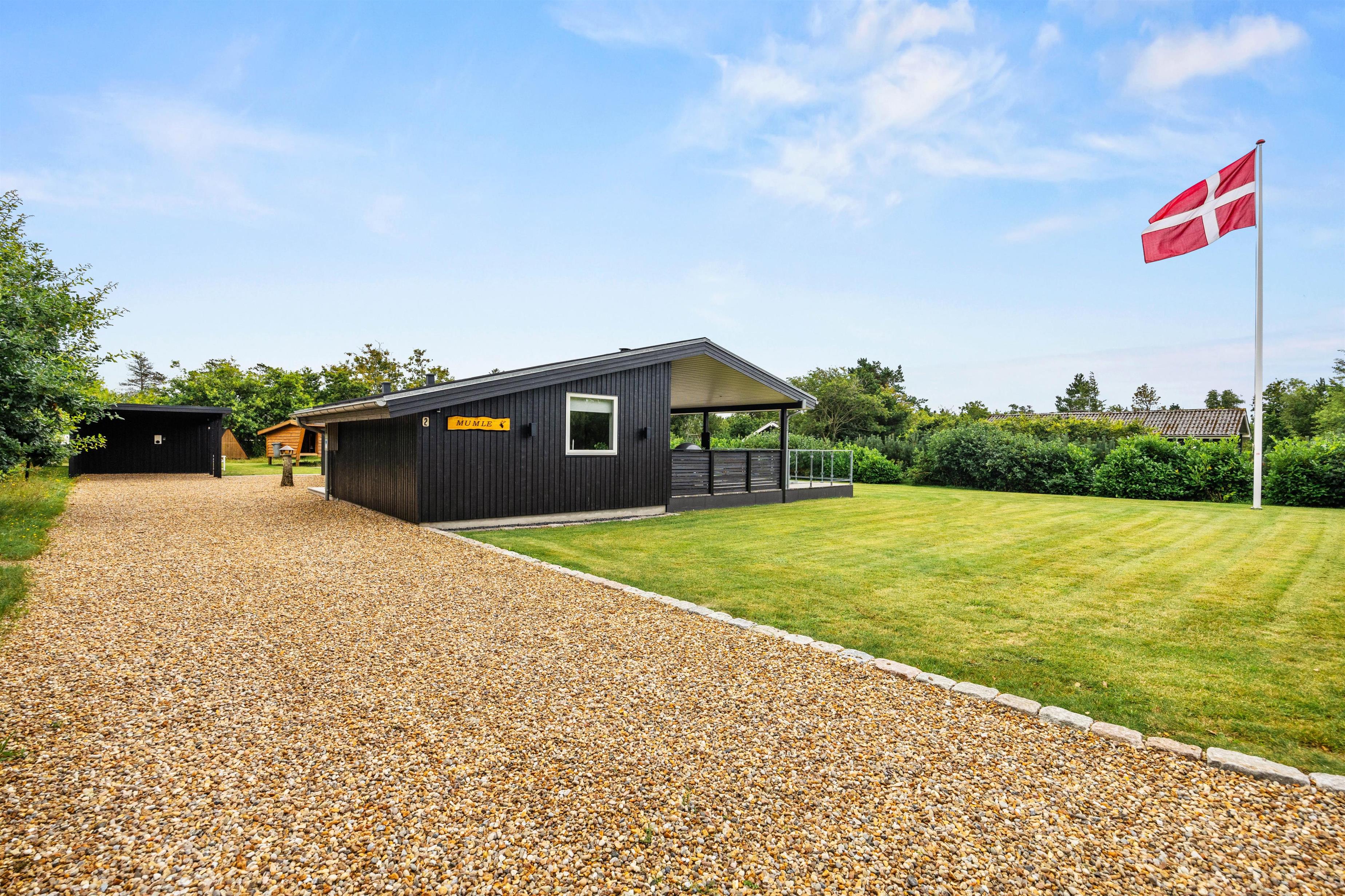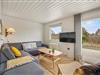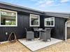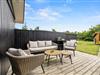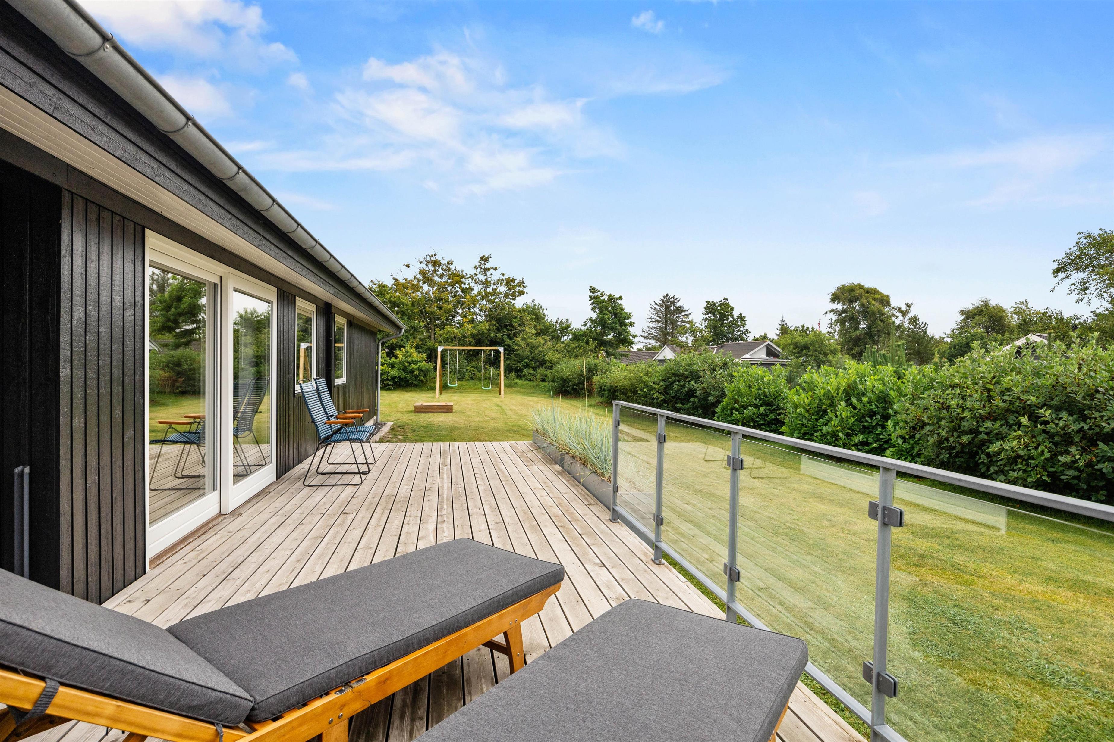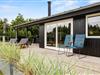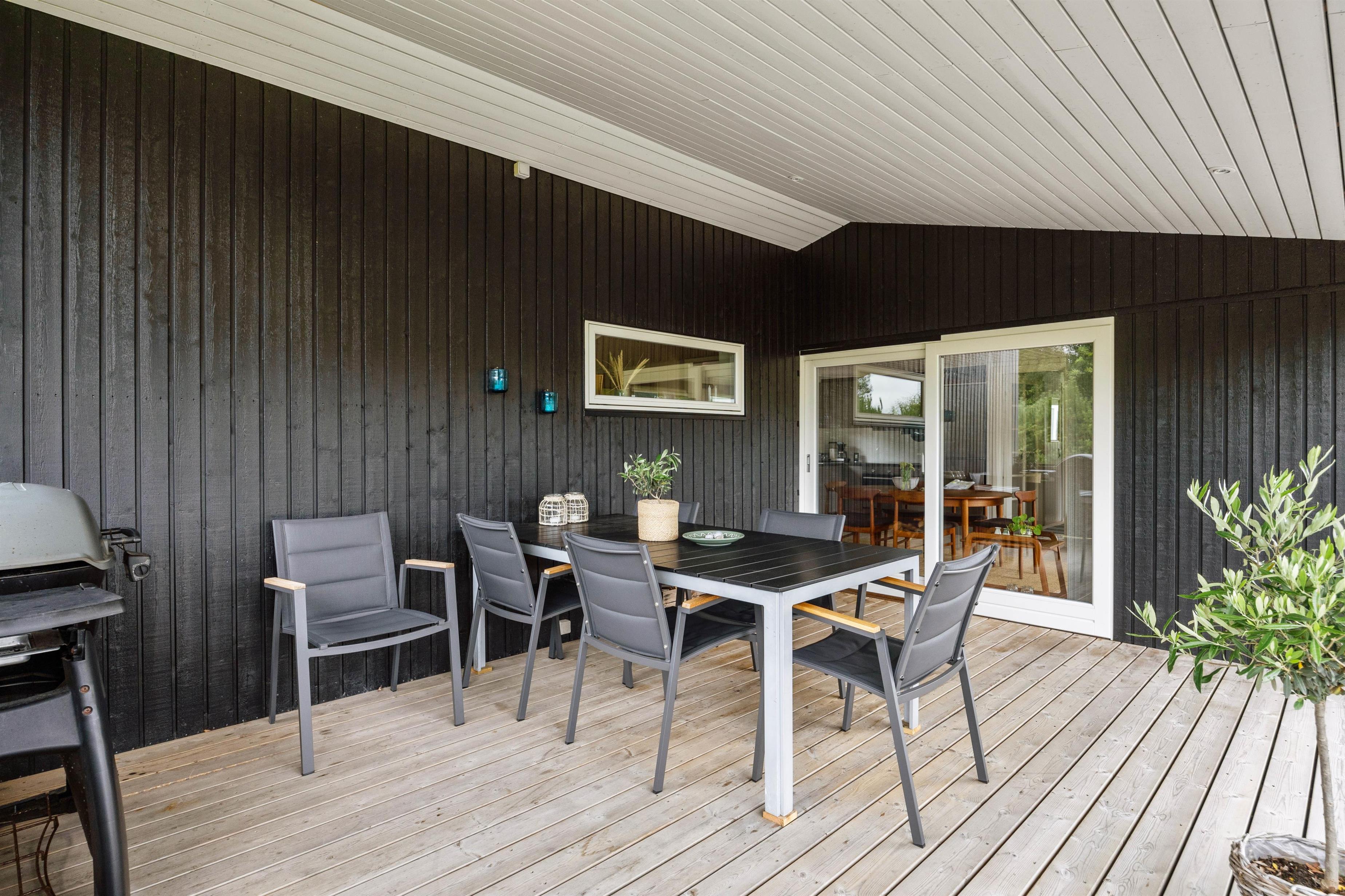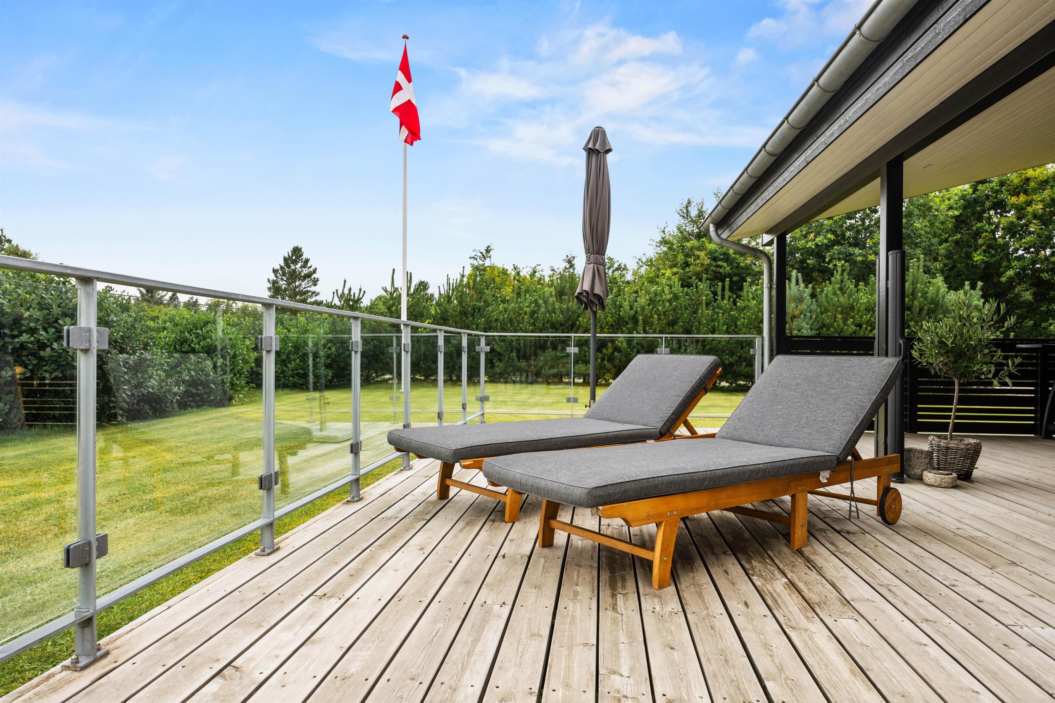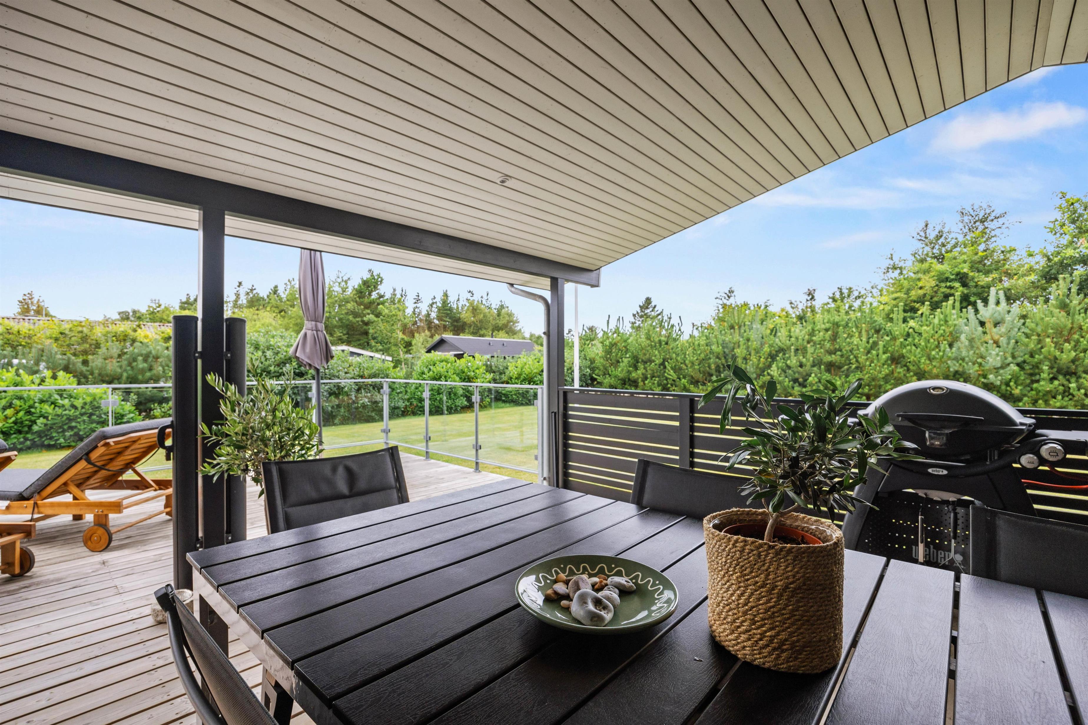 En stor skydedør forbinder sommerhusets stue med en stor delvist overdækket terrasse. Balustraden af glas garanterer lys og udsyn og gør terrassen til det perfekte sted at slå liggestolen op og tilbringe dagen med en bog, imens børnene leger på den store plænegrund. Når dagen går på hæld, kan I finde grillen frem og trylle en lækker middag på terrassen.