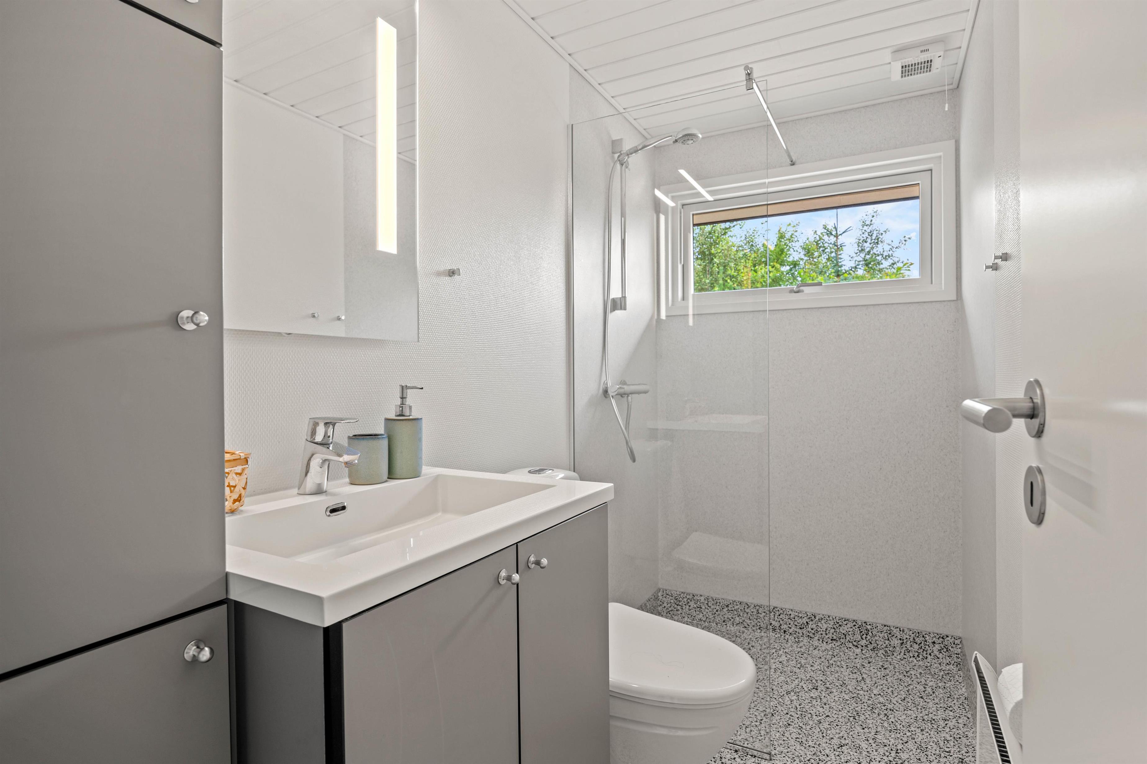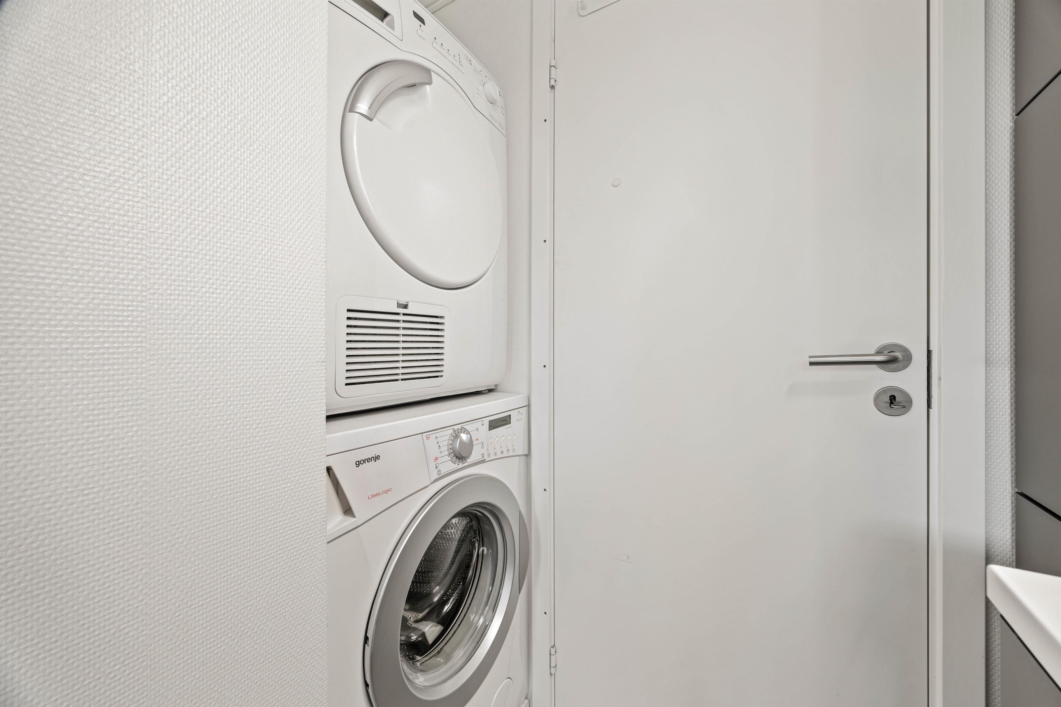 En energibesparende luft-til-luft varmepumpe sørger for et godt indeklima, og med både vaskemaskine og tørretumbler er badehåndklæderne hurtigt friske og klare til den næste strandtur.