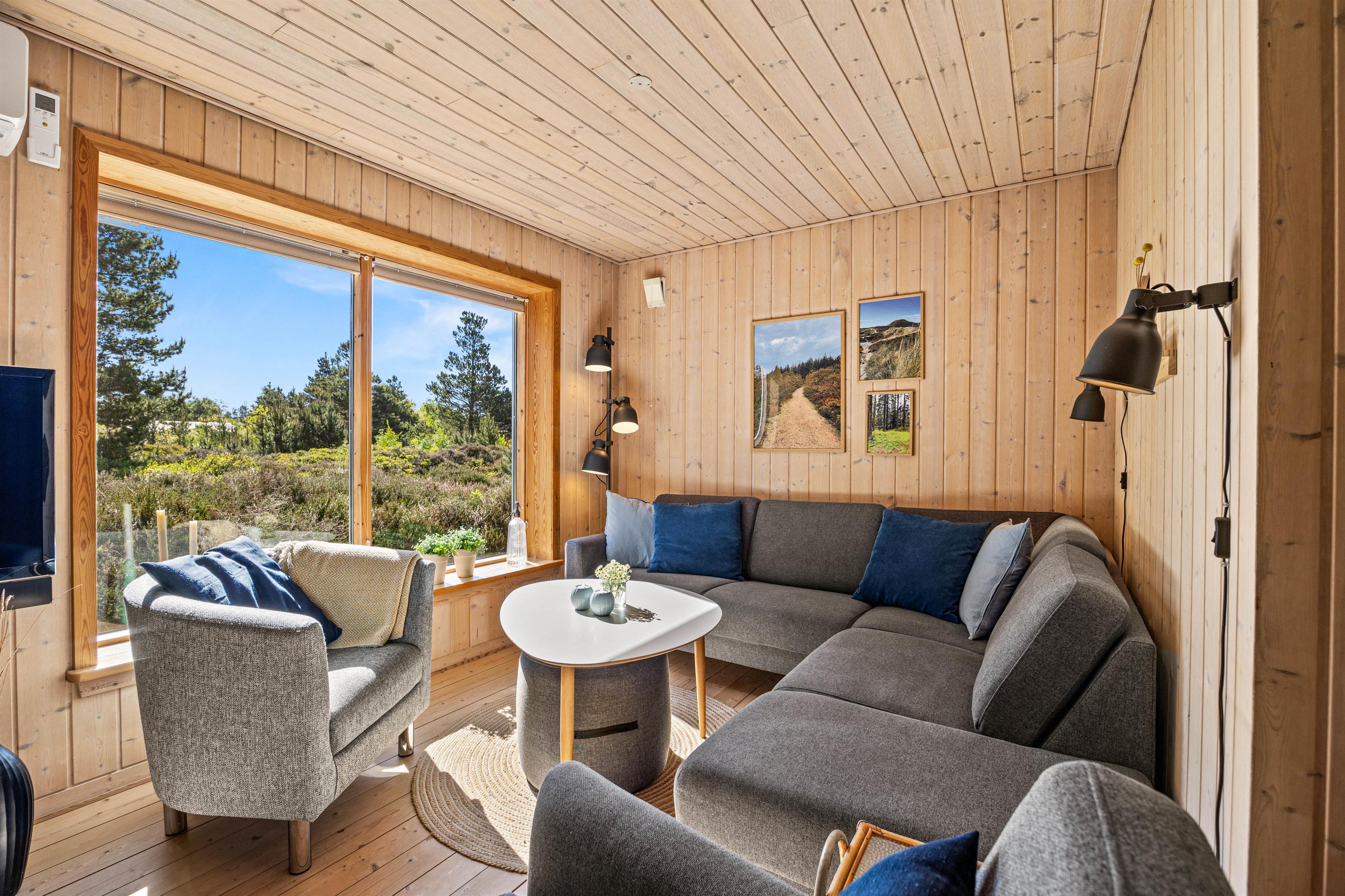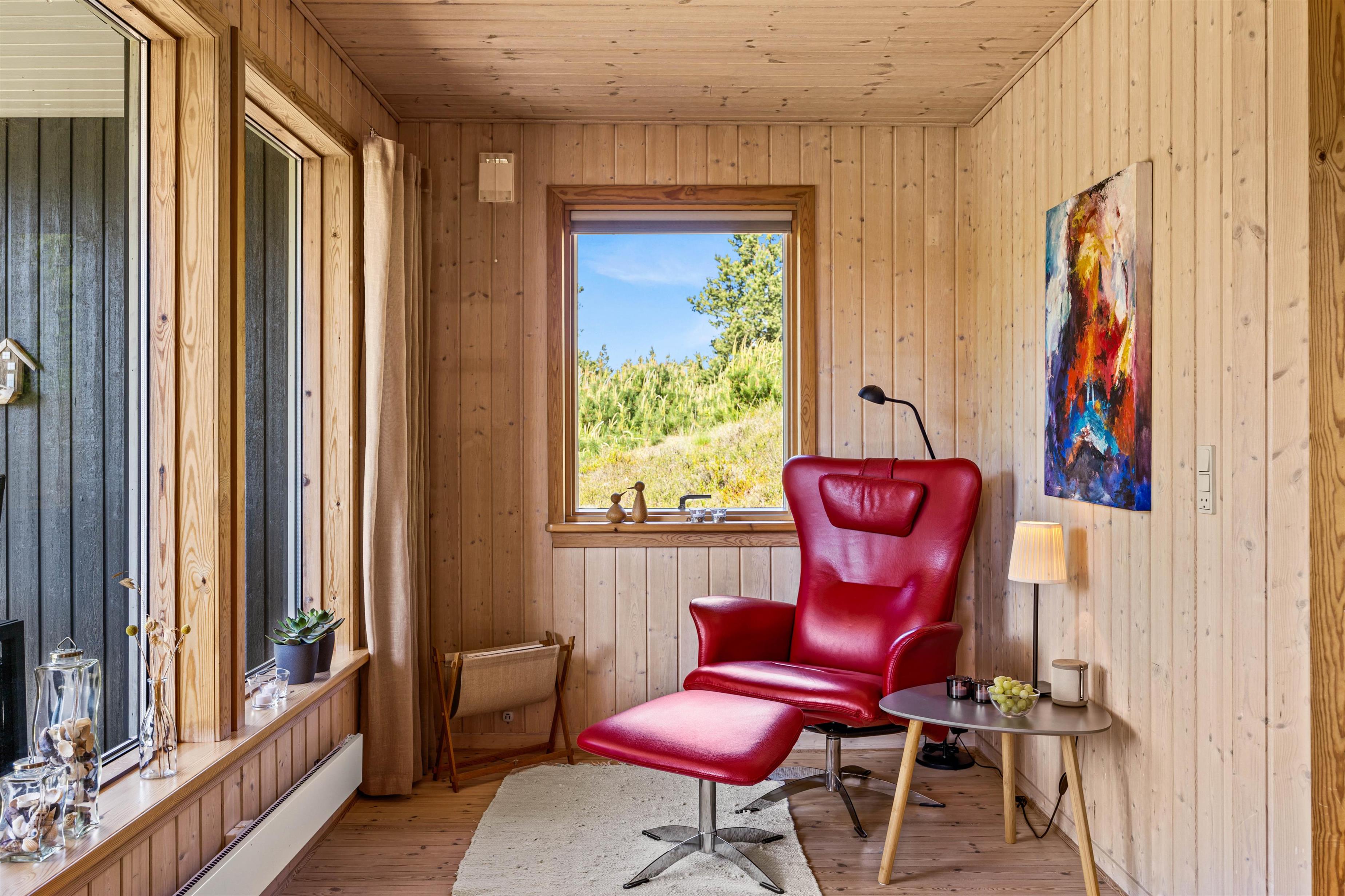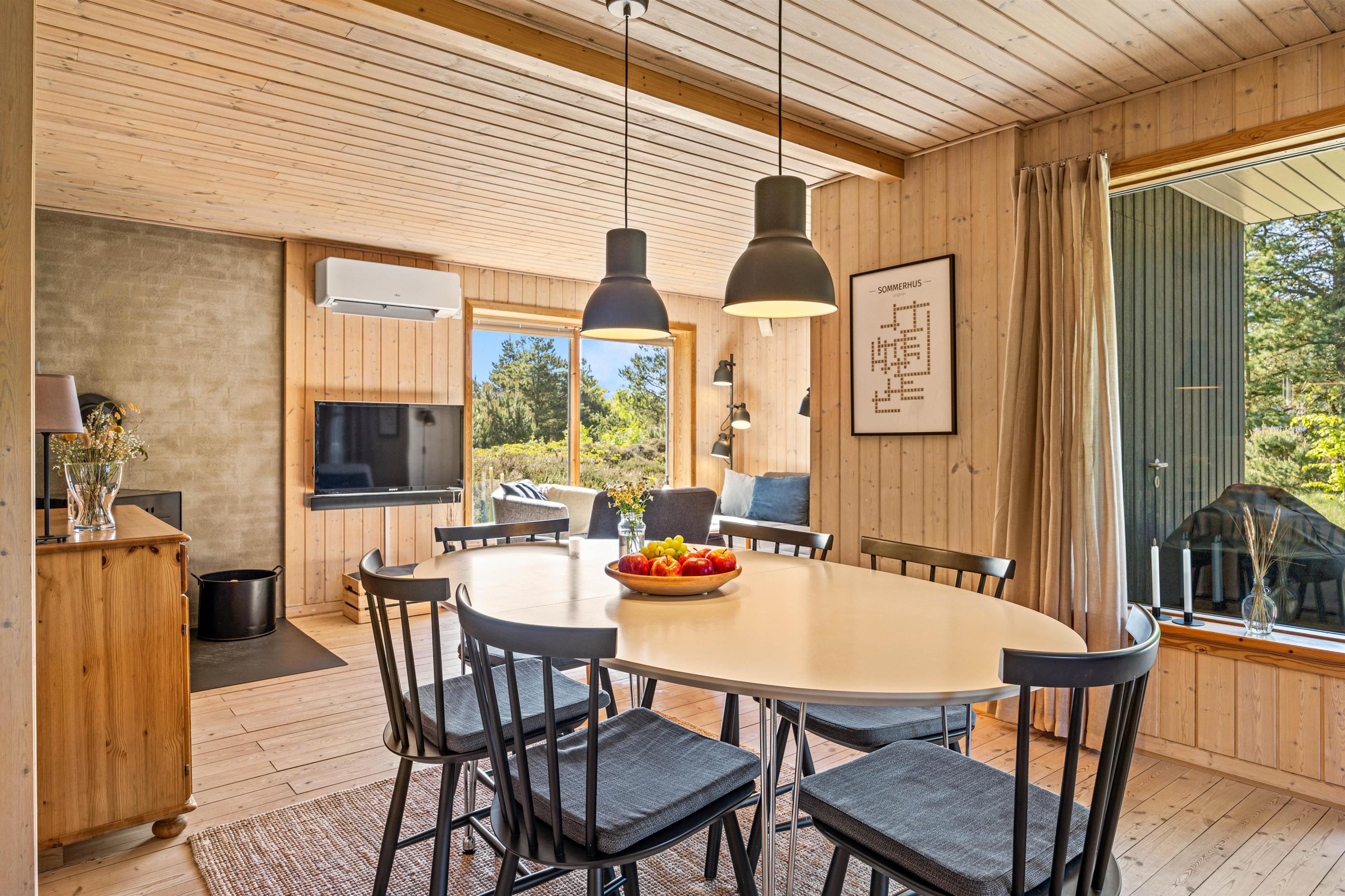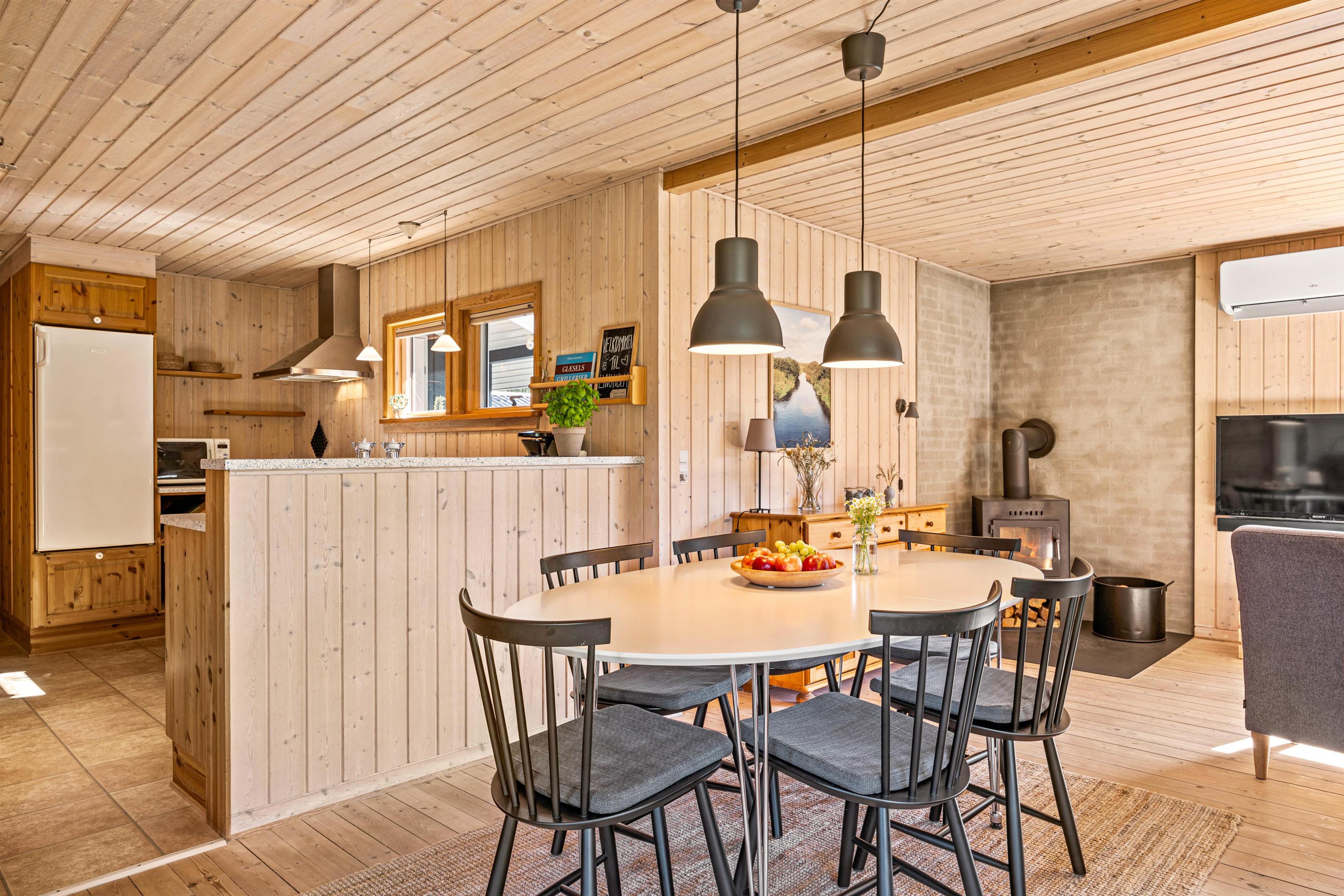 Det fine træhus oser af charme og rummer plads til 6 feriegæster - perfekt til en stille og rolig familieferie! Den hyggelige stue ligger i forbindelse med det åbne køkken, og her kommer I til at tilbringe et hav af hyggelige feriestunder med god mad, spændende film og afslapning foran brændeovnens knitrende varme.