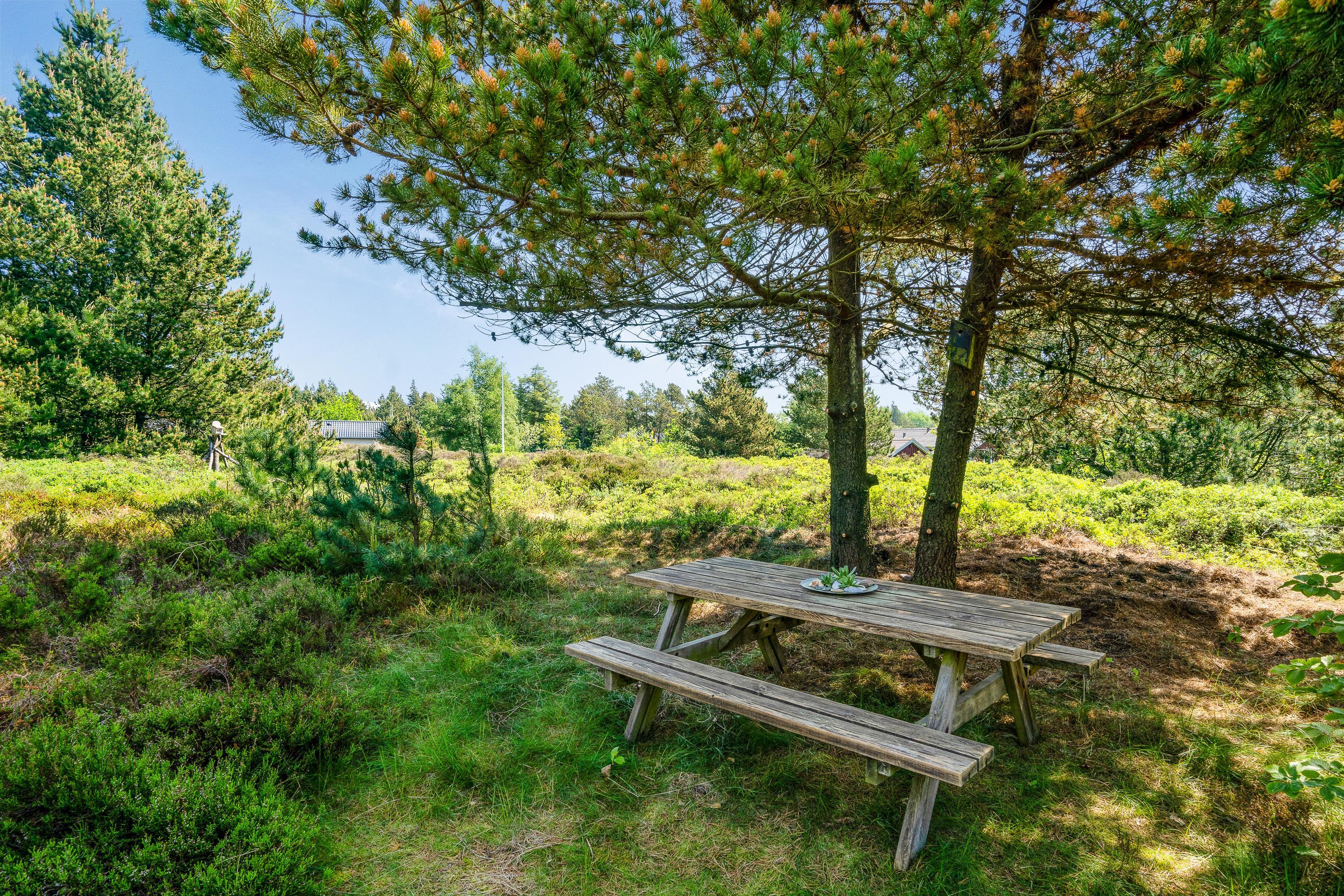 Fra stuen kommer I ud på den skønne terrasse, som er delvist overdækket. Her kan I starte en varm sommerdag ud med nybagte rundstykker og friskbrygget kaffe på terrassen, og mens dagen går, kan I dase i liggestolene, mens stilheden kun bliver brudt af fuglenes sang i trætoppene.